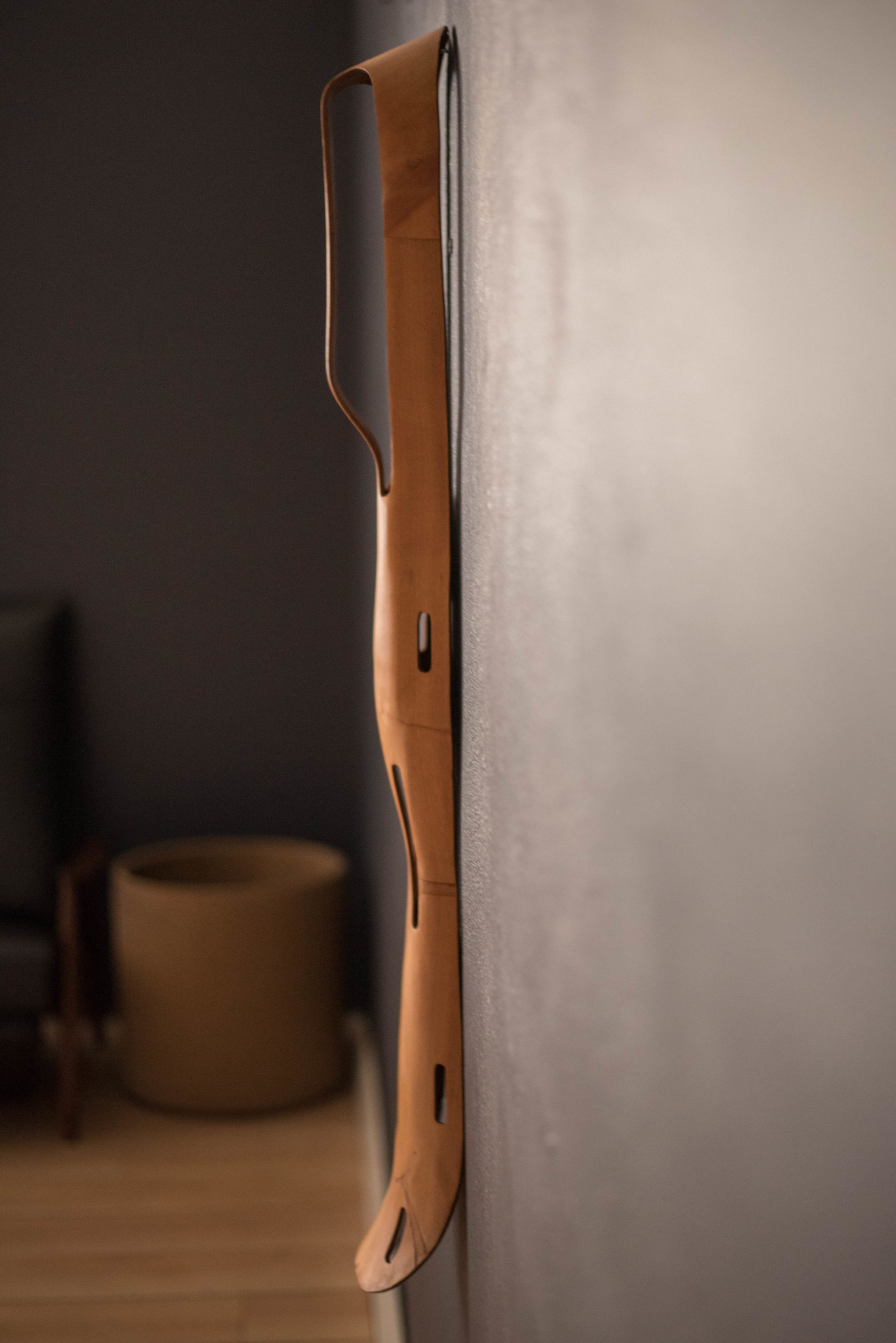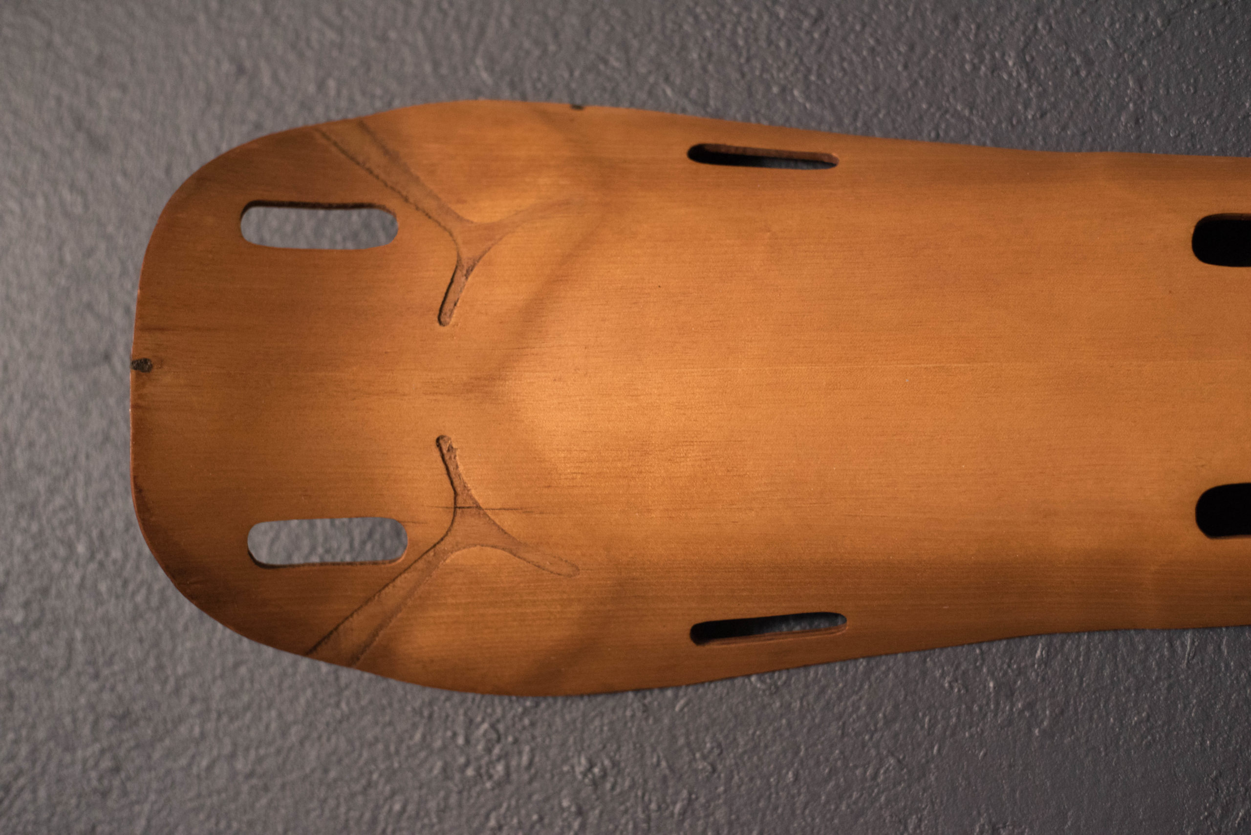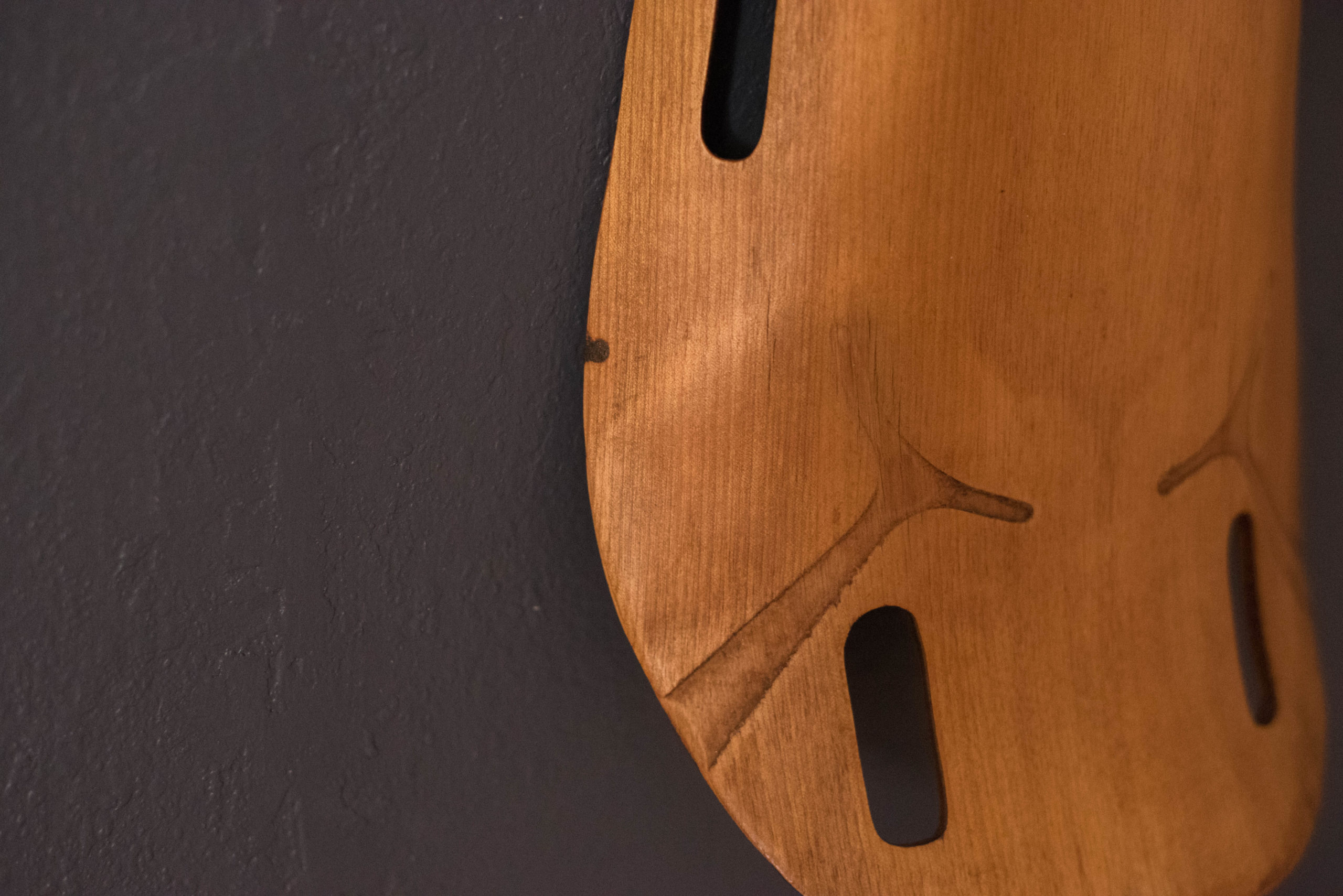 Mid century WWII leg splint created by Charles and Ray Eames for Evans Products Company, 1943. Specifically designed for the US Navy, this iconic piece of history is sculpturally crafted in one piece using molded plywood and birch material. Marked model no. S2-1790. Makes for an eye catching wall art sculpture that can be mounted vertically or horizontally.