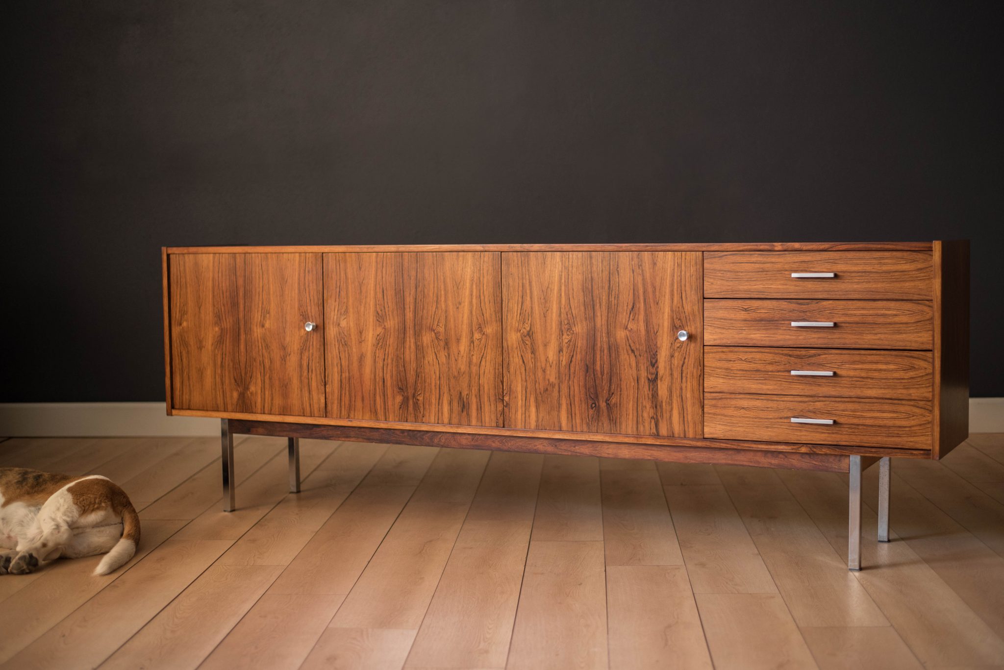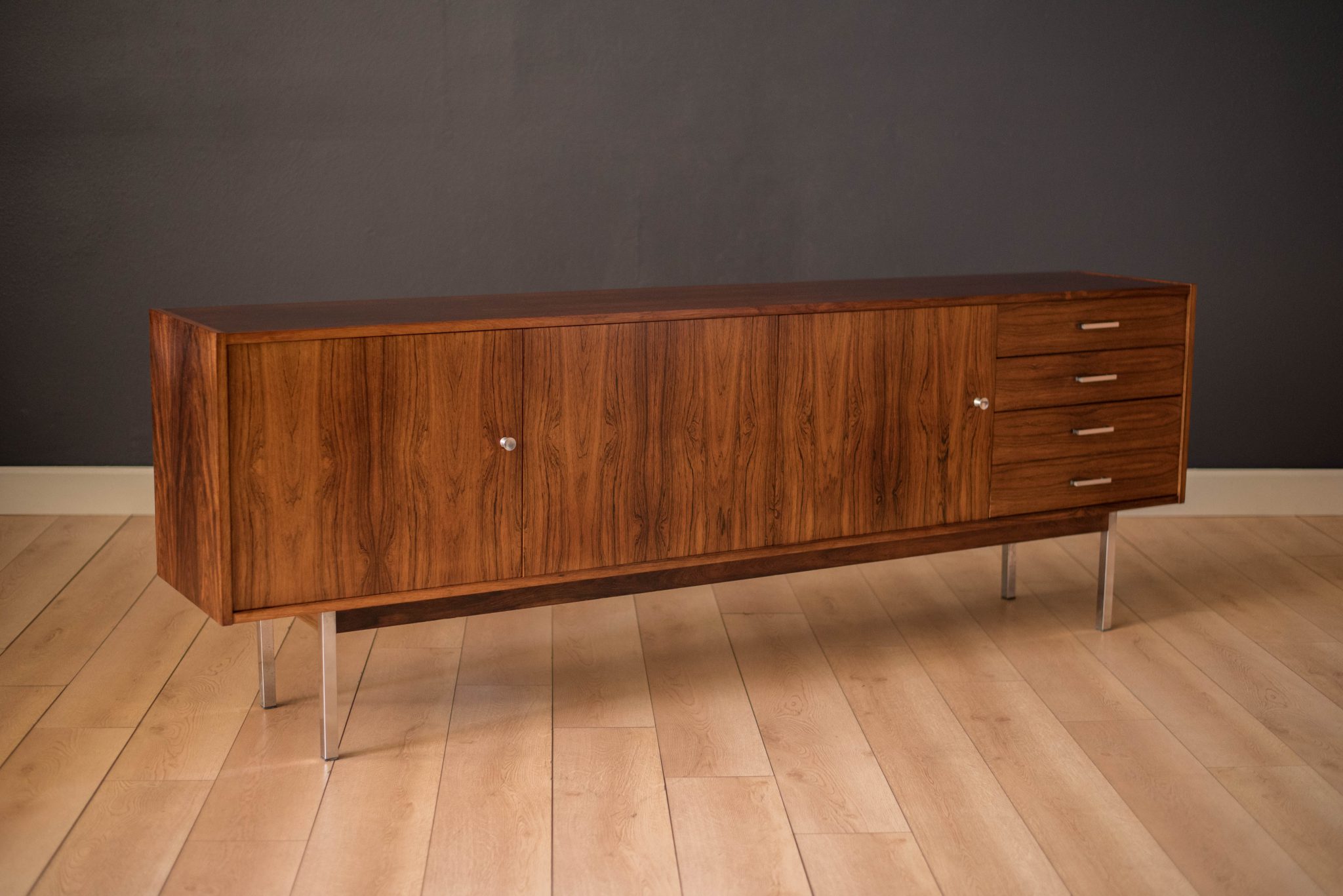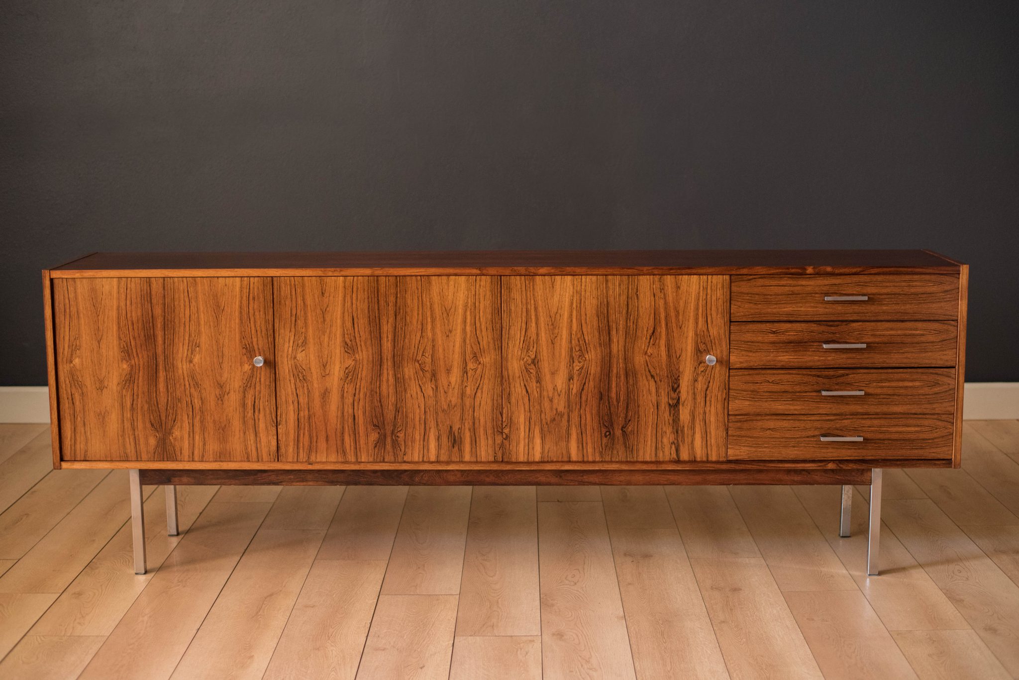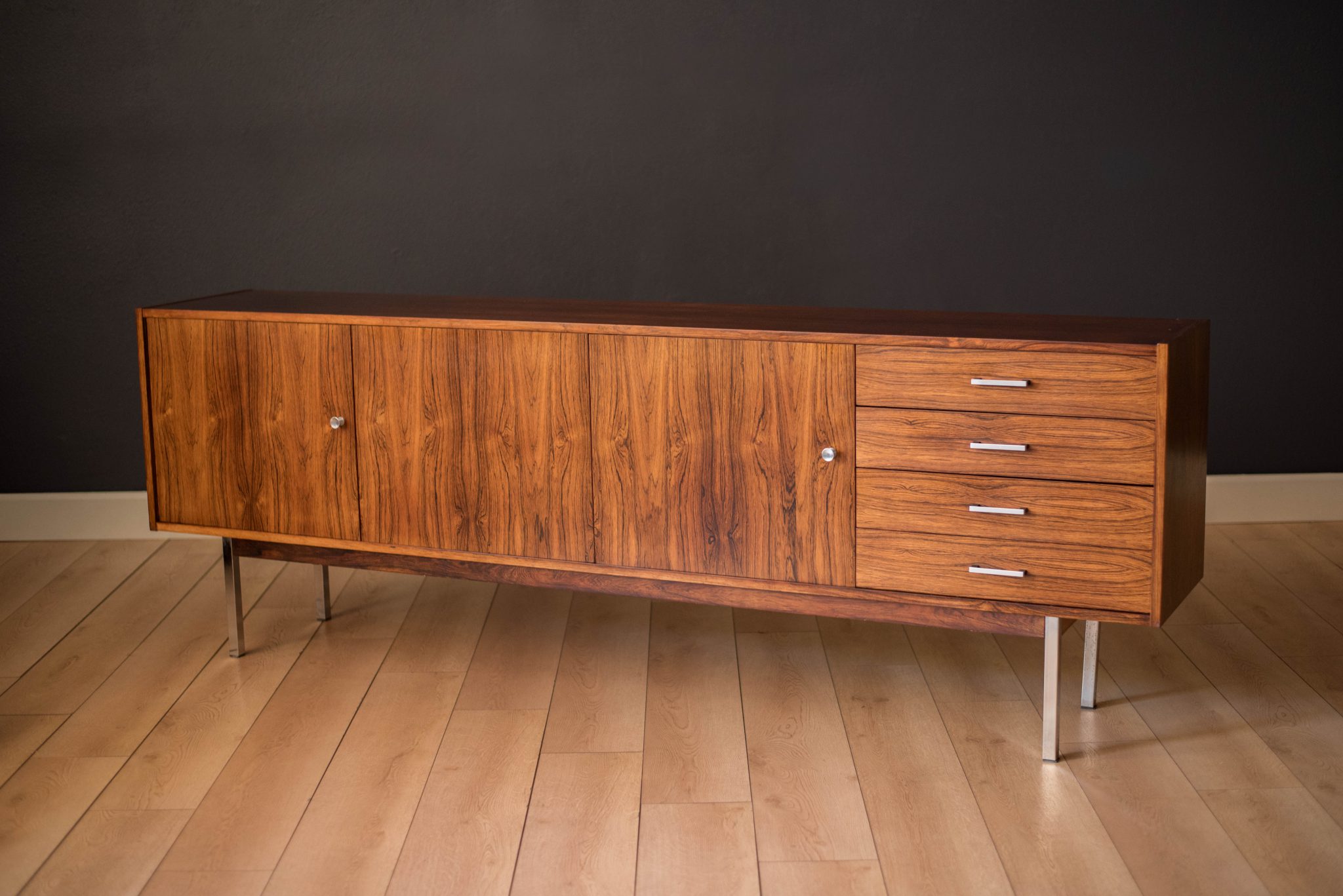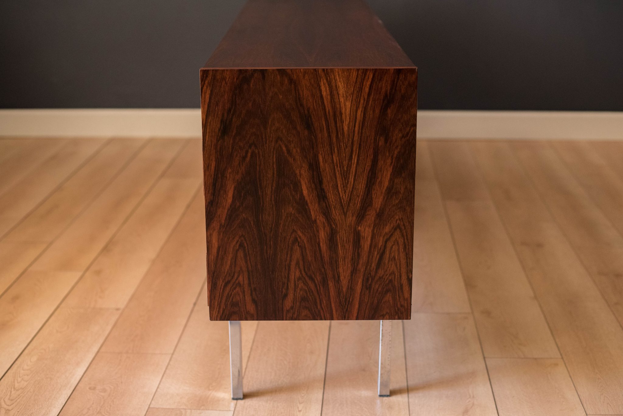 Vintage sideboard credenza in Brazilian rosewood, circa 1970s. This piece maximizes storage space including four organizing drawers and open display cabinets with one shelf. Showcases a rich rosewood grain finish complemented with chrome and aluminum accents.
