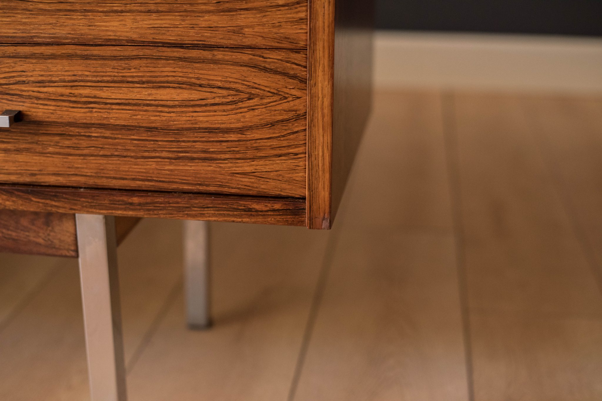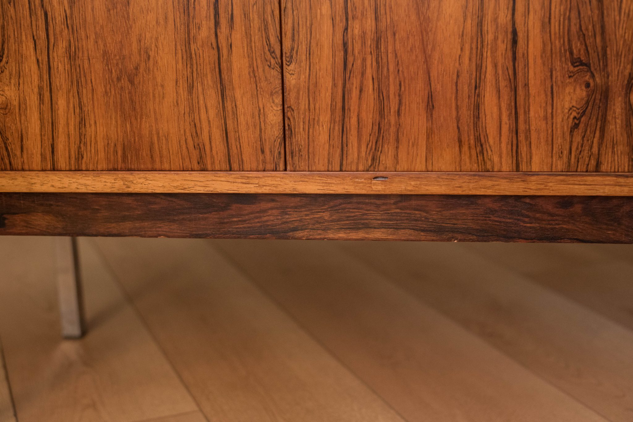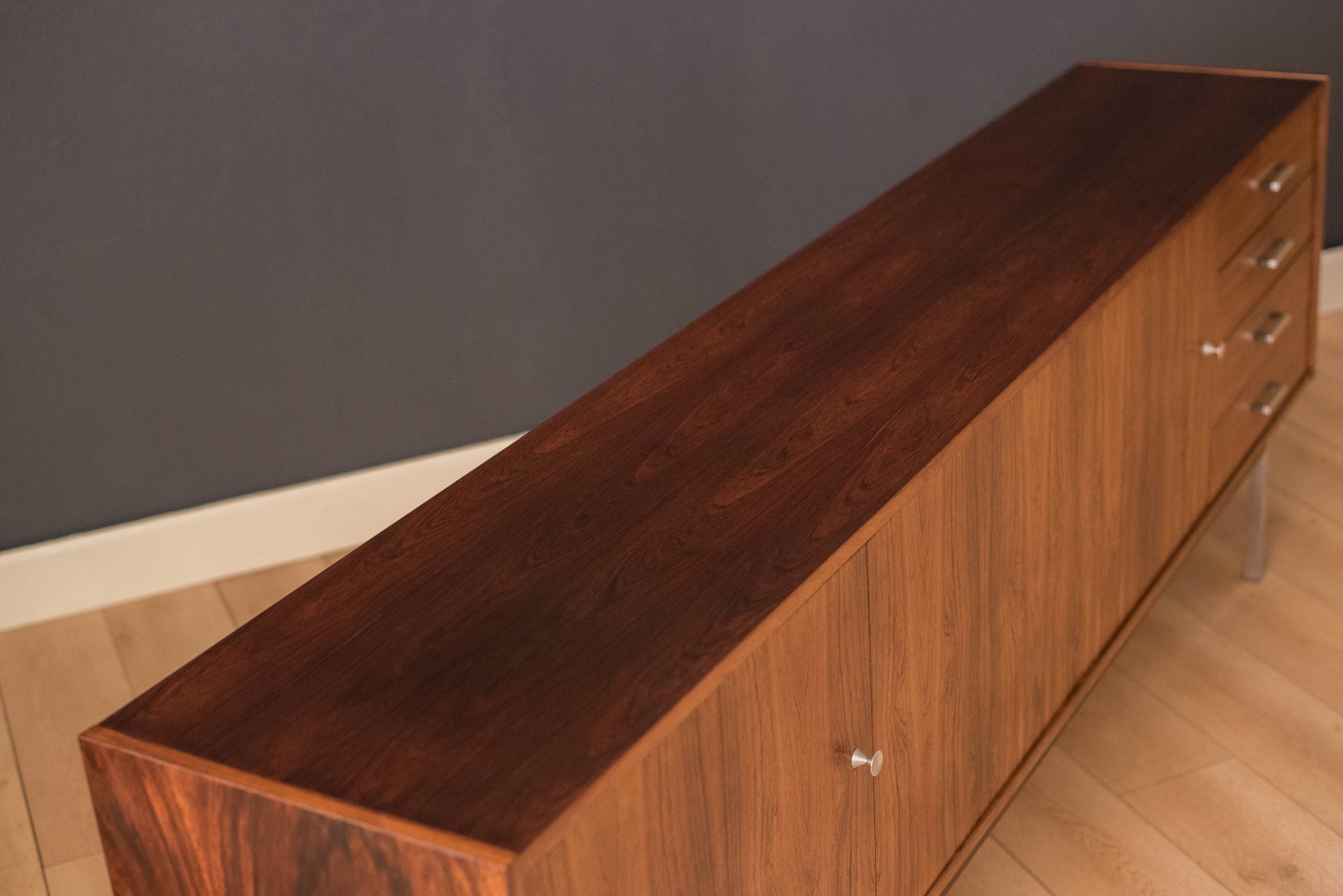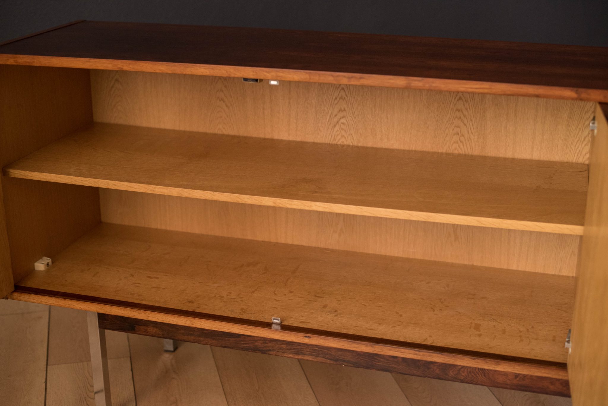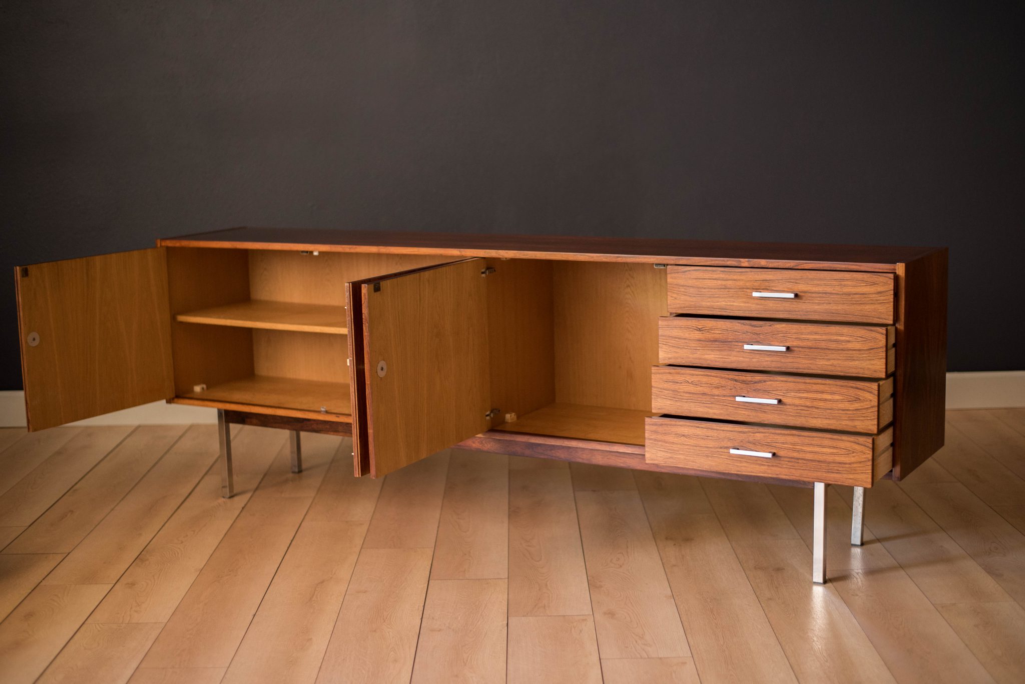 Vintage sideboard credenza in Brazilian rosewood, circa 1970s. This piece maximizes storage space including four organizing drawers and open display cabinets with one shelf. Showcases a rich rosewood grain finish complemented with chrome and aluminum accents.