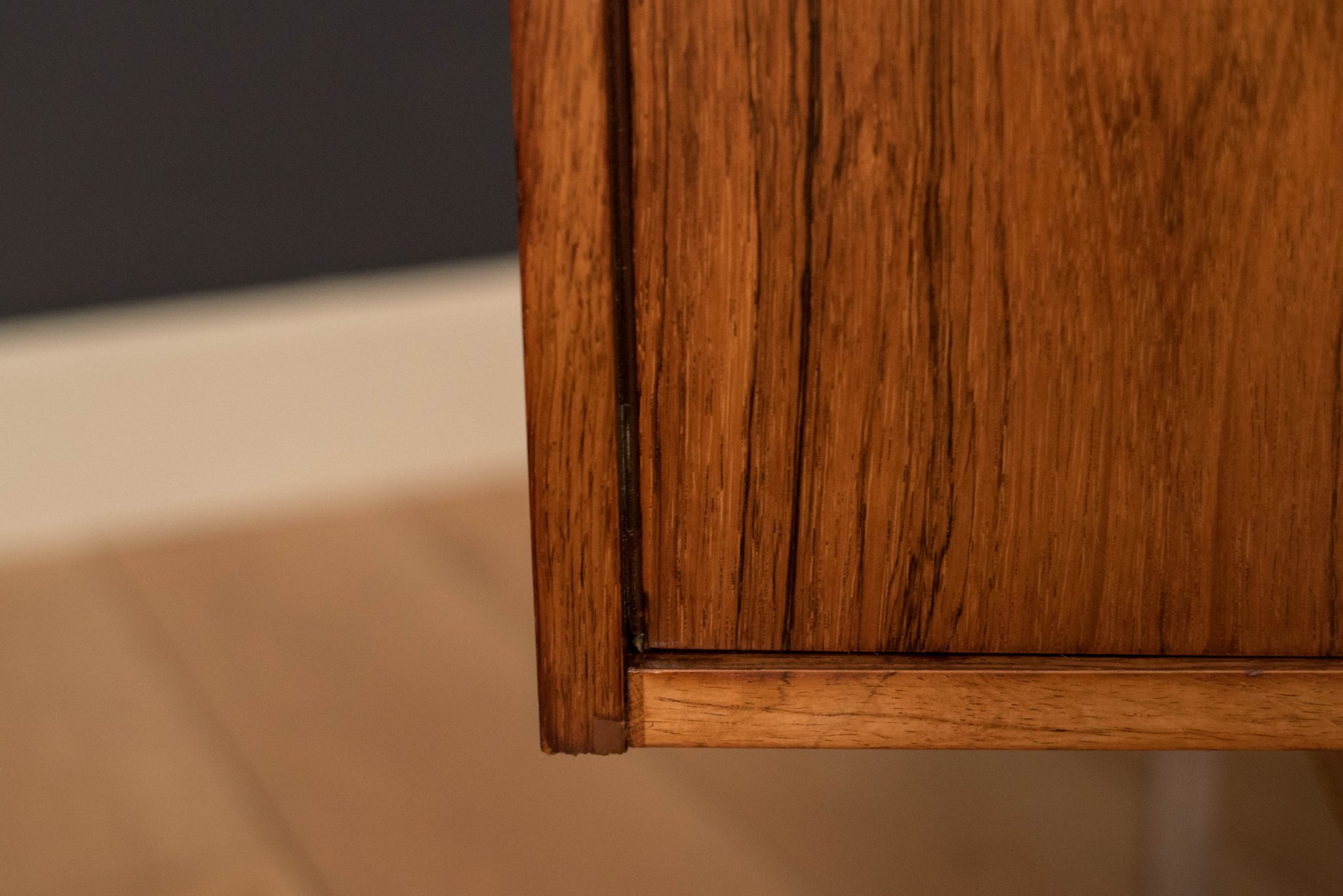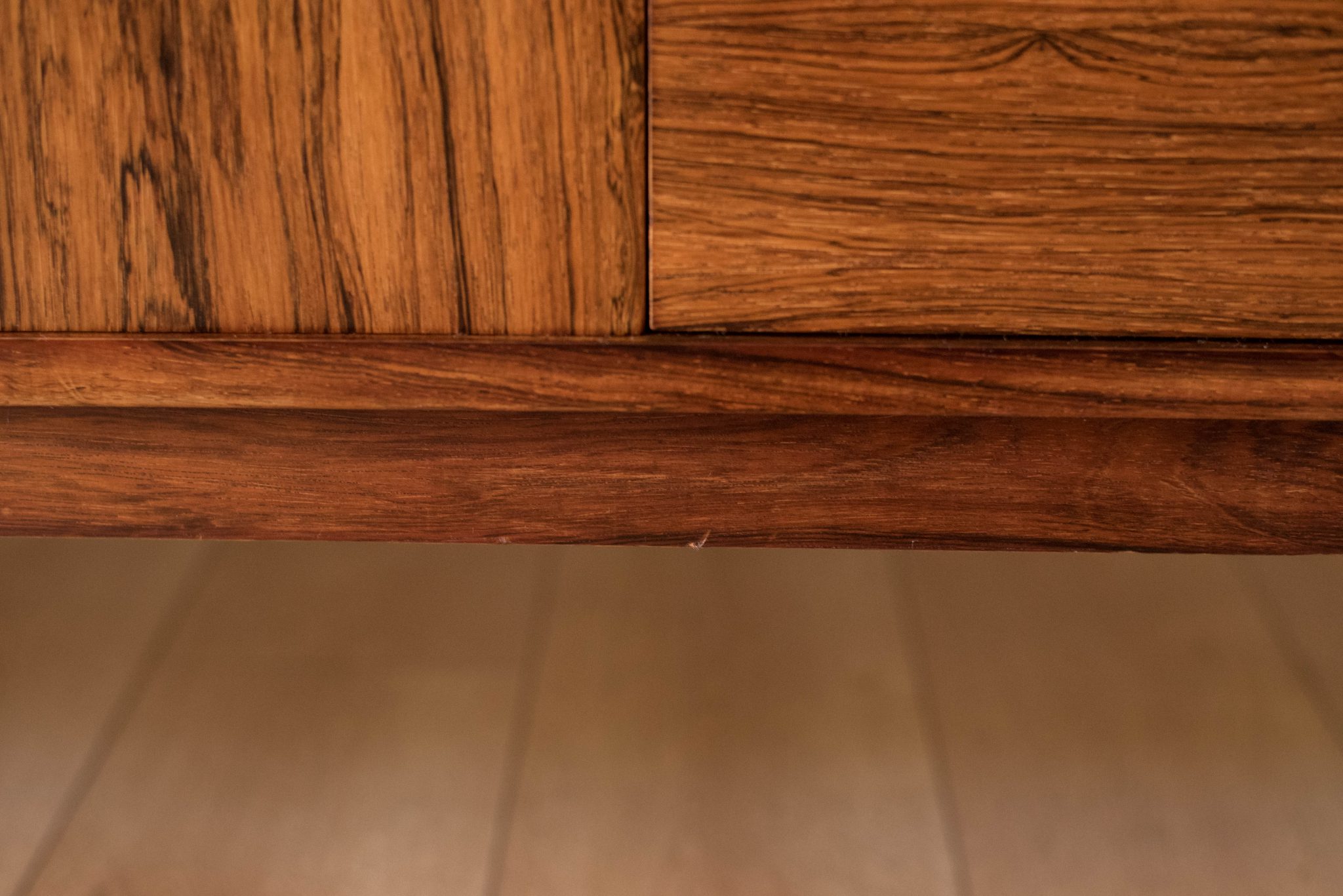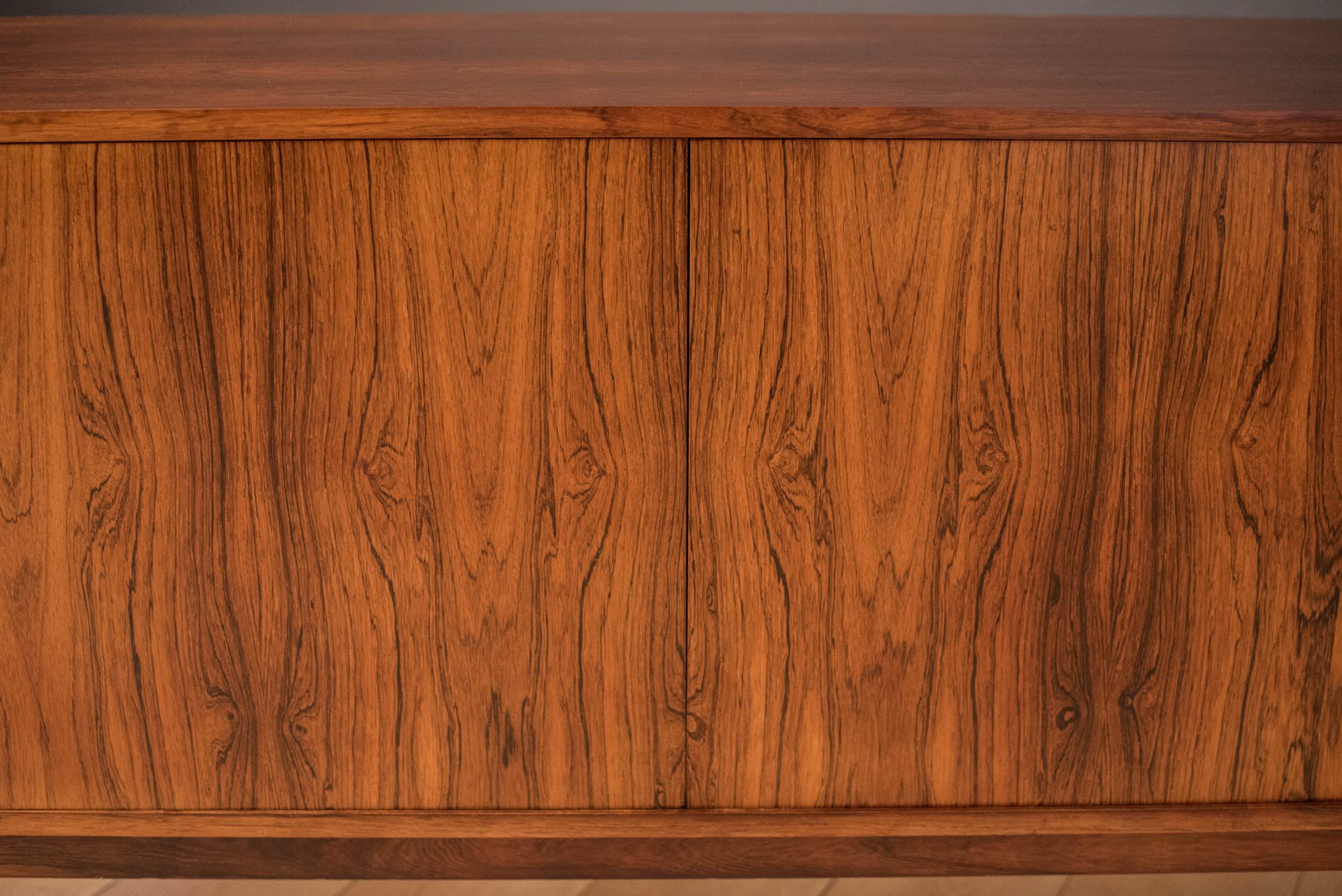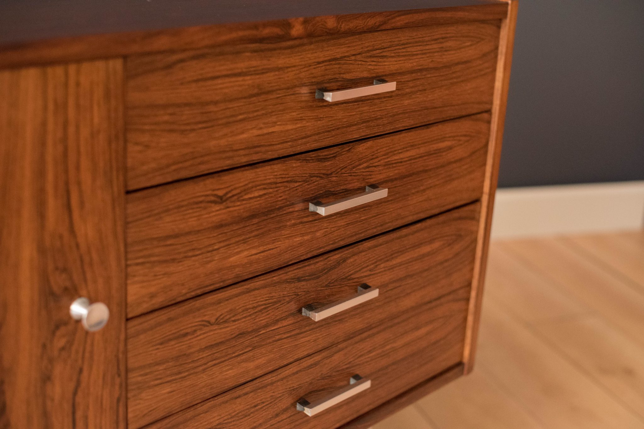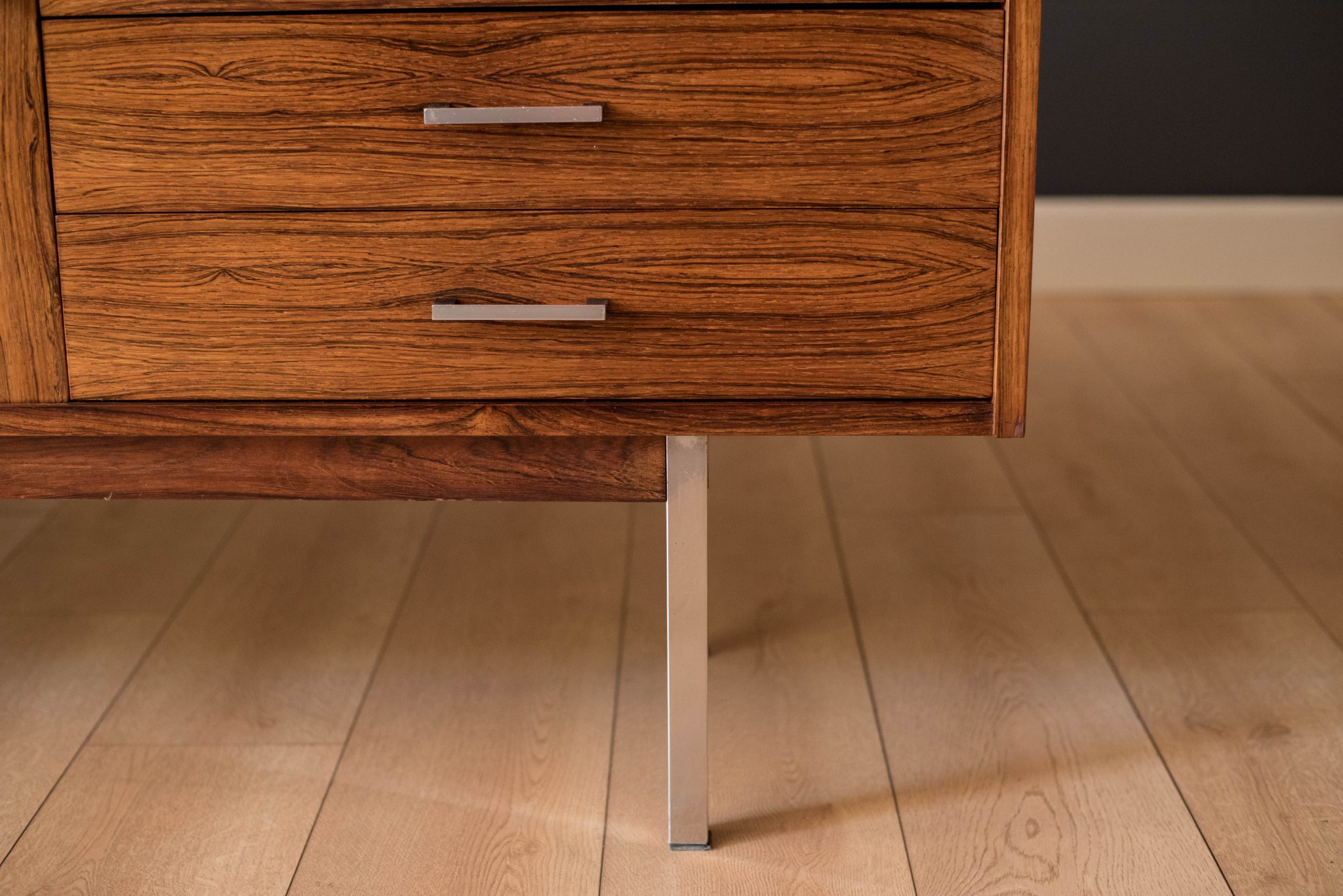 Vintage sideboard credenza in Brazilian rosewood, circa 1970s. This piece maximizes storage space including four organizing drawers and open display cabinets with one shelf. Showcases a rich rosewood grain finish complemented with chrome and aluminum accents.