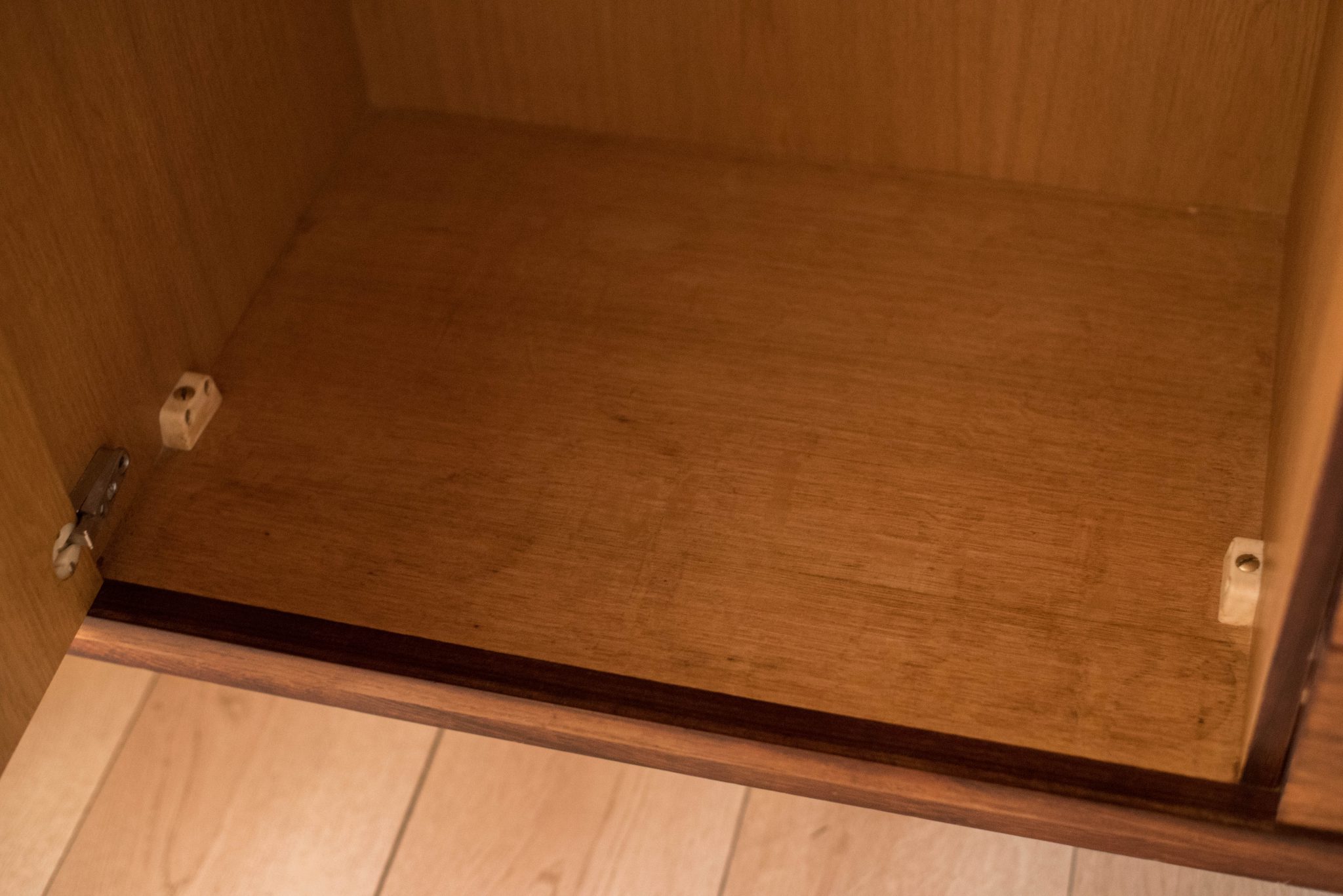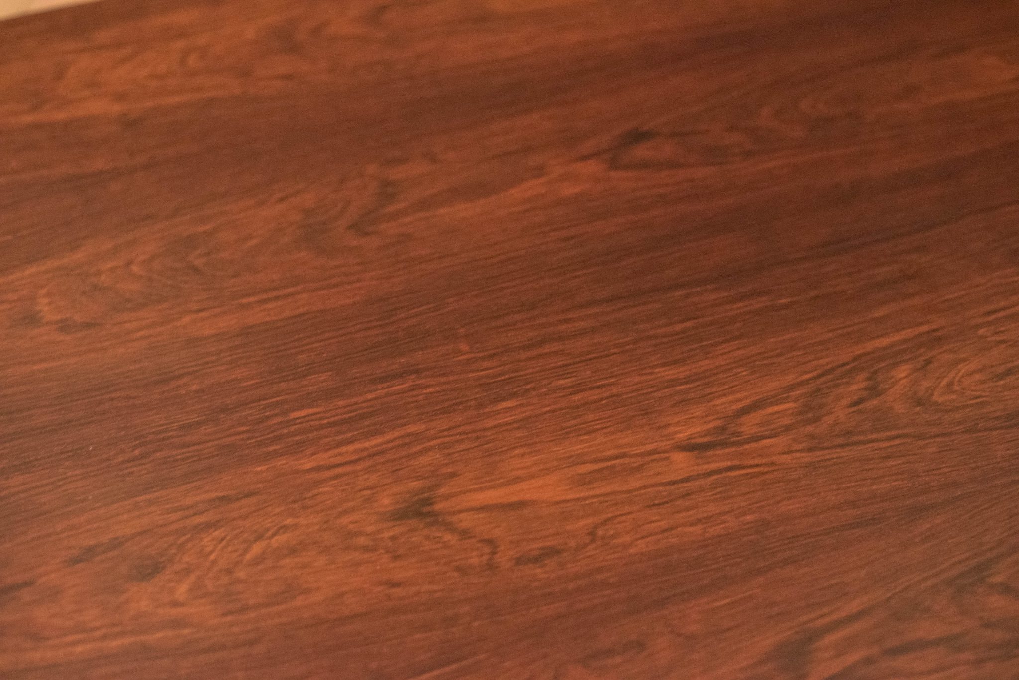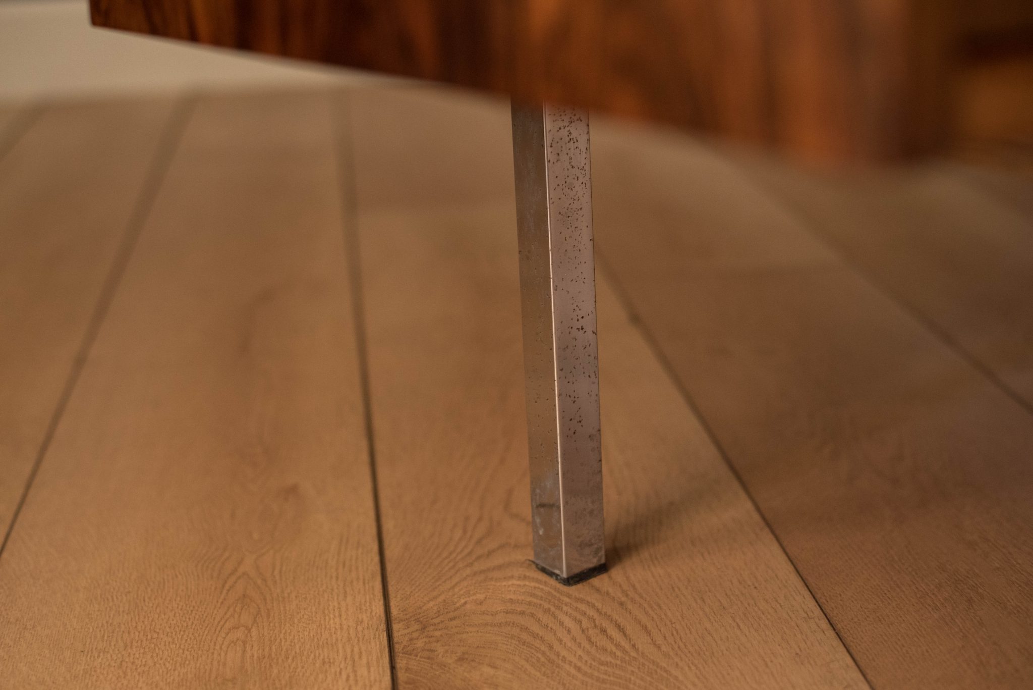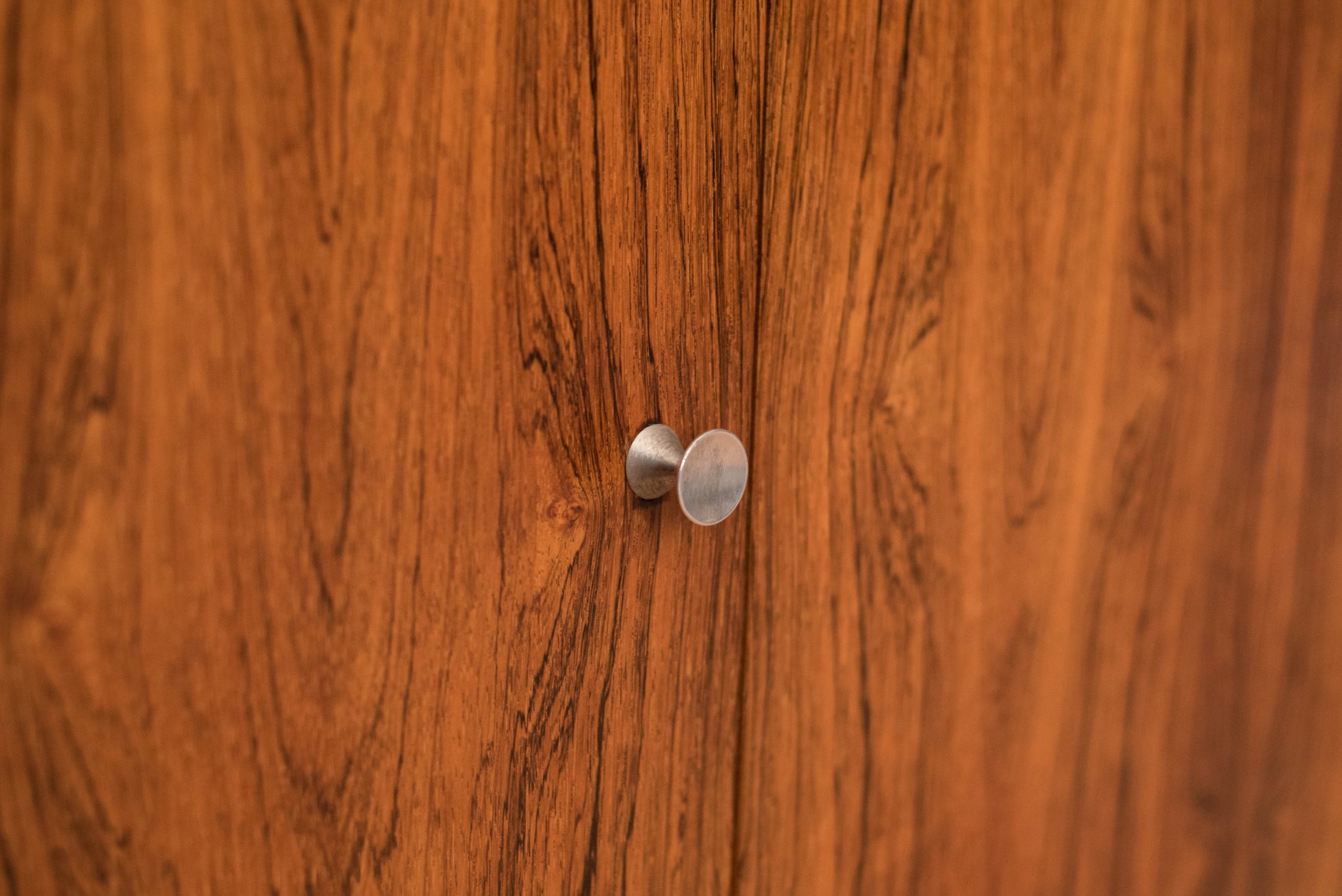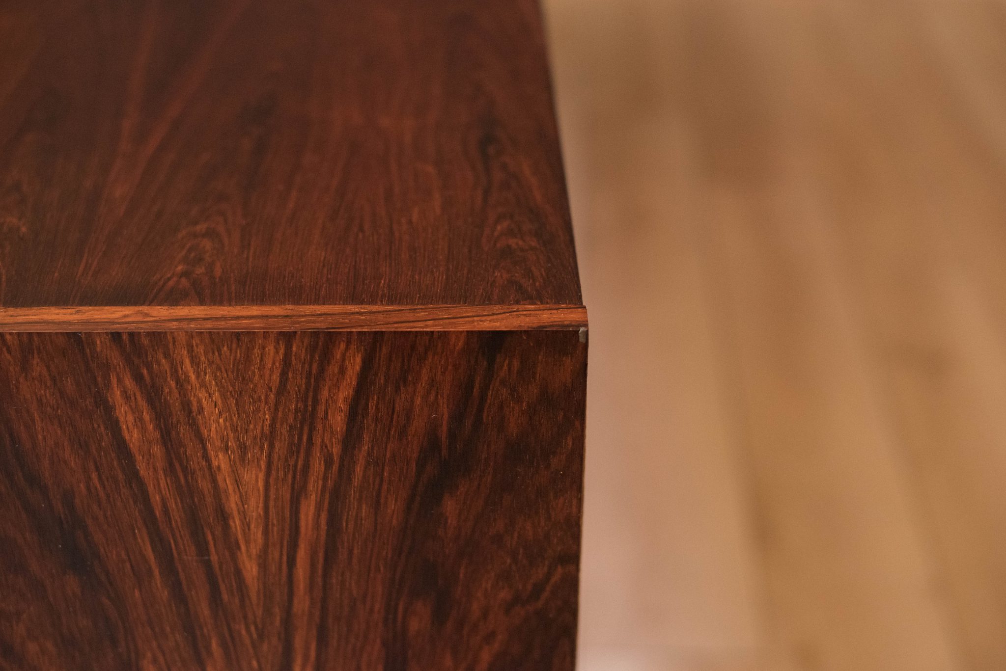 Vintage sideboard credenza in Brazilian rosewood, circa 1970s. This piece maximizes storage space including four organizing drawers and open display cabinets with one shelf. Showcases a rich rosewood grain finish complemented with chrome and aluminum accents.