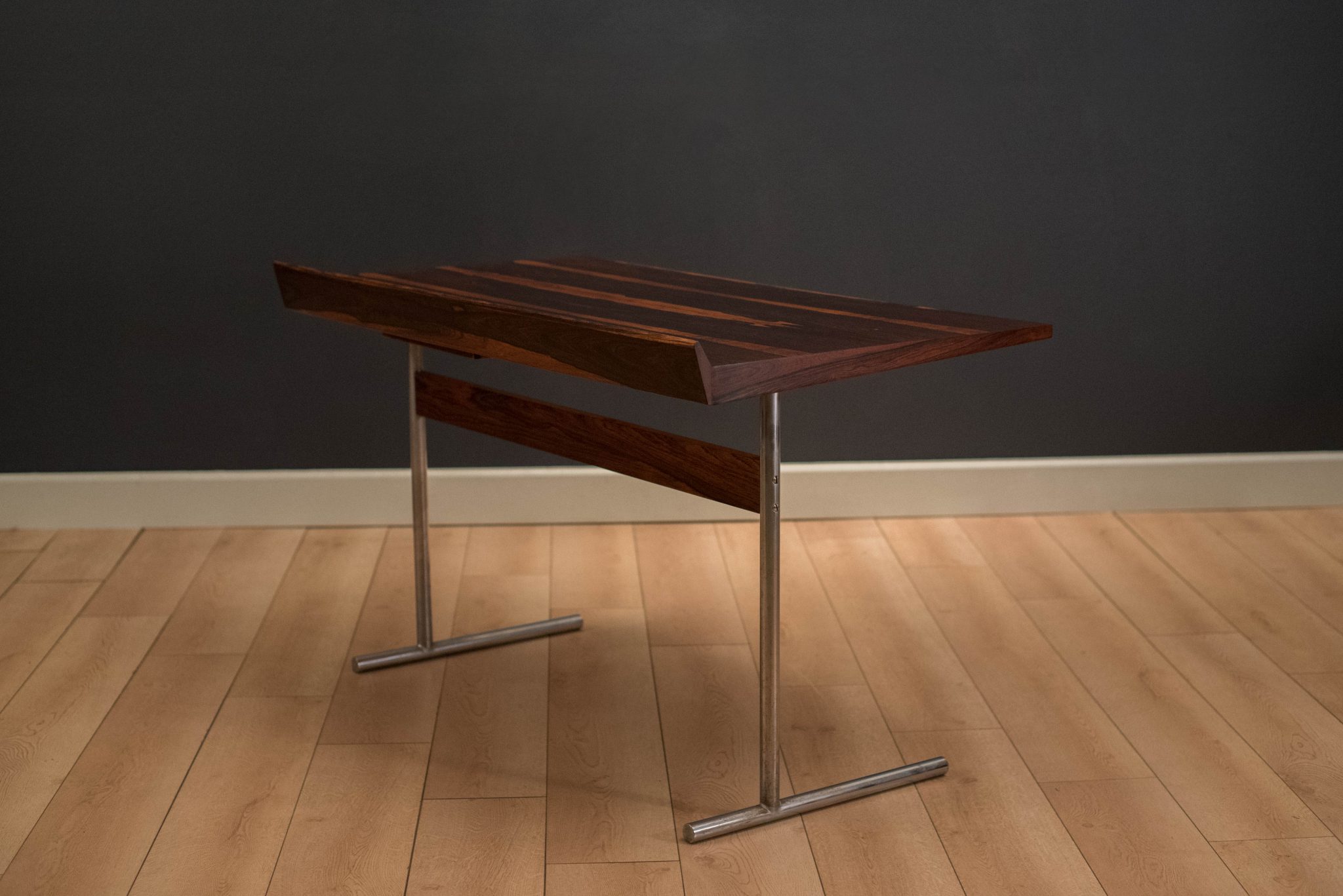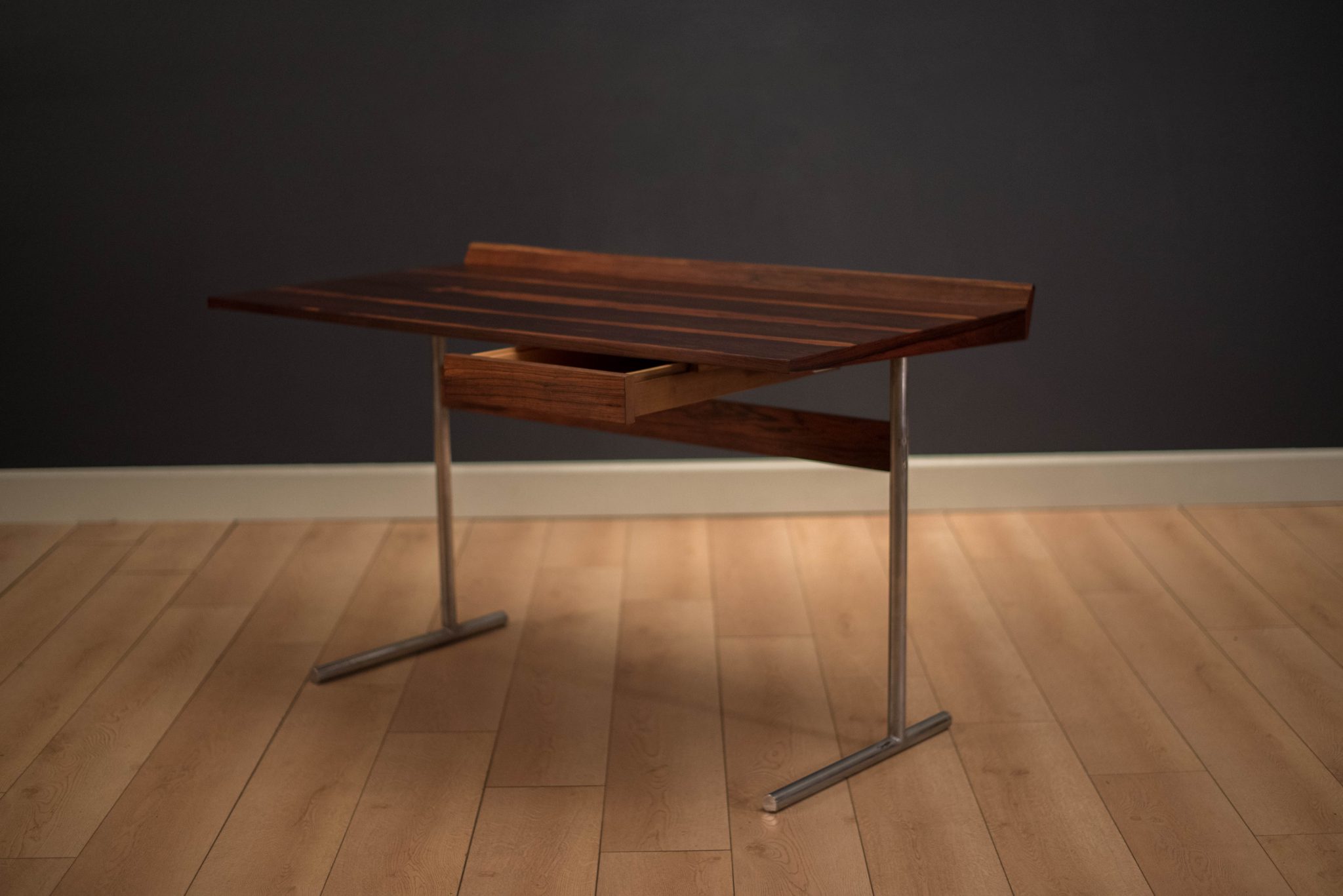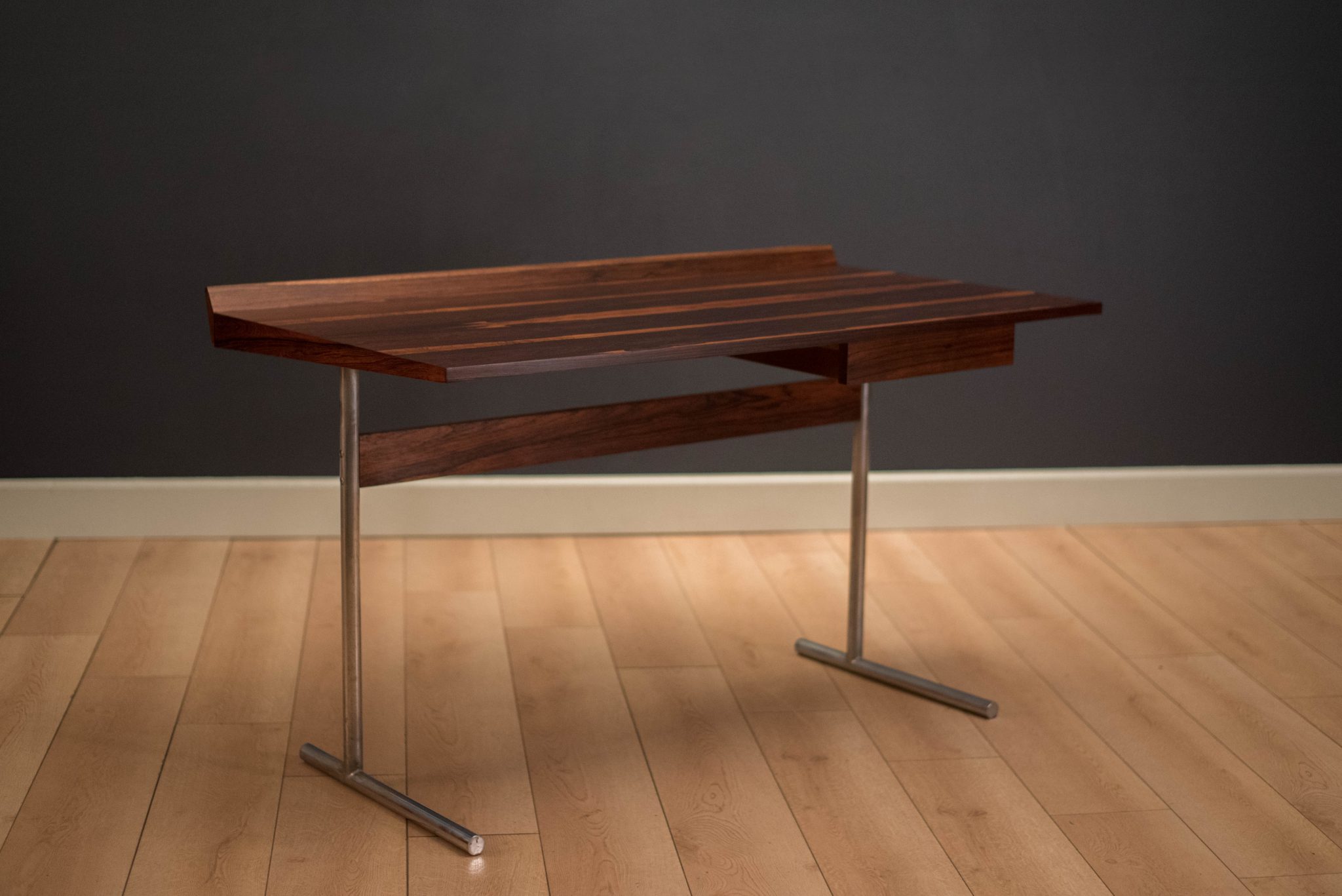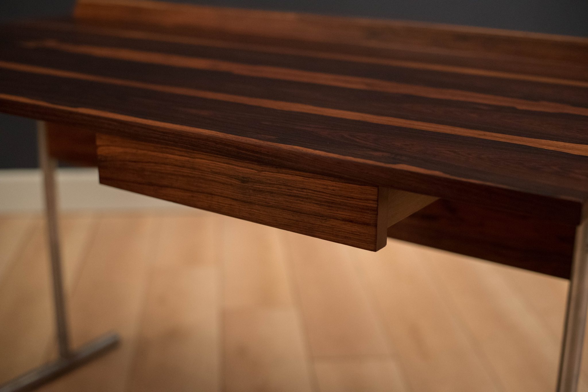 Vintage rosewood writing desk made in Western Germany. This piece features a raised edge table top and includes one storage drawer. Writing top is supported by an industrial style tubular chrome base.