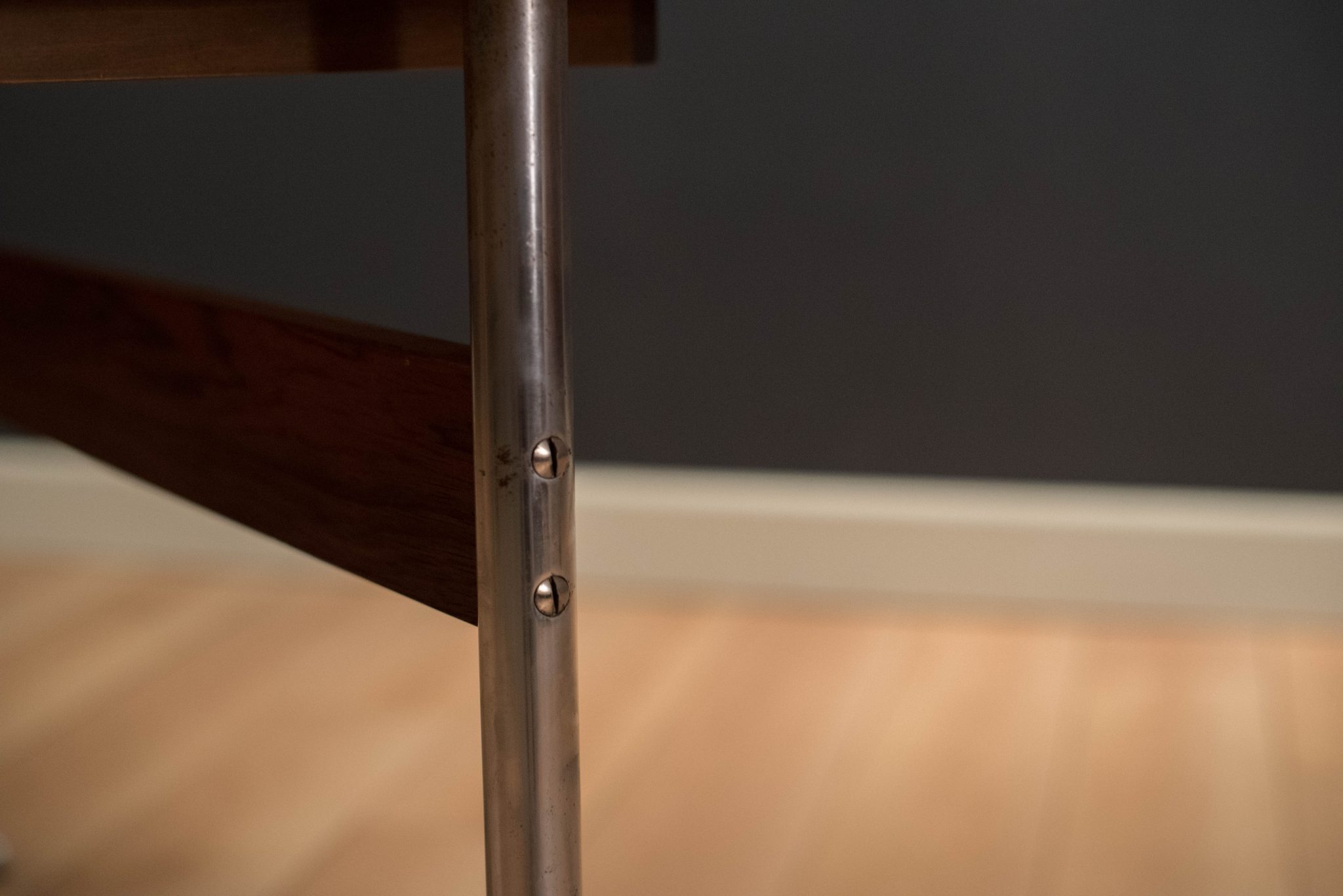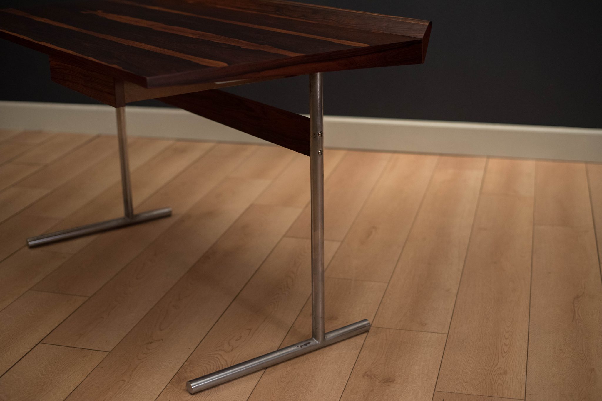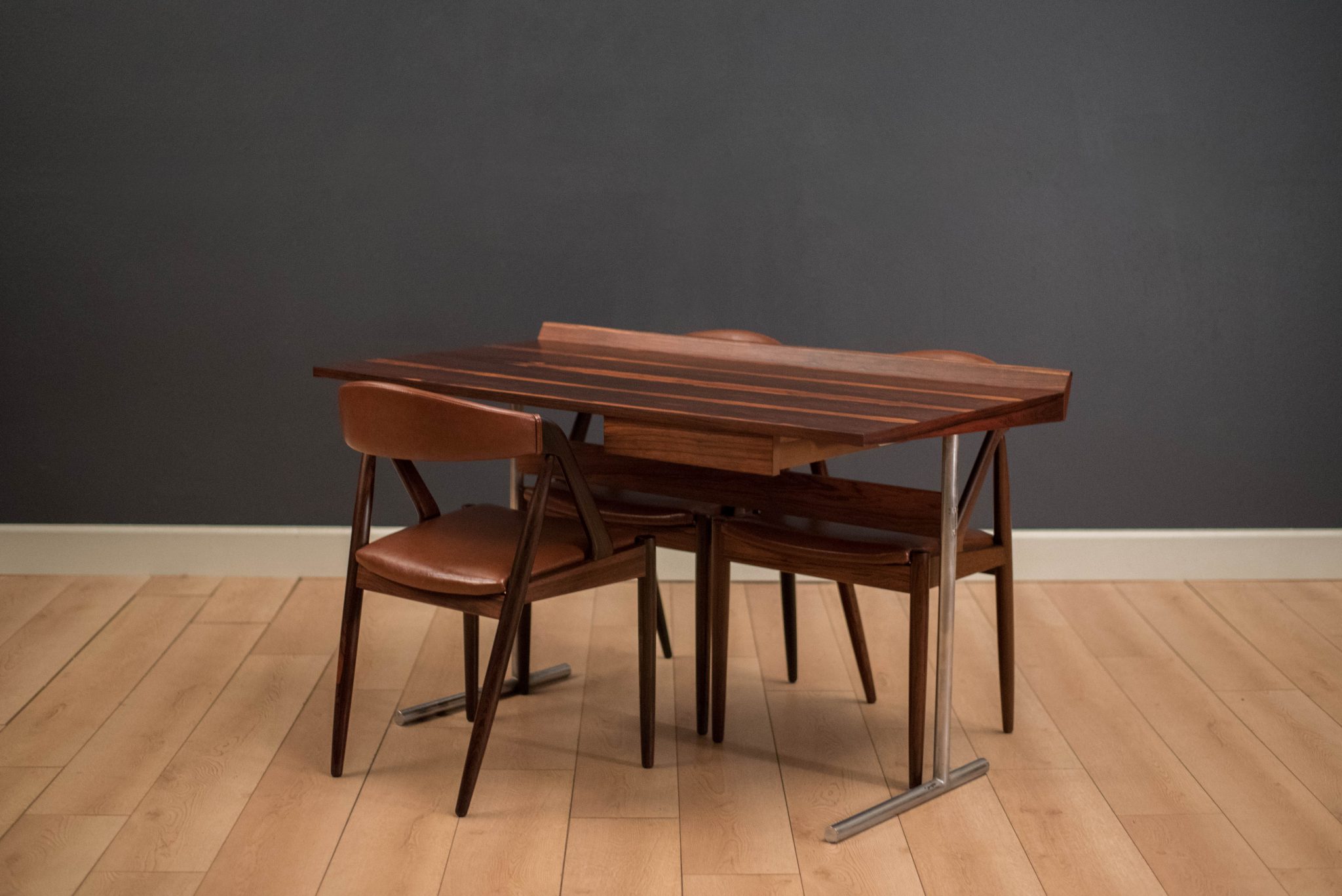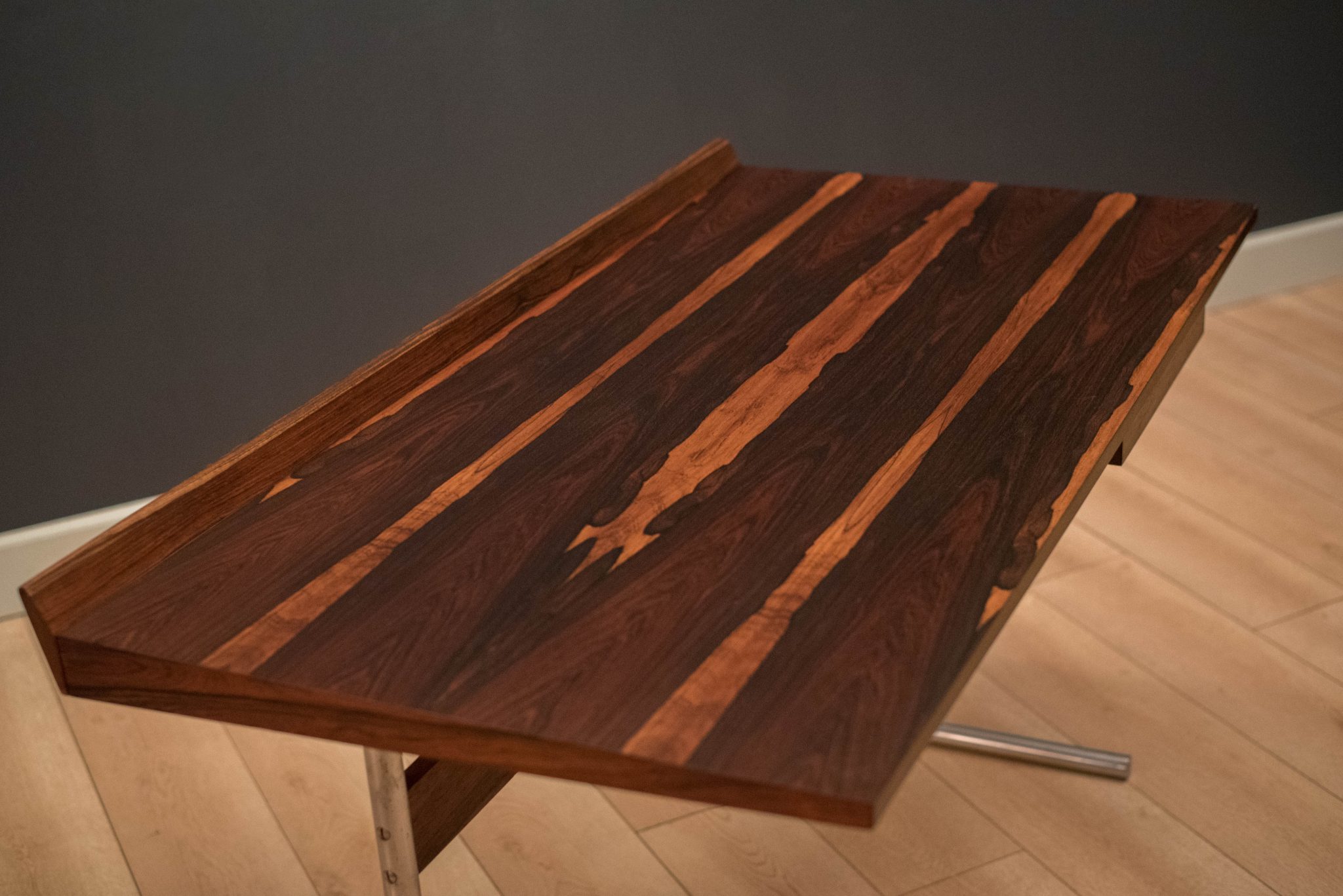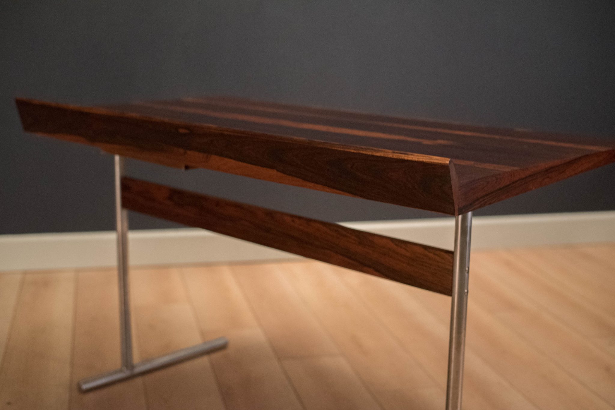 Vintage rosewood writing desk made in Western Germany. This piece features a raised edge table top and includes one storage drawer. Writing top is supported by an industrial style tubular chrome base.