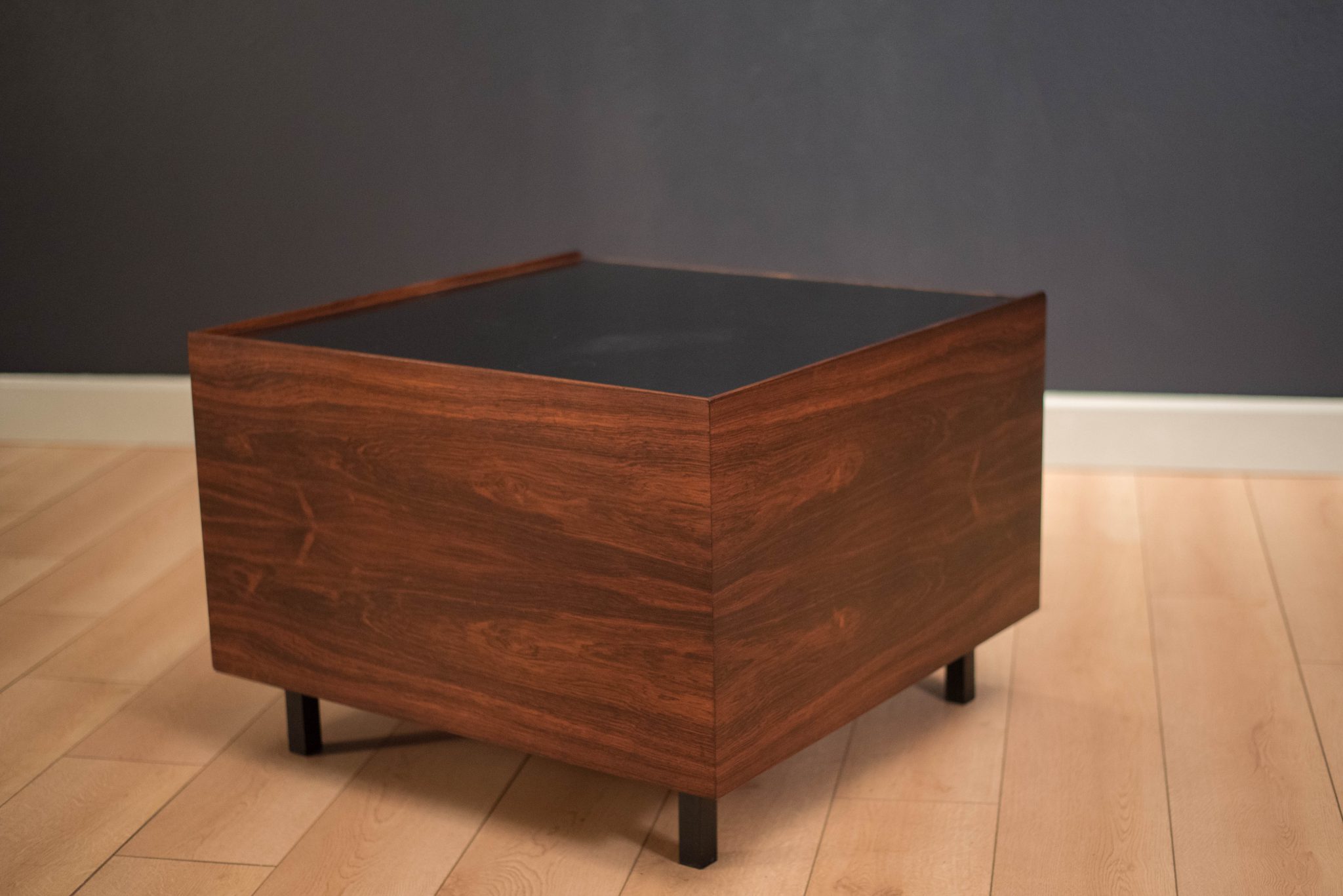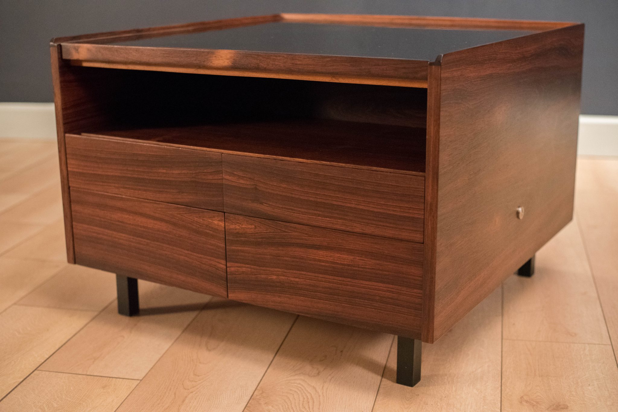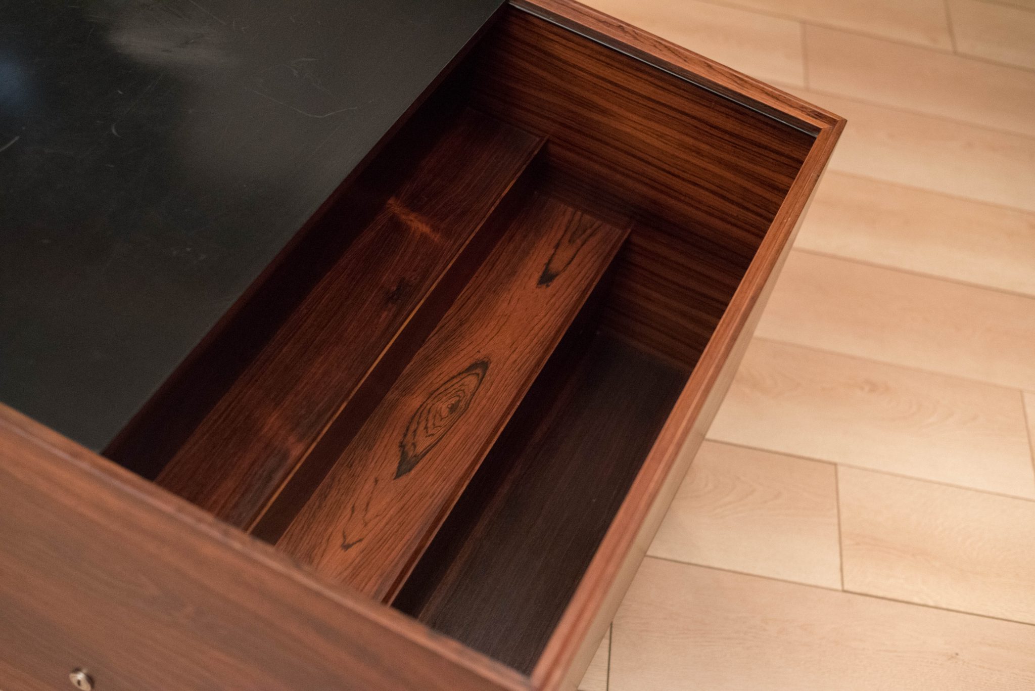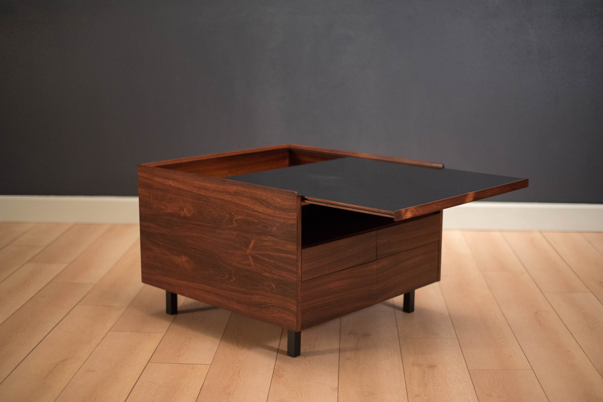 Mid Century Bar Table in rosewood by Arne Vodder for Sibast. This versatile piece can be used as a coffee or occasional side table and includes four sliding drawers. Black laminate top slides to reveal hidden storage.