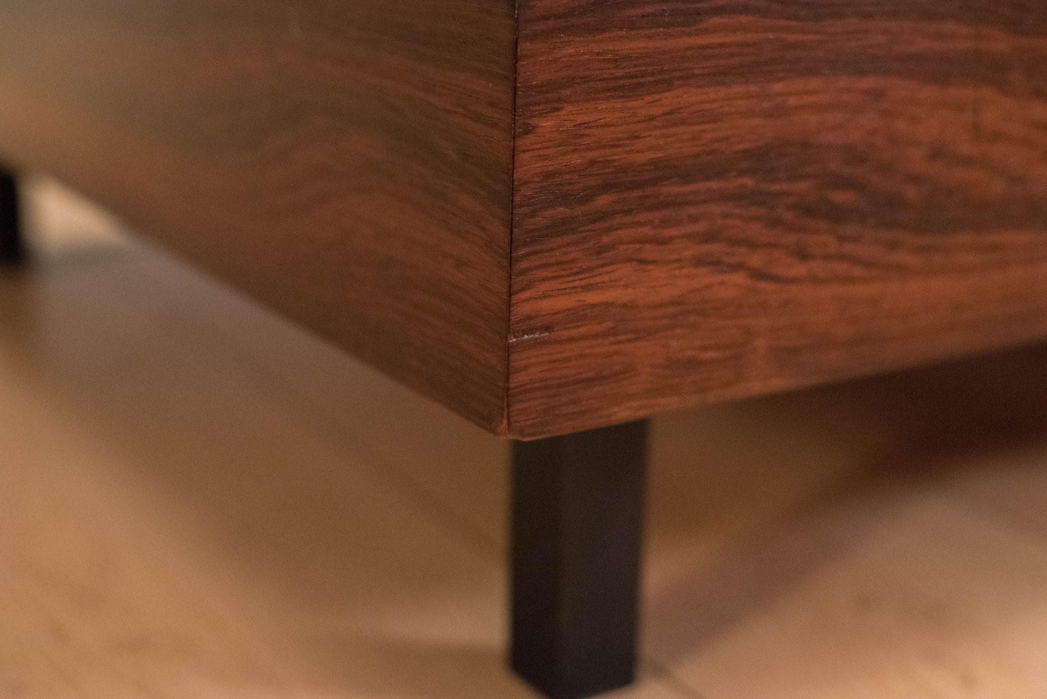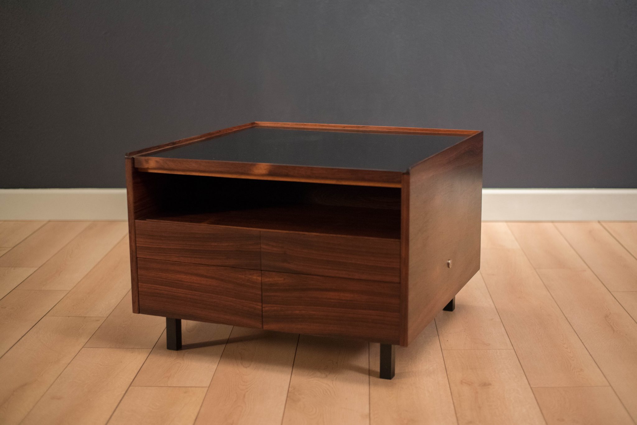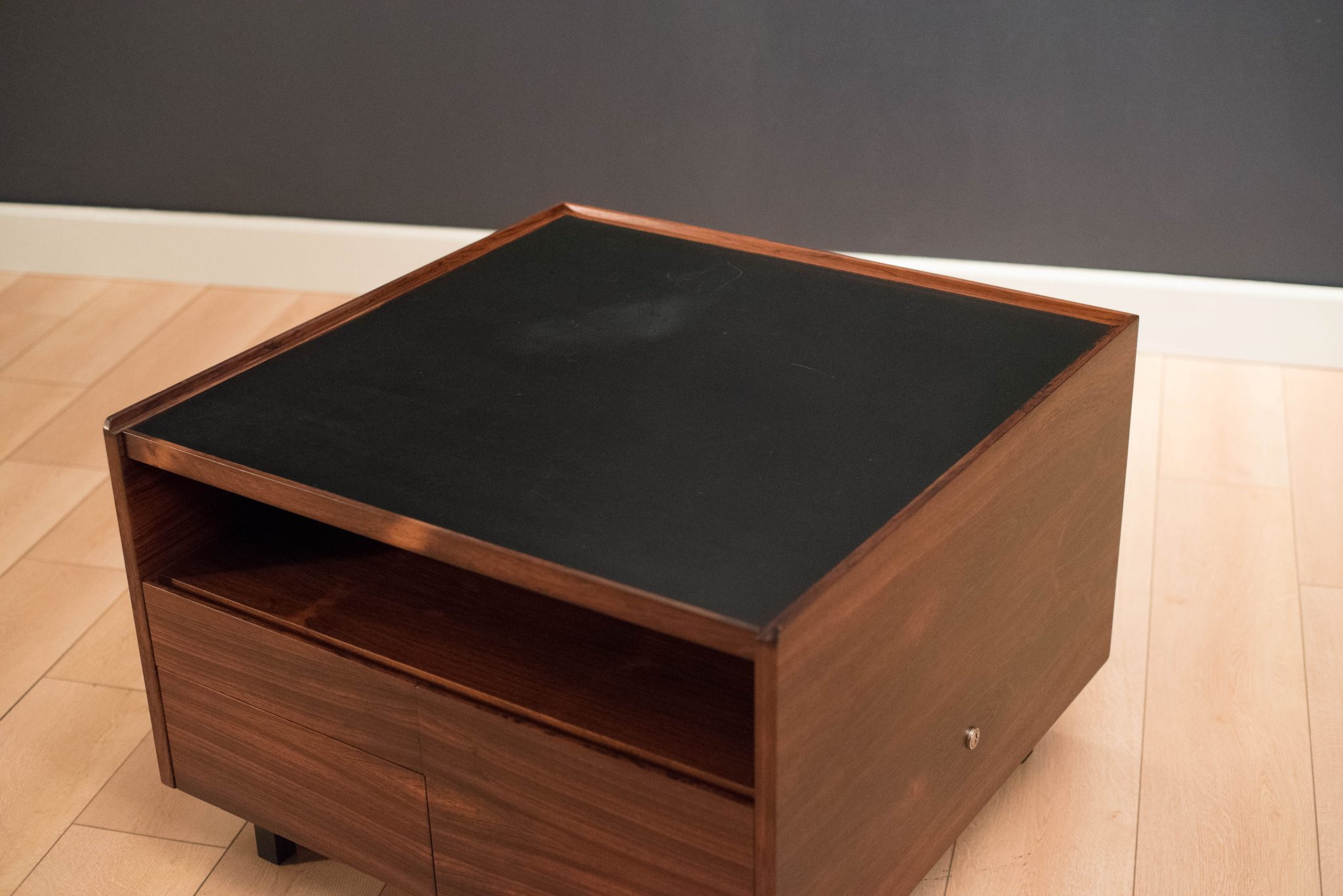 Mid Century Bar Table in rosewood by Arne Vodder for Sibast. This versatile piece can be used as a coffee or occasional side table and includes four sliding drawers. Black laminate top slides to reveal hidden storage.