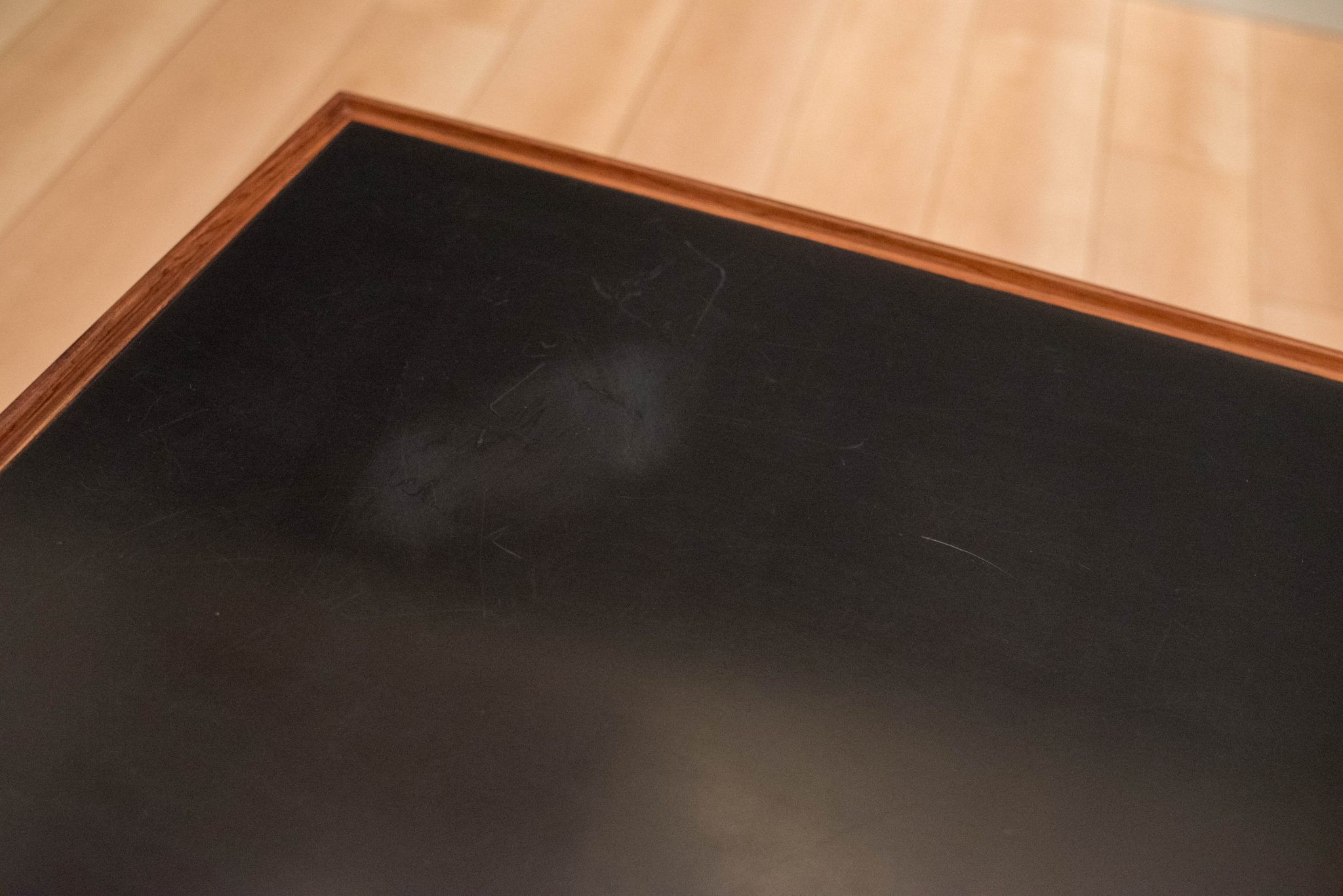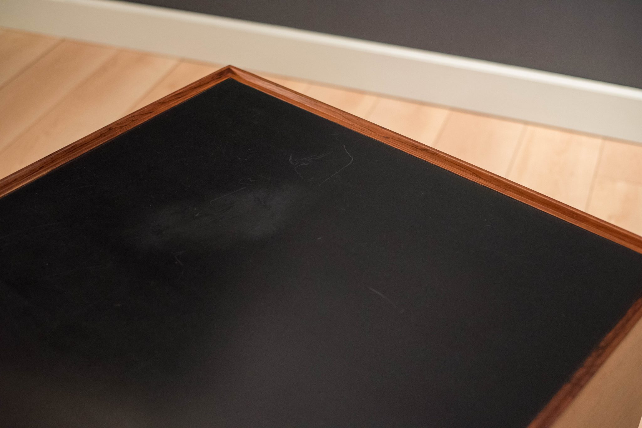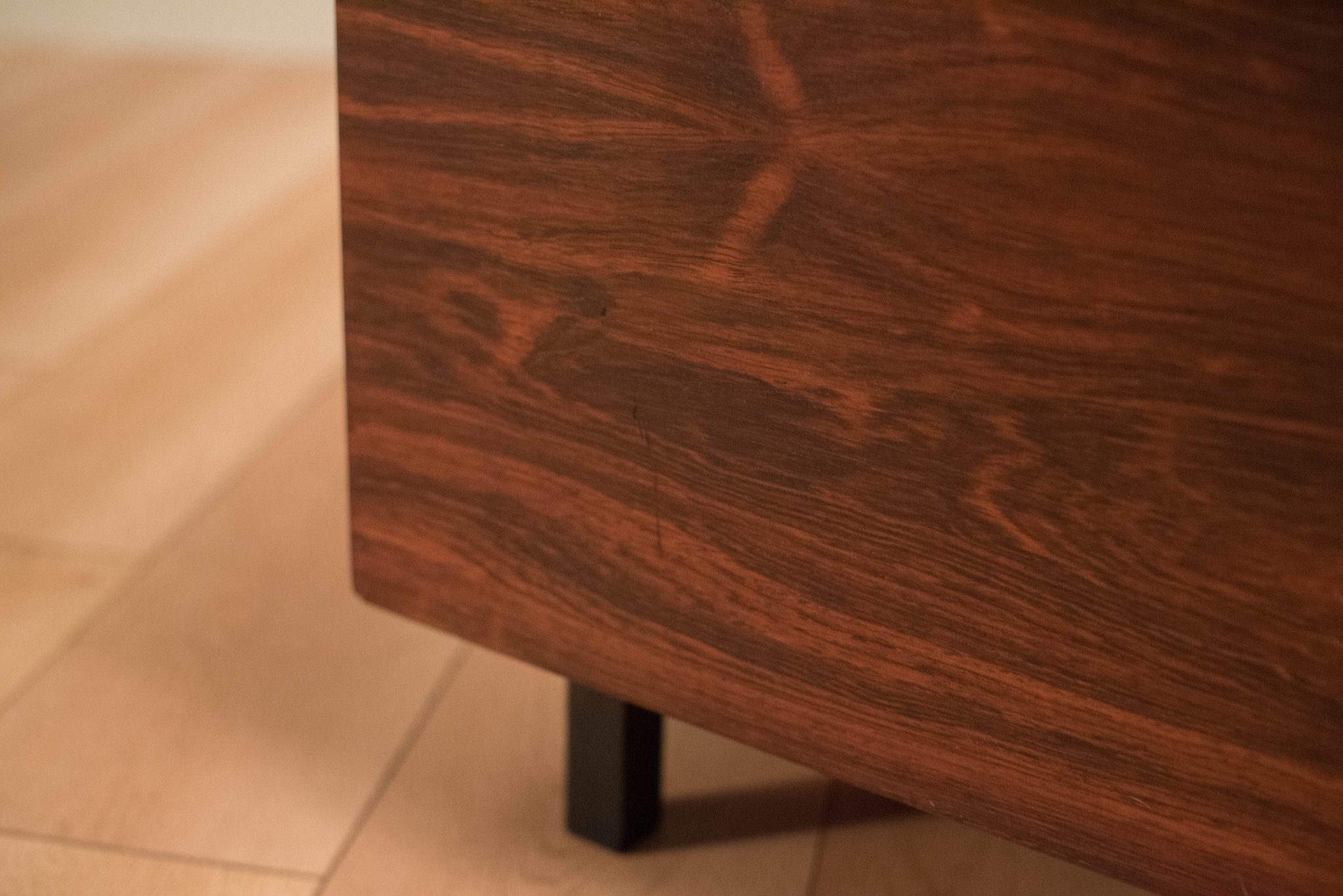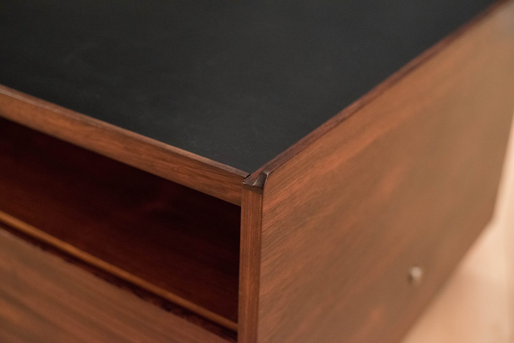 Mid Century Bar Table in rosewood by Arne Vodder for Sibast. This versatile piece can be used as a coffee or occasional side table and includes four sliding drawers. Black laminate top slides to reveal hidden storage.