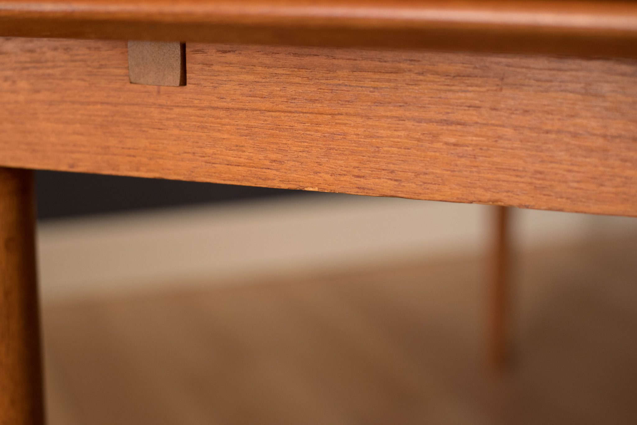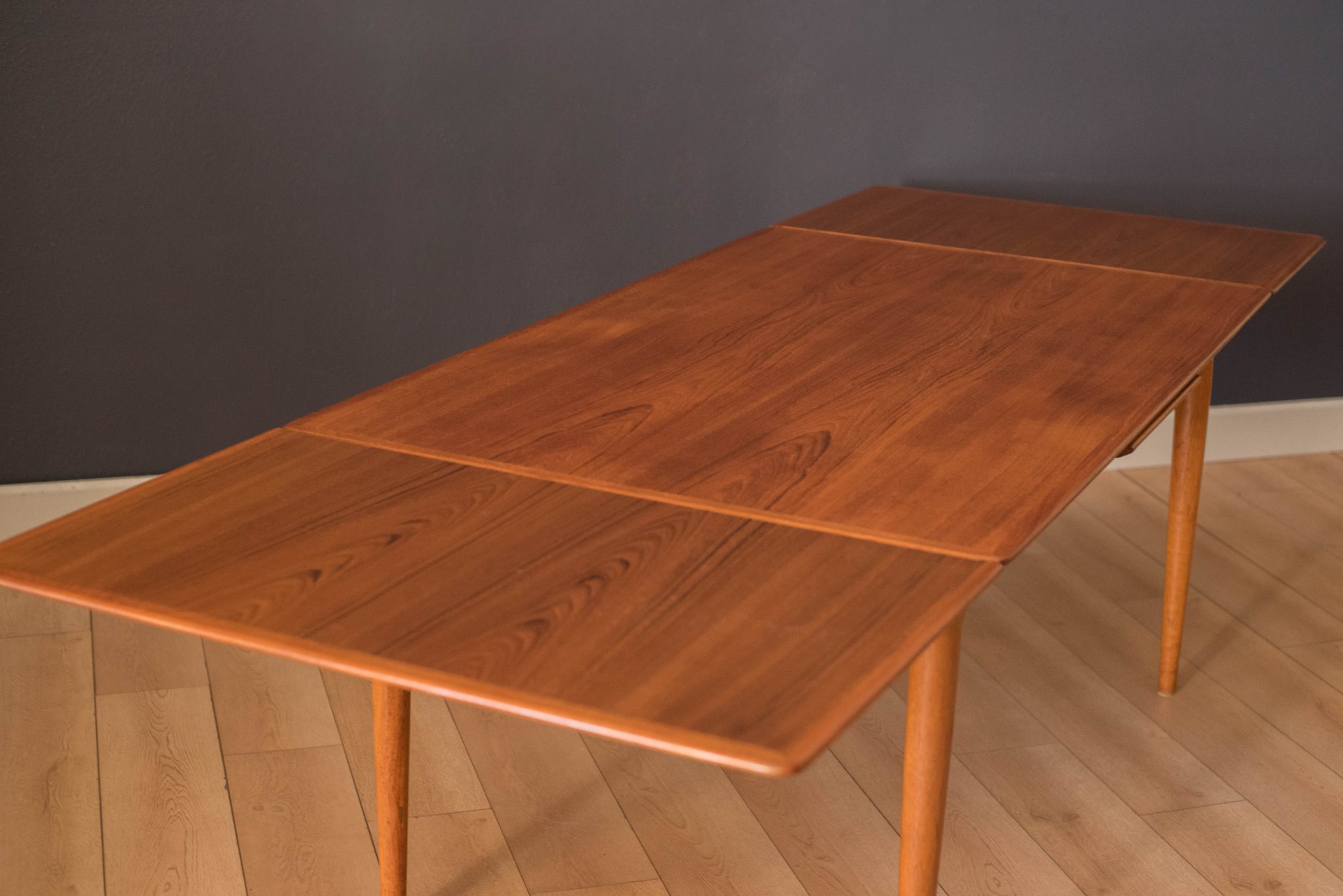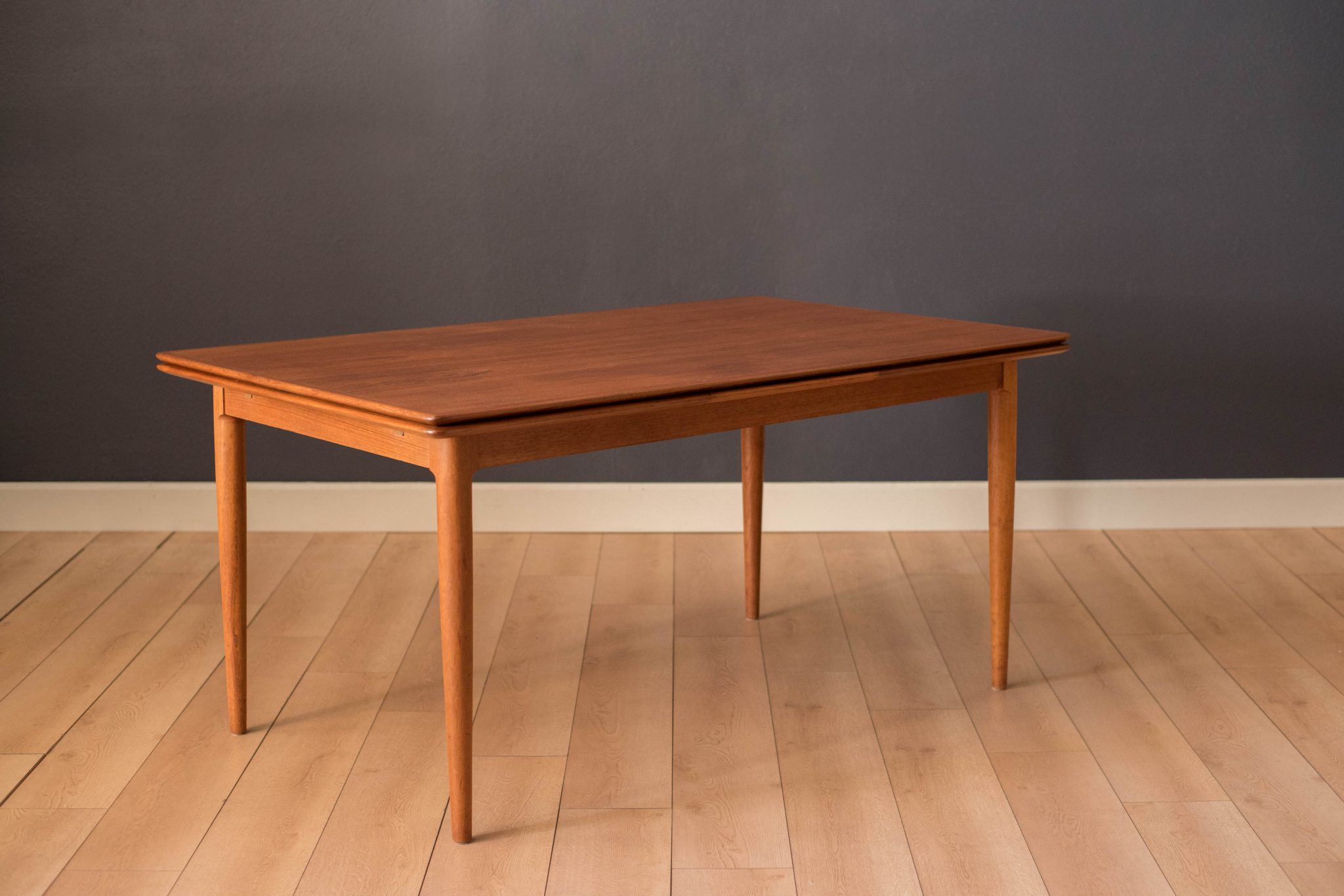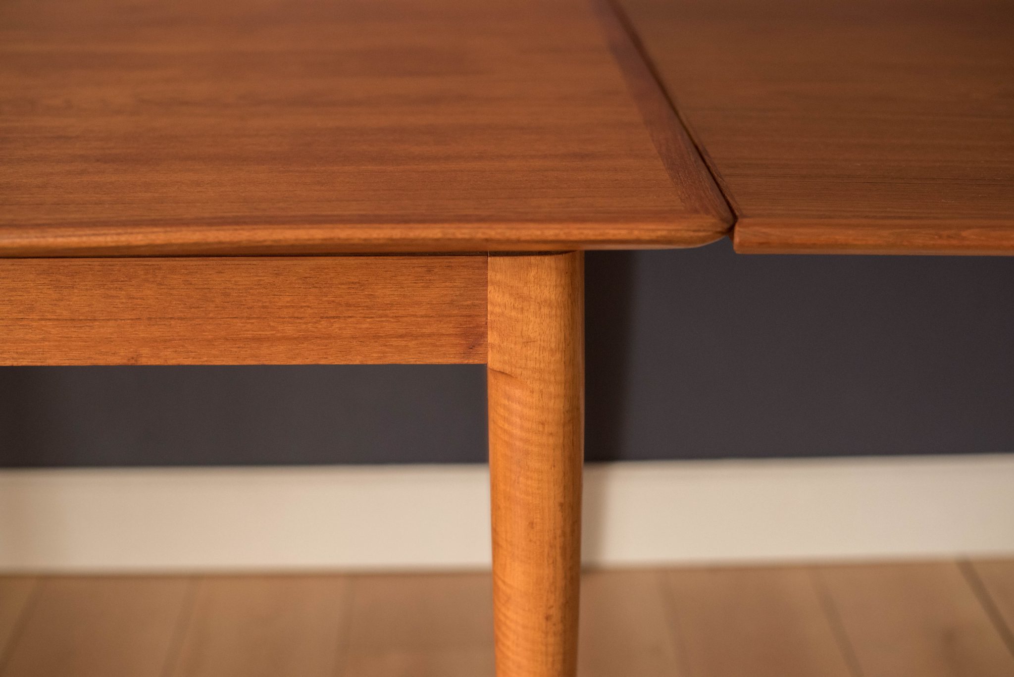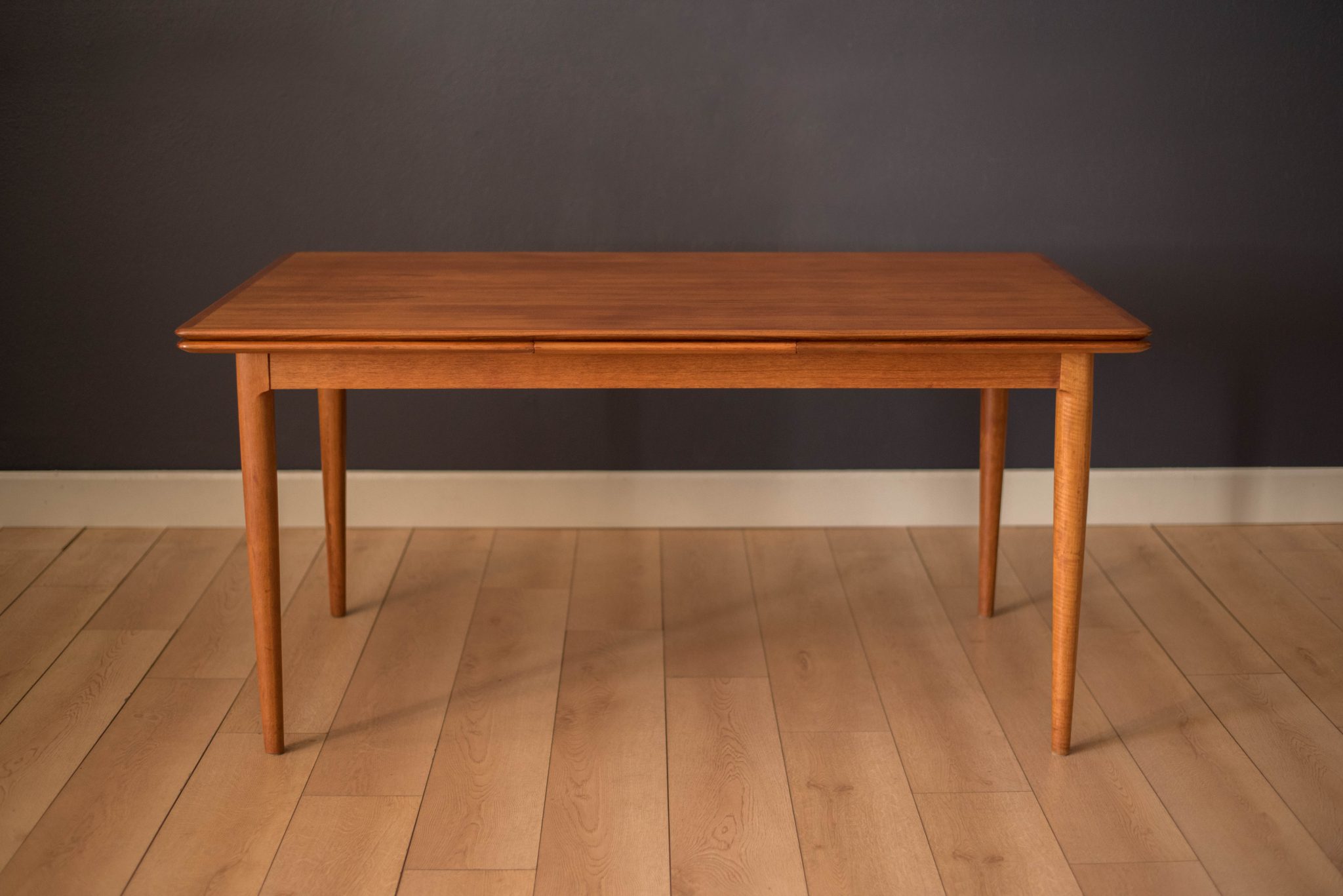 Vintage draw leaf expandable dining table in teak, circa 1960s. This piece features unique sculpted details and extends with two leaves that cleverly store underneath the table.