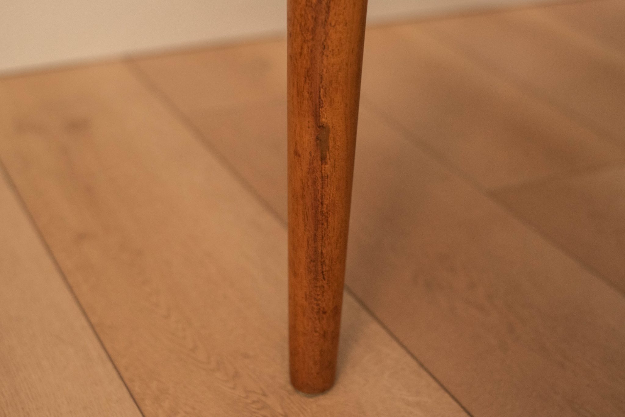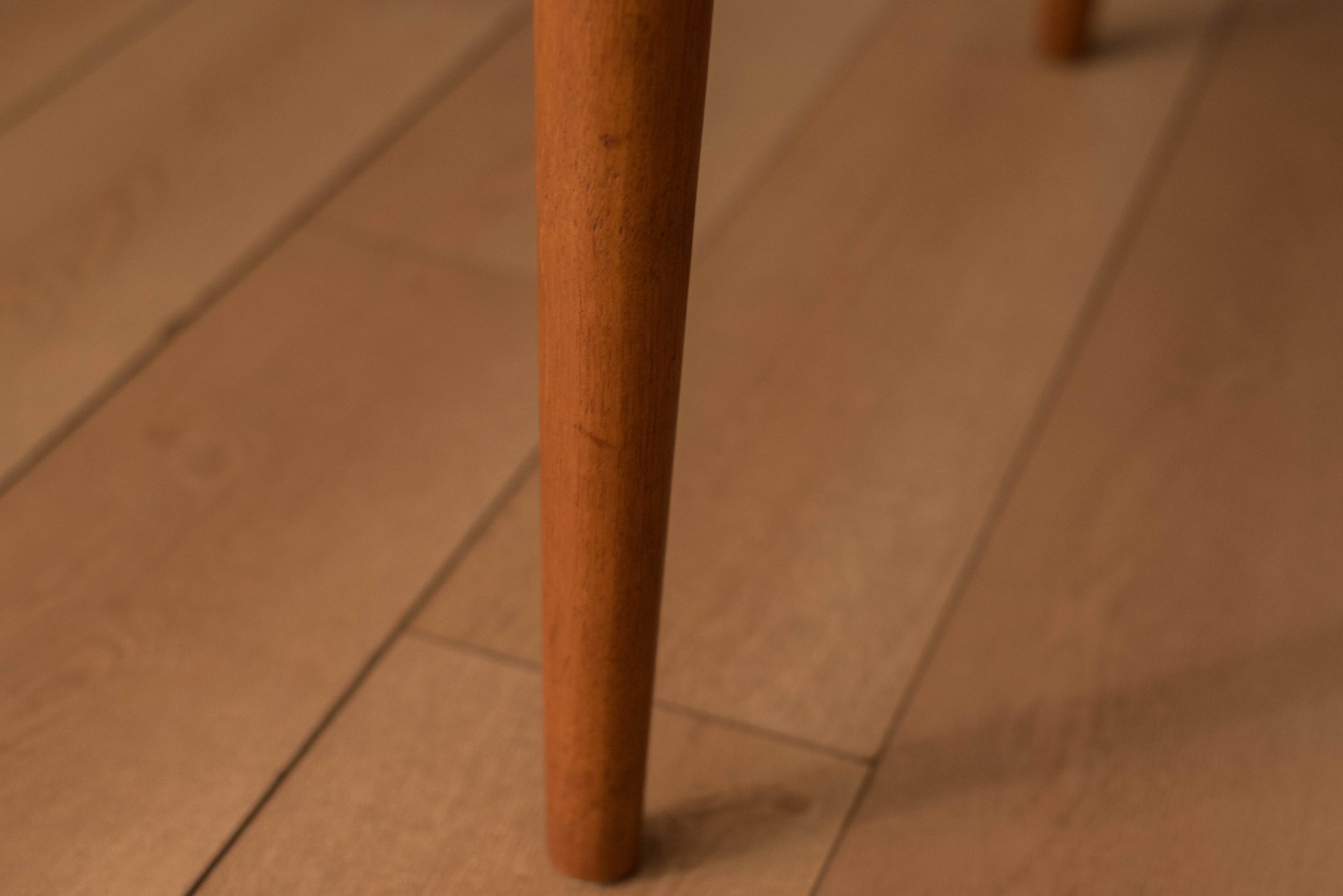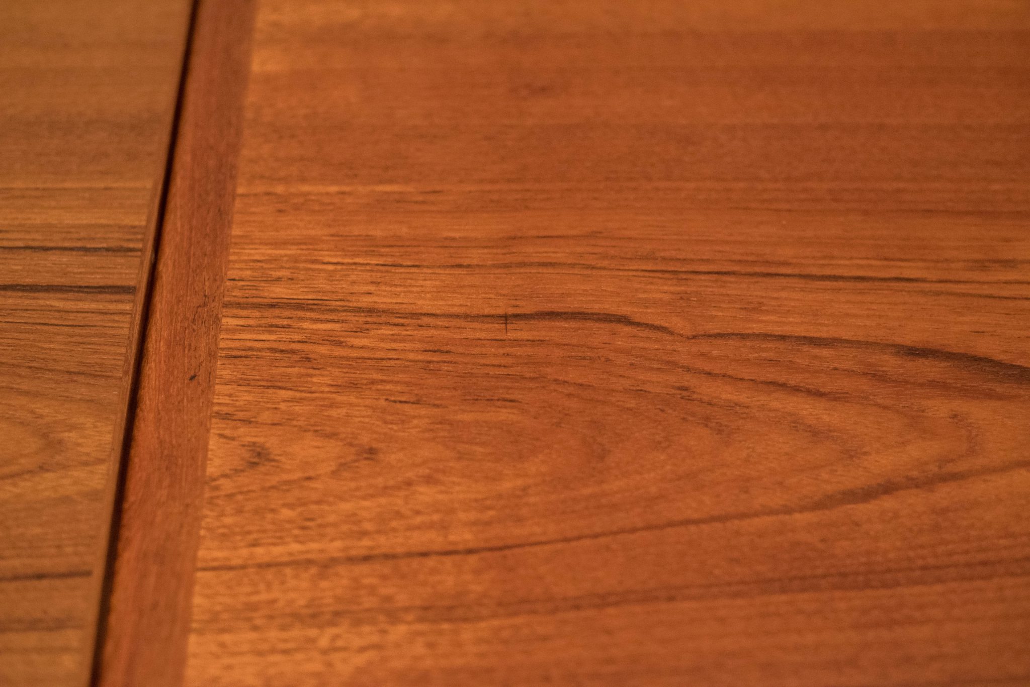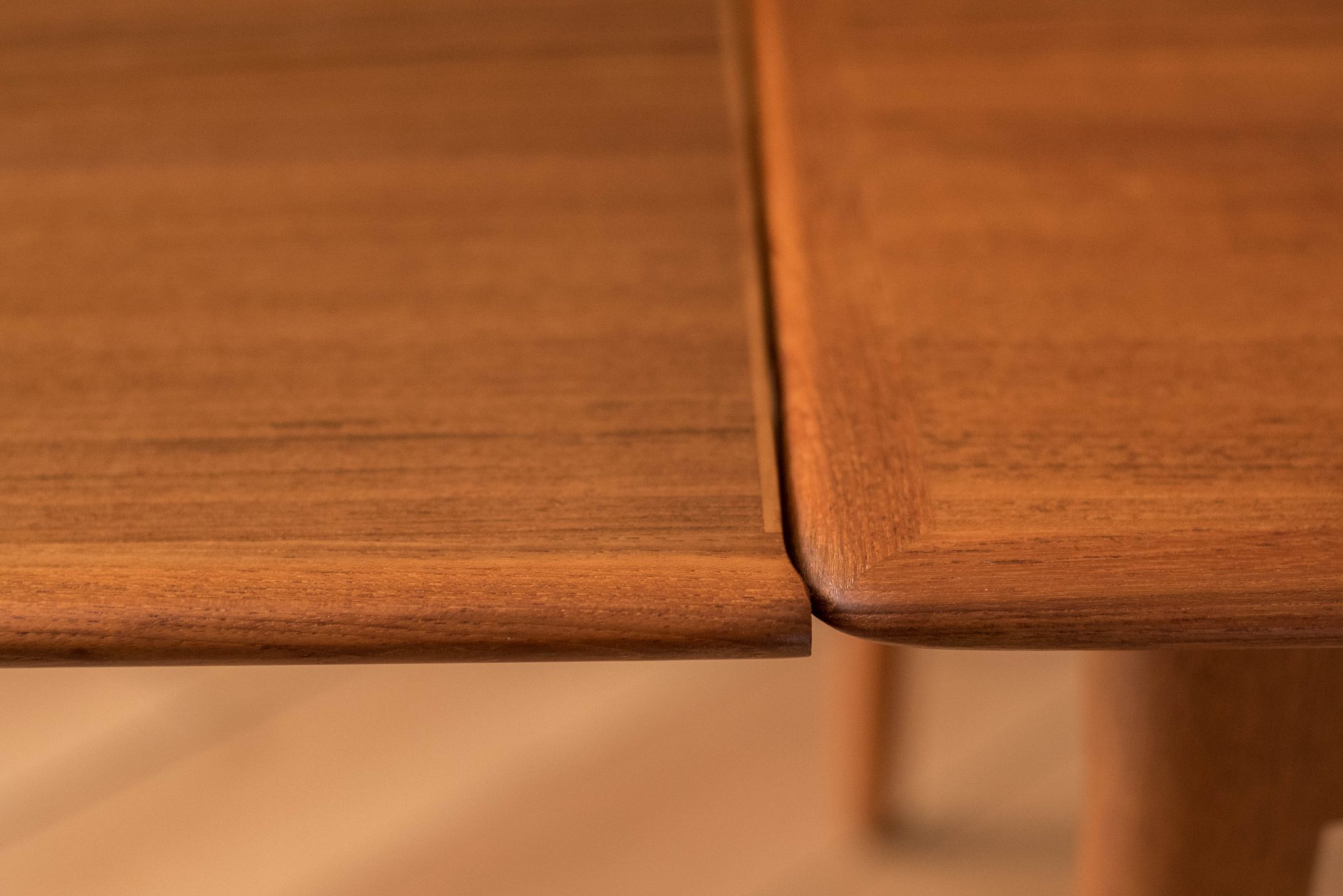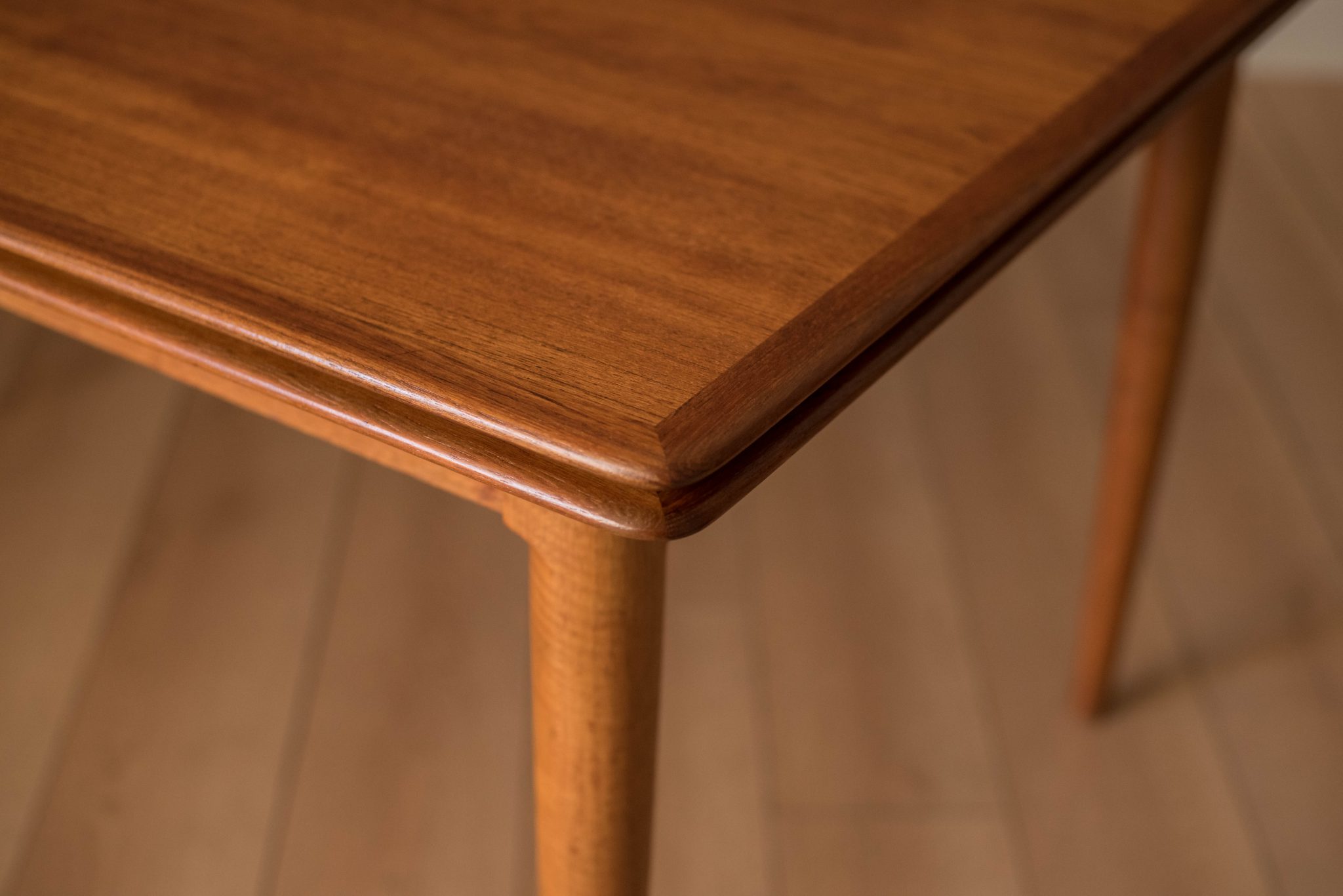 Vintage draw leaf expandable dining table in teak, circa 1960s. This piece features unique sculpted details and extends with two leaves that cleverly store underneath the table.