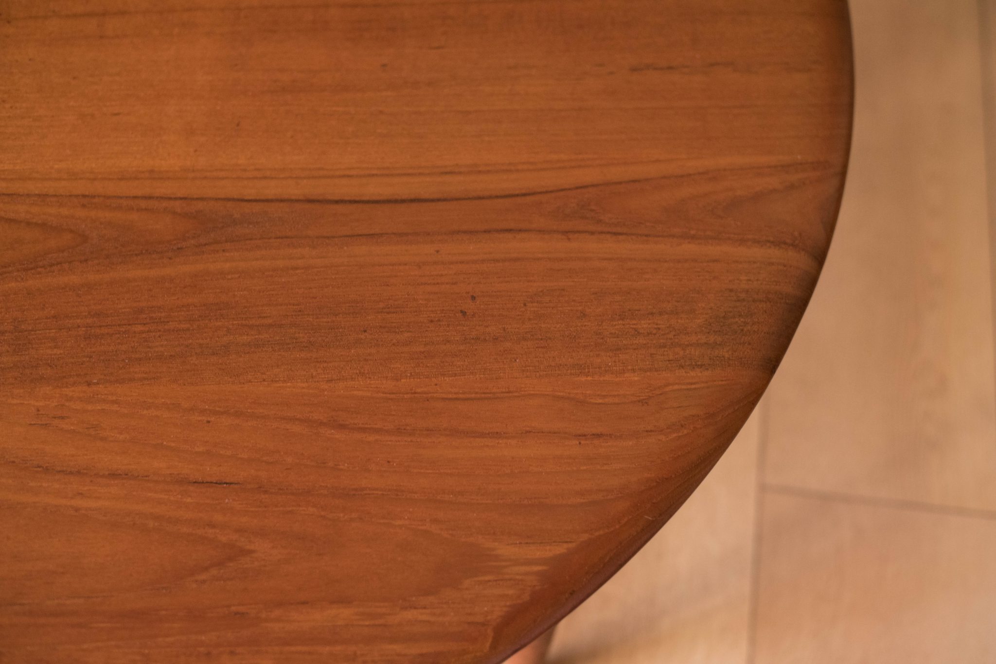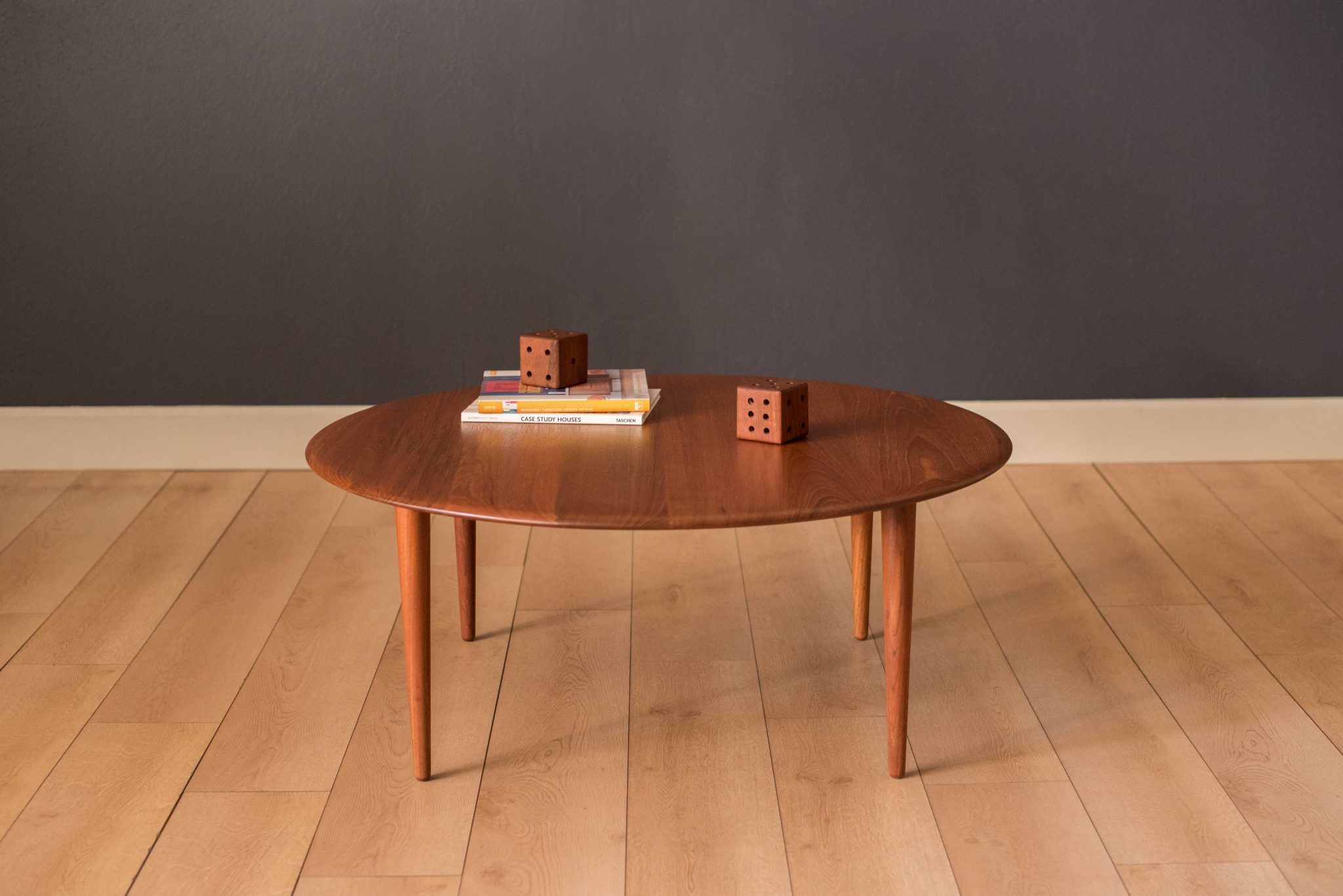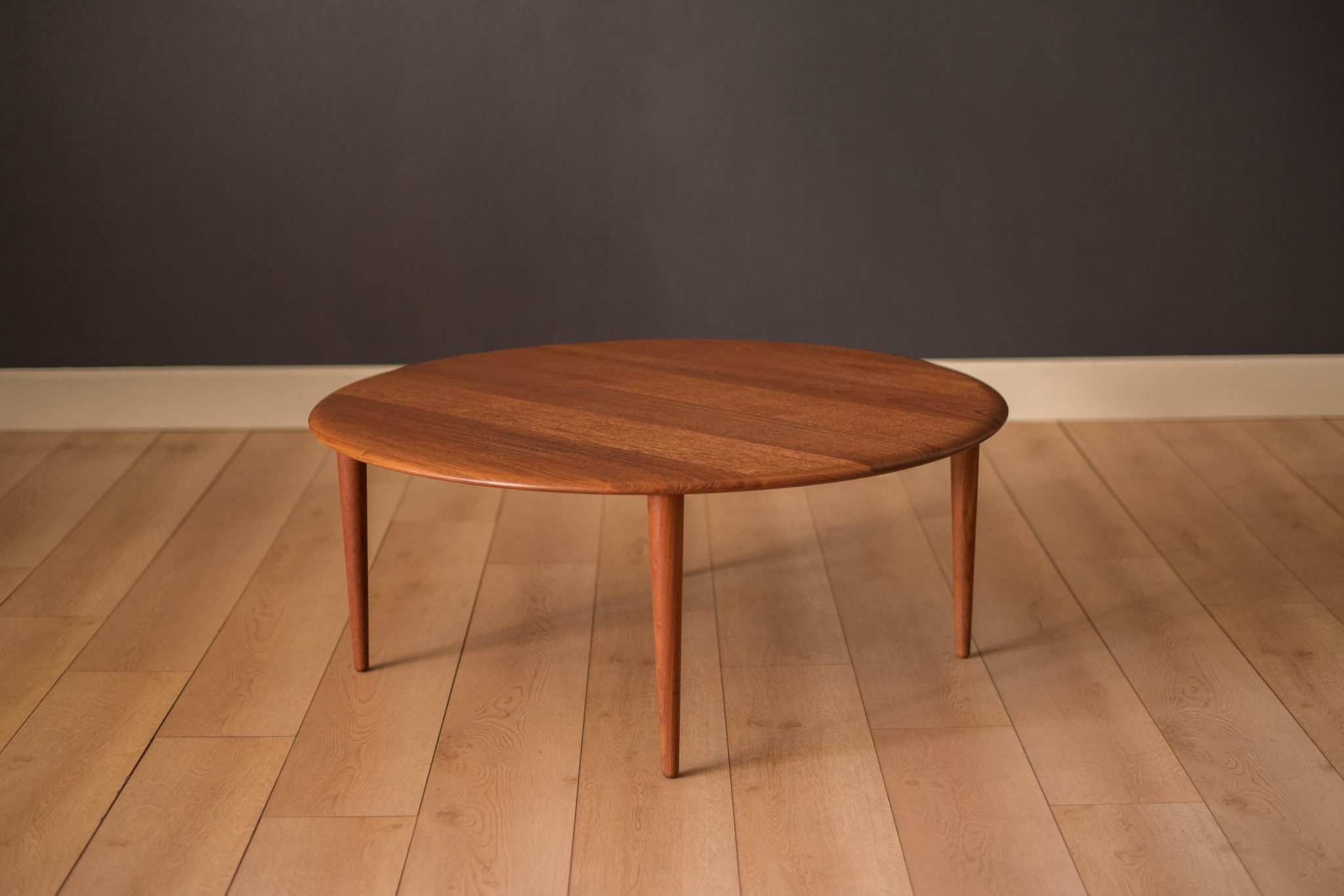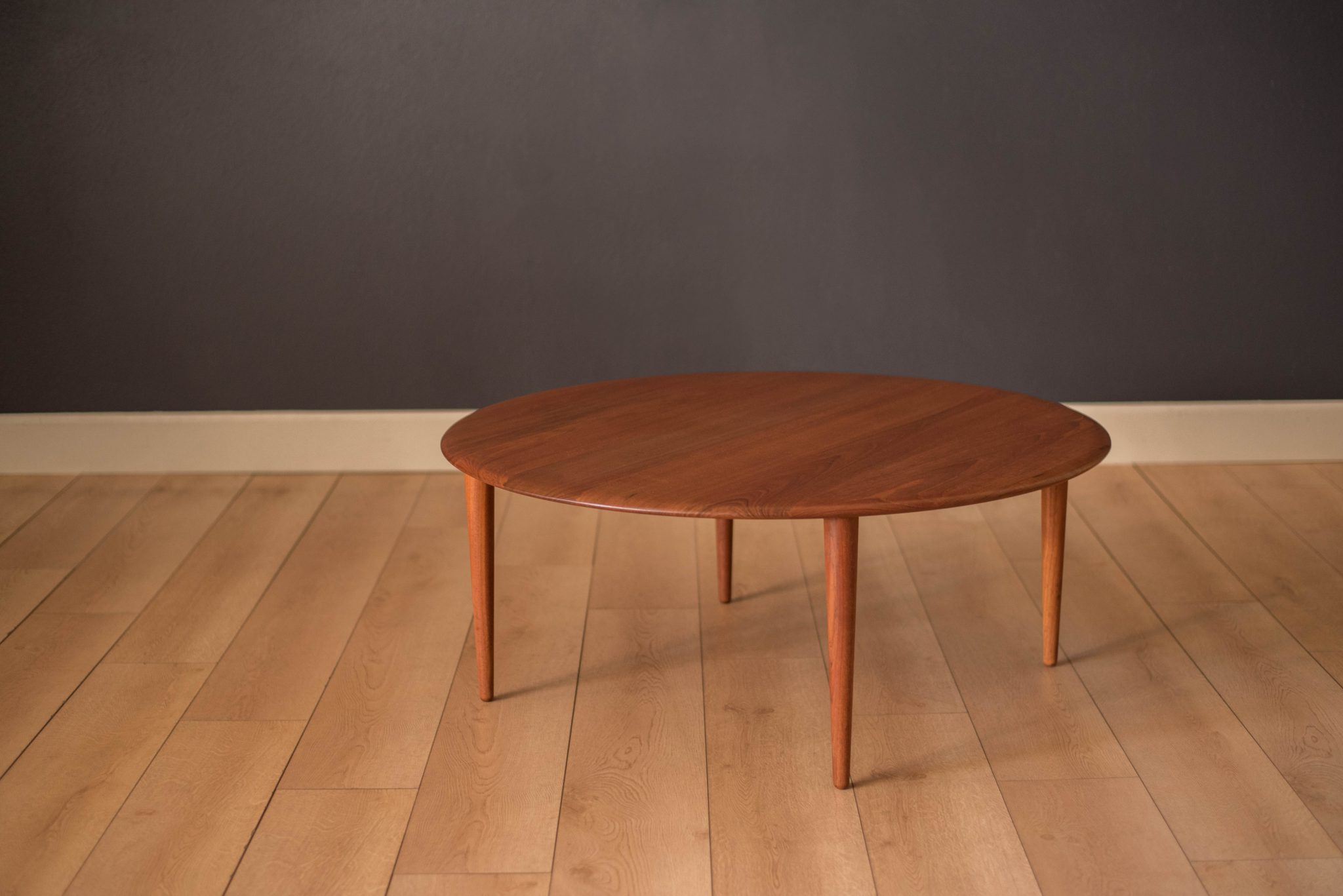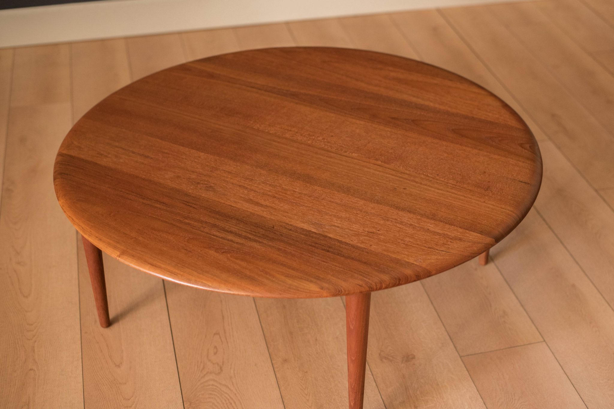 Vintage round coffee table model FD 515 designed by Peter Hvidt and Orla Mølgaard-Nielsen for France & Søn. This piece displays a low profile and is constructed of solid planked teak.