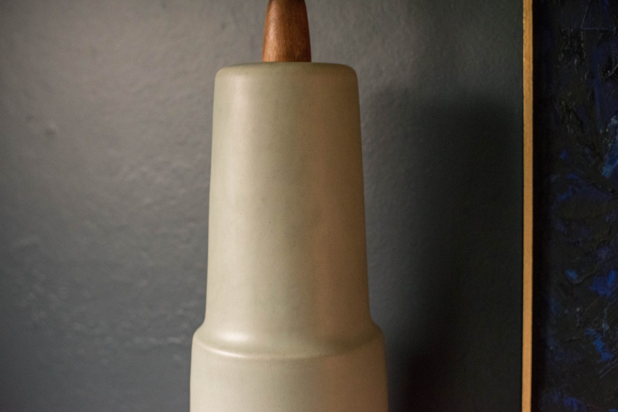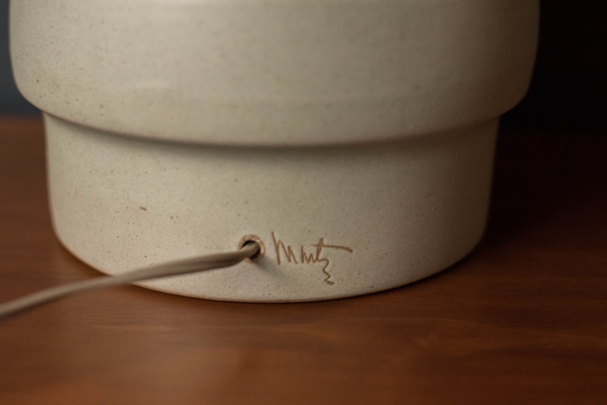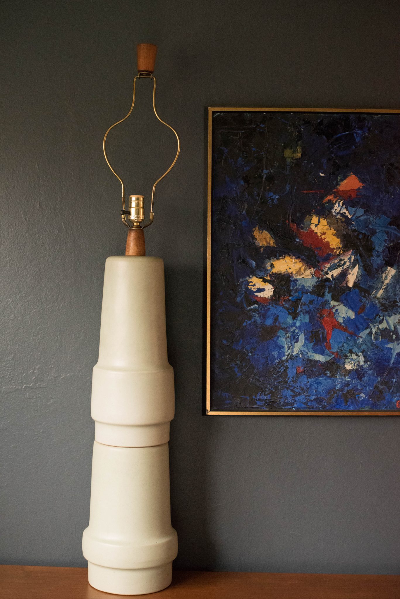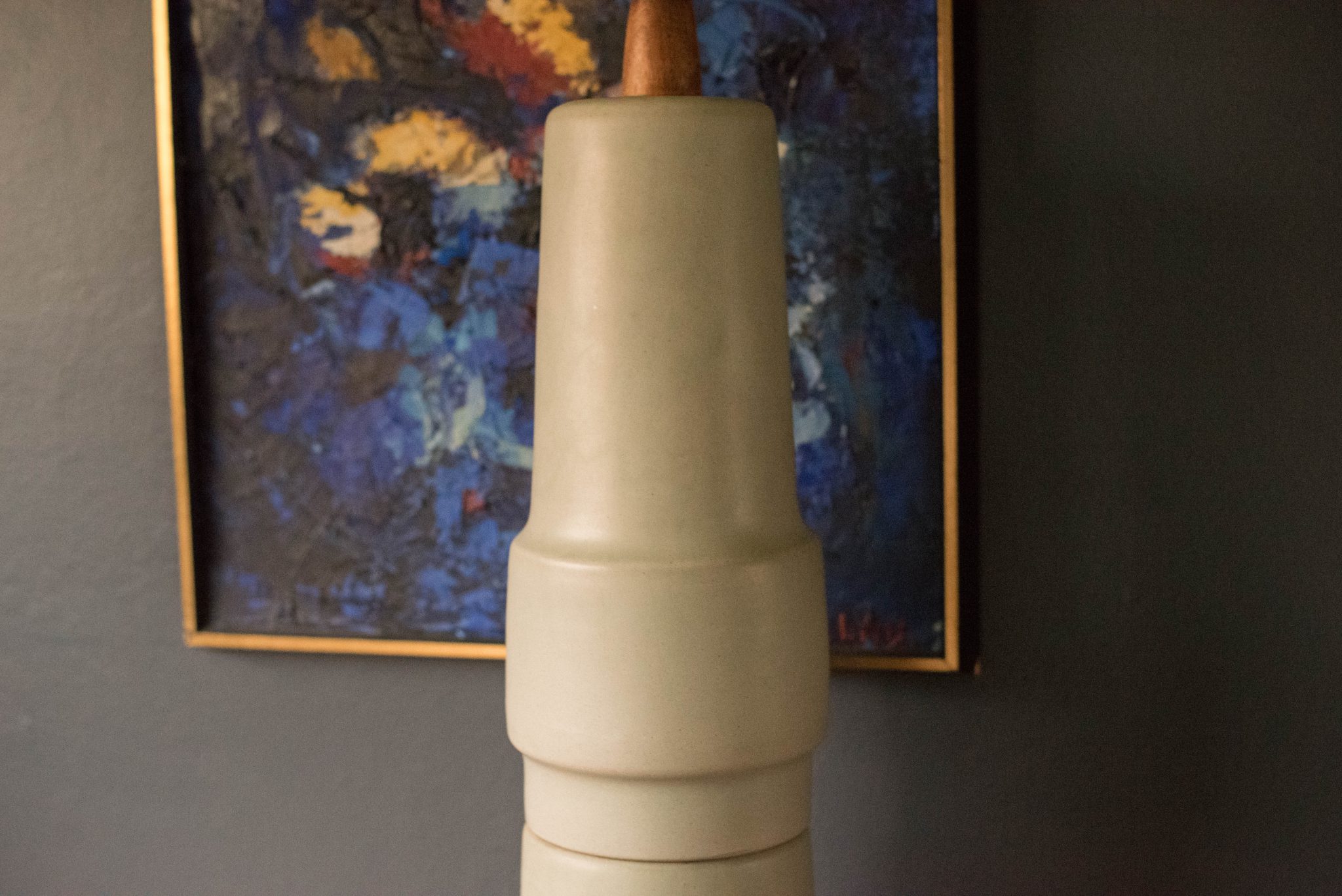 Mid Century ceramic and walnut lamp by Gordon and Jane Martz for Marshall Studios. This oversized lamp features a sculptural stacked form and includes a three way switch mechanism.