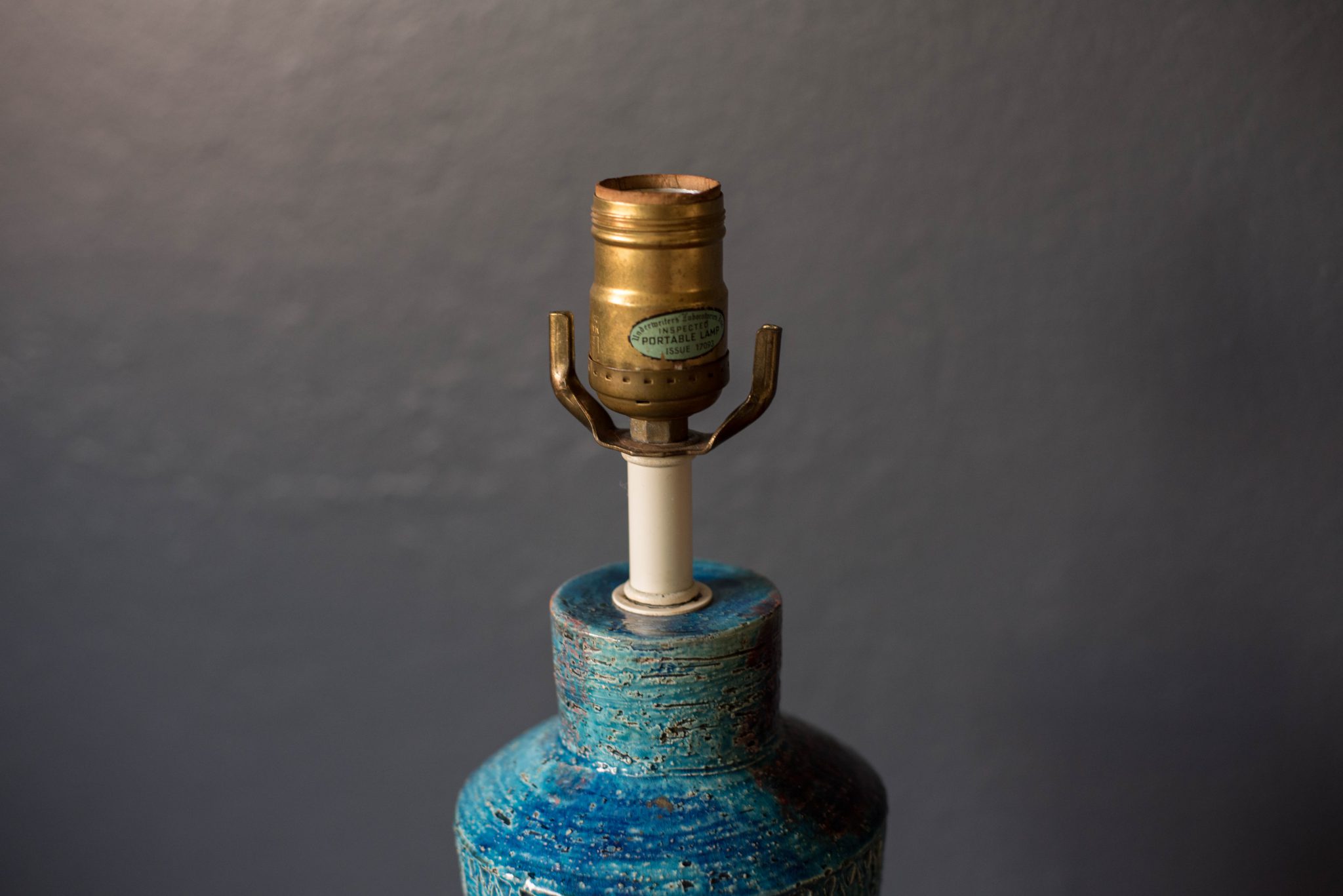 Vintage tall ceramic pottery lamp designed by Aldo Londi for Bitossi, made in Italy. This piece features a textural etched geometric design finished in a Rimini blue glaze.