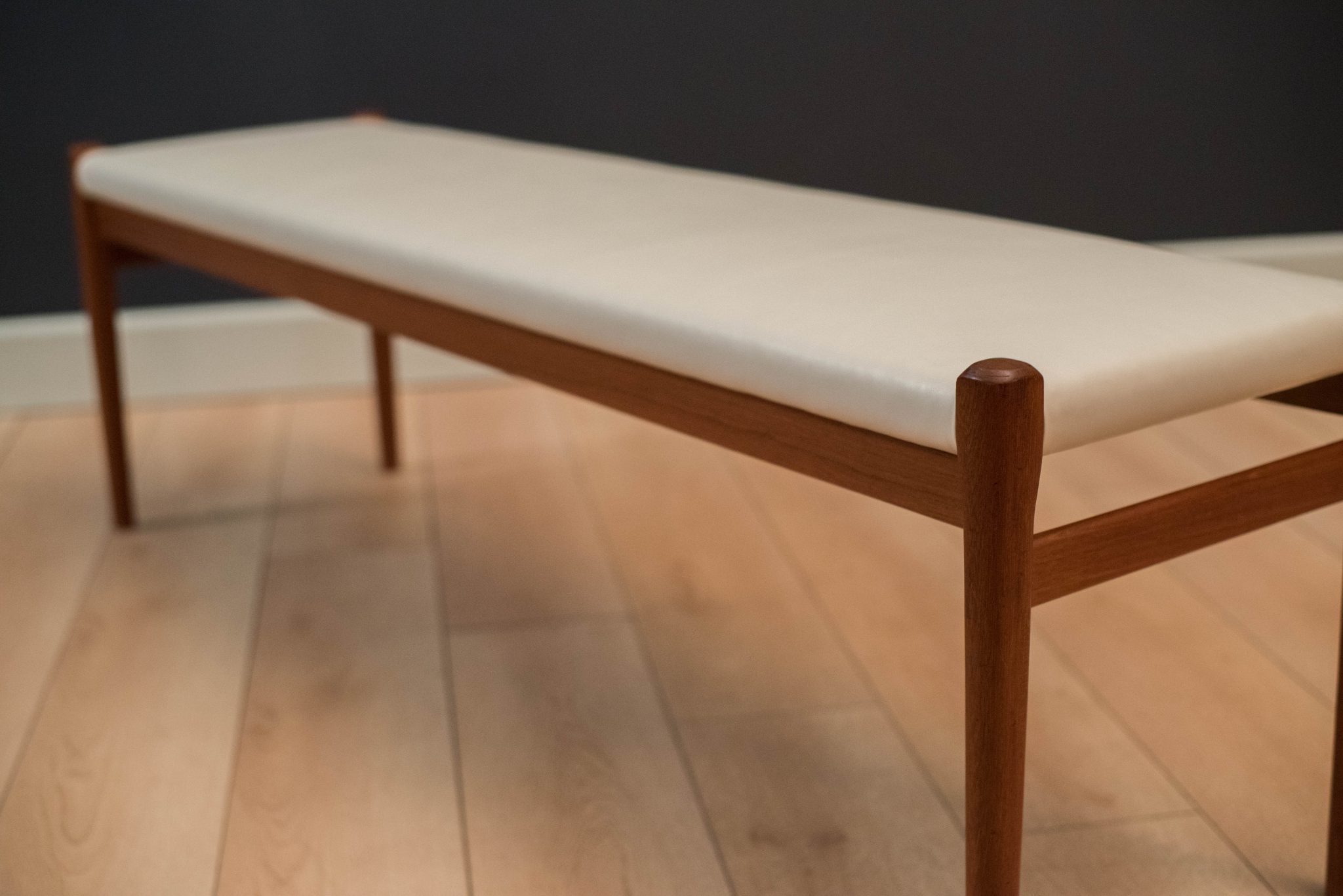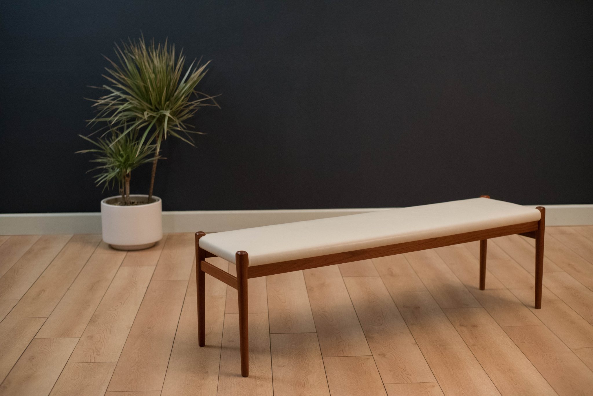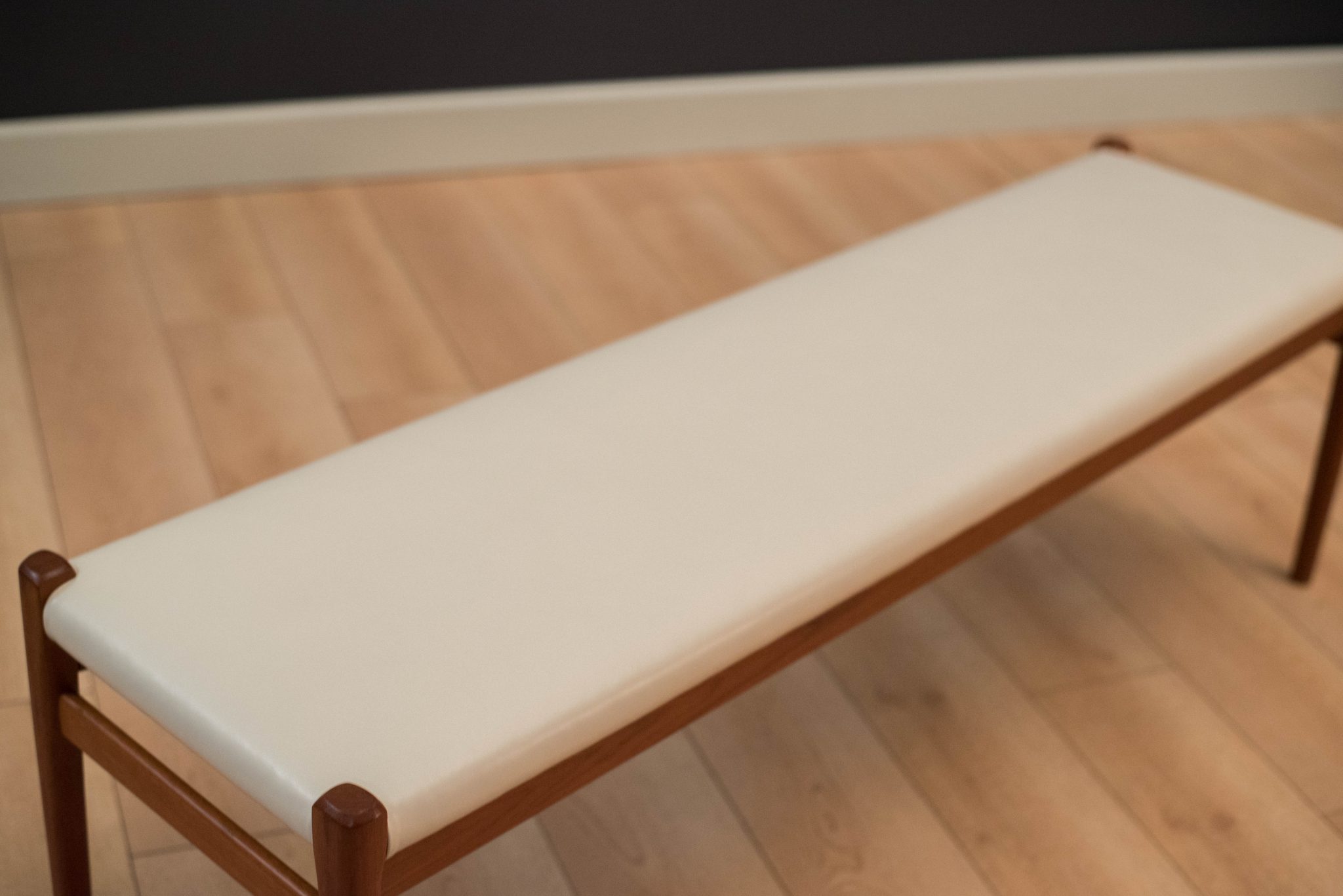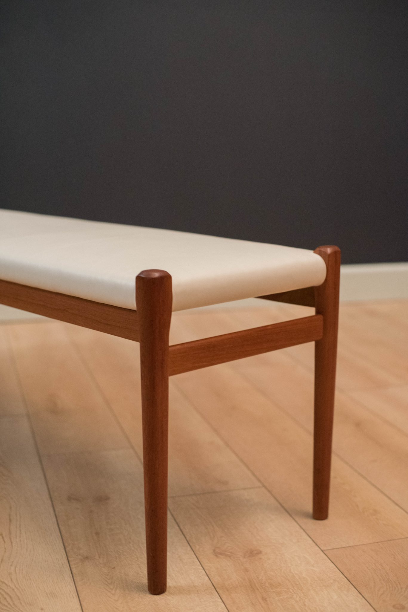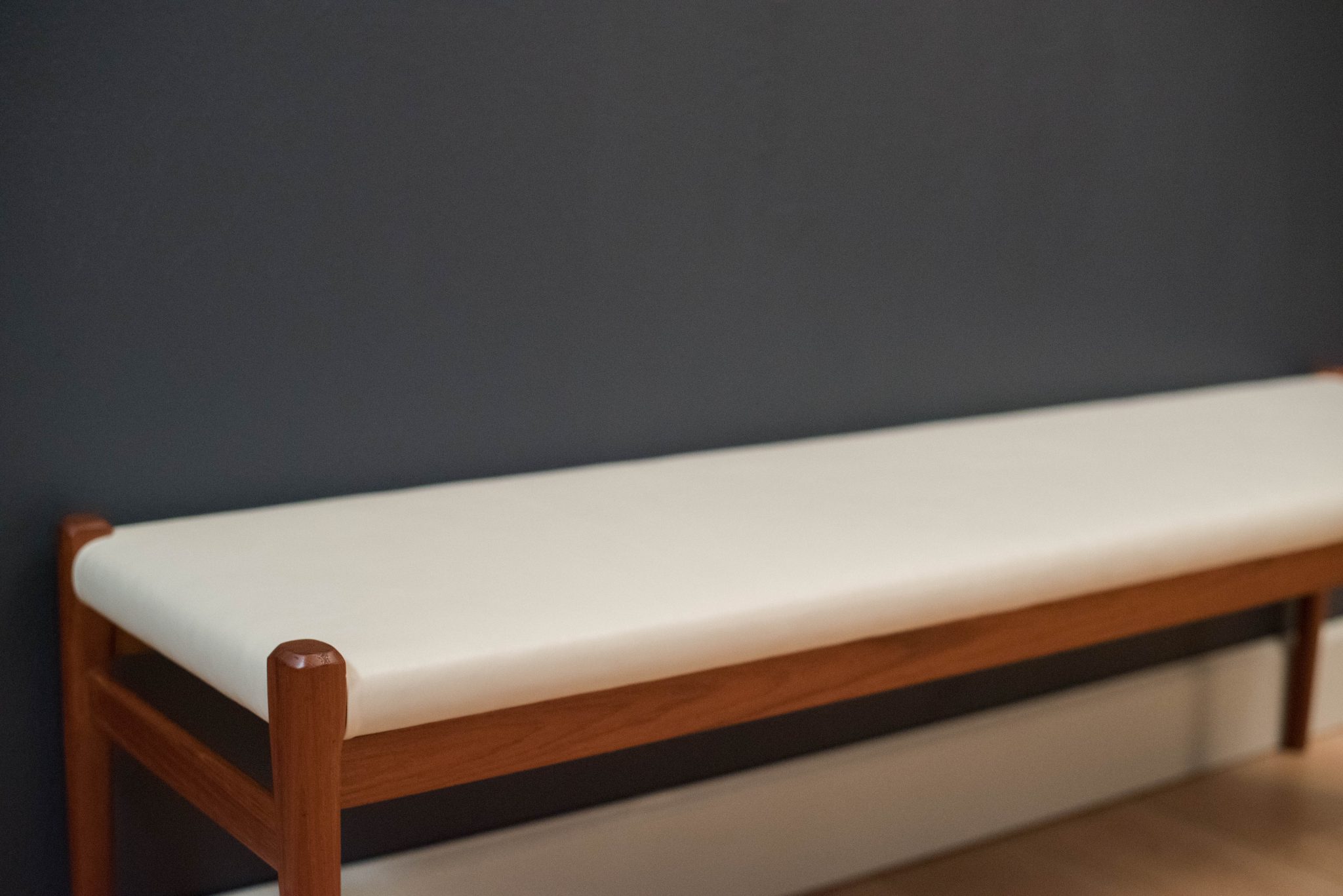 Vintage Danish bench in teak by Niels Moller for J.L. Mobelfabrik, Denmark. This piece has been newly reupholstered in white leather and functions as dining seating or as a hallway/bedroom bench.