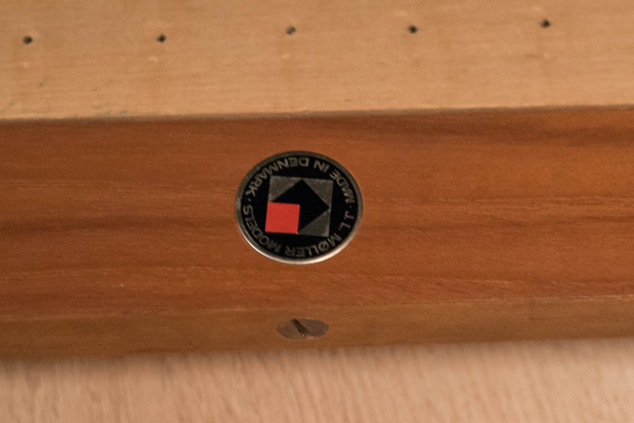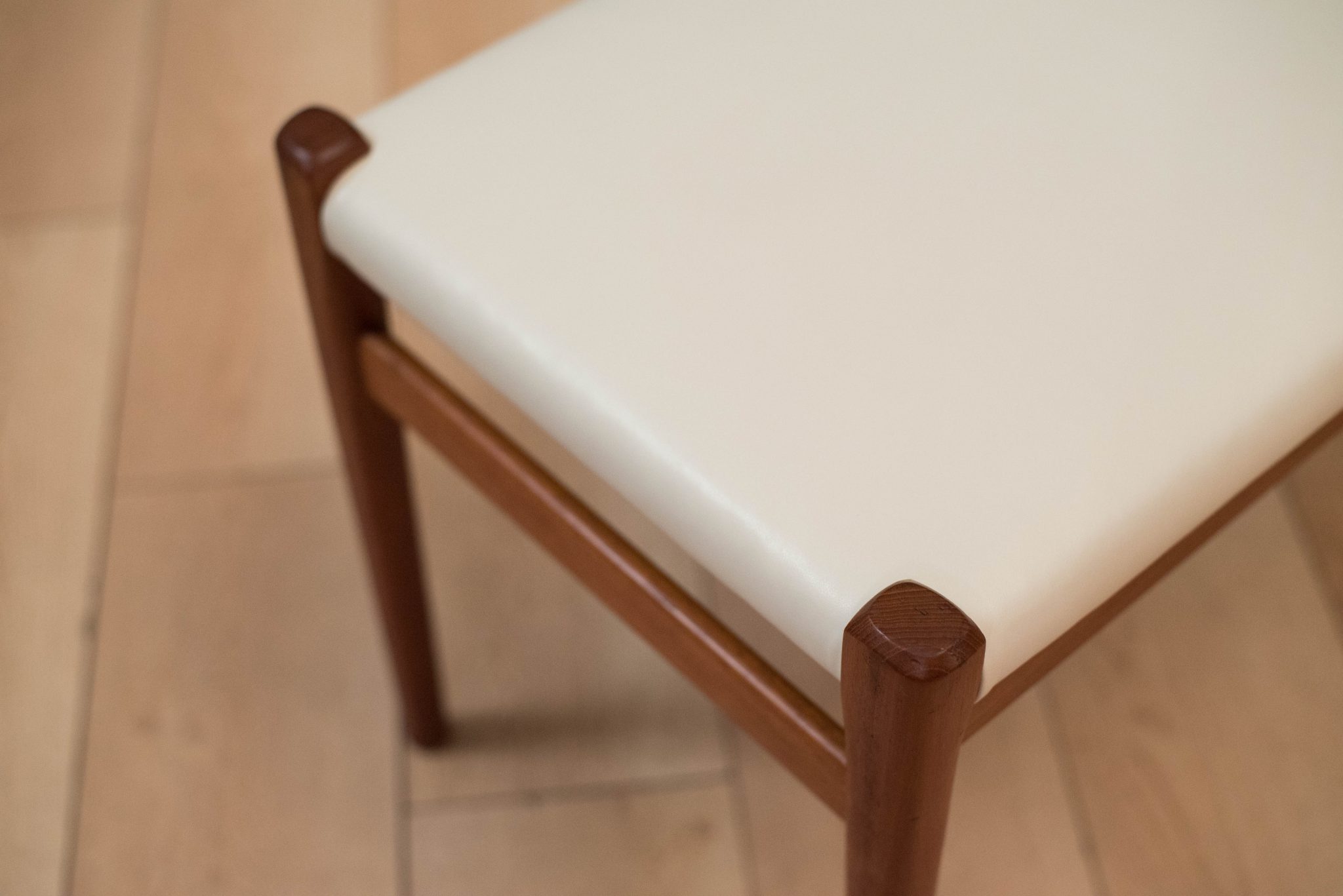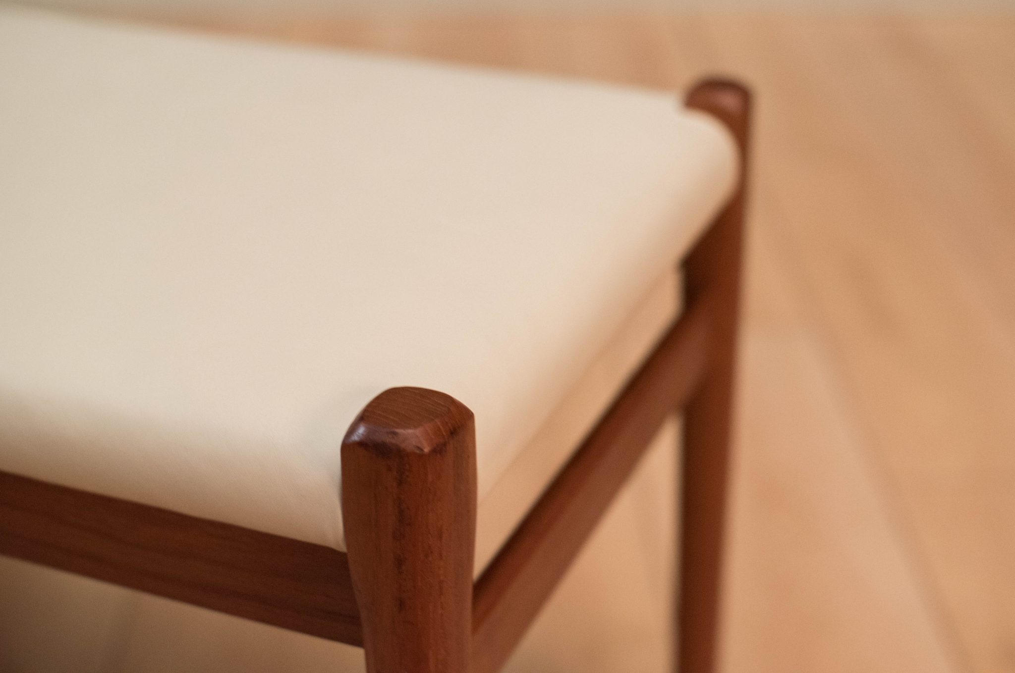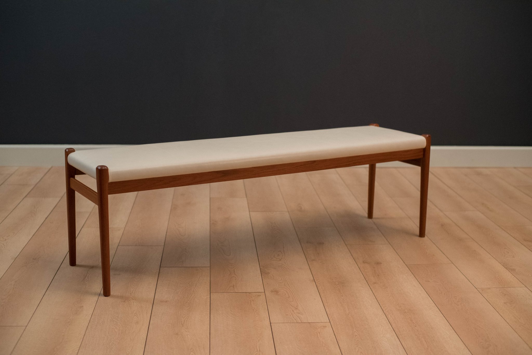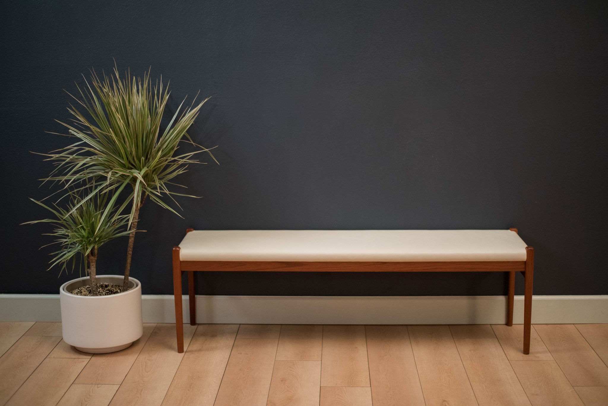 Vintage Danish bench in teak by Niels Moller for J.L. Mobelfabrik, Denmark. This piece has been newly reupholstered in white leather and functions as dining seating or as a hallway/bedroom bench.