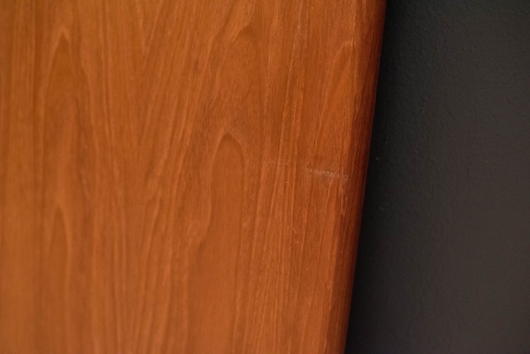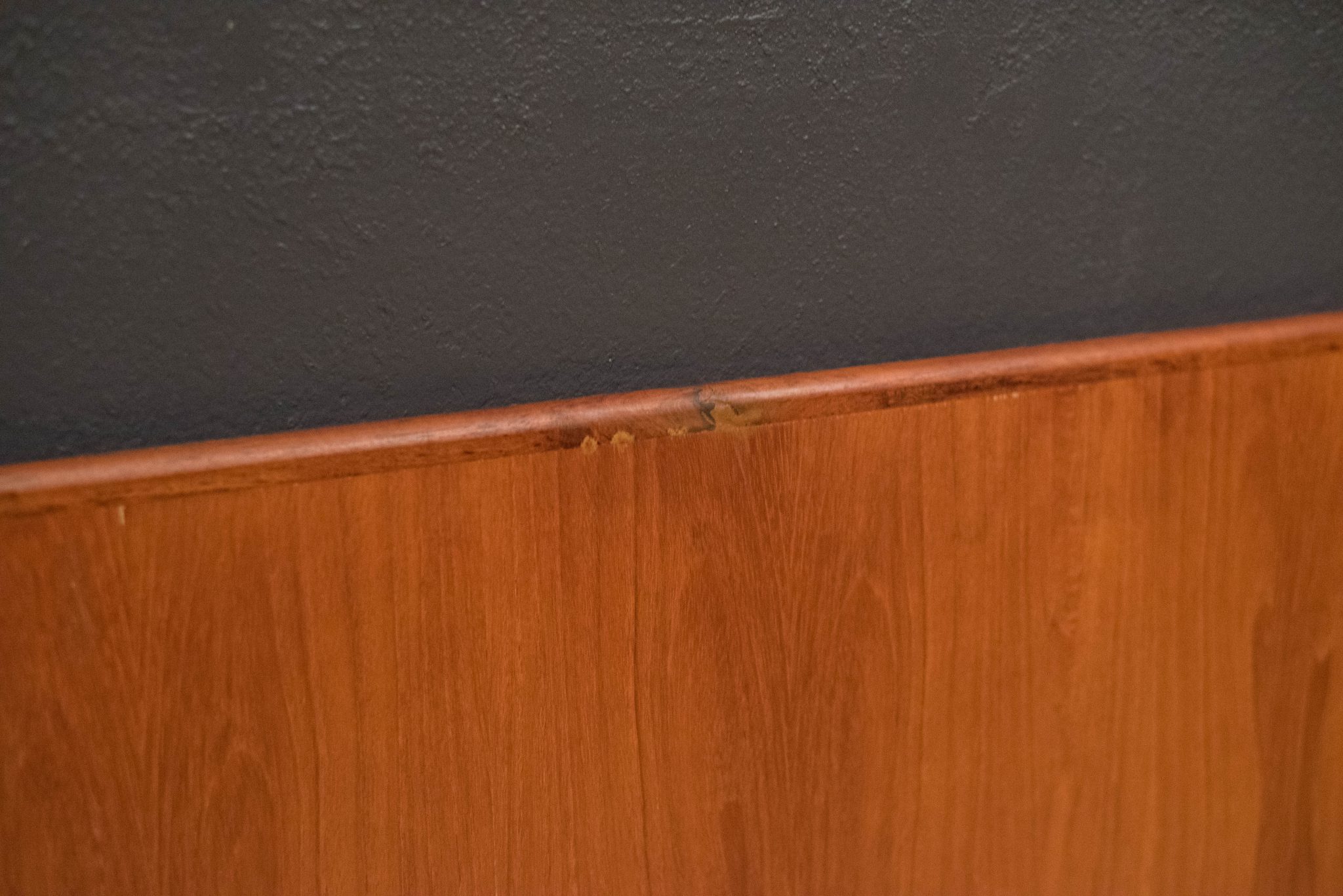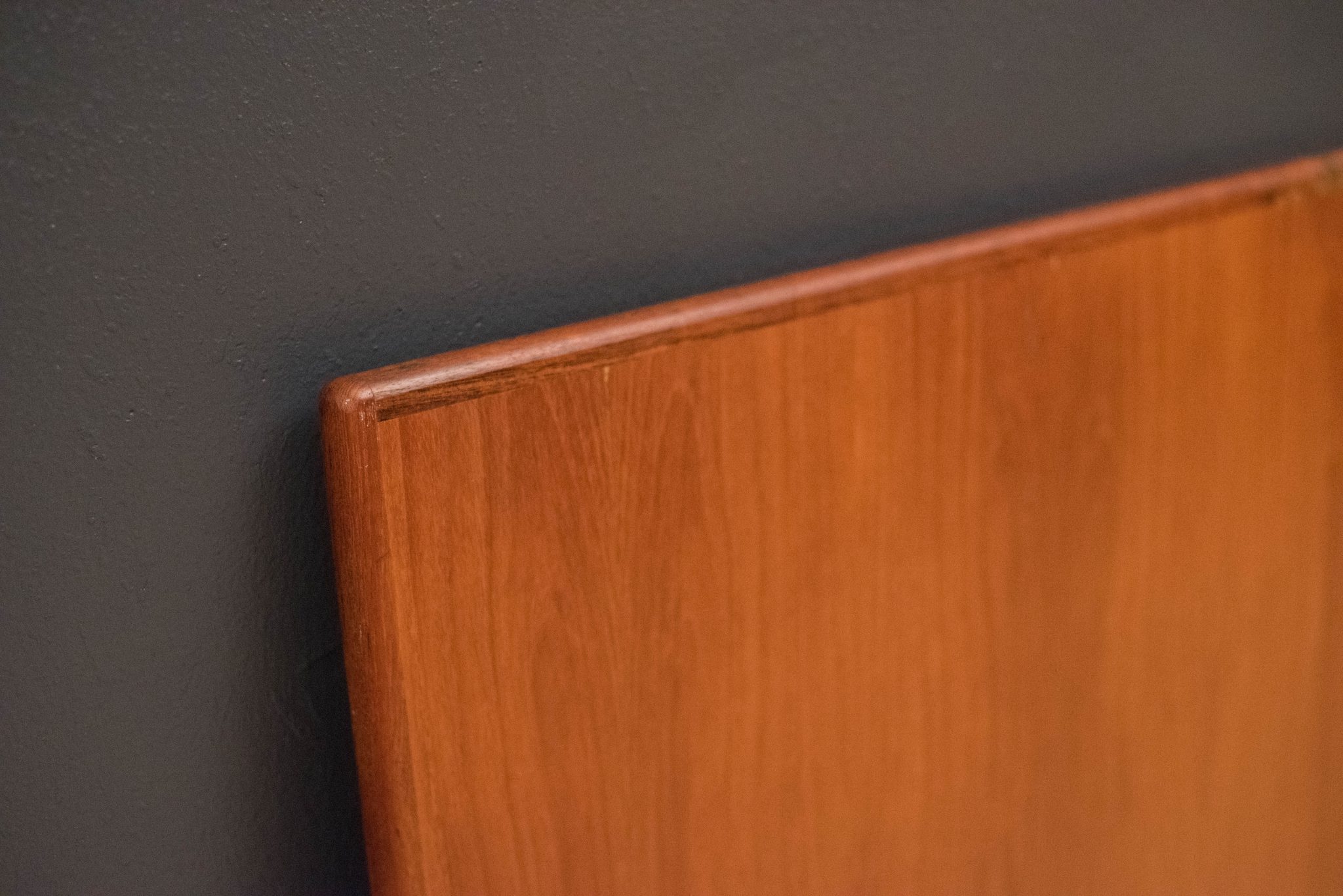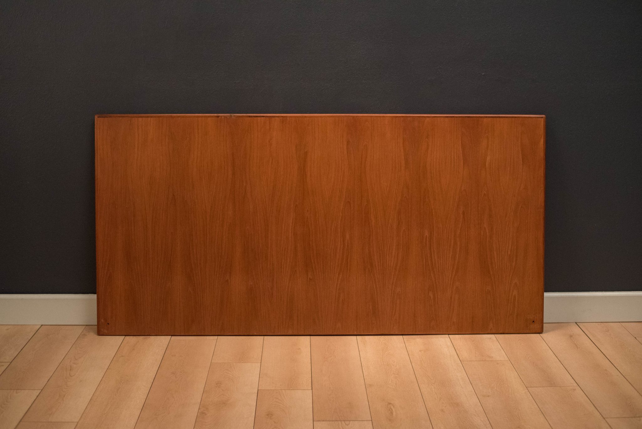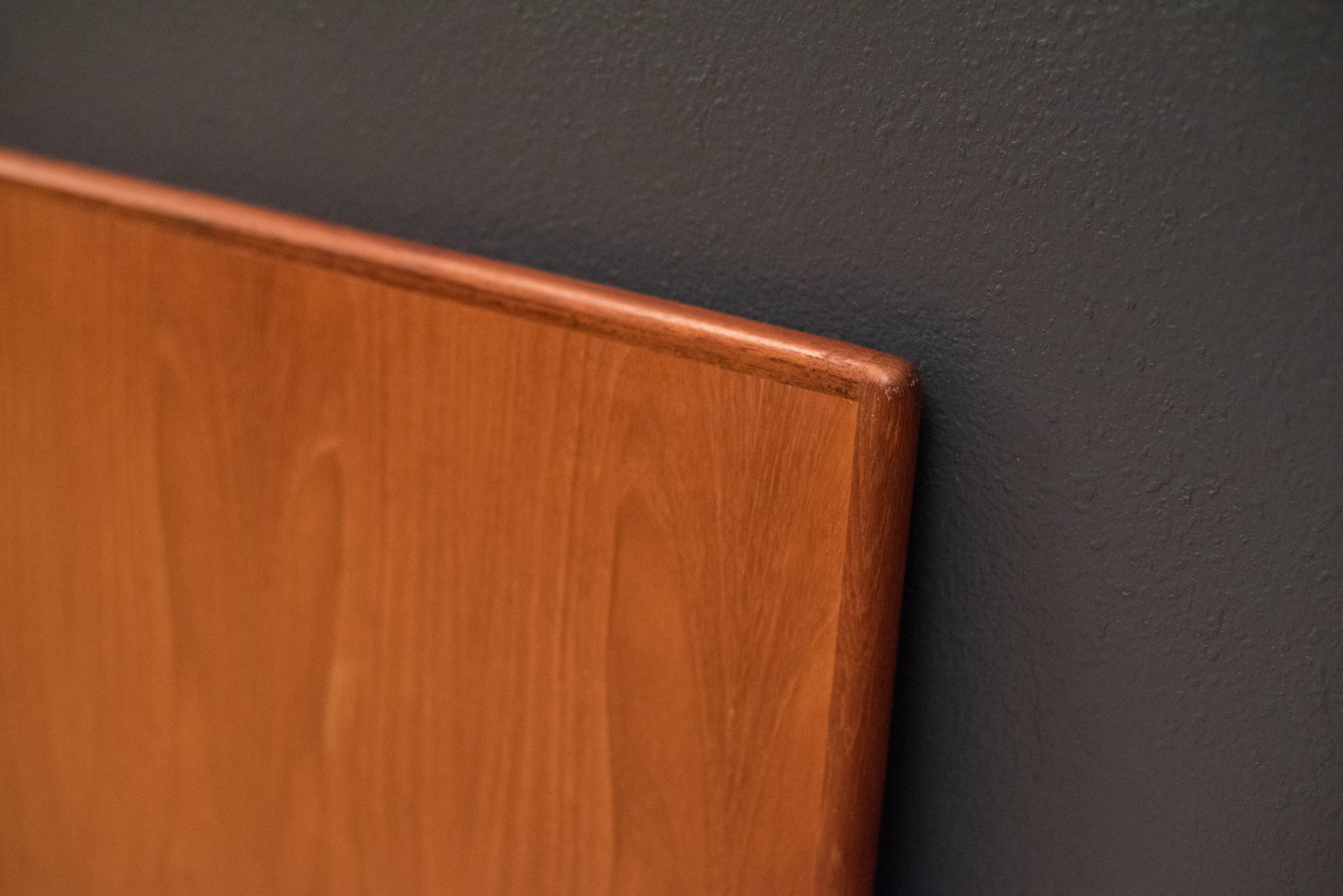 Danish modern king-size headboard in teak, circa 1960s. This piece displays a stunning teak grain pattern finished with surrounding curved edges.