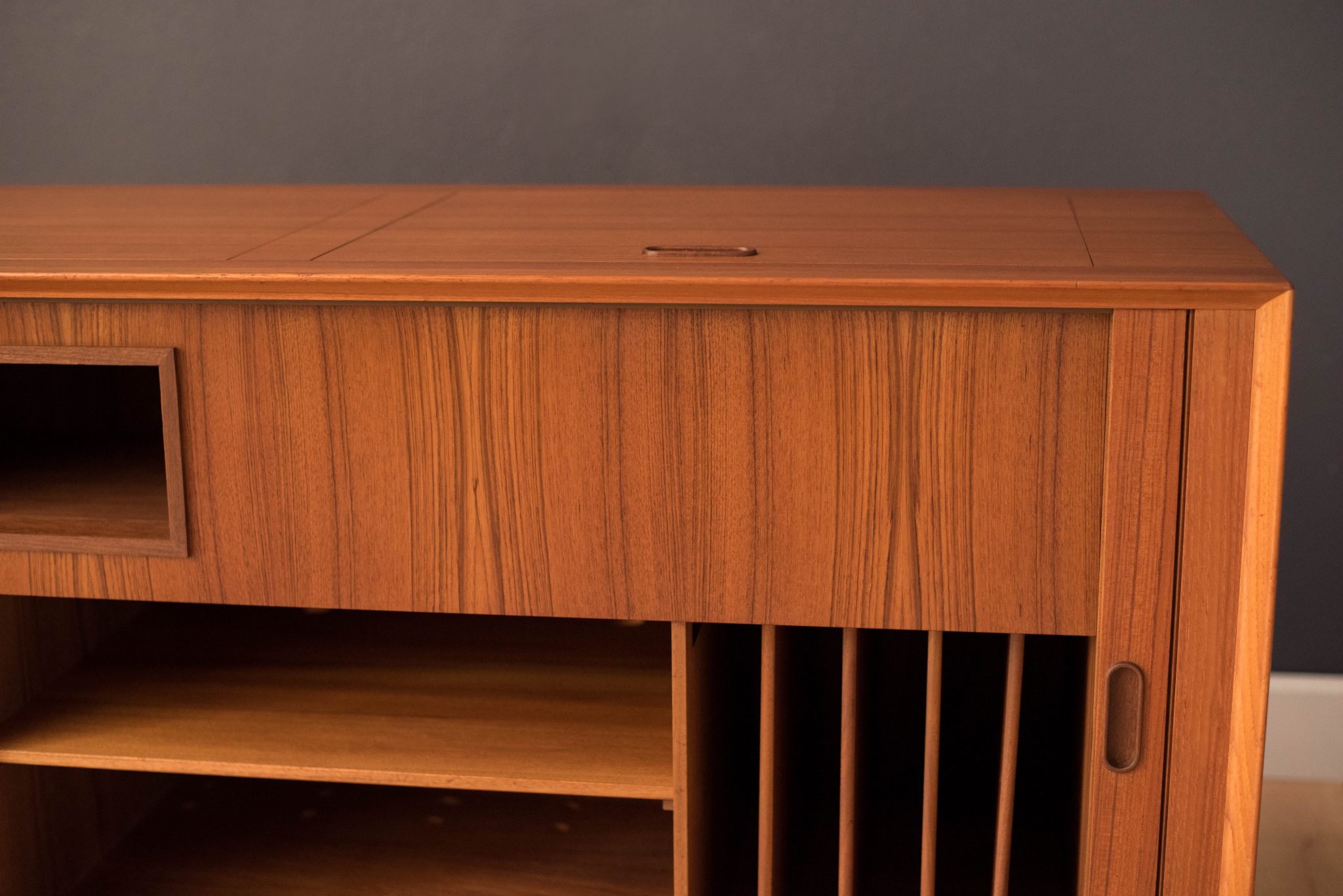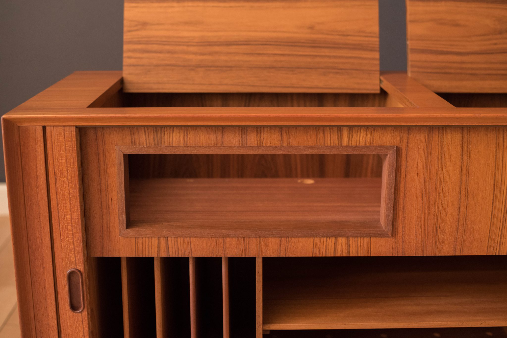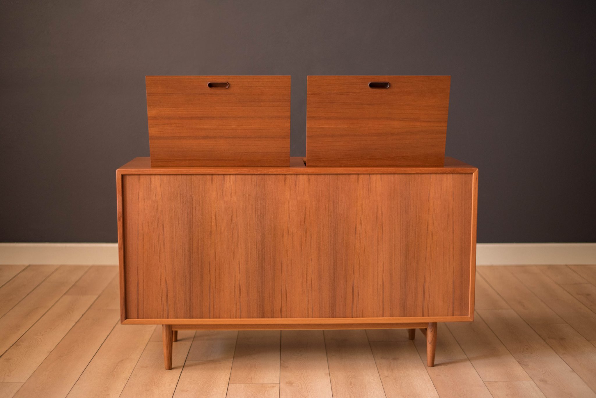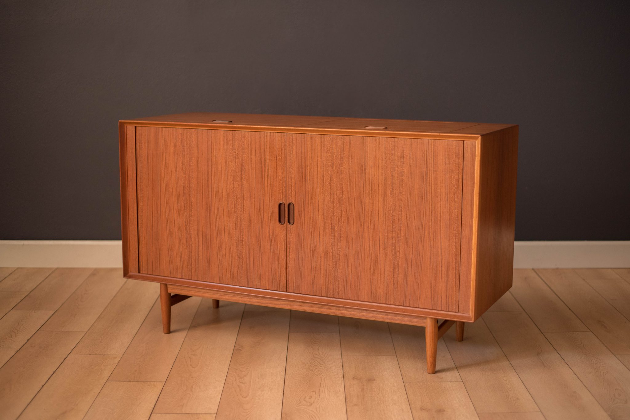 Mid-Century record console cabinet in teak designed by Arne Vodder for Sibast, Denmark. This unique media cabinet features sliding tambour doors and two flip top compartments with signature sculpted handles. Includes a middle console shelf and LP record dividers that can be easily removed for more storage. The back of the cabinet is finished allowing it to be placed in the middle of a room. Customize it with your own turntable and record player to make the perfect Hi-Fi set up for your home or office.