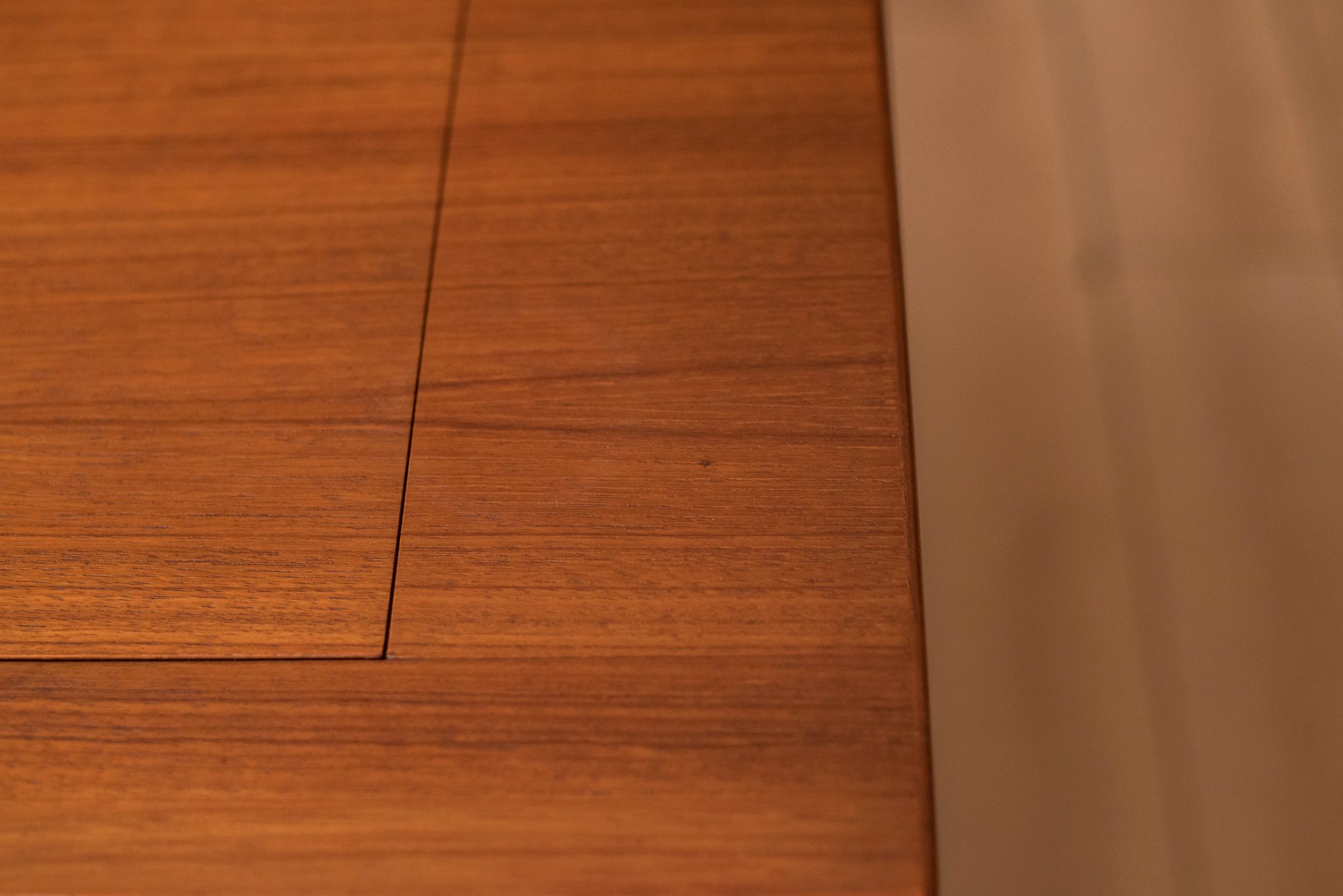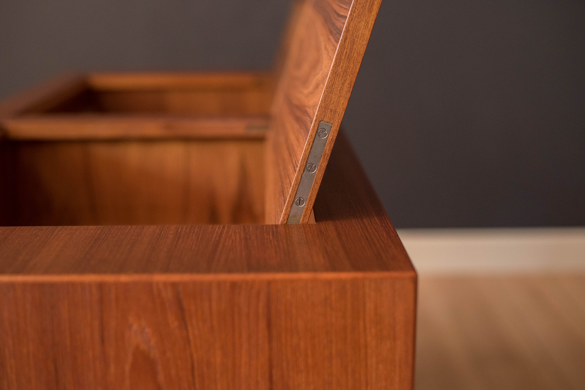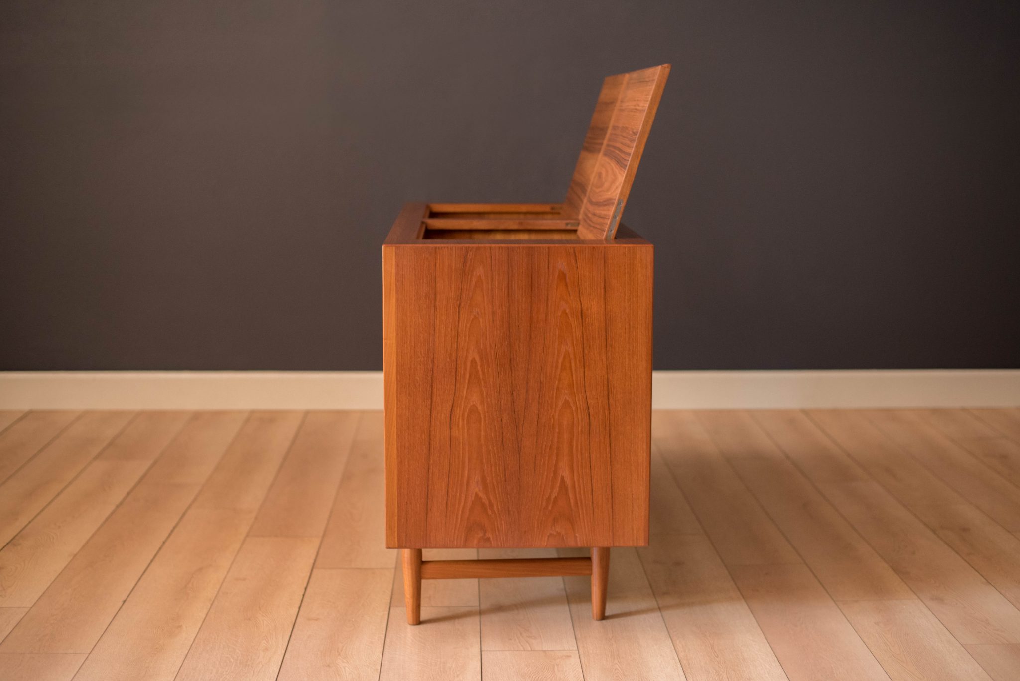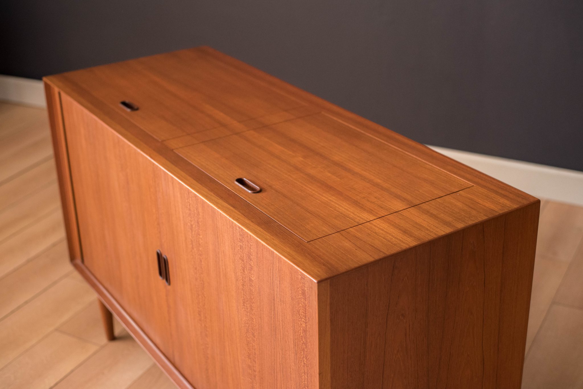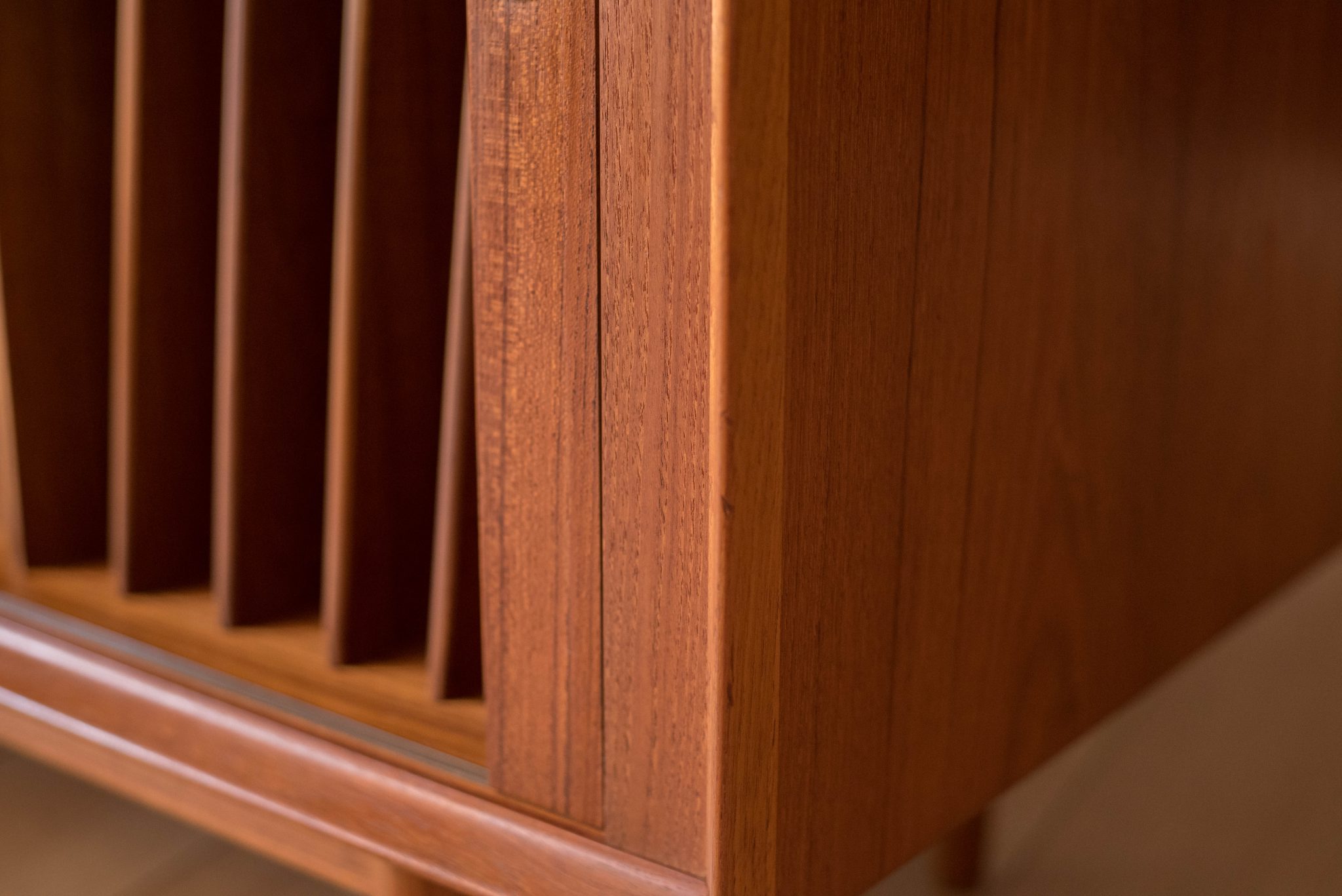 Mid-Century record console cabinet in teak designed by Arne Vodder for Sibast, Denmark. This unique media cabinet features sliding tambour doors and two flip top compartments with signature sculpted handles. Includes a middle console shelf and LP record dividers that can be easily removed for more storage. The back of the cabinet is finished allowing it to be placed in the middle of a room. Customize it with your own turntable and record player to make the perfect Hi-Fi set up for your home or office.