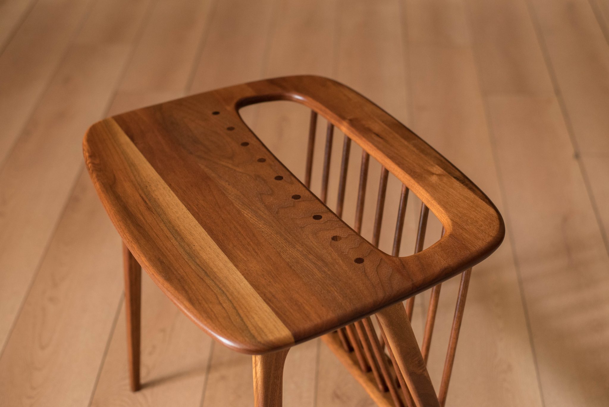 Vintage side table designed by Arthur Umanoff c. 1960’s in solid planked walnut. This versatile piece features unique walnut inlay with an attached magazine rack display.