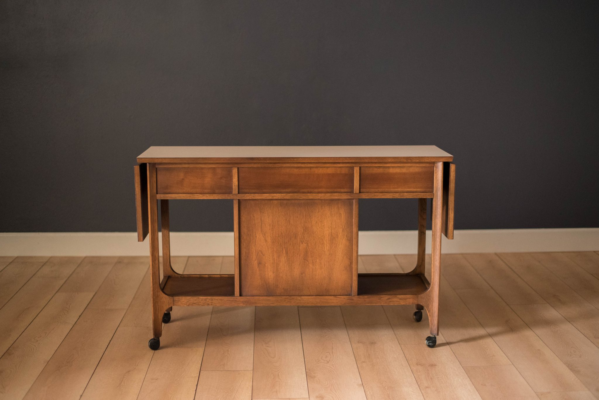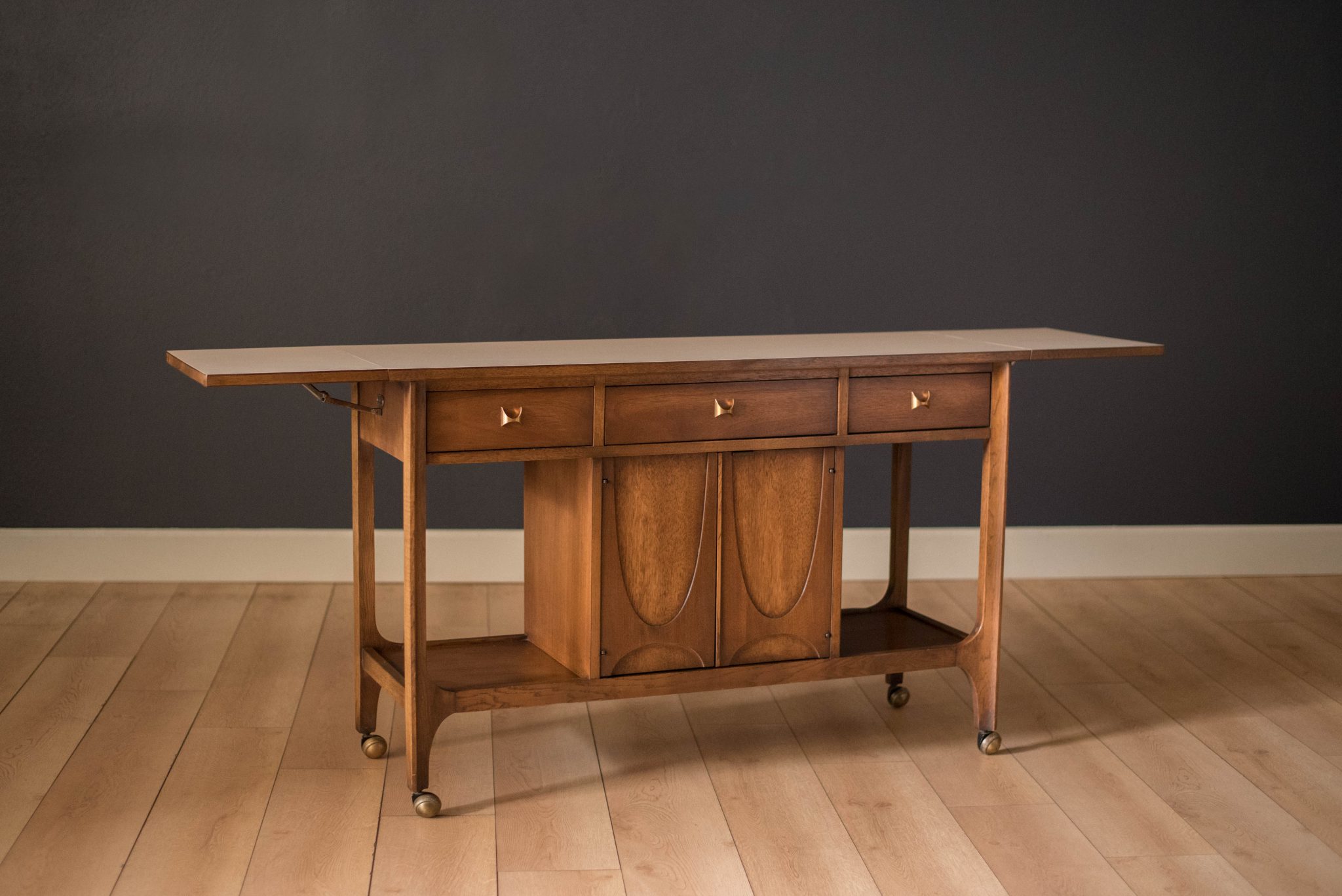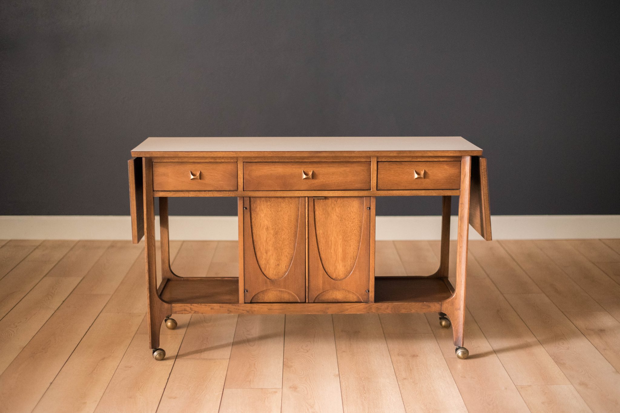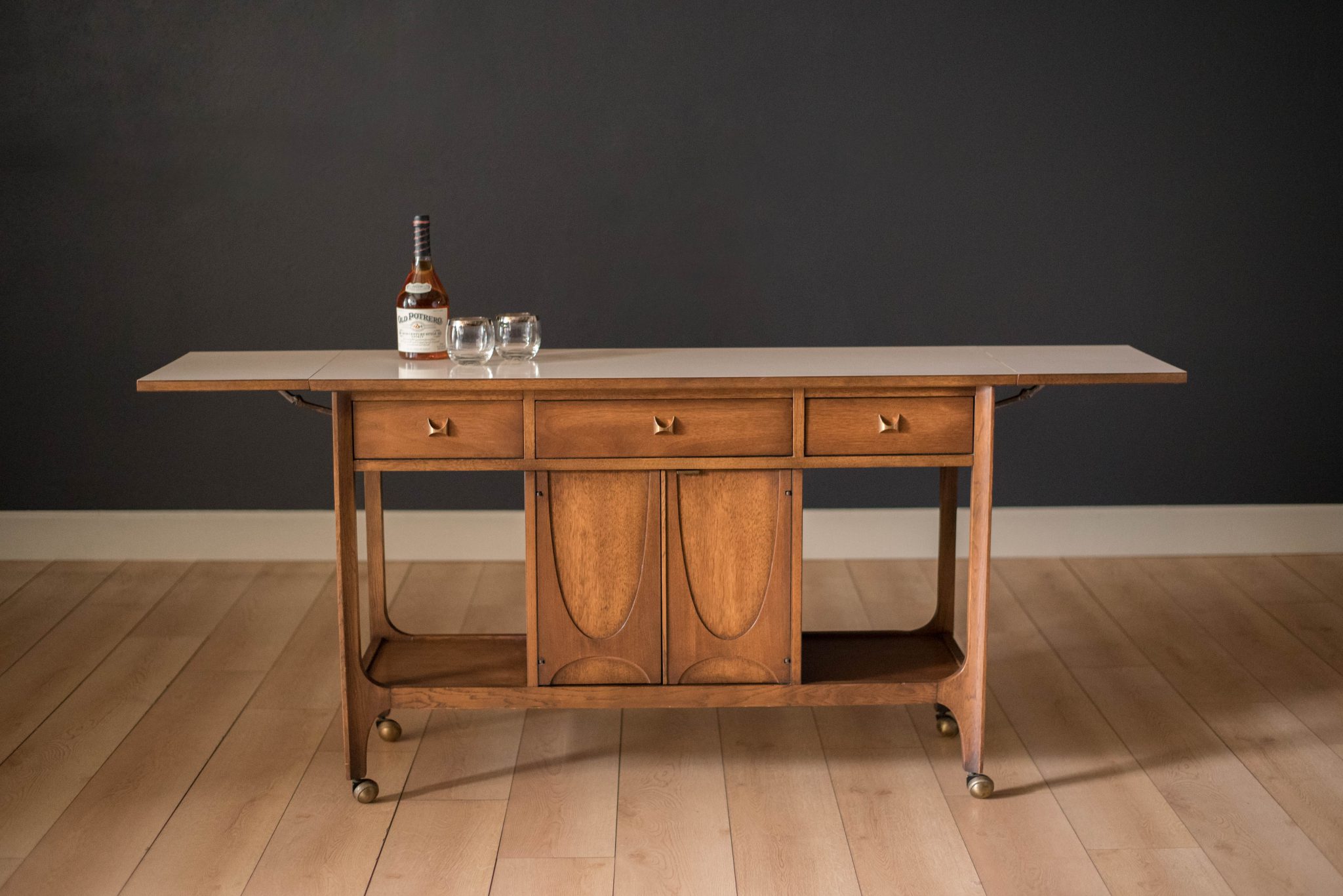 Vintage Brasilia bar cart manufactured by Broyhill Furniture Co. in walnut. This piece includes three drawers and a middle cabinet offering plenty of storage for drinkware and bottles. Laminated top is easy to maintain and drop leaves extend to increase the work surface area. The cabinet rolls on casters and the backside is finished.