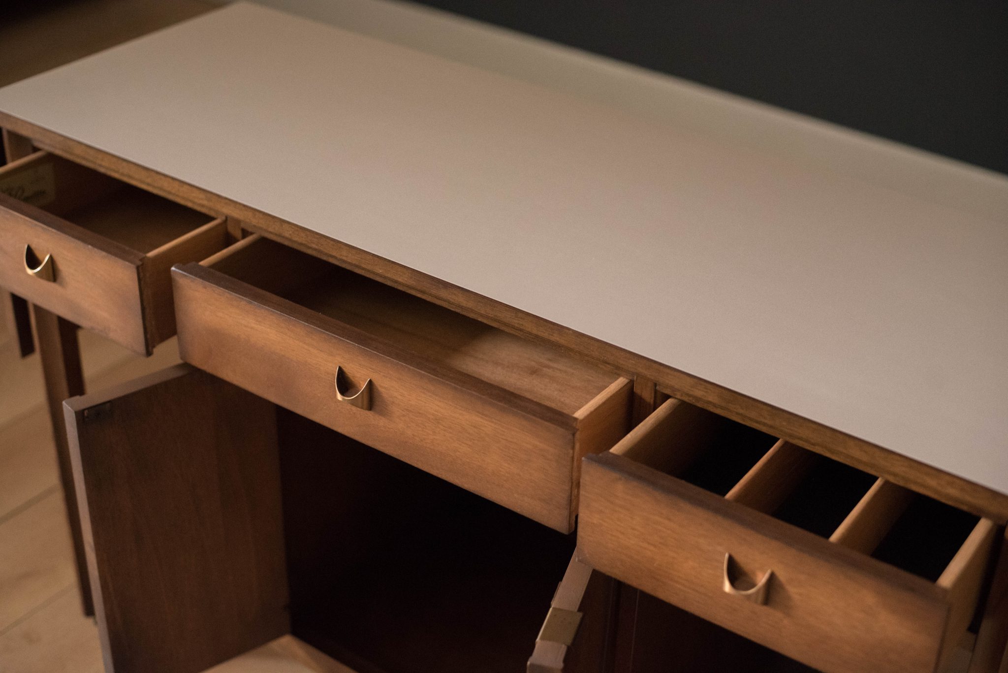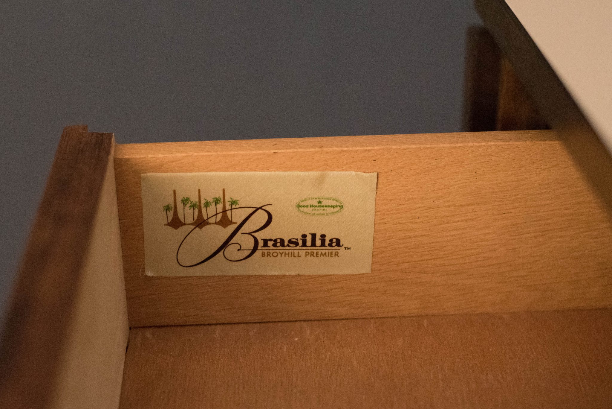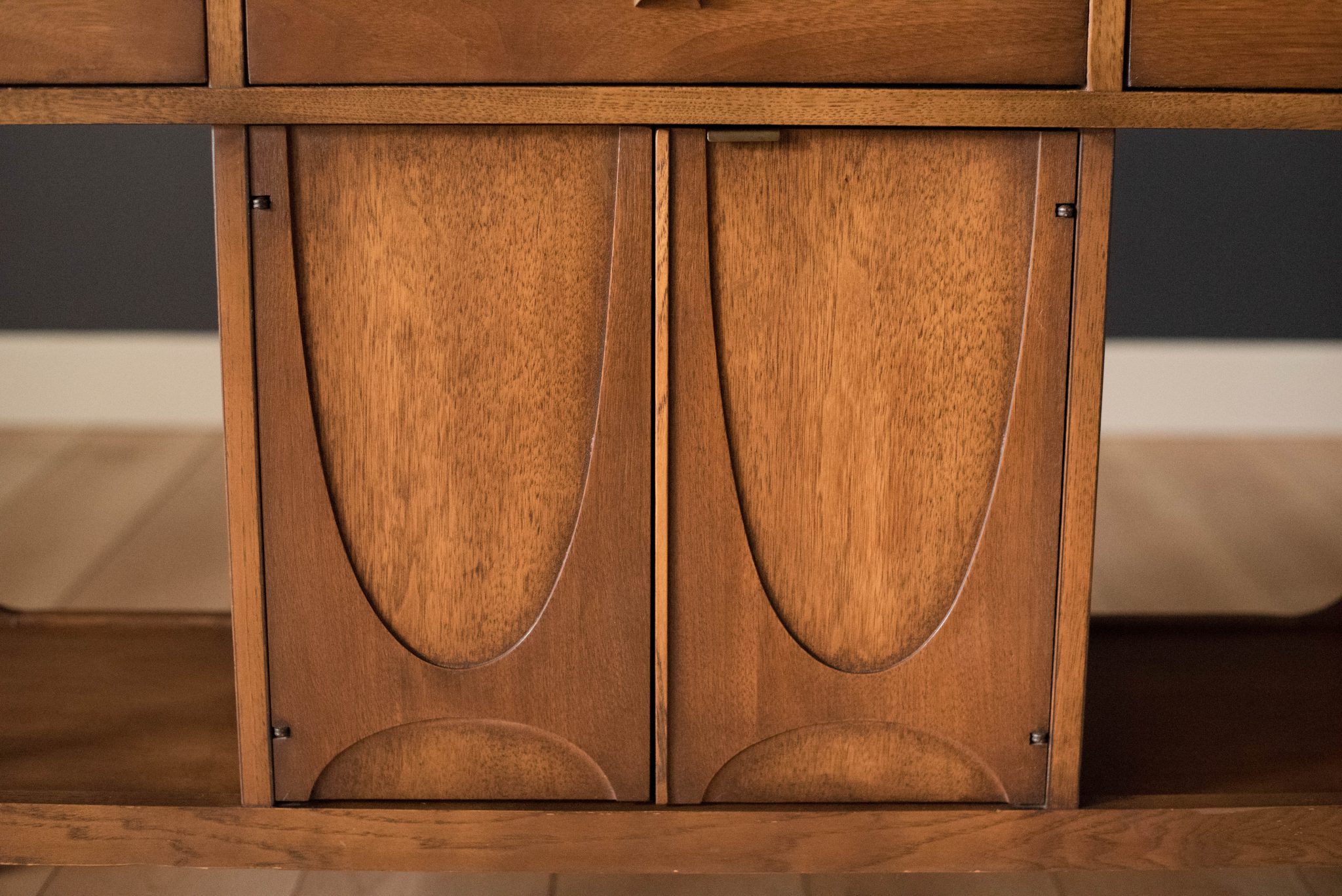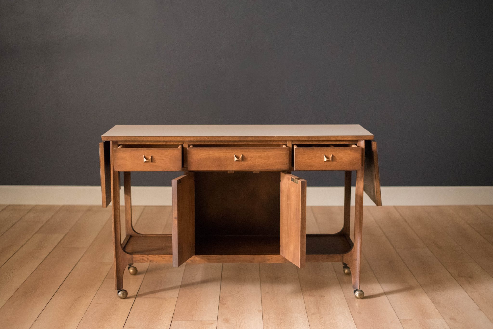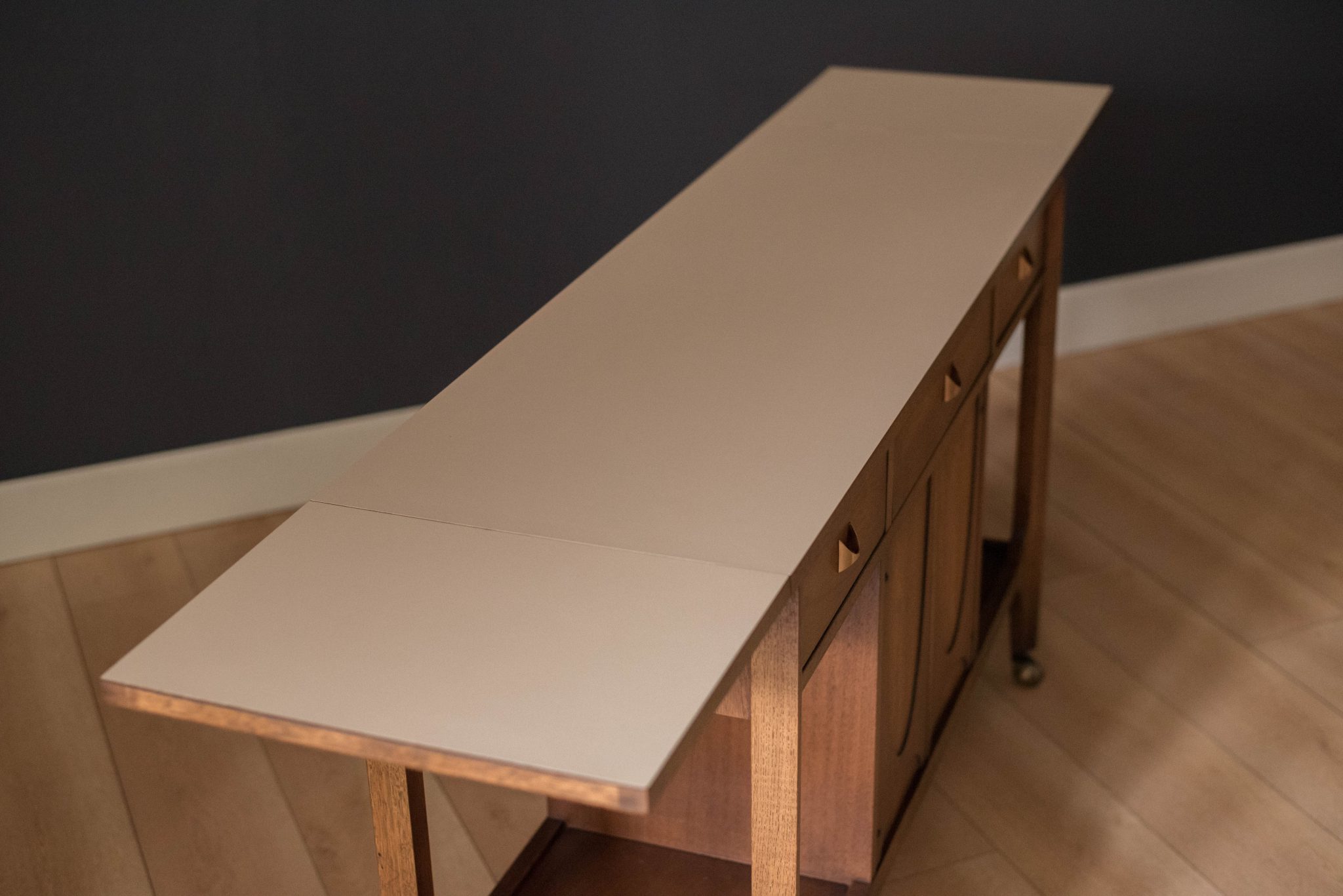 Vintage Brasilia bar cart manufactured by Broyhill Furniture Co. in walnut. This piece includes three drawers and a middle cabinet offering plenty of storage for drinkware and bottles. Laminated top is easy to maintain and drop leaves extend to increase the work surface area. The cabinet rolls on casters and the backside is finished.