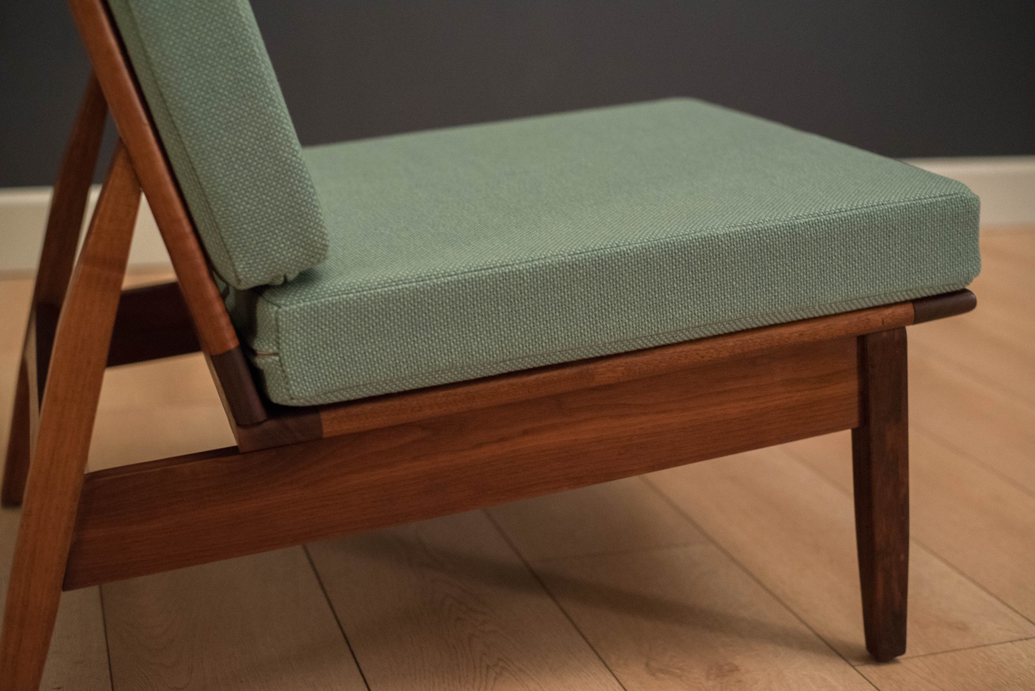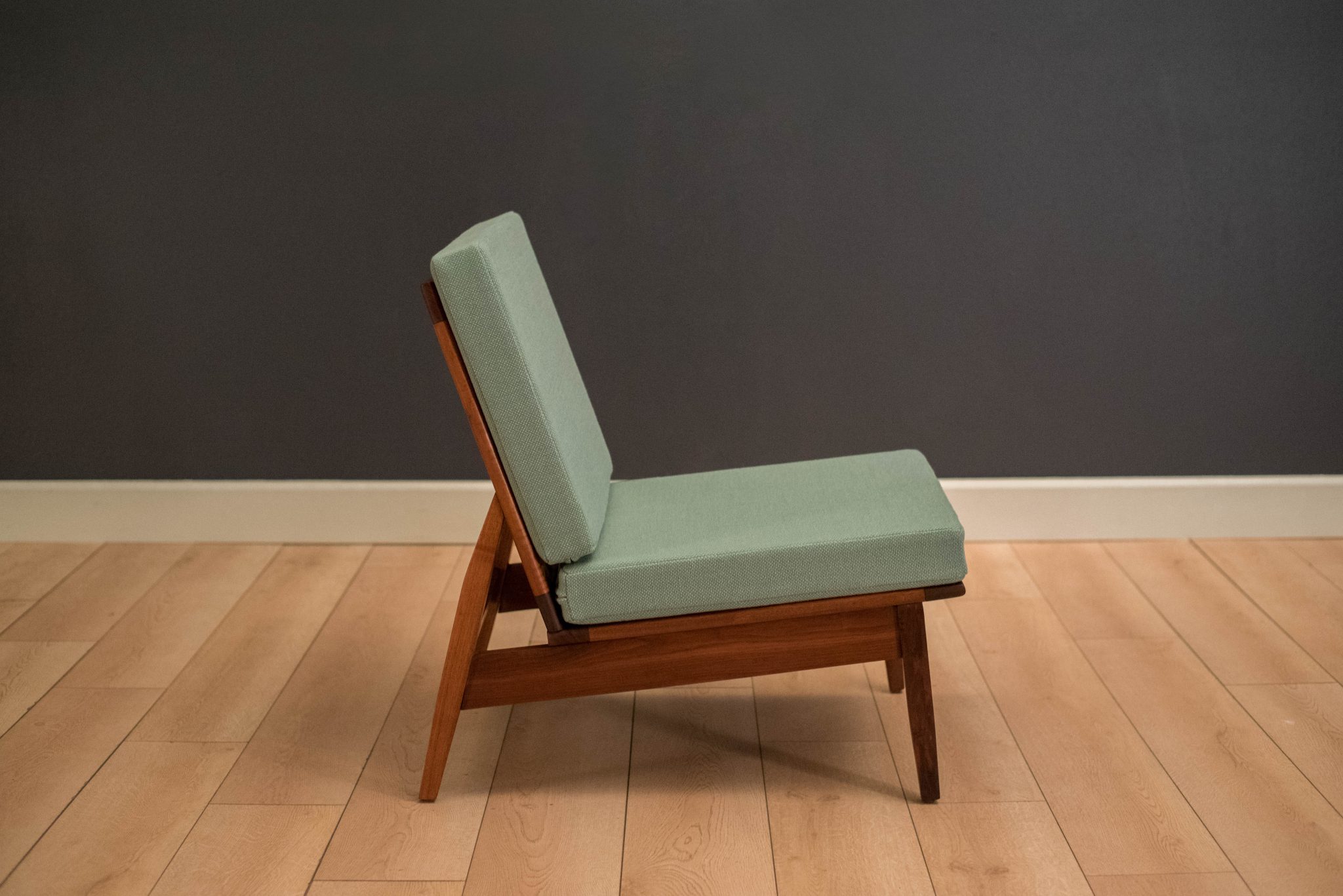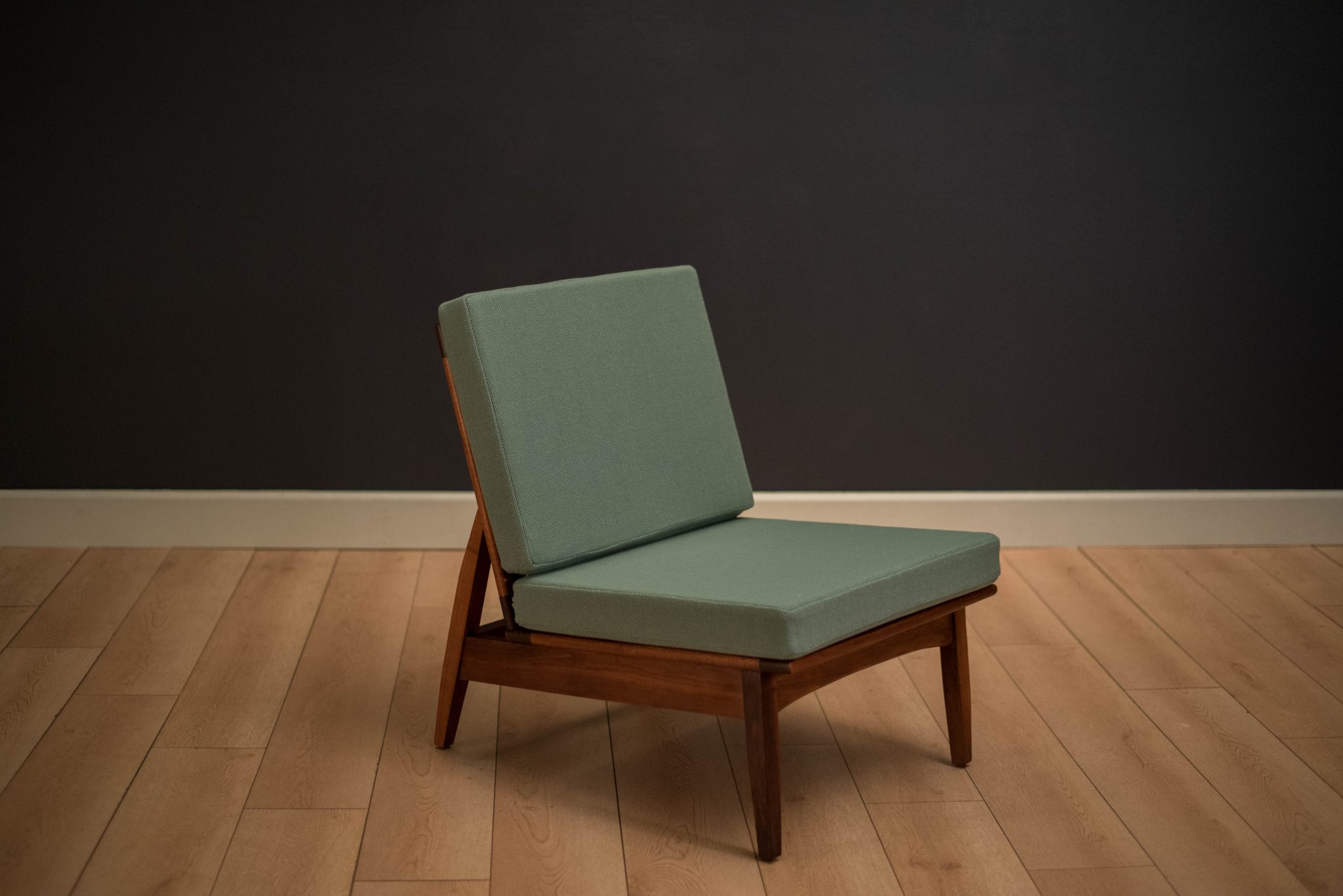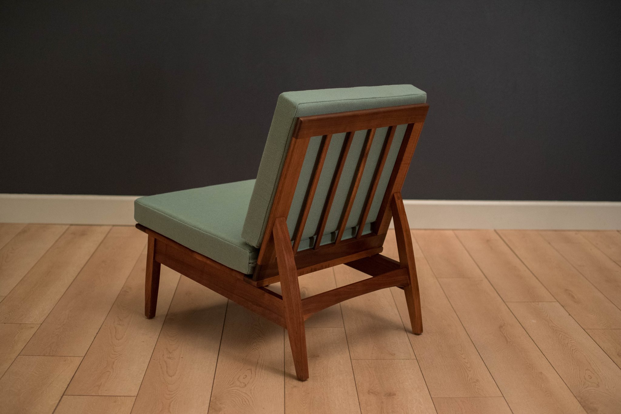 Vintage armless slipper lounge chair in walnut, circa 1960s. This accent piece is newly reupholstered in a seafoam green tweed fabric with brand new cushions.