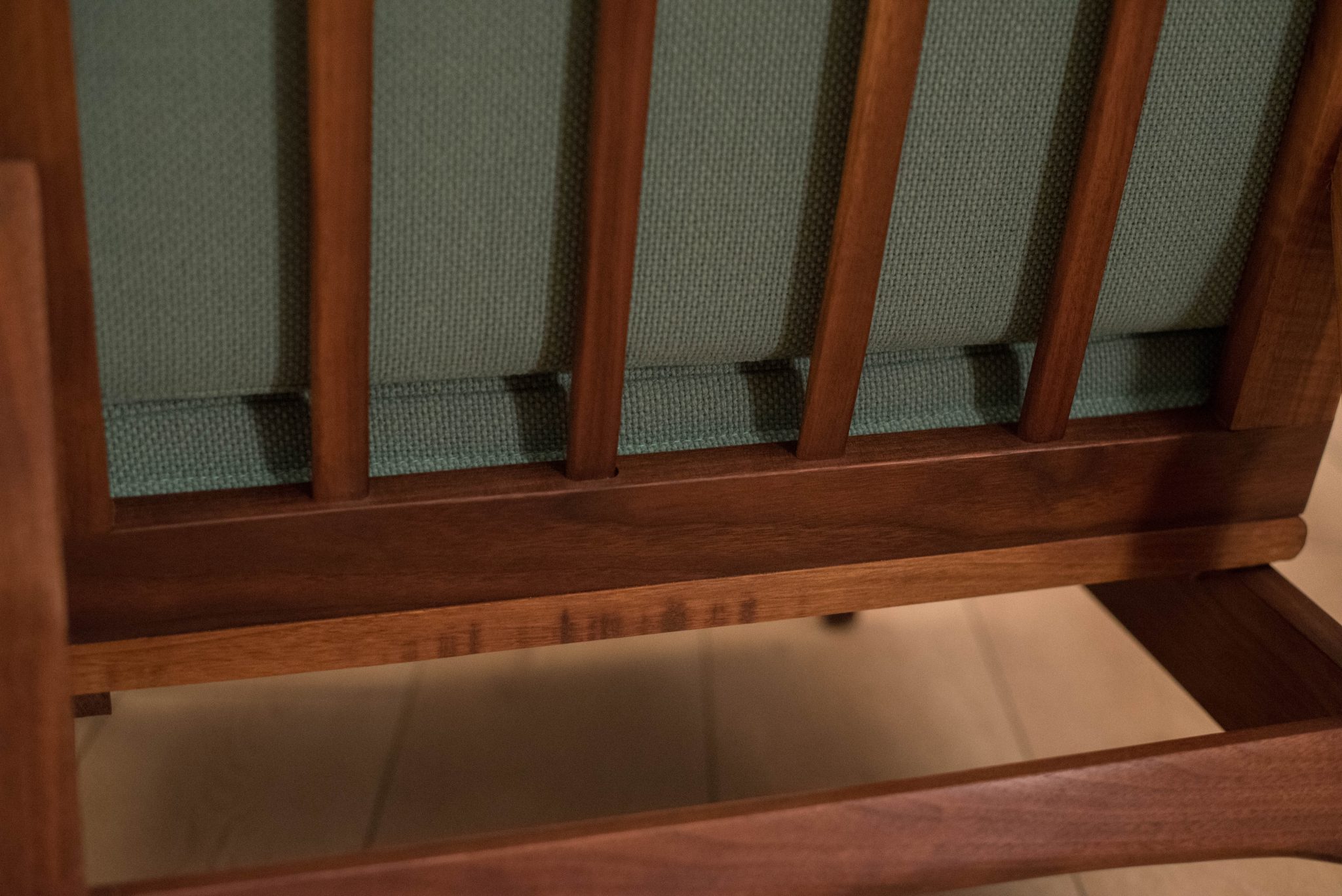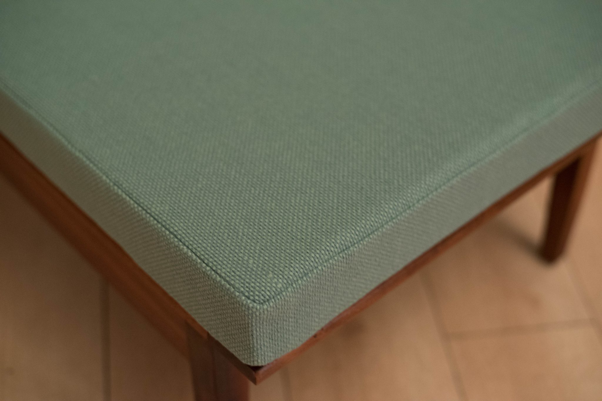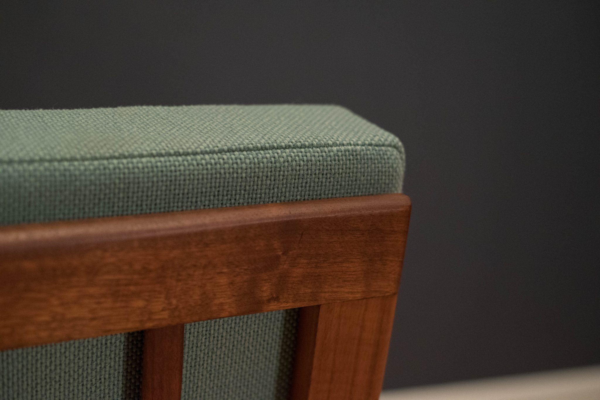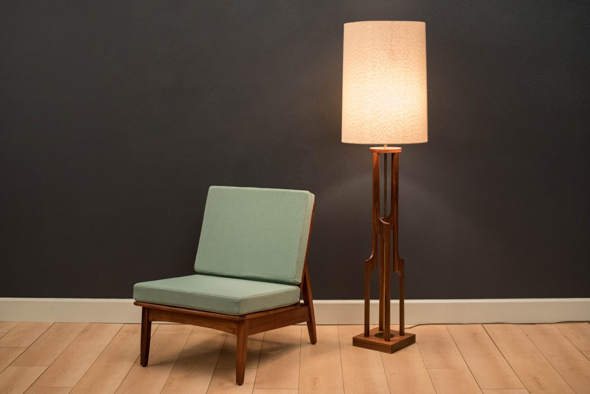 Vintage armless slipper lounge chair in walnut, circa 1960s. This accent piece is newly reupholstered in a seafoam green tweed fabric with brand new cushions.