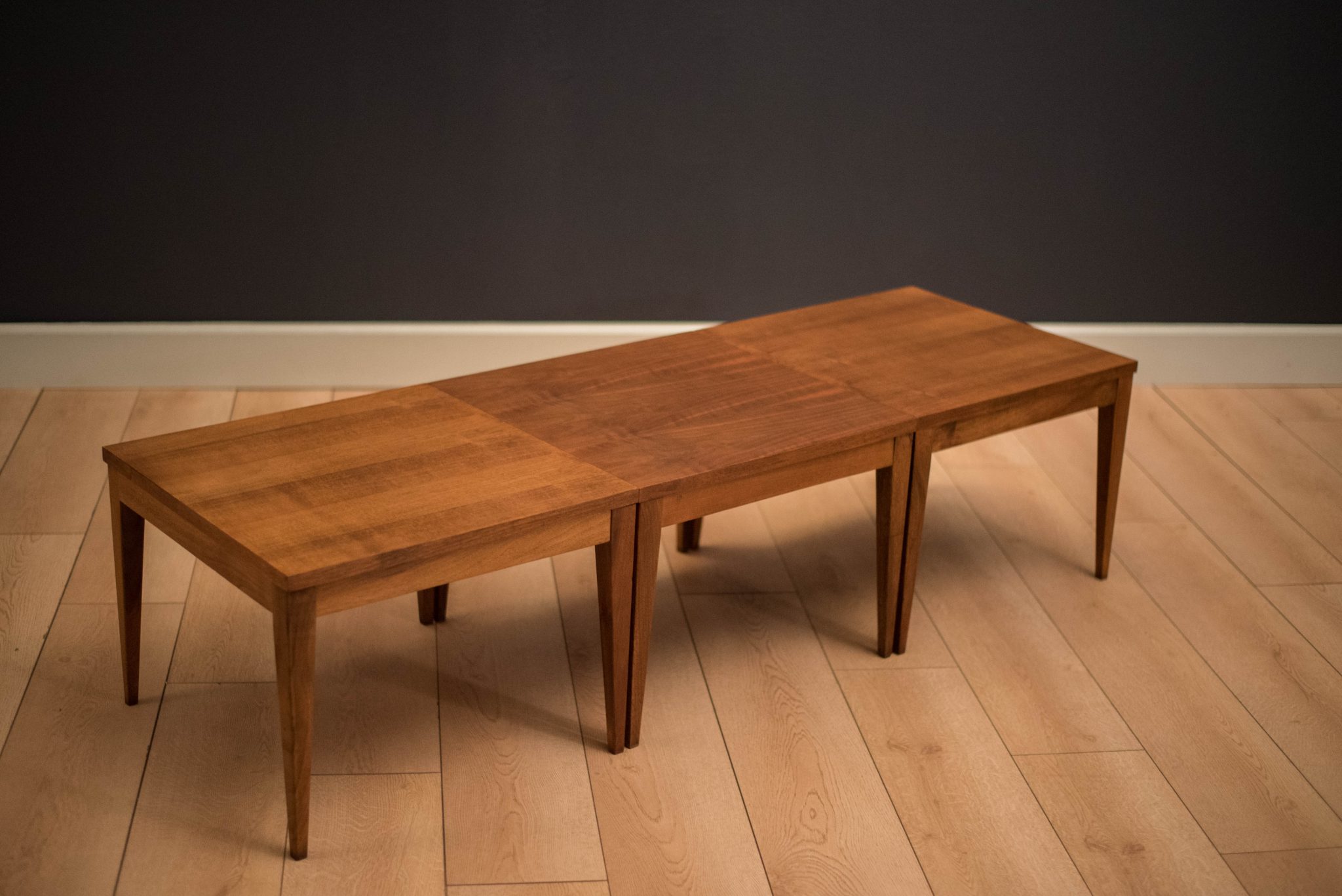 Mid Century set of three matching side tables in walnut with tapered legs. This versatile set can be used together to make a coffee table or separately as end tables. In good condition with minimal vintage wear. Price is for the set.