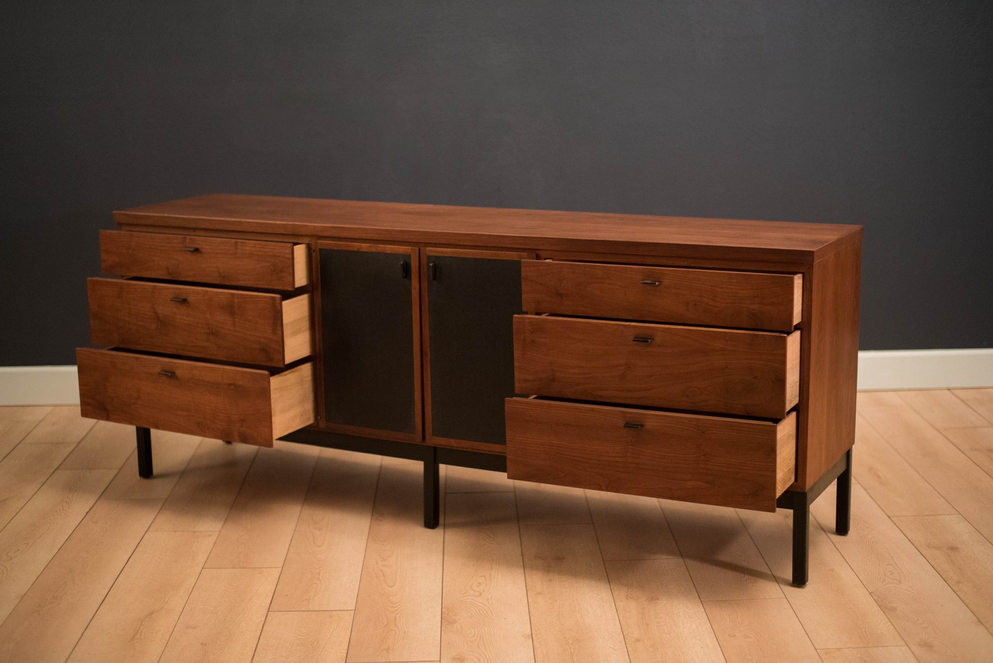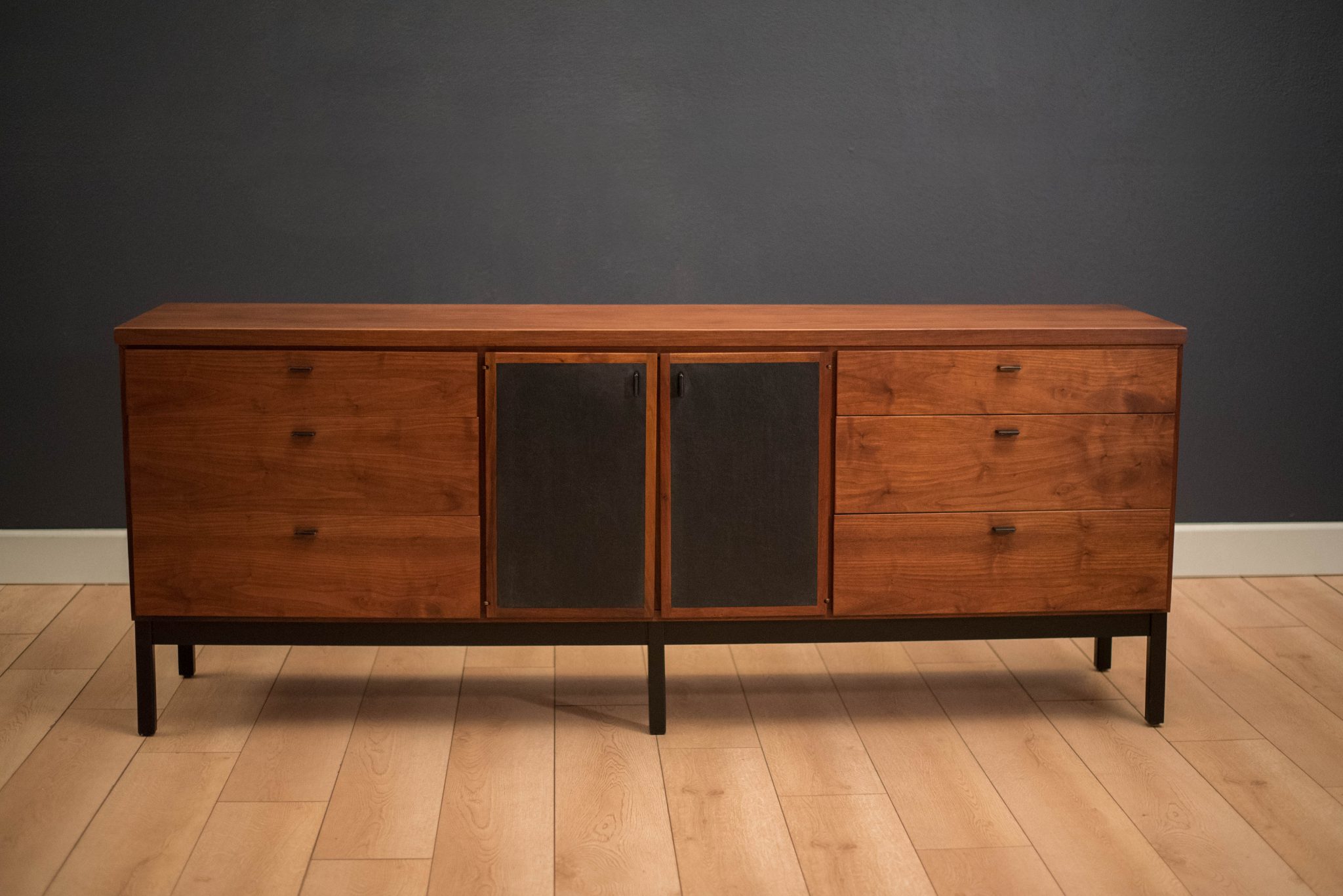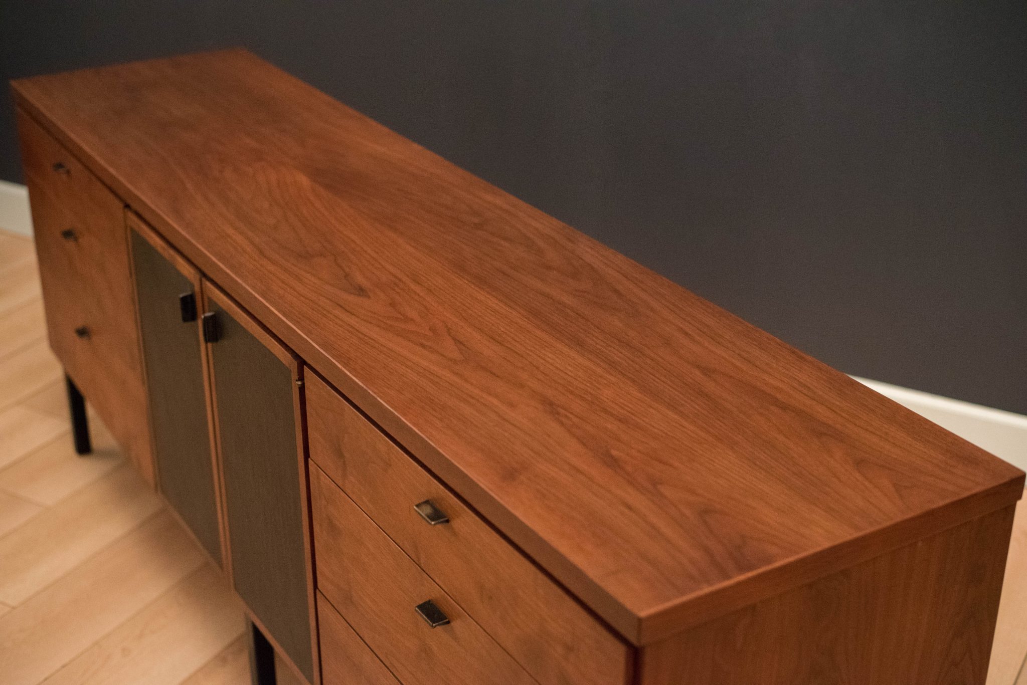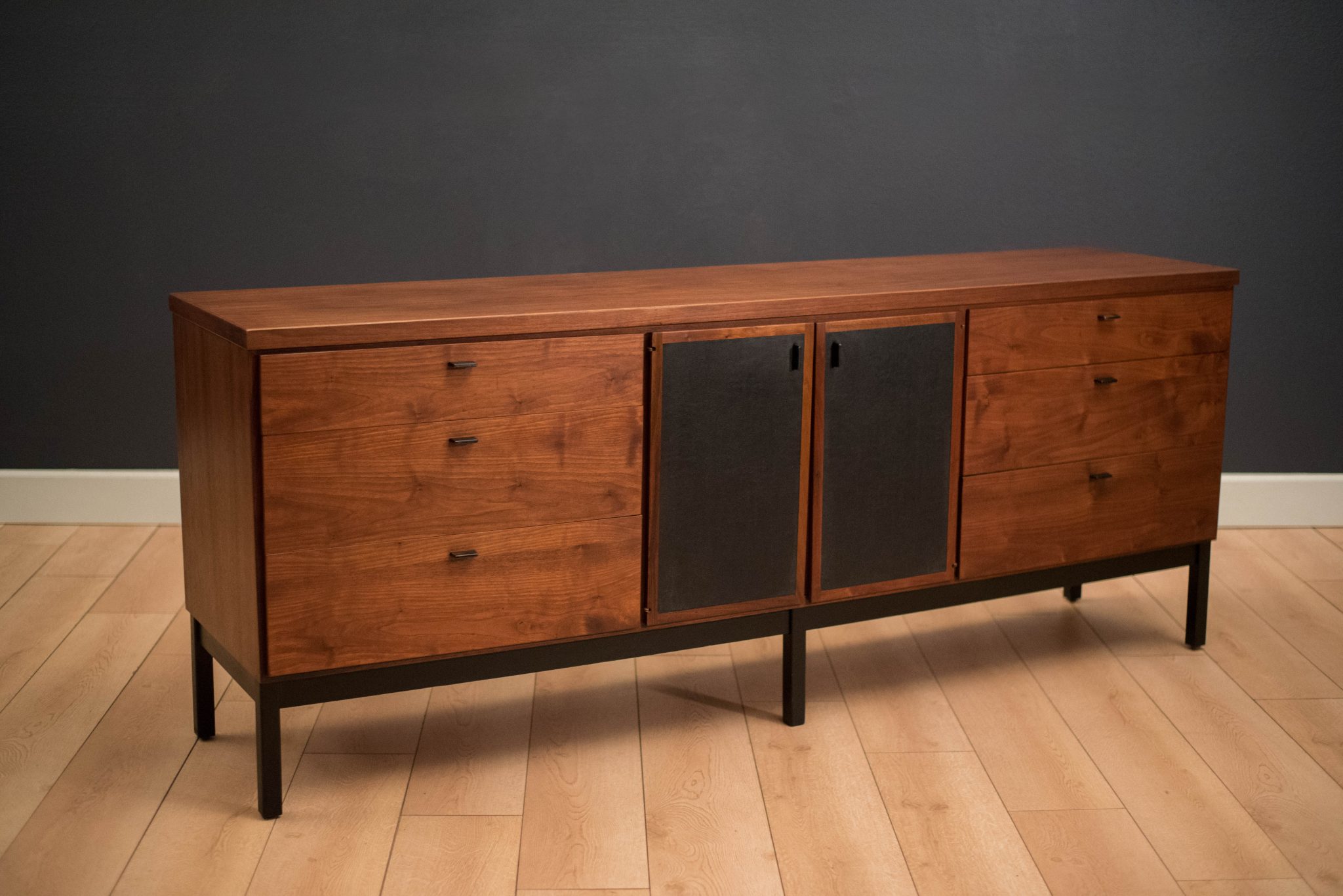 Mid-Century Modern dresser in walnut. This piece includes nine storage drawers with black metal pulls. Swing out doors are lined with black vinyl.