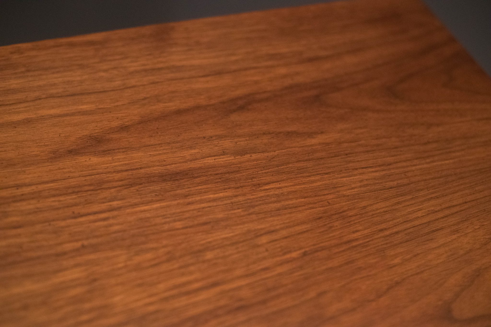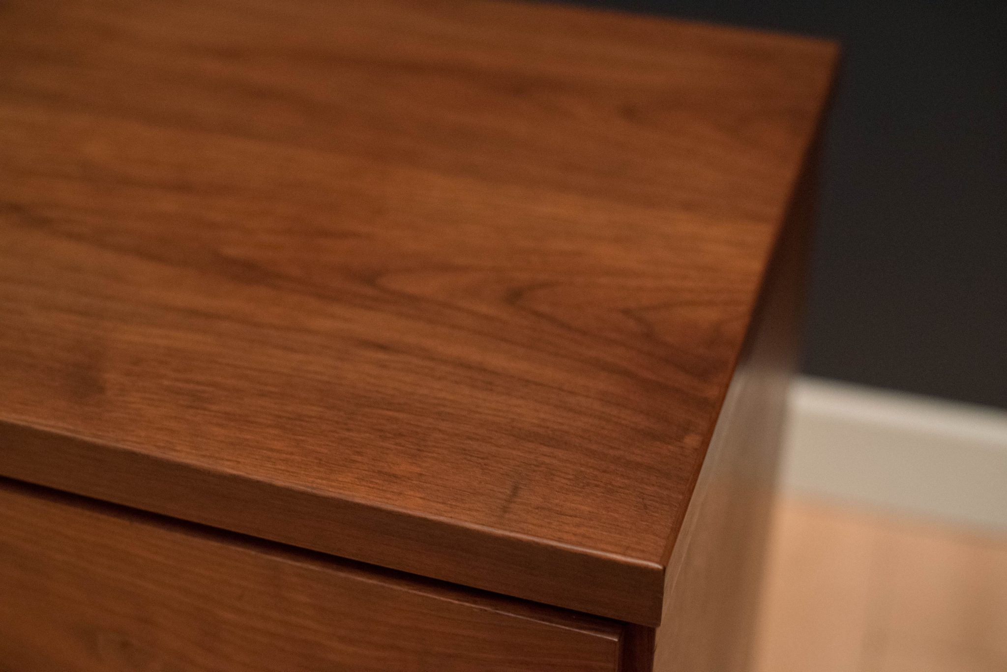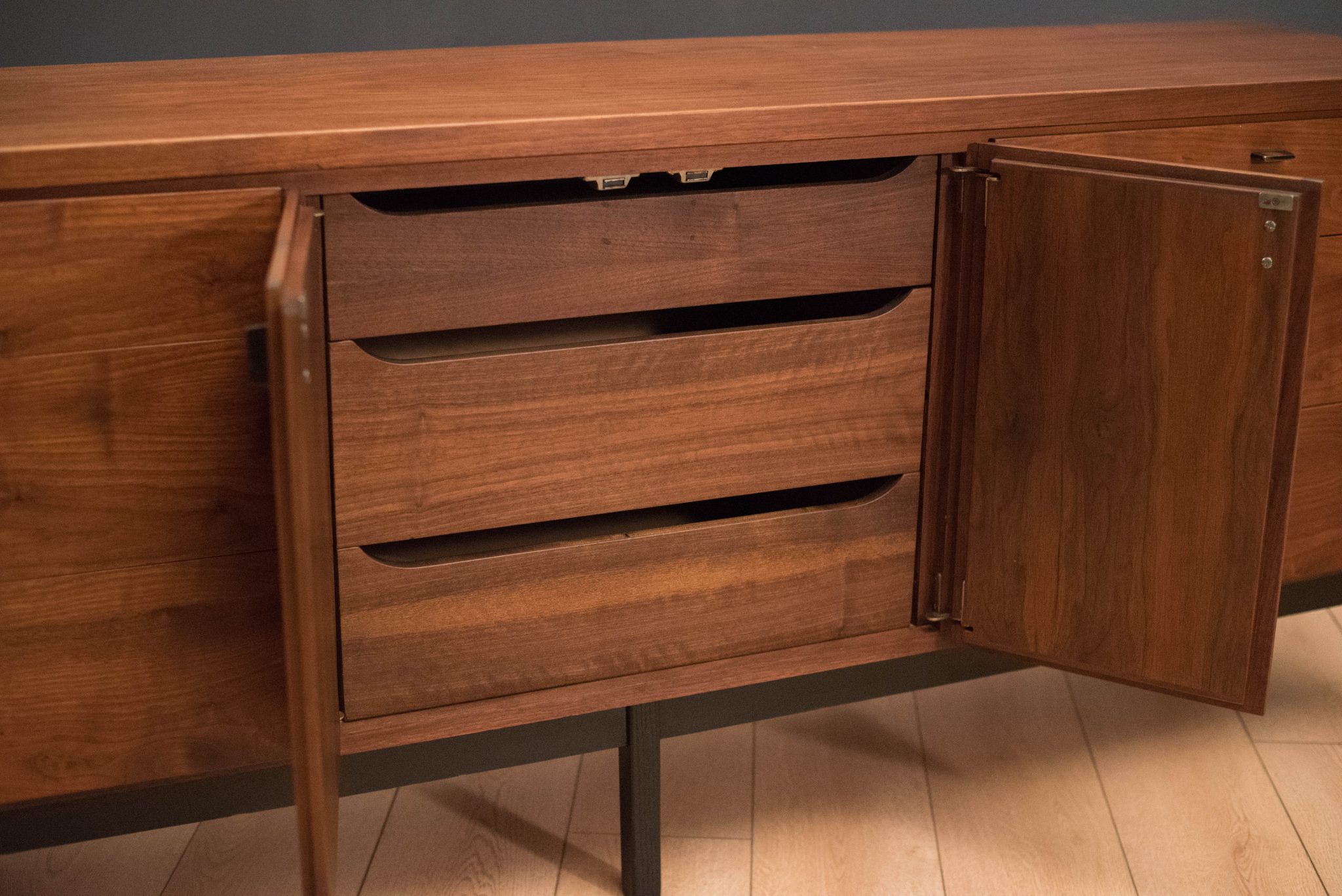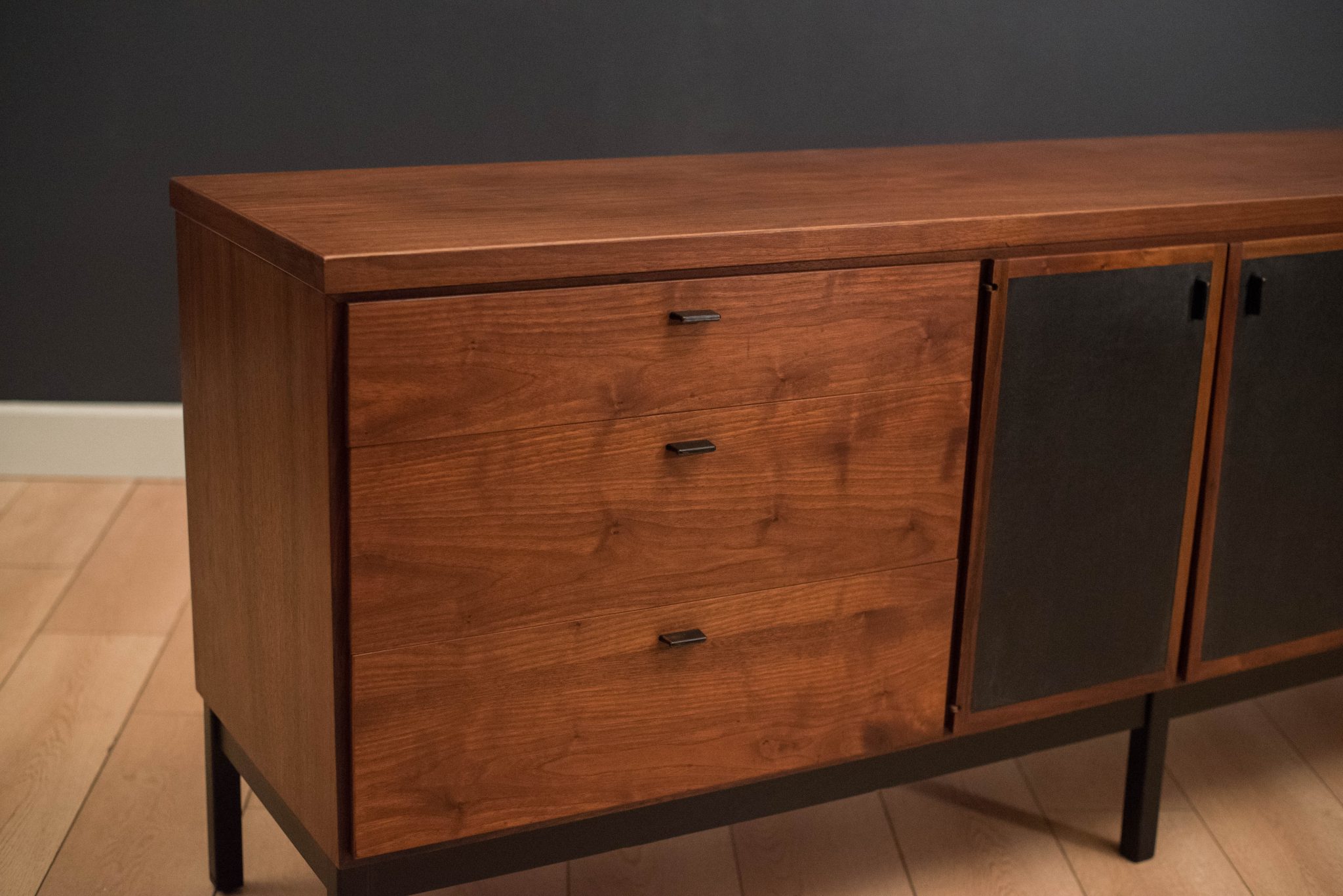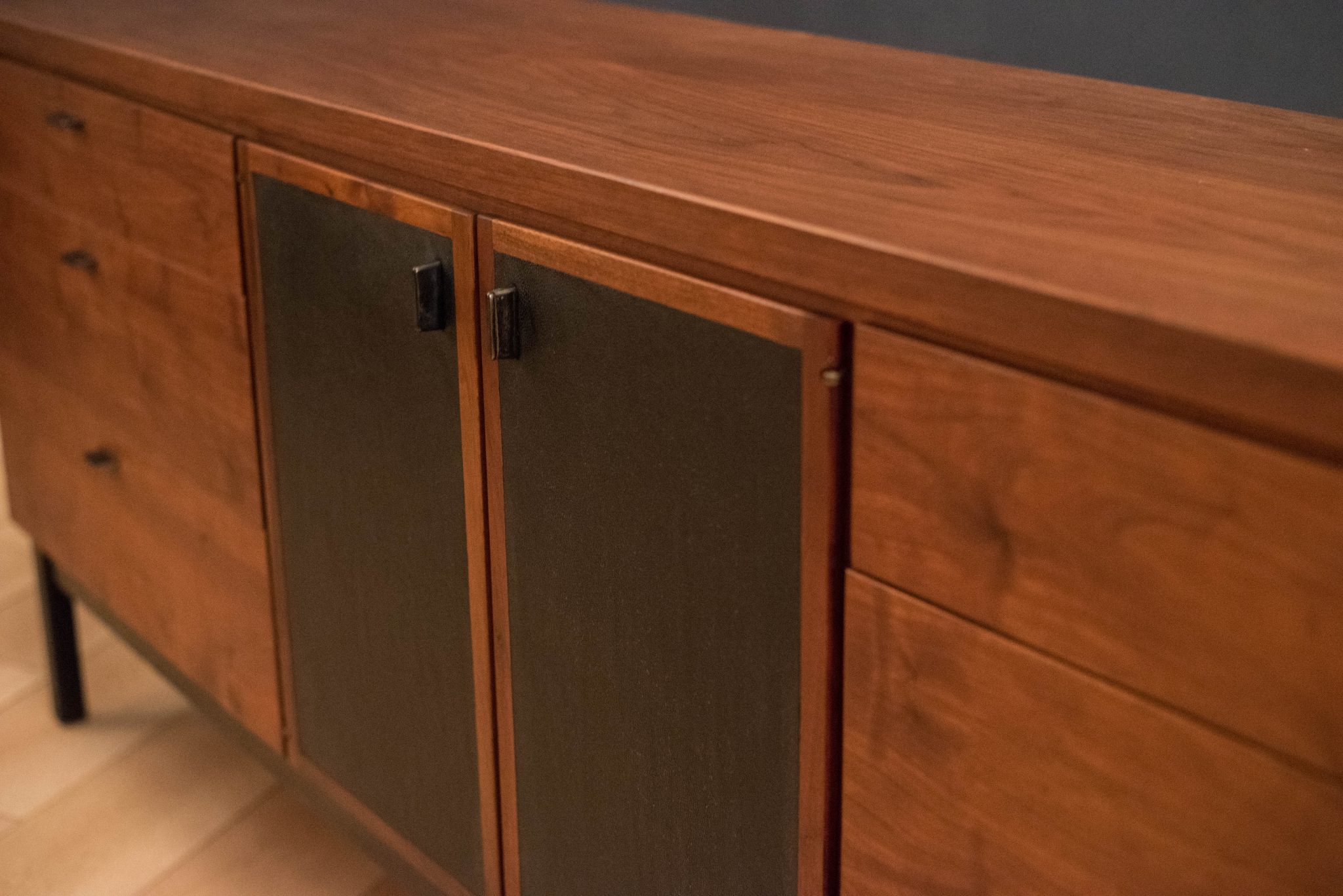 Mid-Century Modern dresser in walnut. This piece includes nine storage drawers with black metal pulls. Swing out doors are lined with black vinyl.