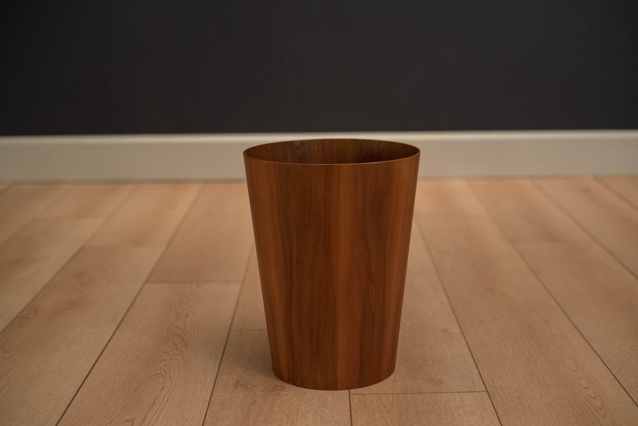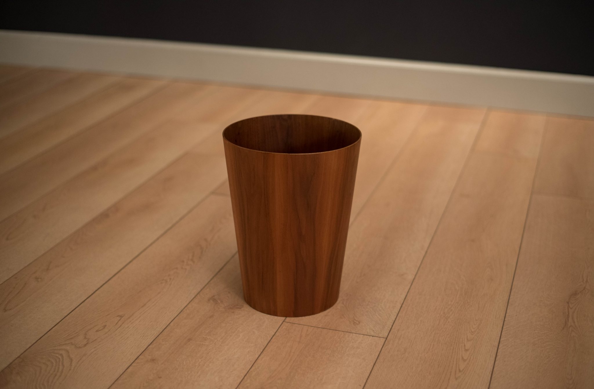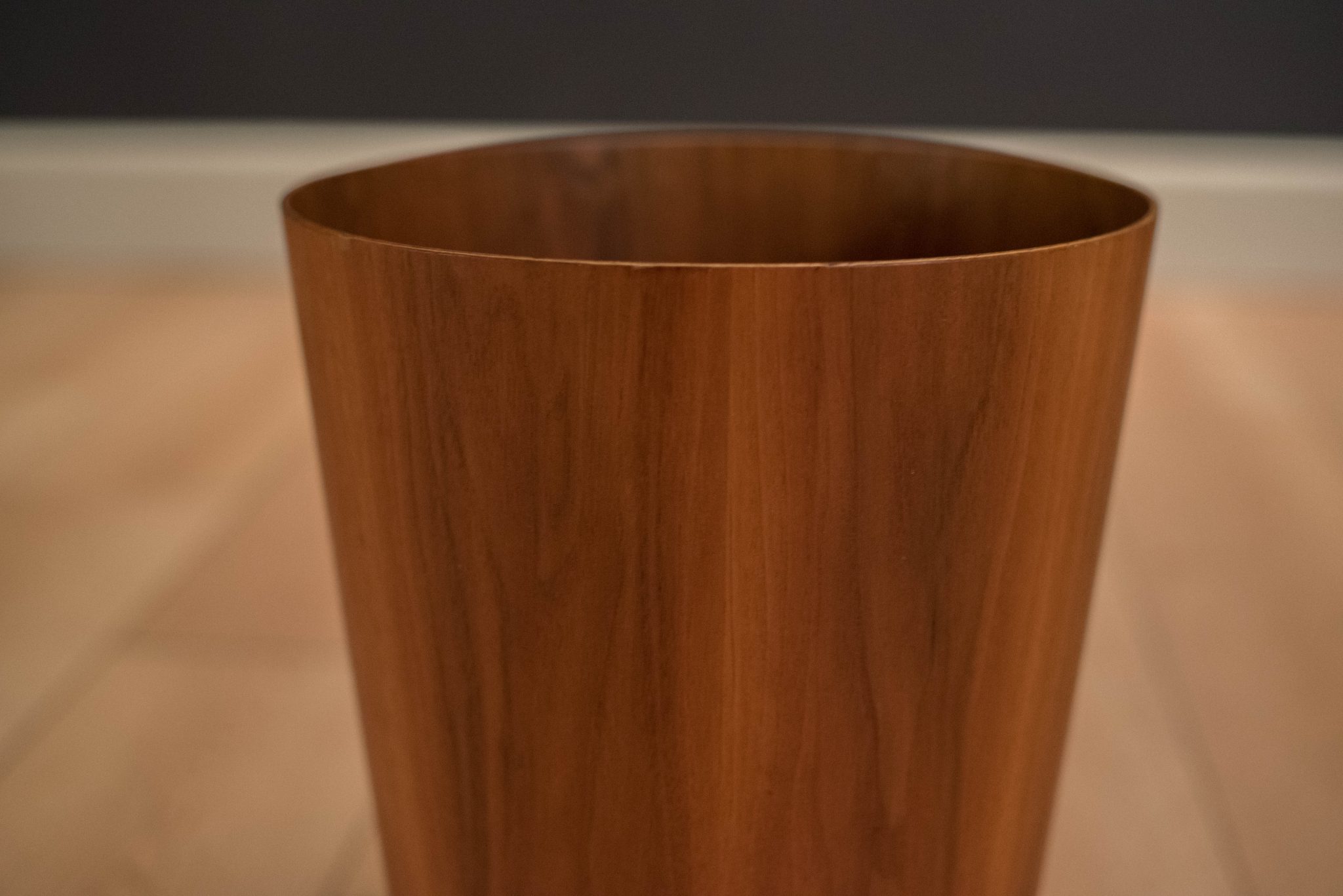Vintage Mid Century Waste Paper Basket in walnut, marked made in Sweden. This piece works perfect in any office or modern decor. In good condition with minimal vintage wear such as nicks on the bottom and fills on the inside of bin. See photos
