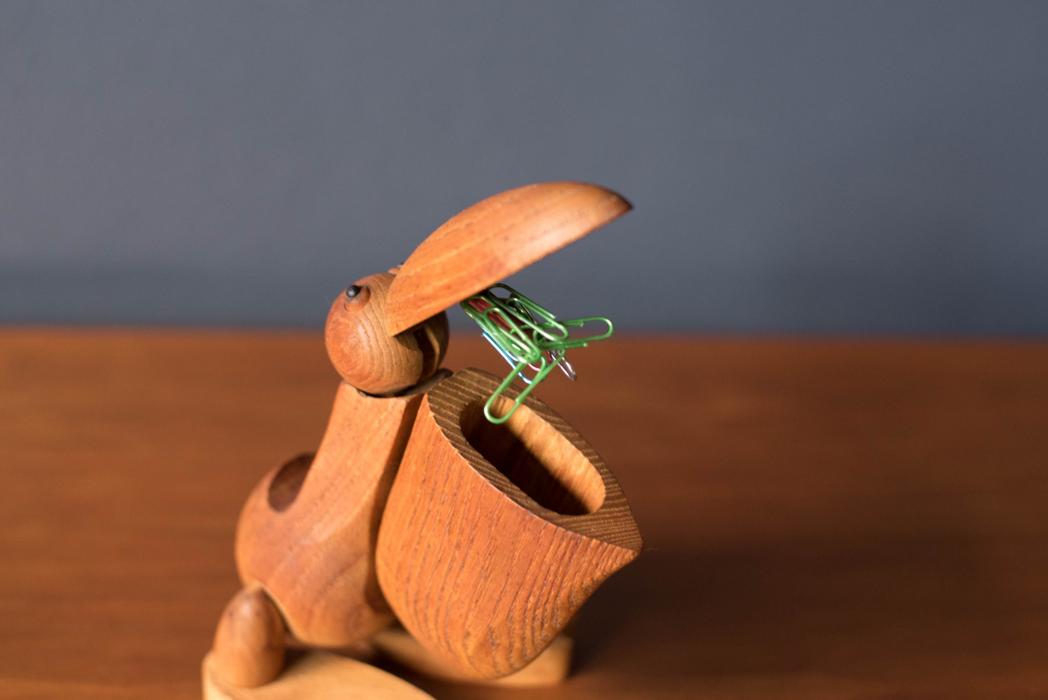 Vintage original teak pelican sculpture by Zoo Line, Japan. This clever piece can display business cards on the backside tail. A magnet also holds paperclips inside of the beak and both feet can be used are a penholder. Great accessory for the office or home desktop.