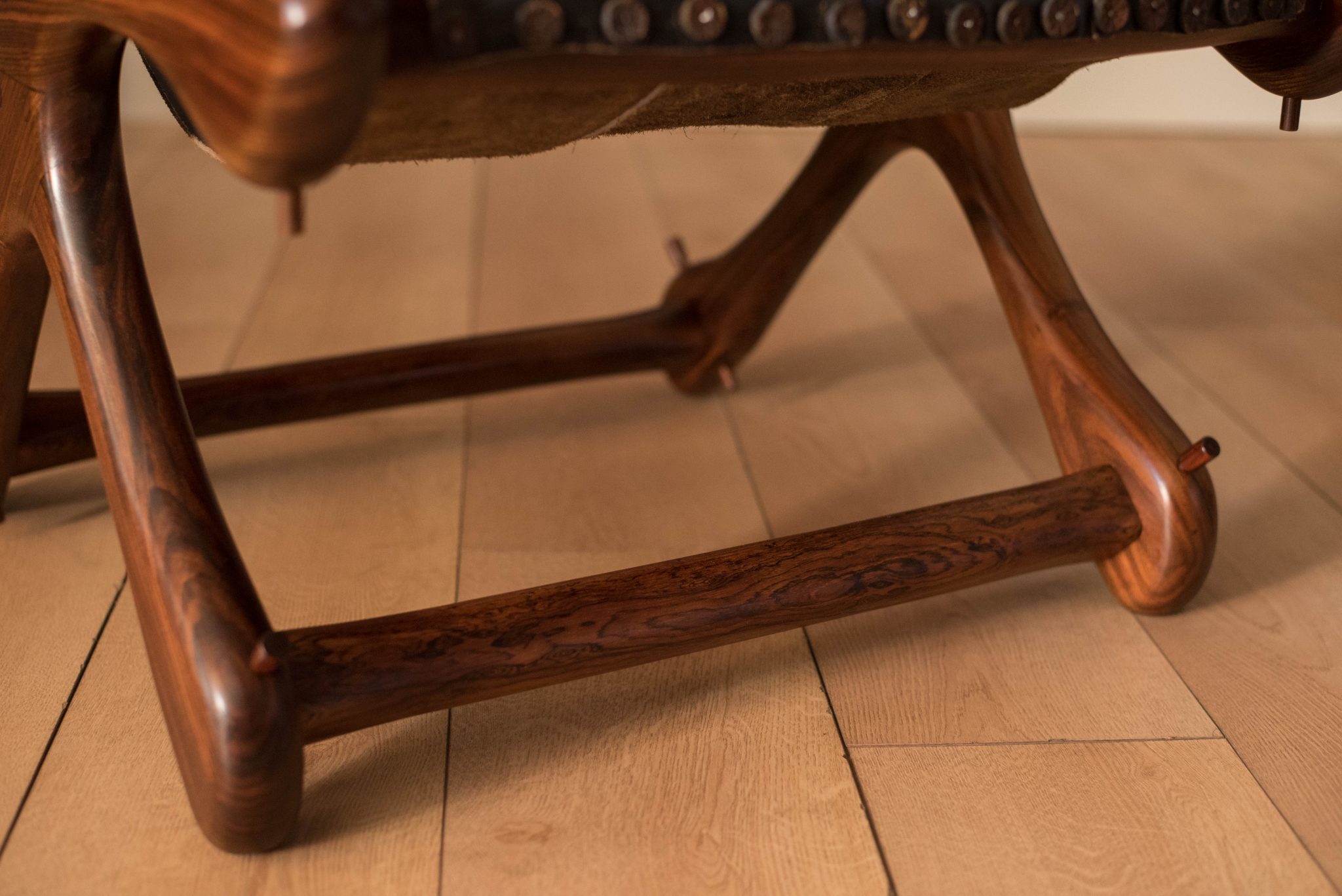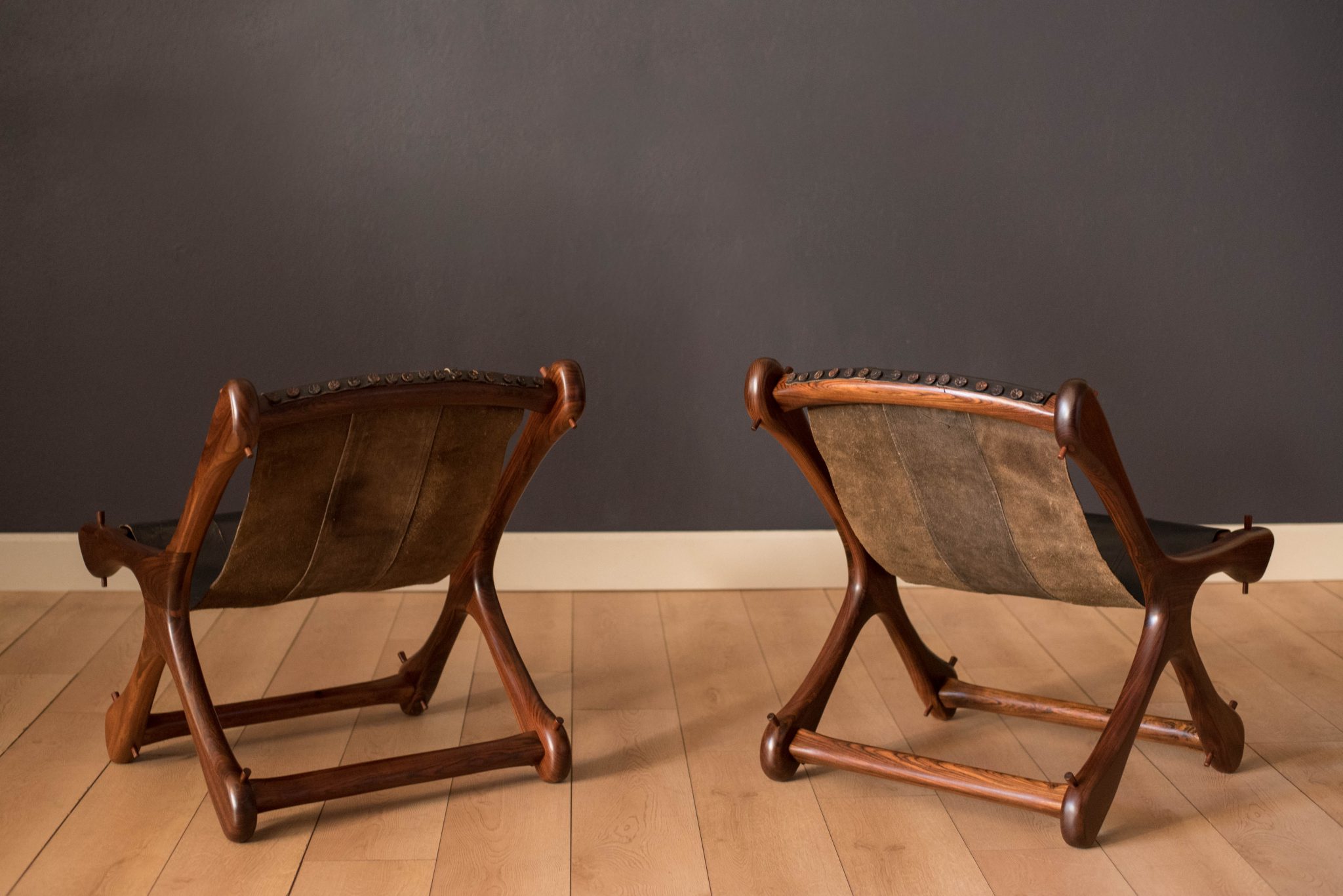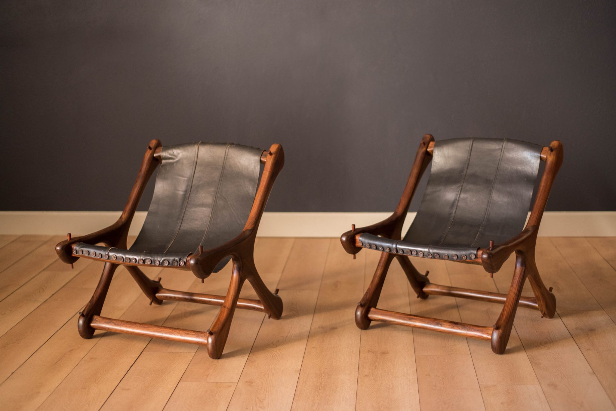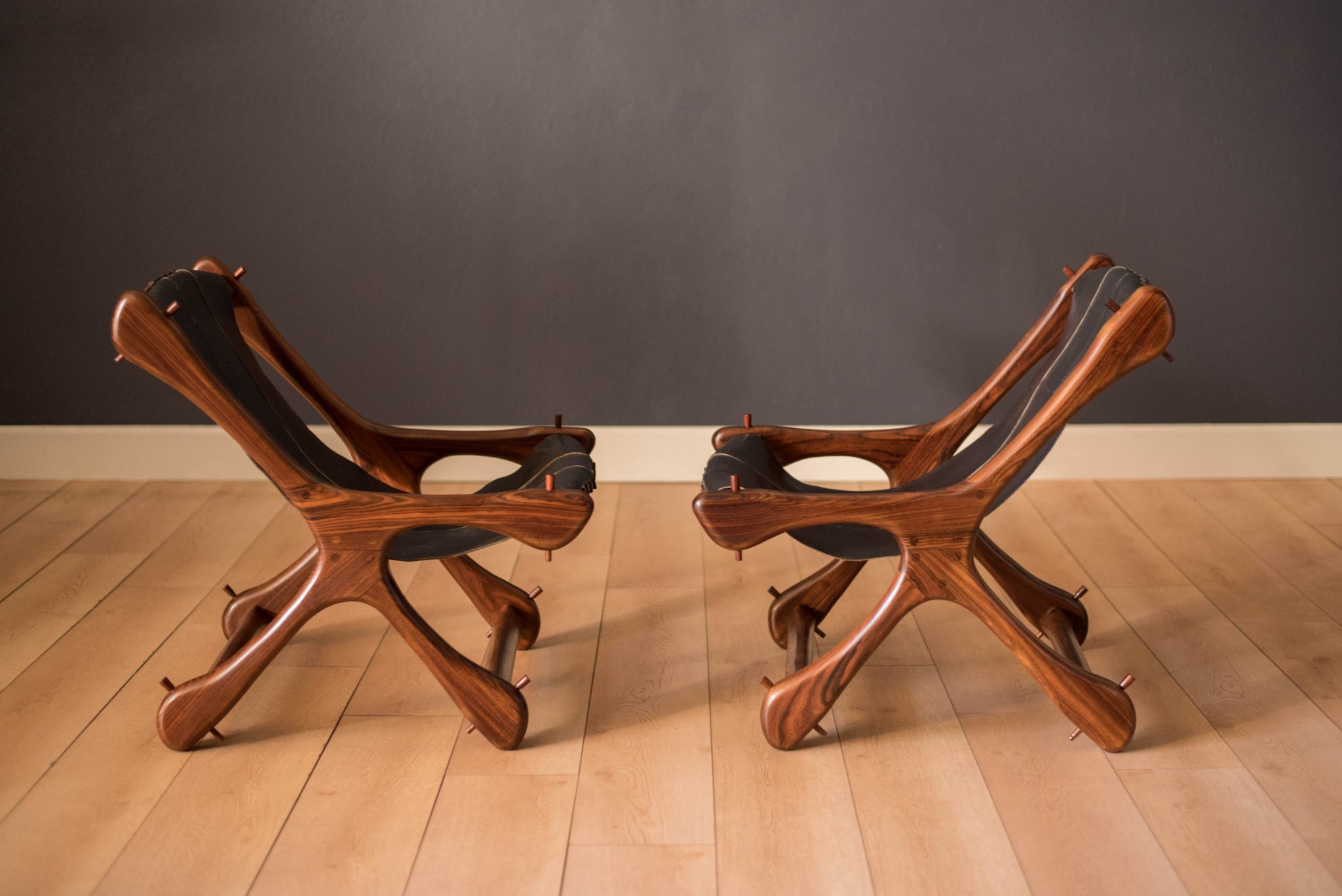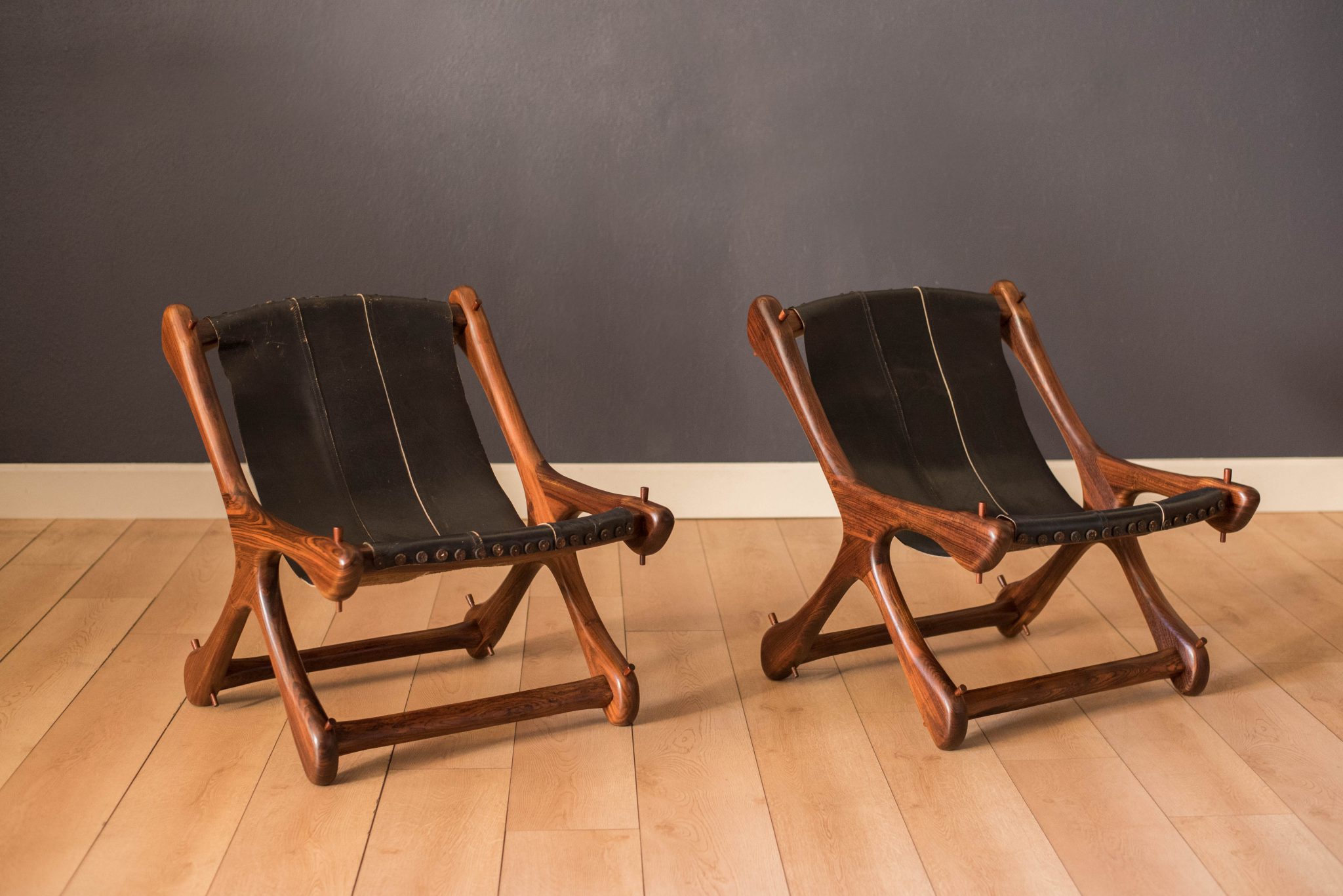 Mid-century Modern pair of sling chairs designed by Don Shoemaker in cocobolo rosewood manufactured by Senal S.A., Mexico. This sculptural pair features flowing rosewood grains and contrasting joinery. Displays well from all angles and retains the original leather slings with beautifully aged patina.