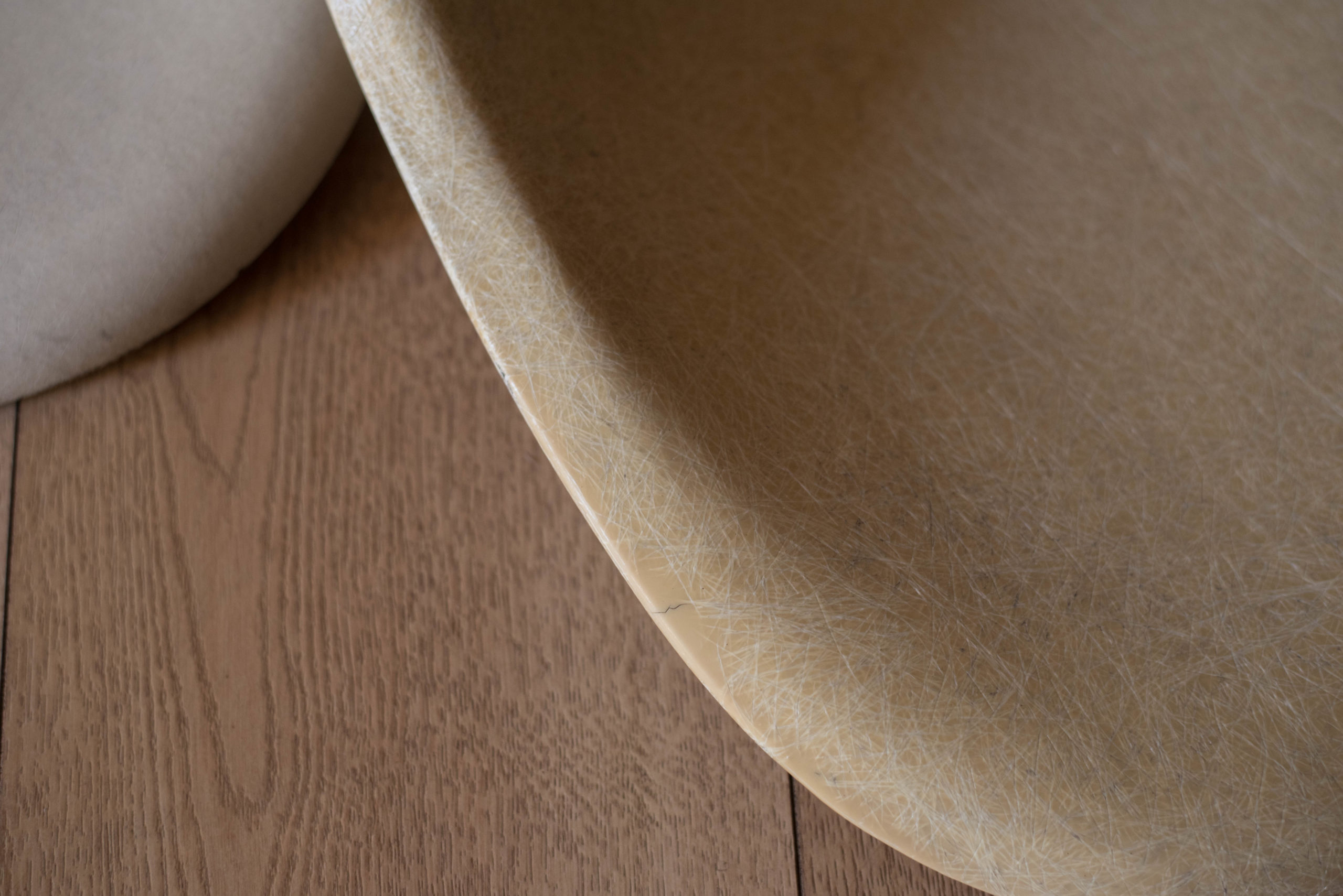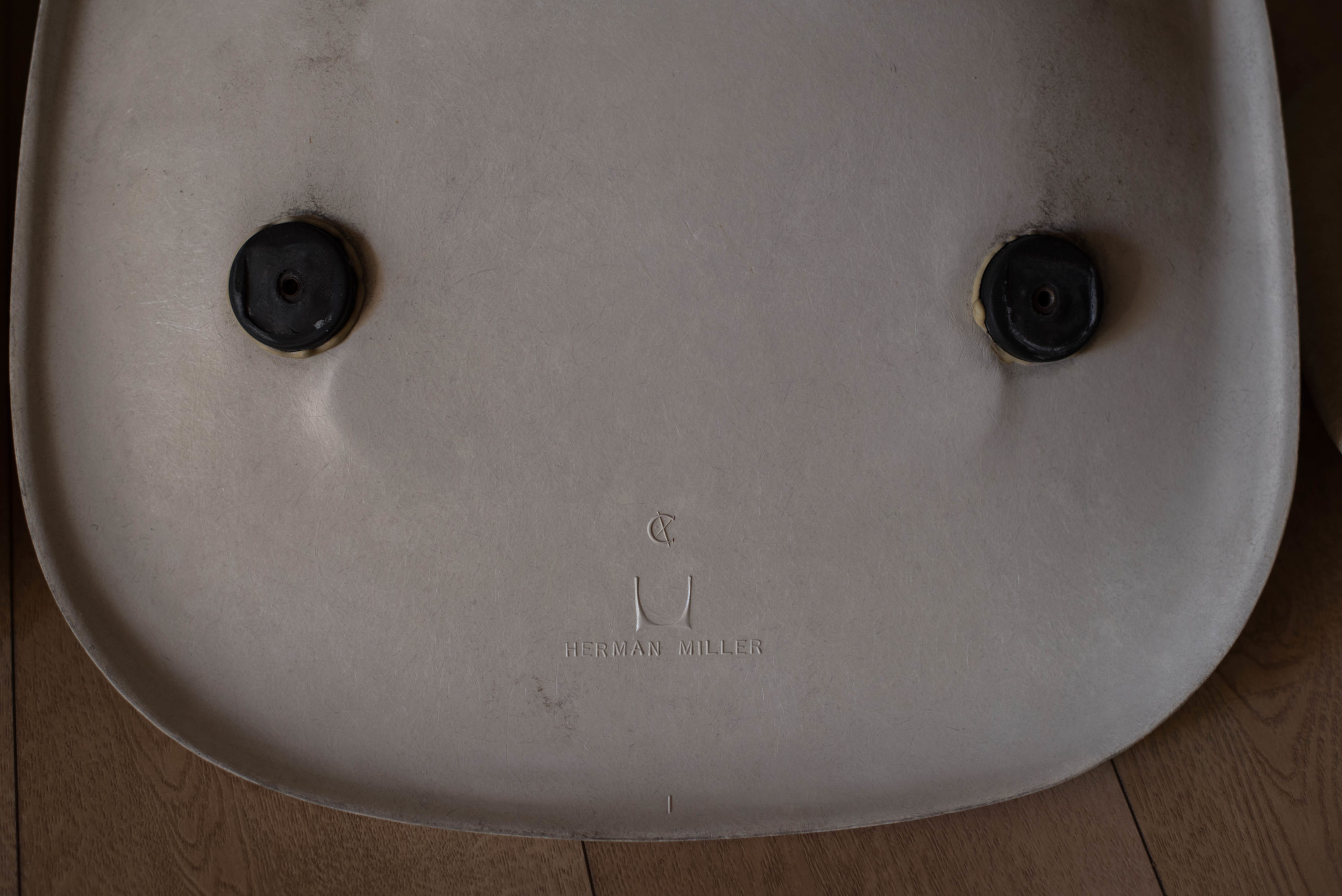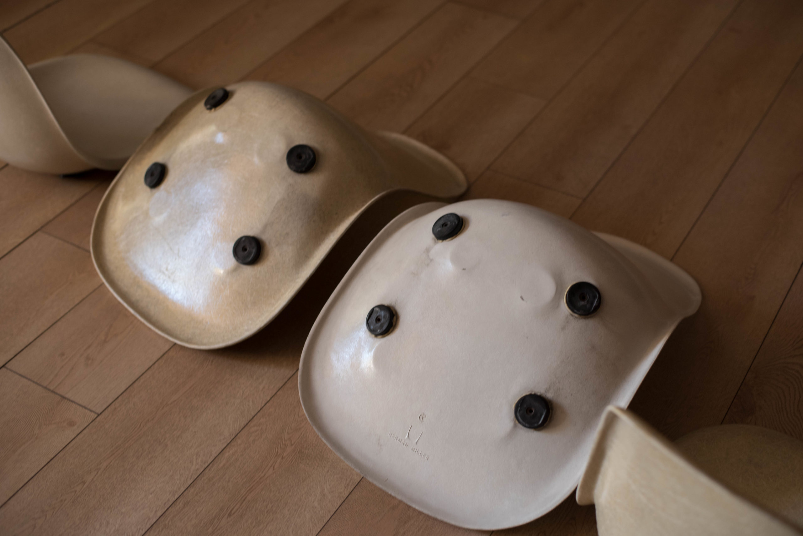 Mid Century Modern DSS stacking dining side chairs designed by Ray and Charles Eames for Herman Miller circa 1960s. These collectible molded fiberglass shell seats are available in greige light (white) and yellow. Price is for each, please specify requested color and quantity upon checkout. In good condition with wear such as patina, blemishes, and nicks on the shells. One of the shells has a small split on the side of the fiberglass seat. See photos. Original stacking bases may be available upon request. Yellow seats unmarked.