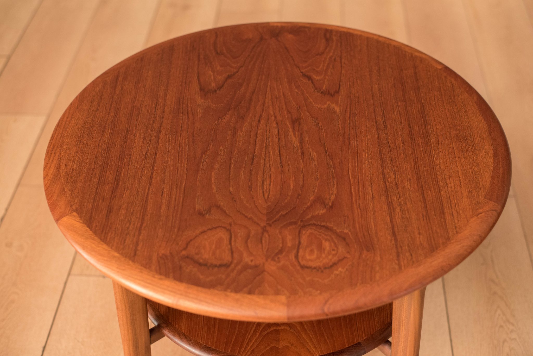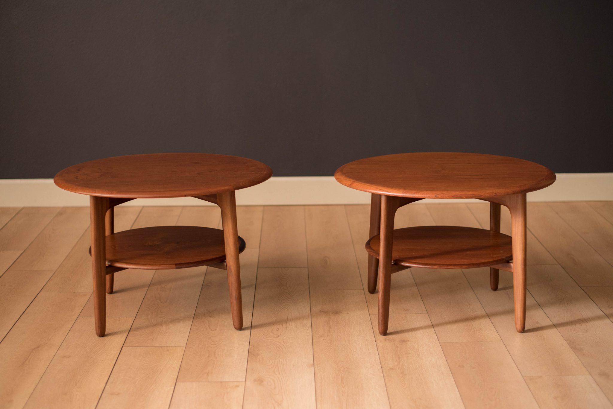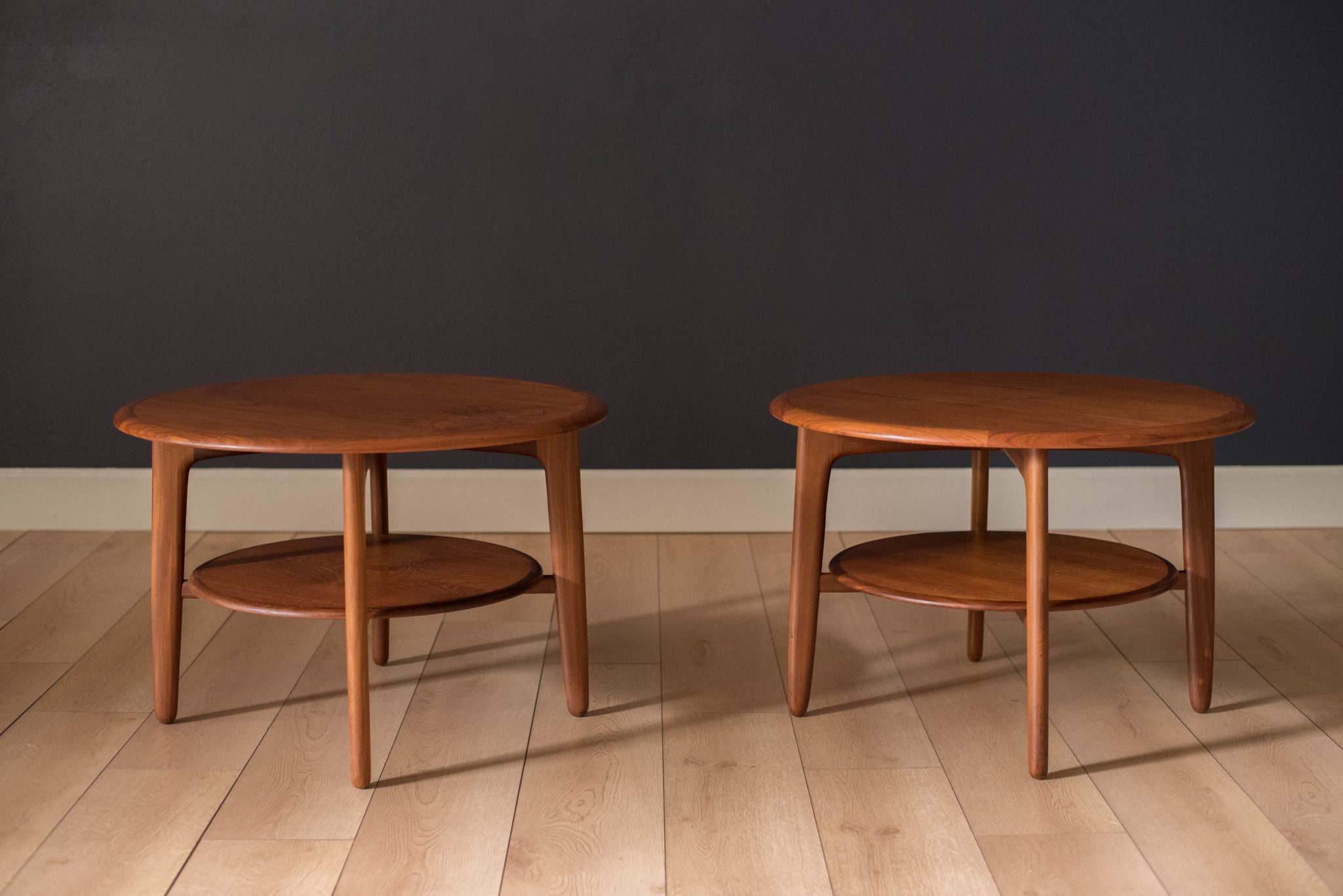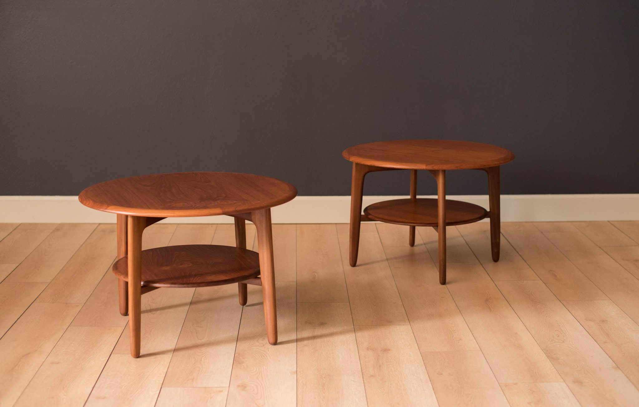 Mid century pair of matching side tables designed by Svend Madsen in teak. This set features a round top with solid edge banding and a lower tier for more display space.