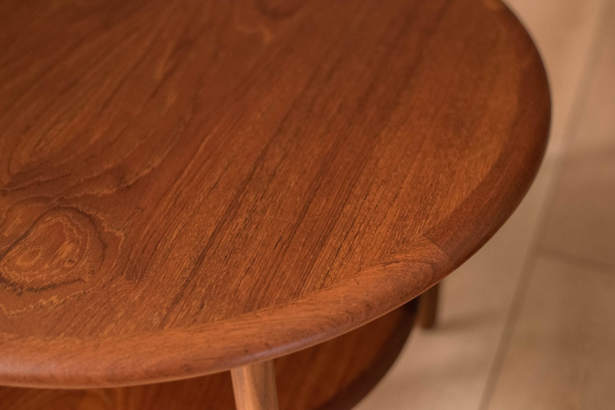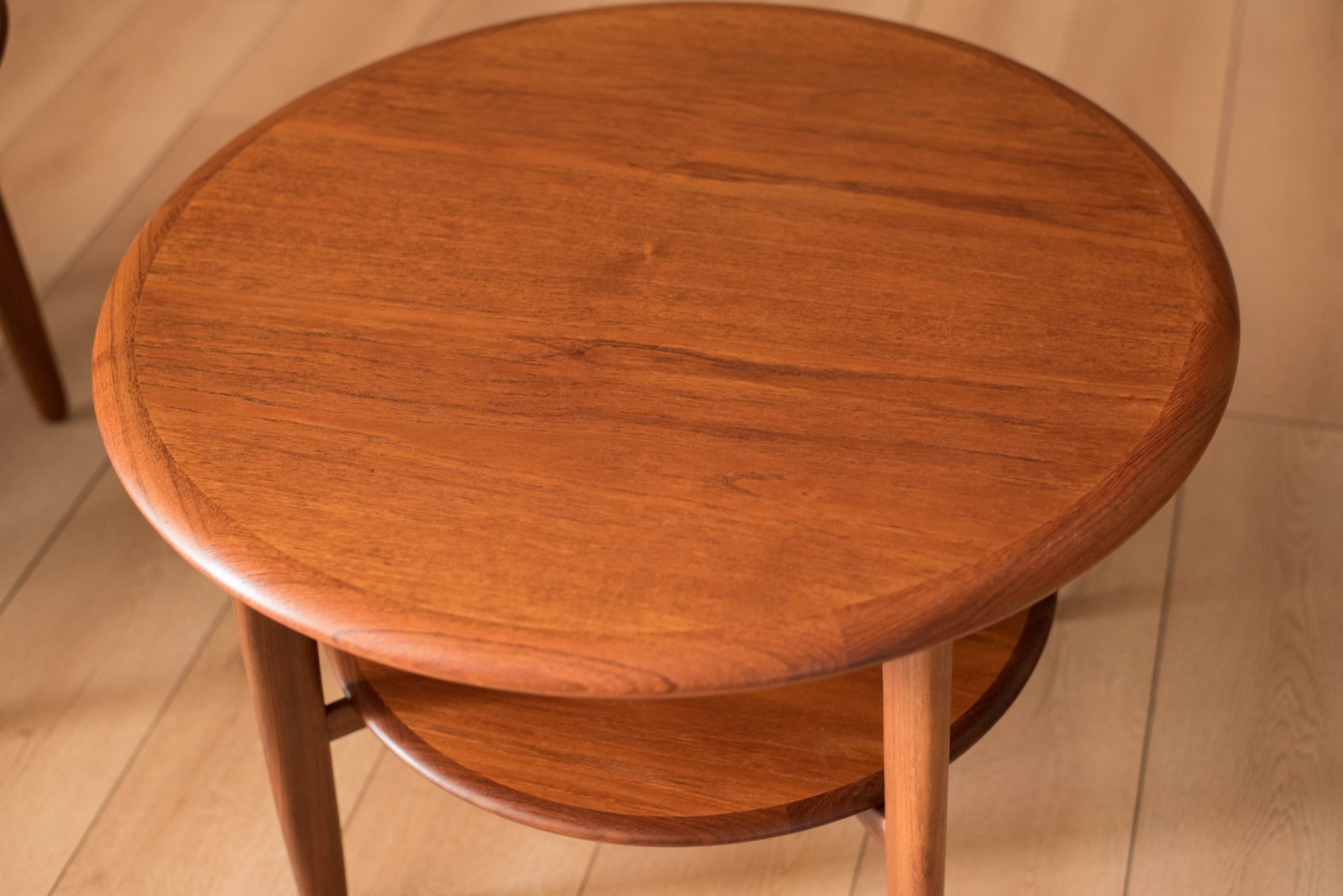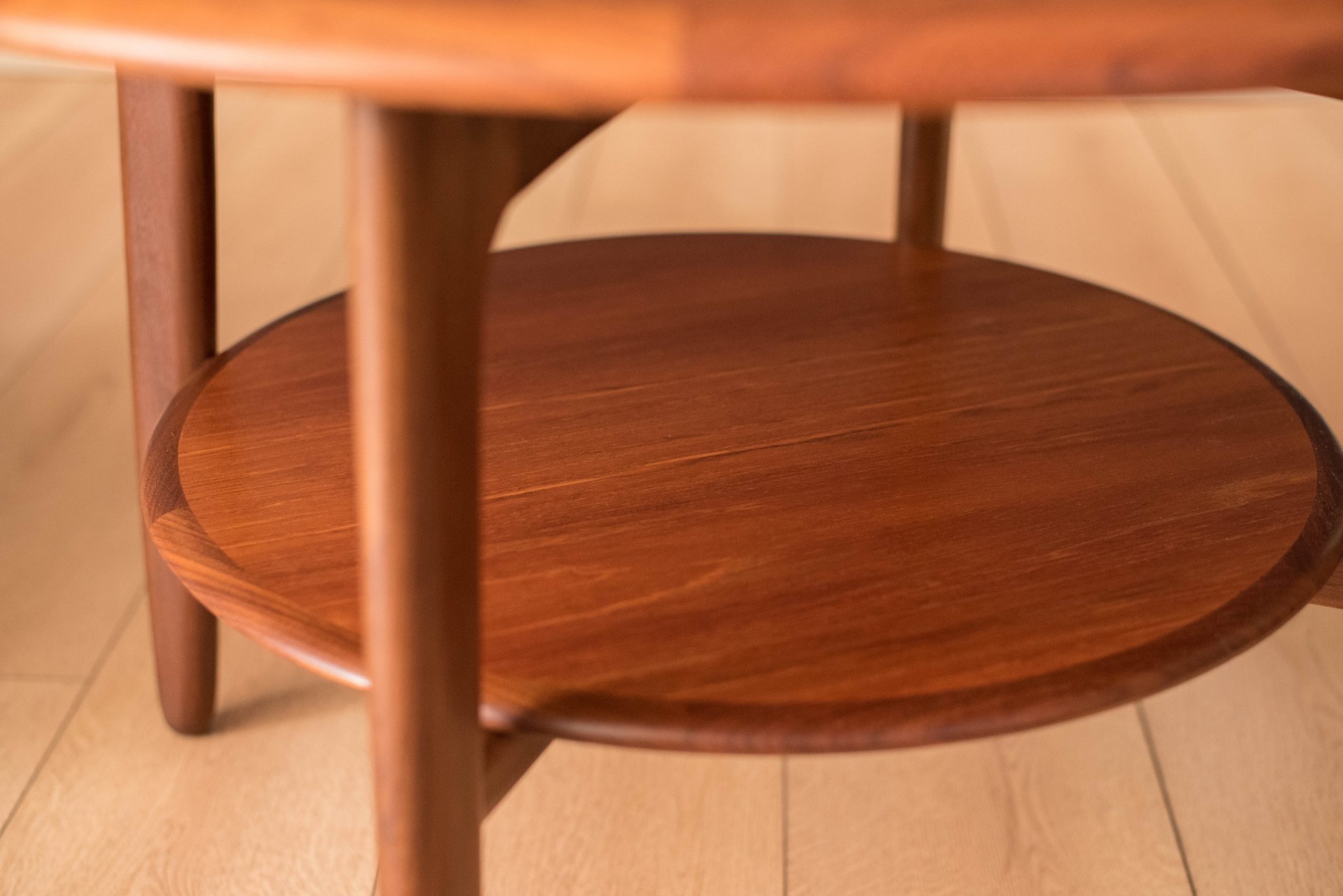 Mid century pair of matching side tables designed by Svend Madsen in teak. This set features a round top with solid edge banding and a lower tier for more display space.