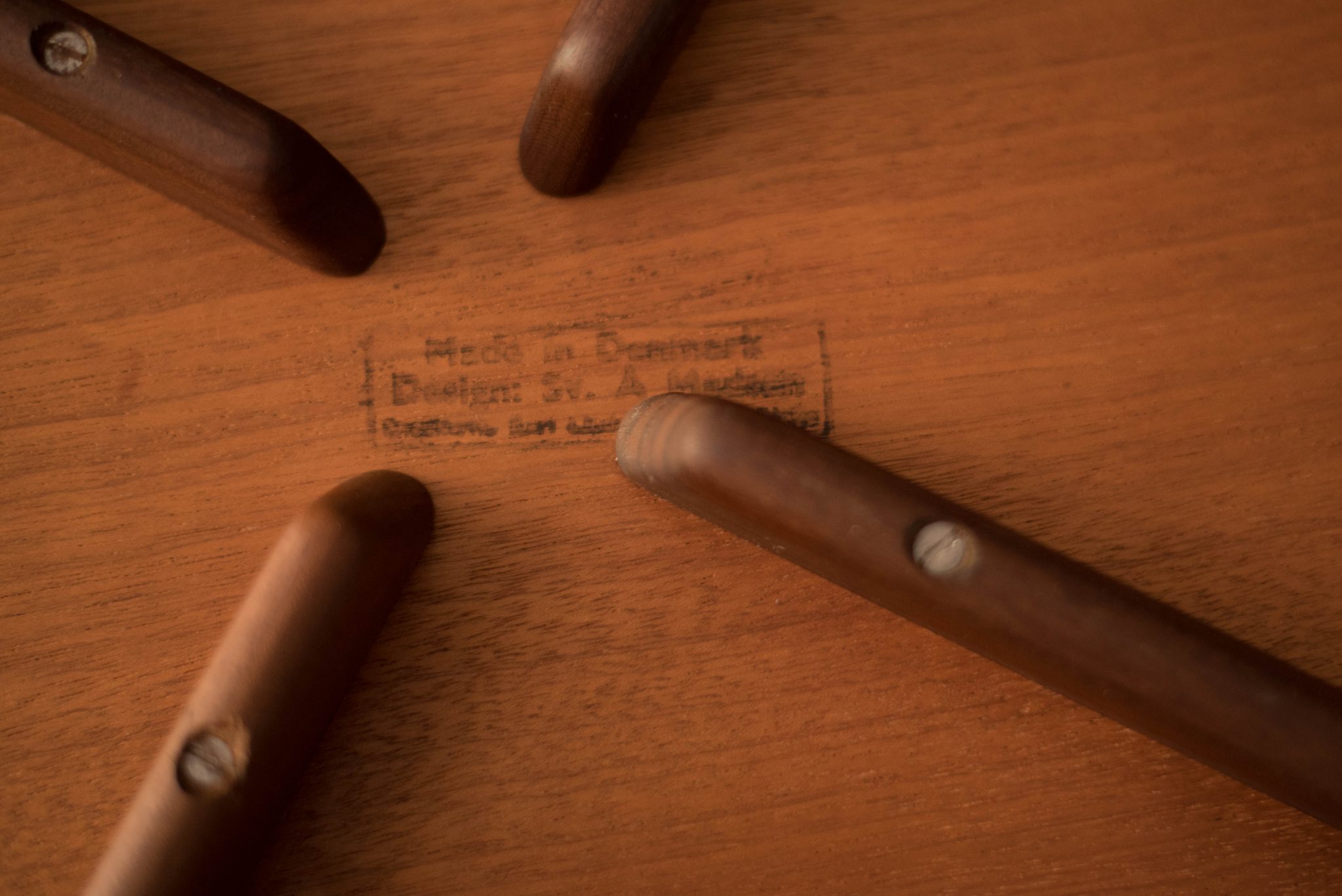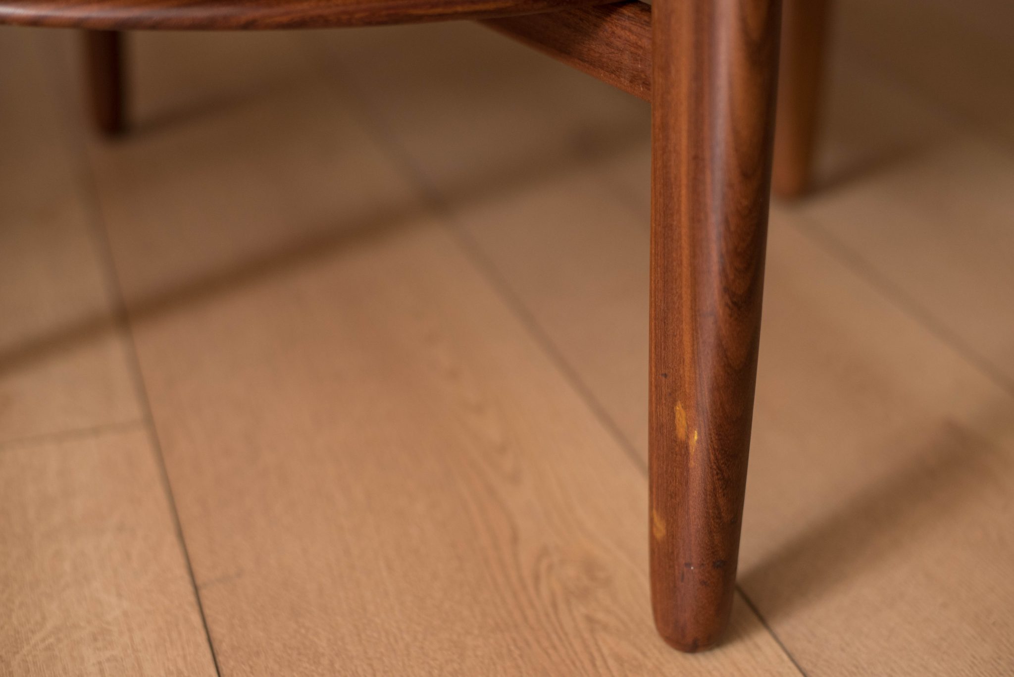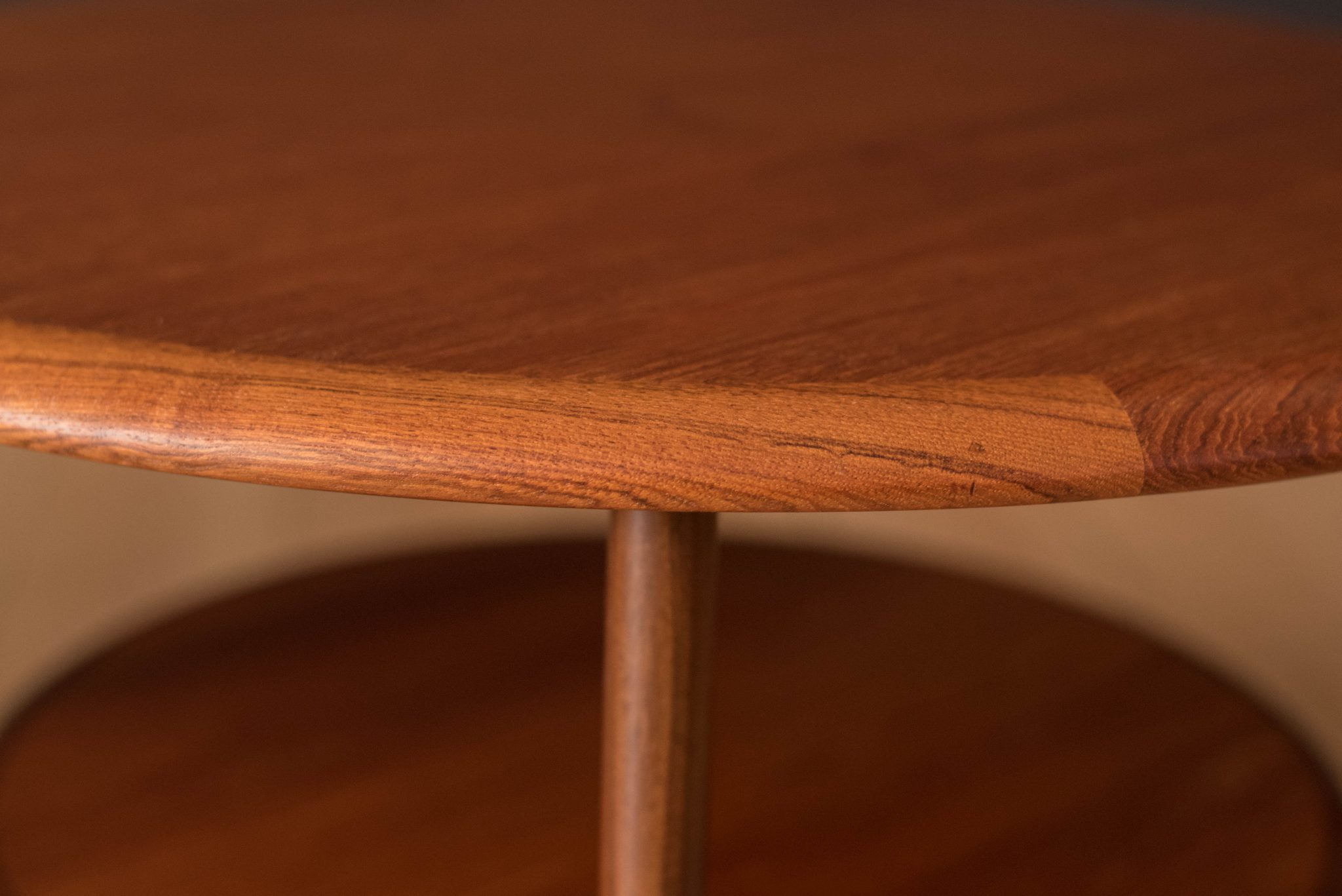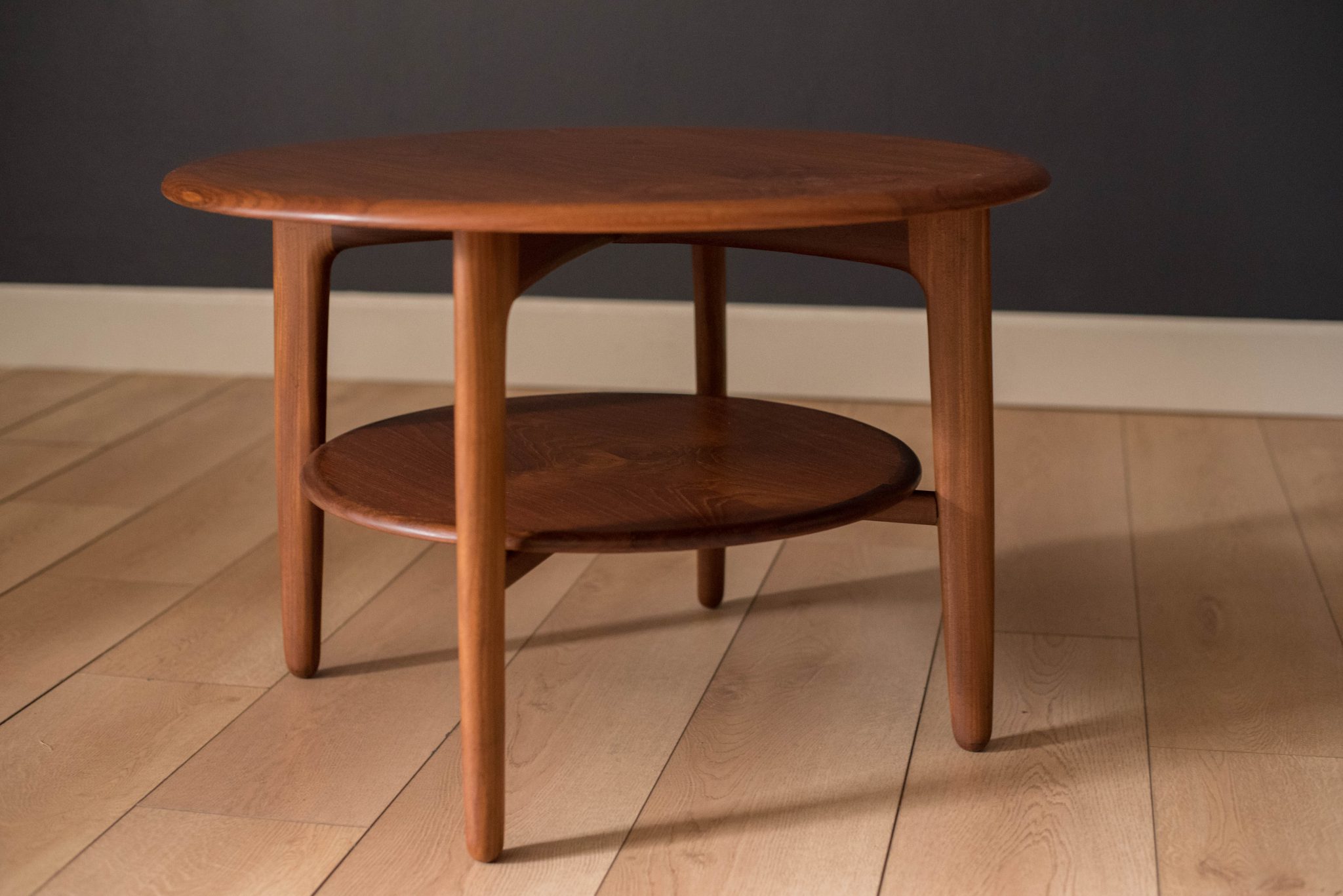 Mid century pair of matching side tables designed by Svend Madsen in teak. This set features a round top with solid edge banding and a lower tier for more display space.
