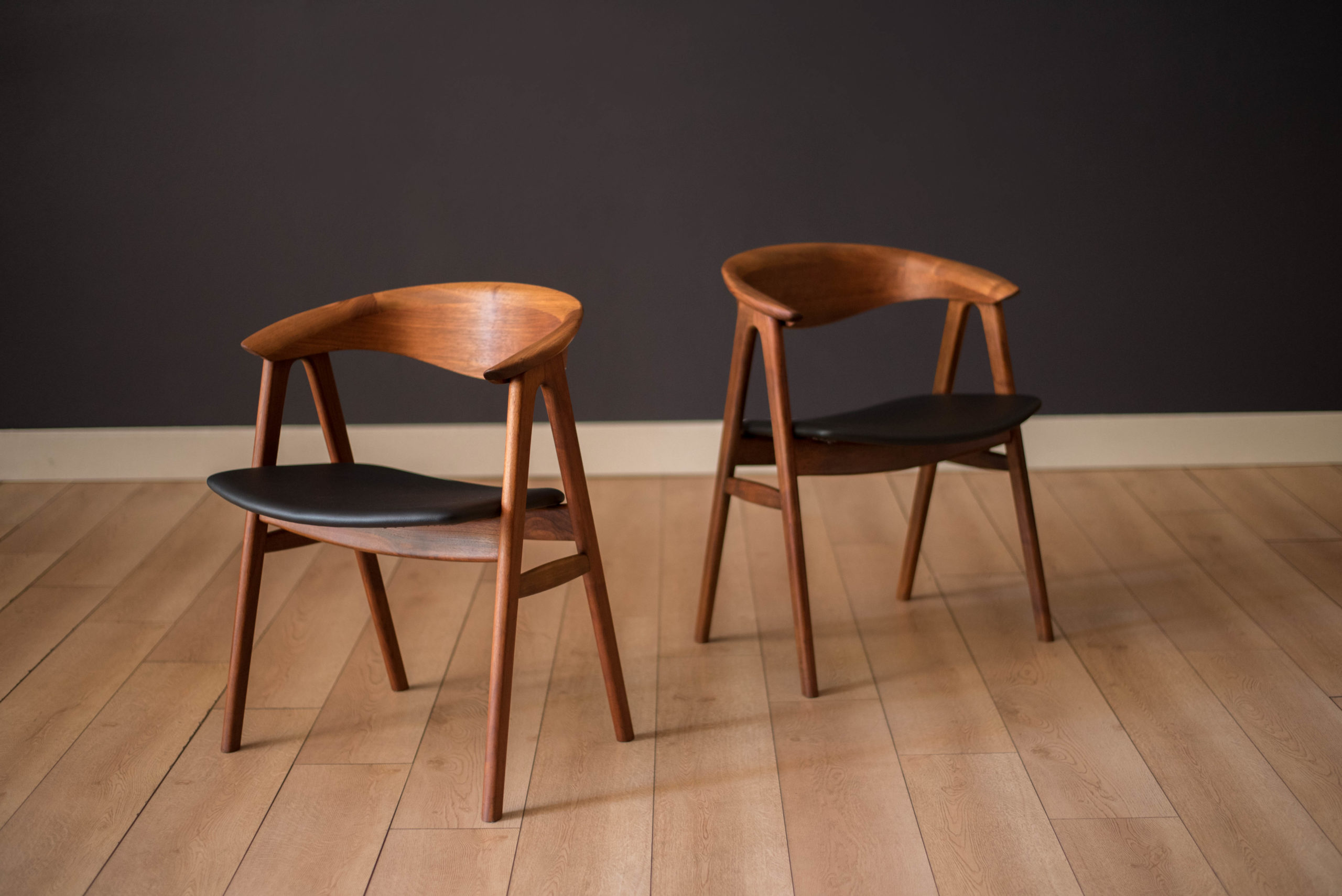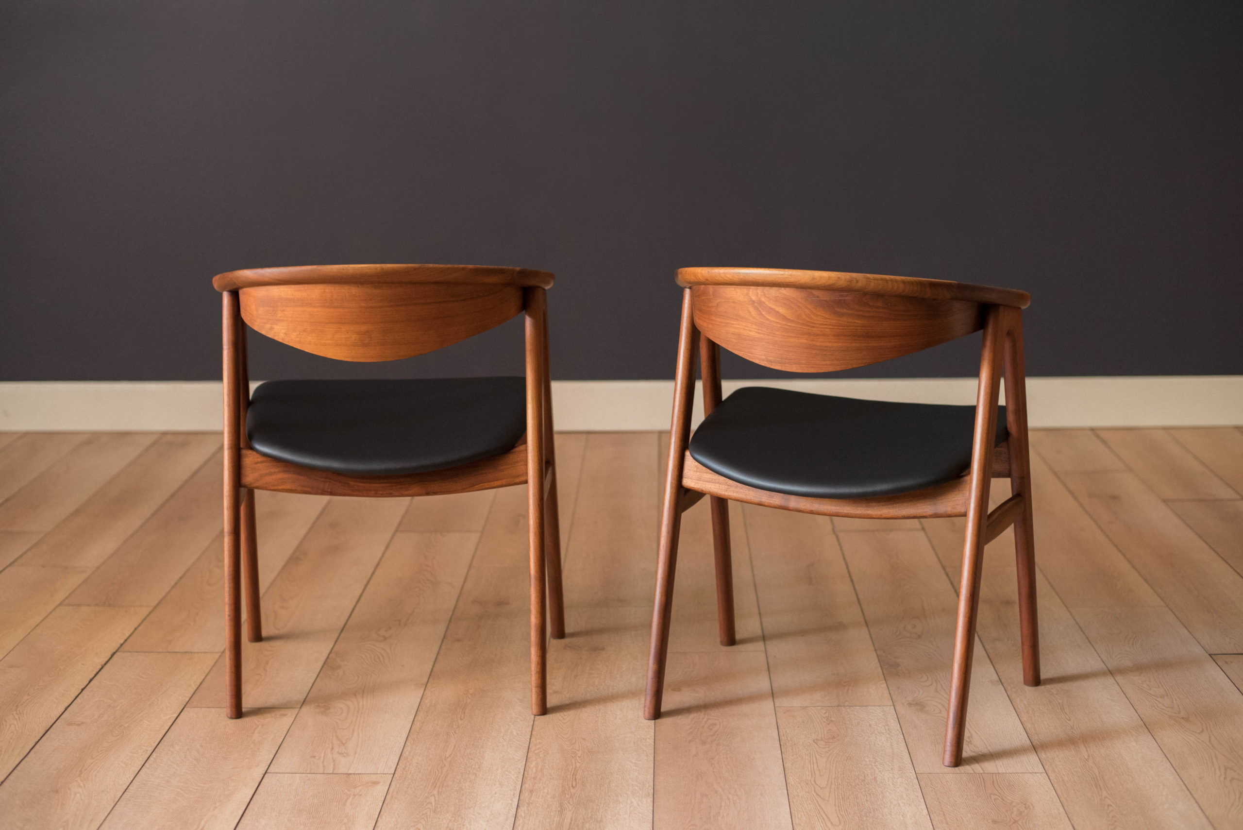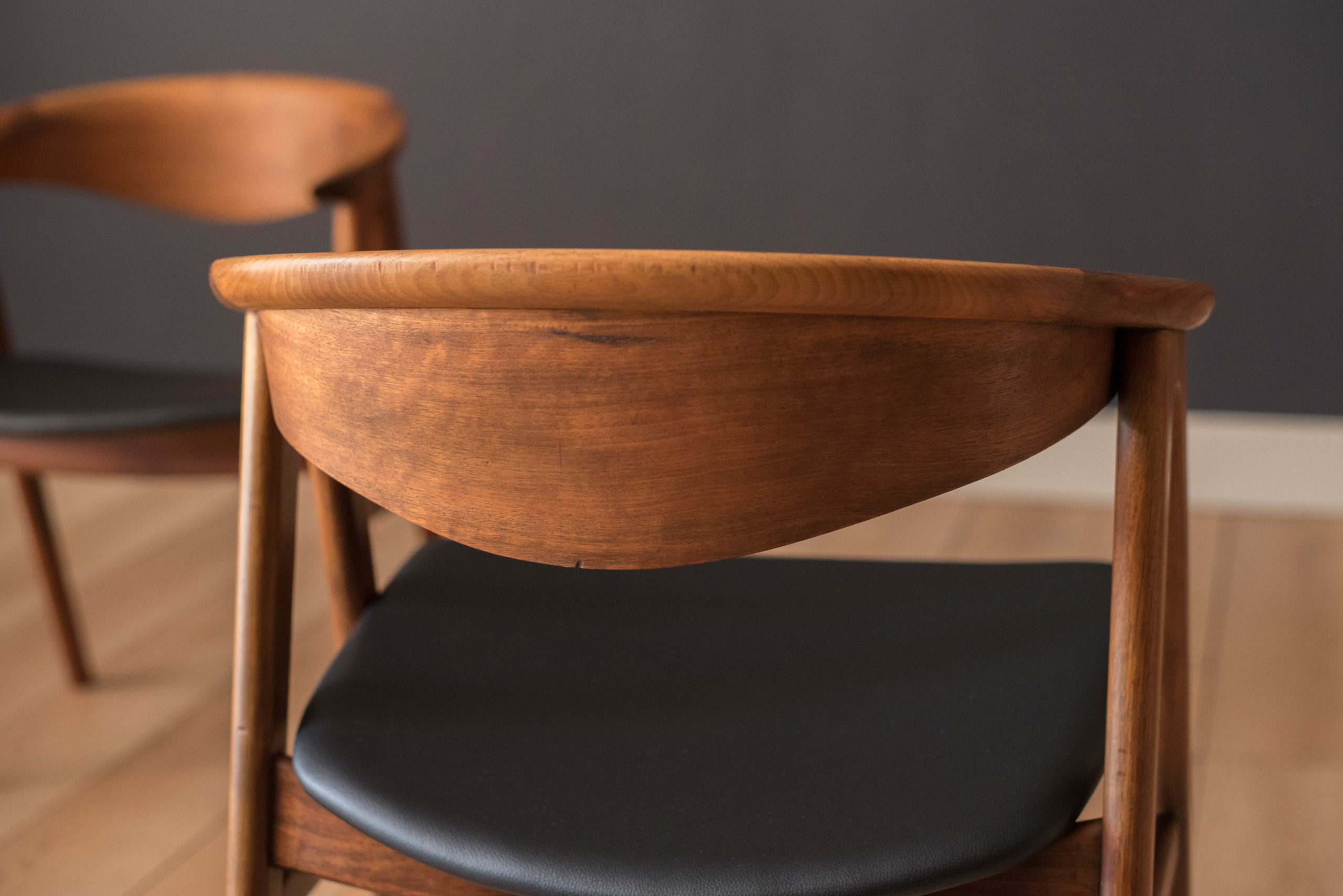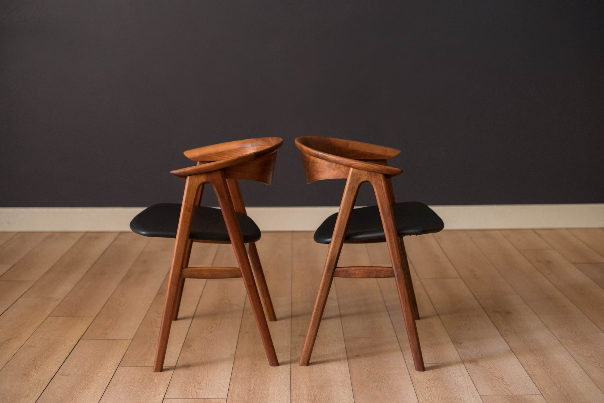 Pair of Mid Century Modern Compass dining chairs in walnut designed by Erik Kirkegaard for Hong Stølefabrik, Denmark model no. 52 imported by Dux. This side chair set features sculpted backrests and the seats have been newly reupholstered in black vinyl. Perfect to use as a captain chair or as a desk armchair in the office. Price is for a set of two.