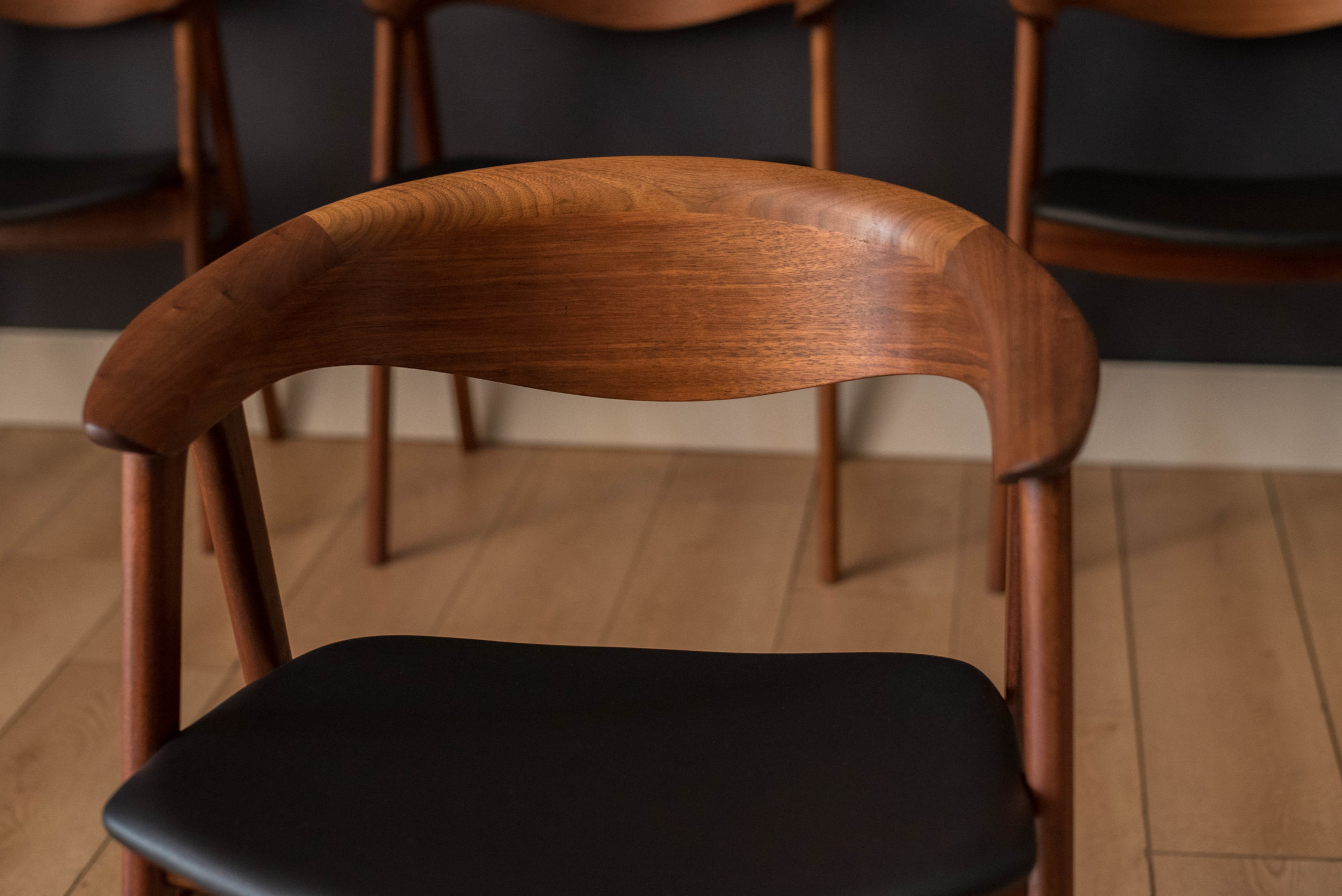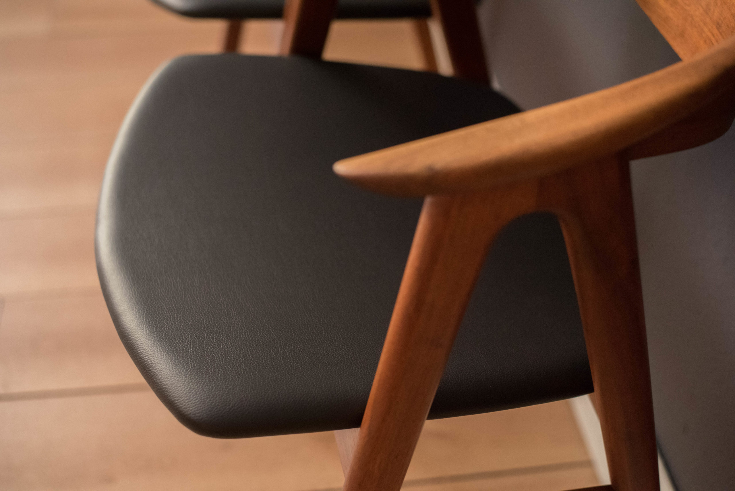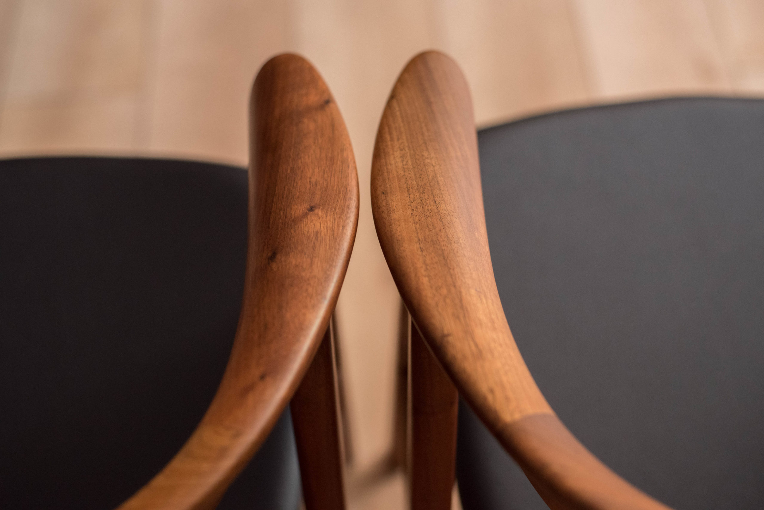 Pair of Mid Century Modern Compass dining chairs in walnut designed by Erik Kirkegaard for Hong Stølefabrik, Denmark model no. 52 imported by Dux. This side chair set features sculpted backrests and the seats have been newly reupholstered in black vinyl. Perfect to use as a captain chair or as a desk armchair in the office. Price is for a set of two.