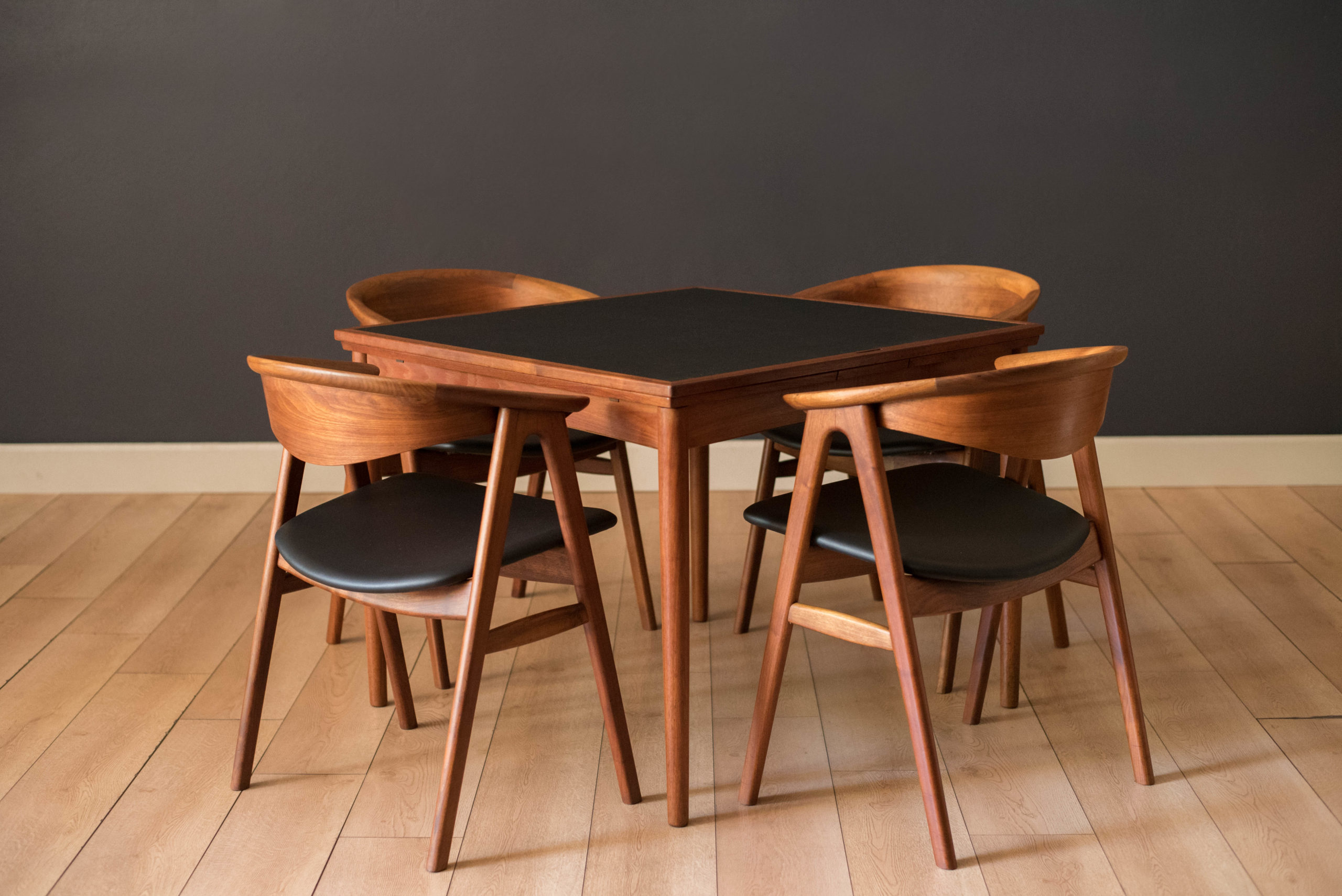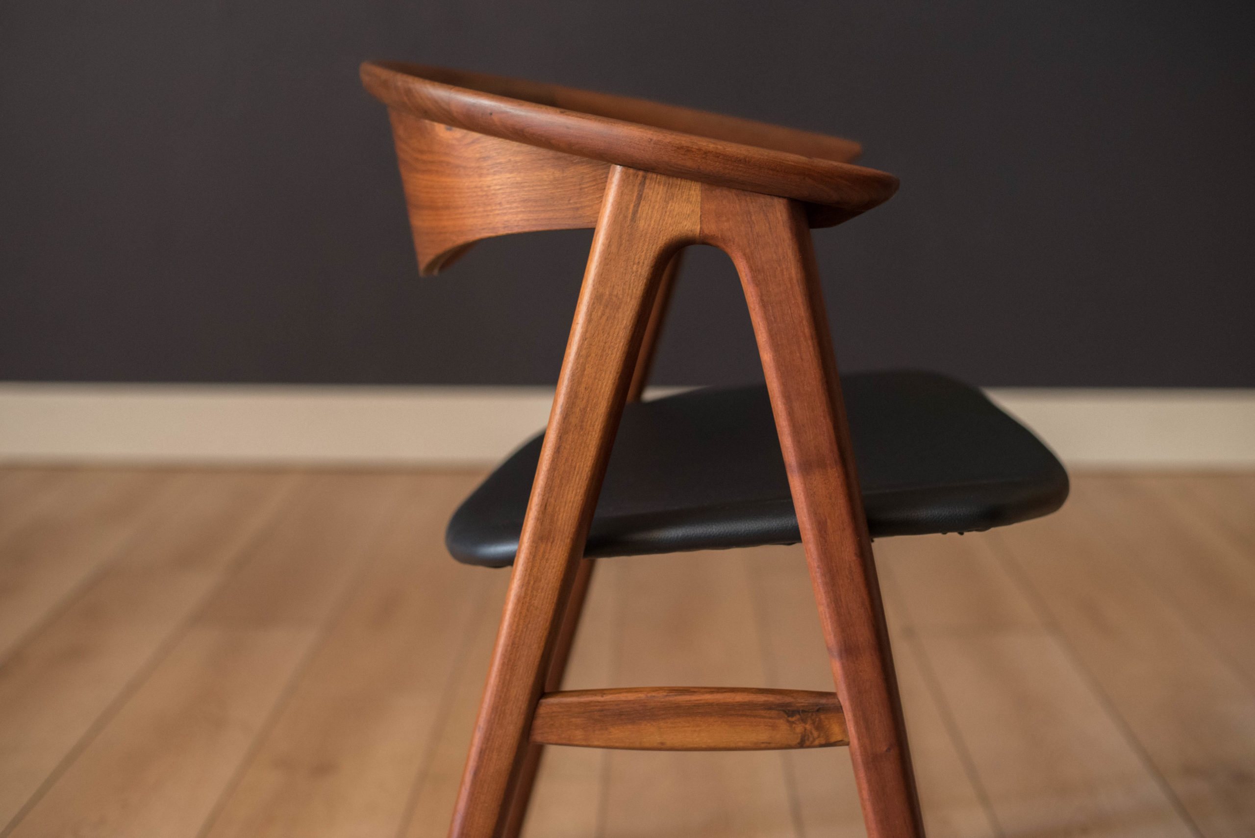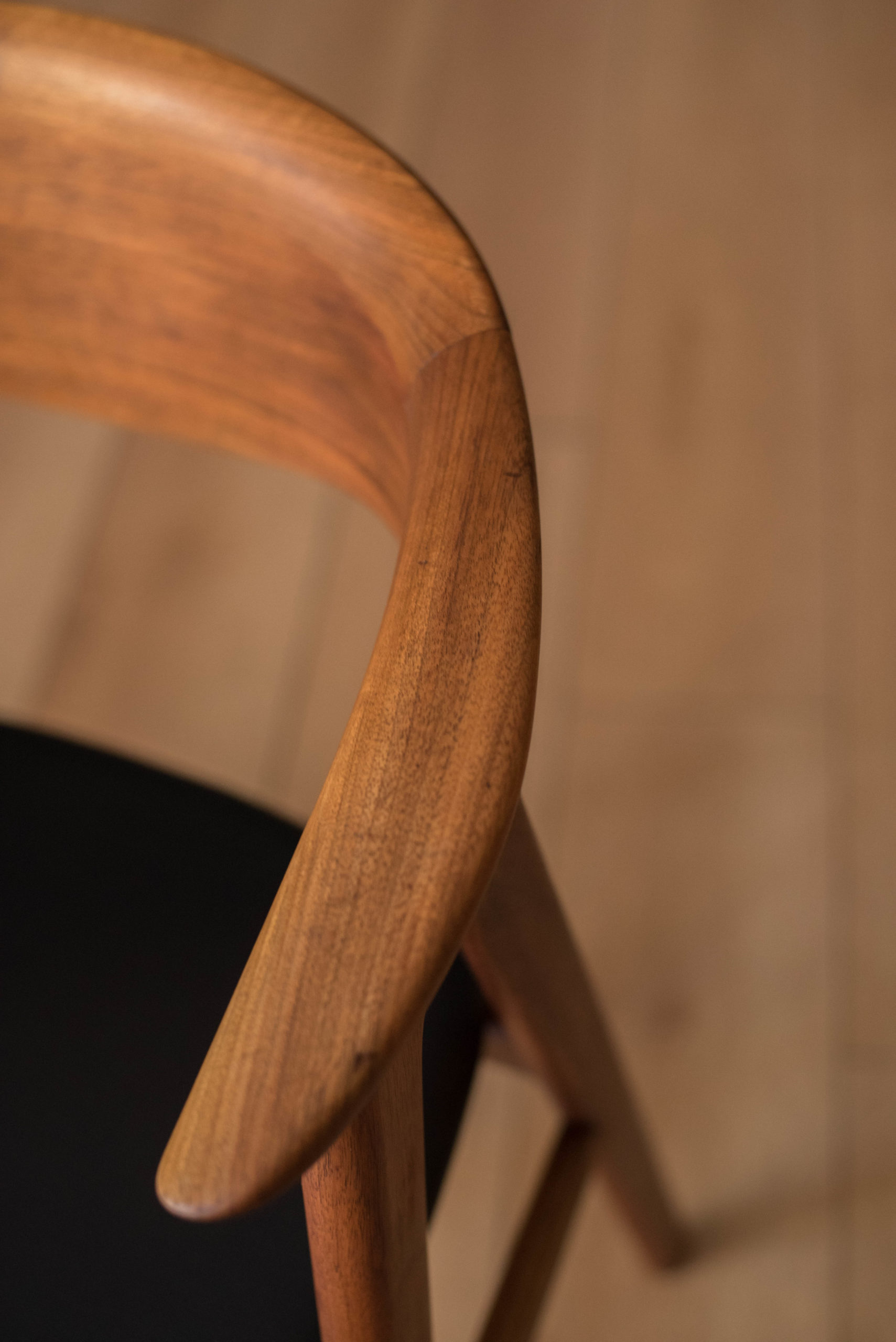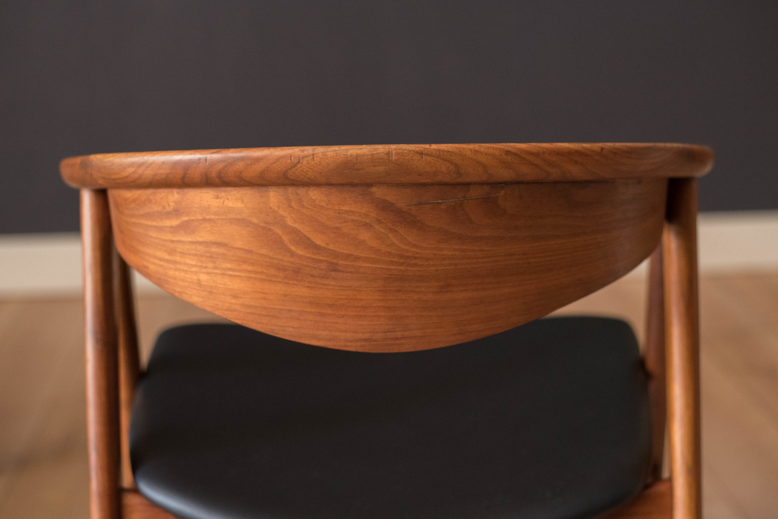 Pair of Mid Century Modern Compass dining chairs in walnut designed by Erik Kirkegaard for Hong Stølefabrik, Denmark model no. 52 imported by Dux. This side chair set features sculpted backrests and the seats have been newly reupholstered in black vinyl. Perfect to use as a captain chair or as a desk armchair in the office. Price is for a set of two.