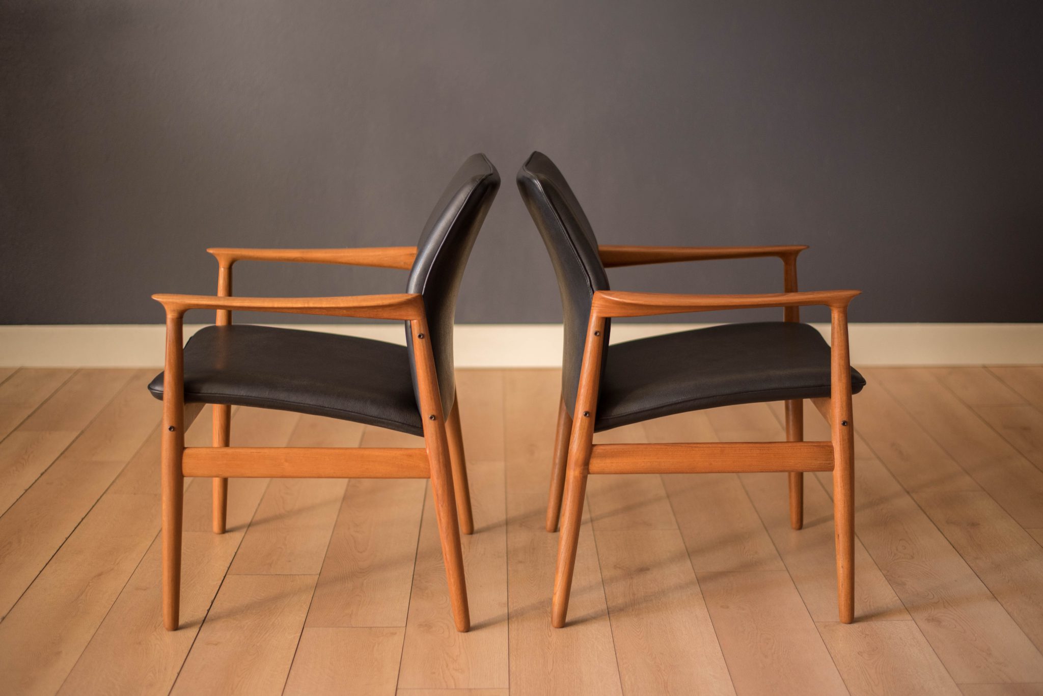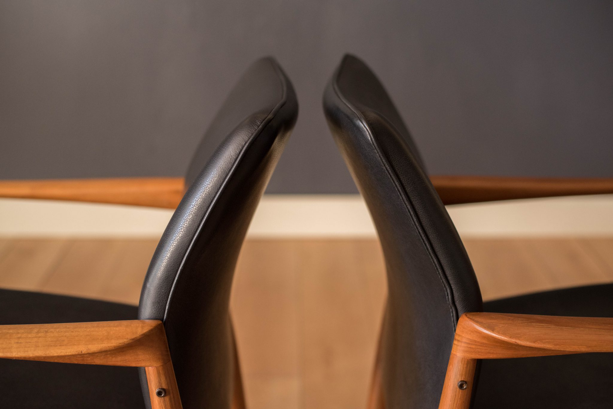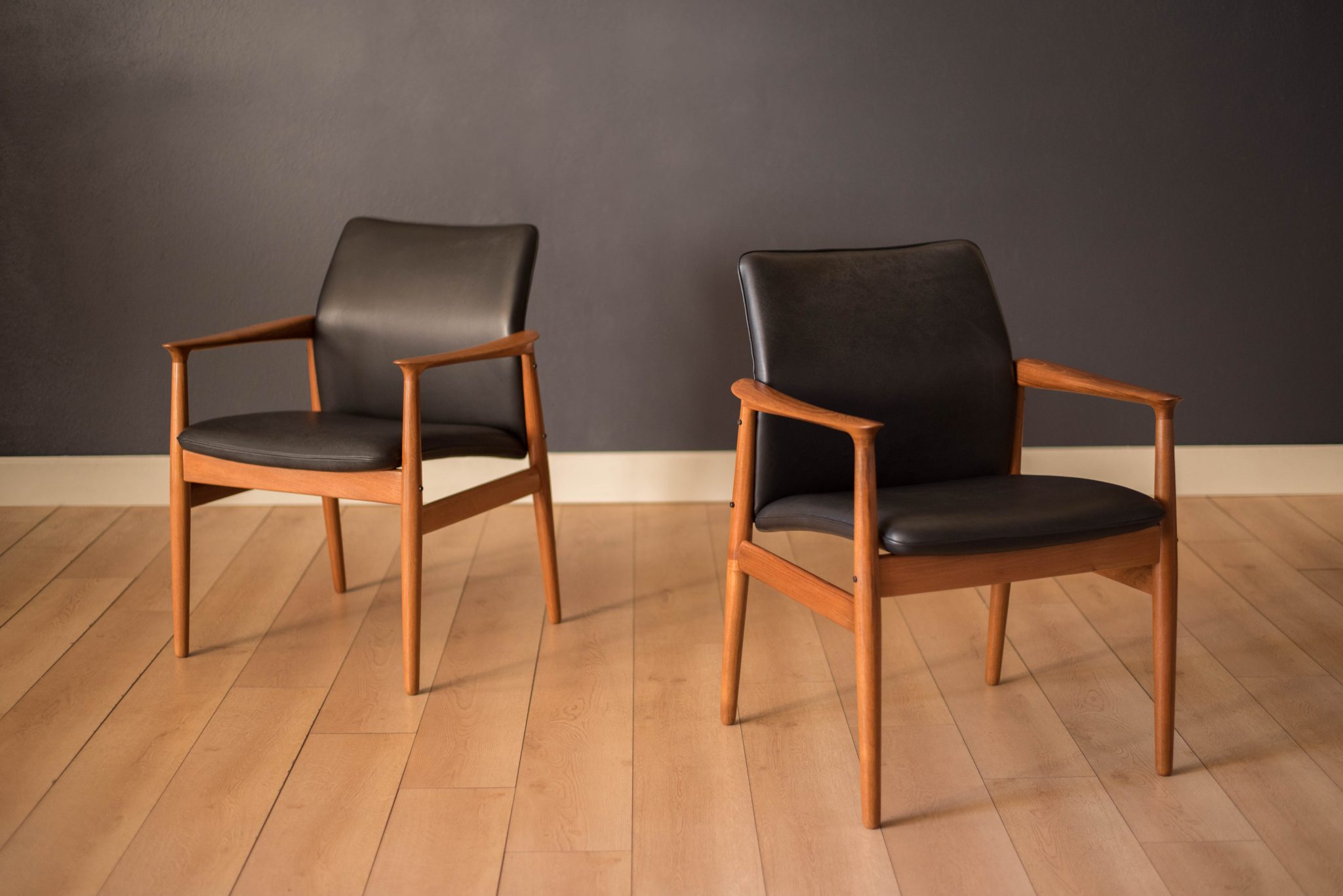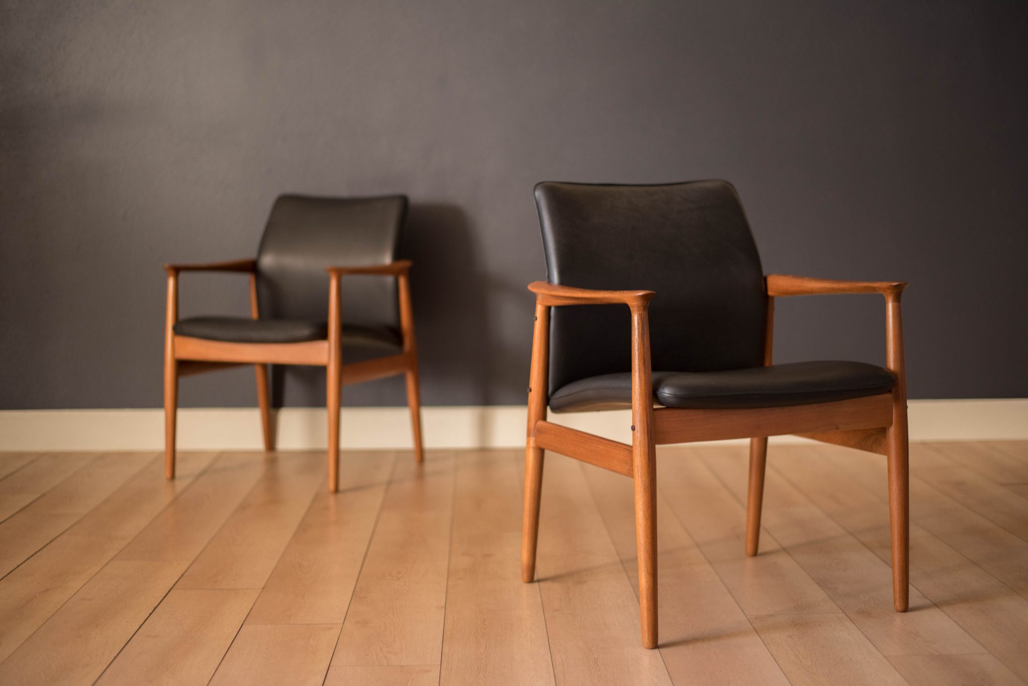 Mid-Century Modern pair of lounge armchairs designed by Grete Jalk for Glostrup Møbelfabrik. This set features sculpted teak arms and a comfortable curved backrest. They have been professionally reupholstered in black leather with brand new foam. Price is for the pair.