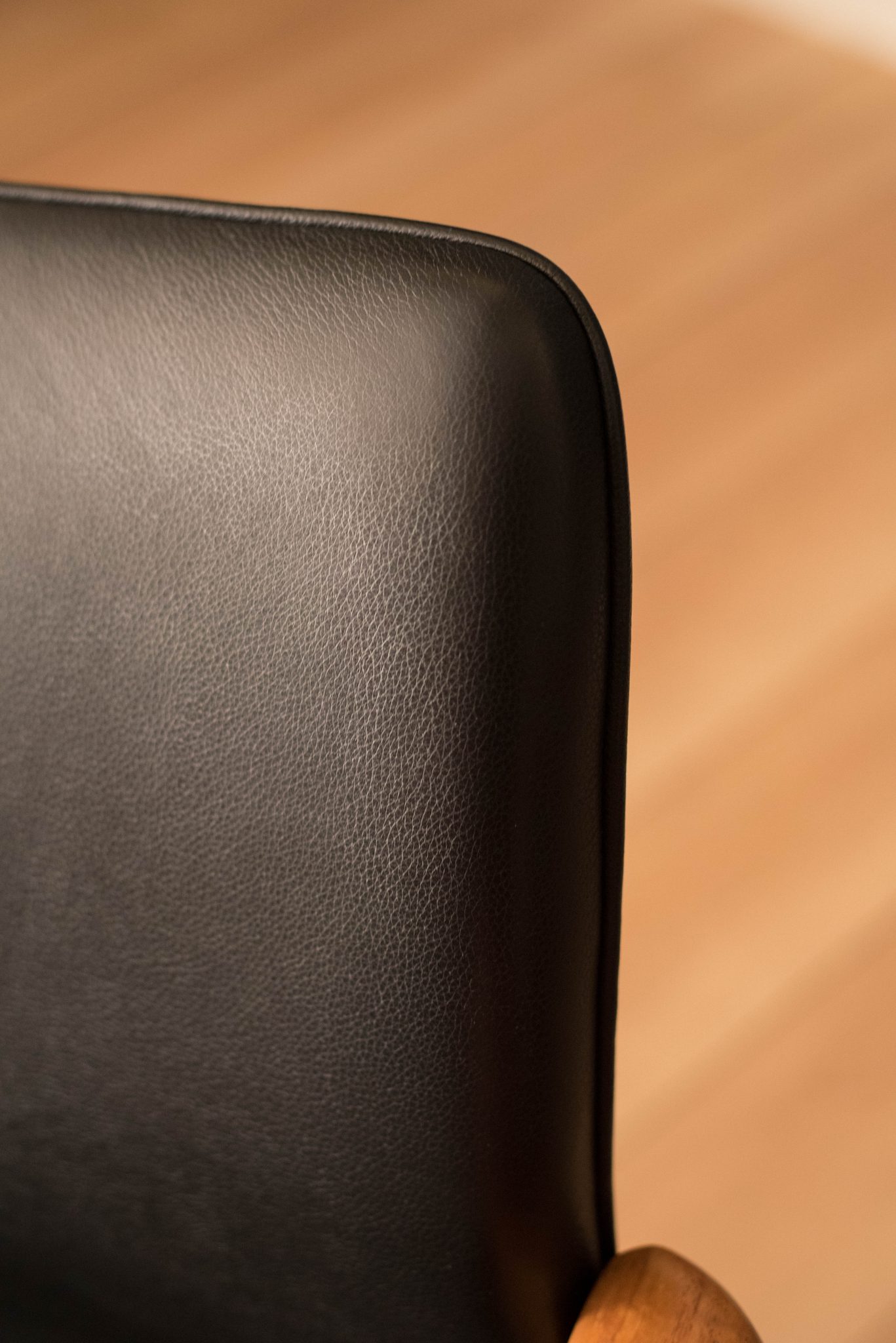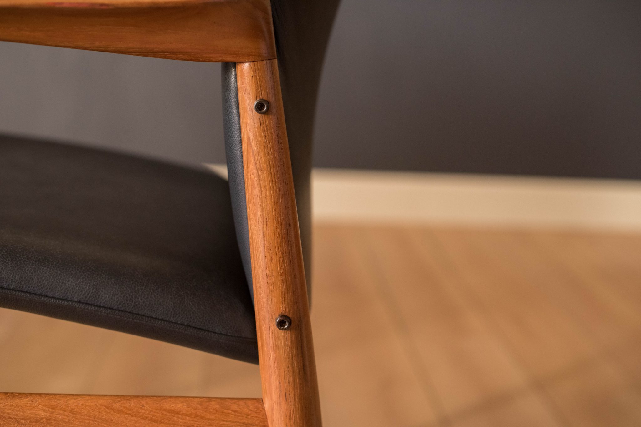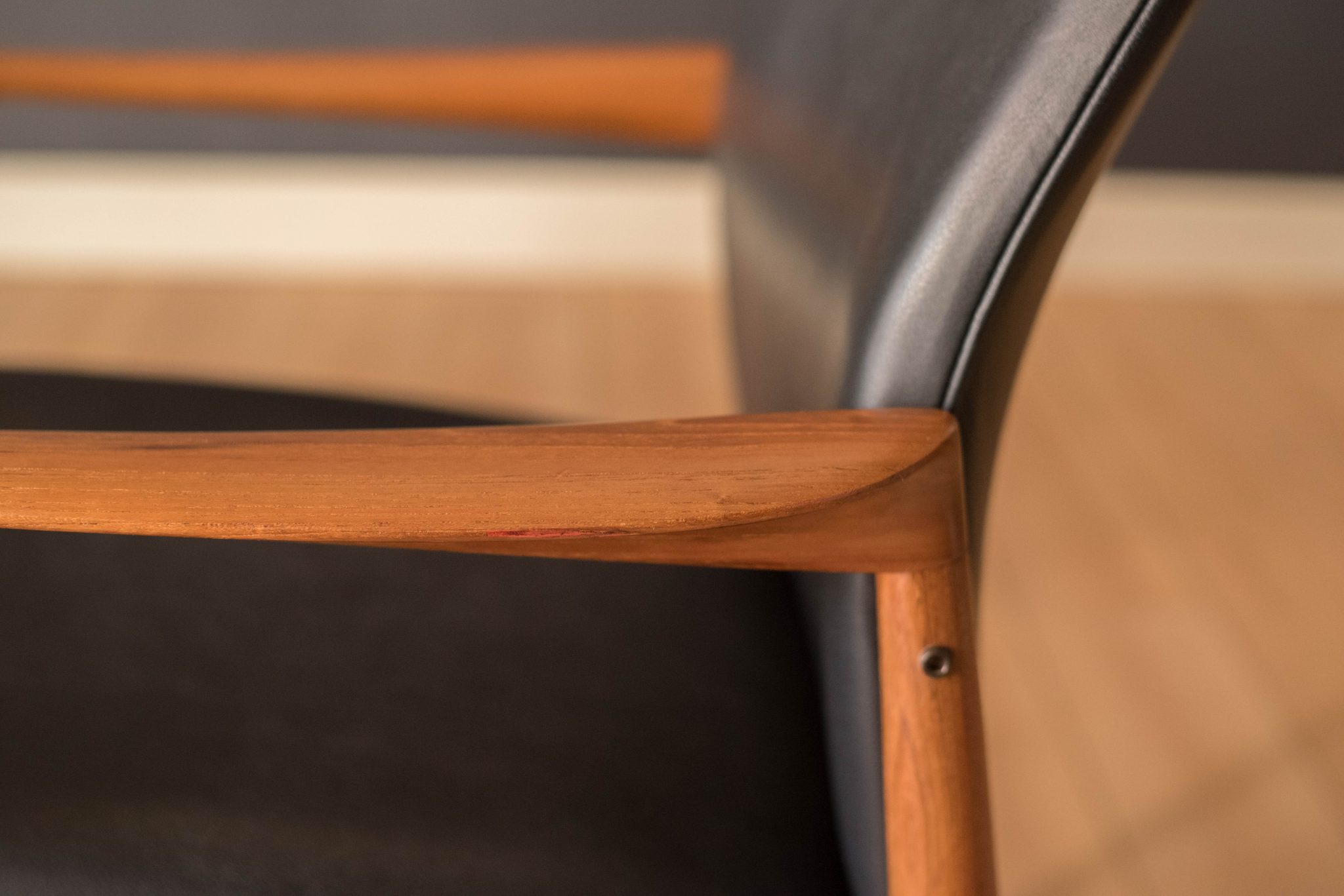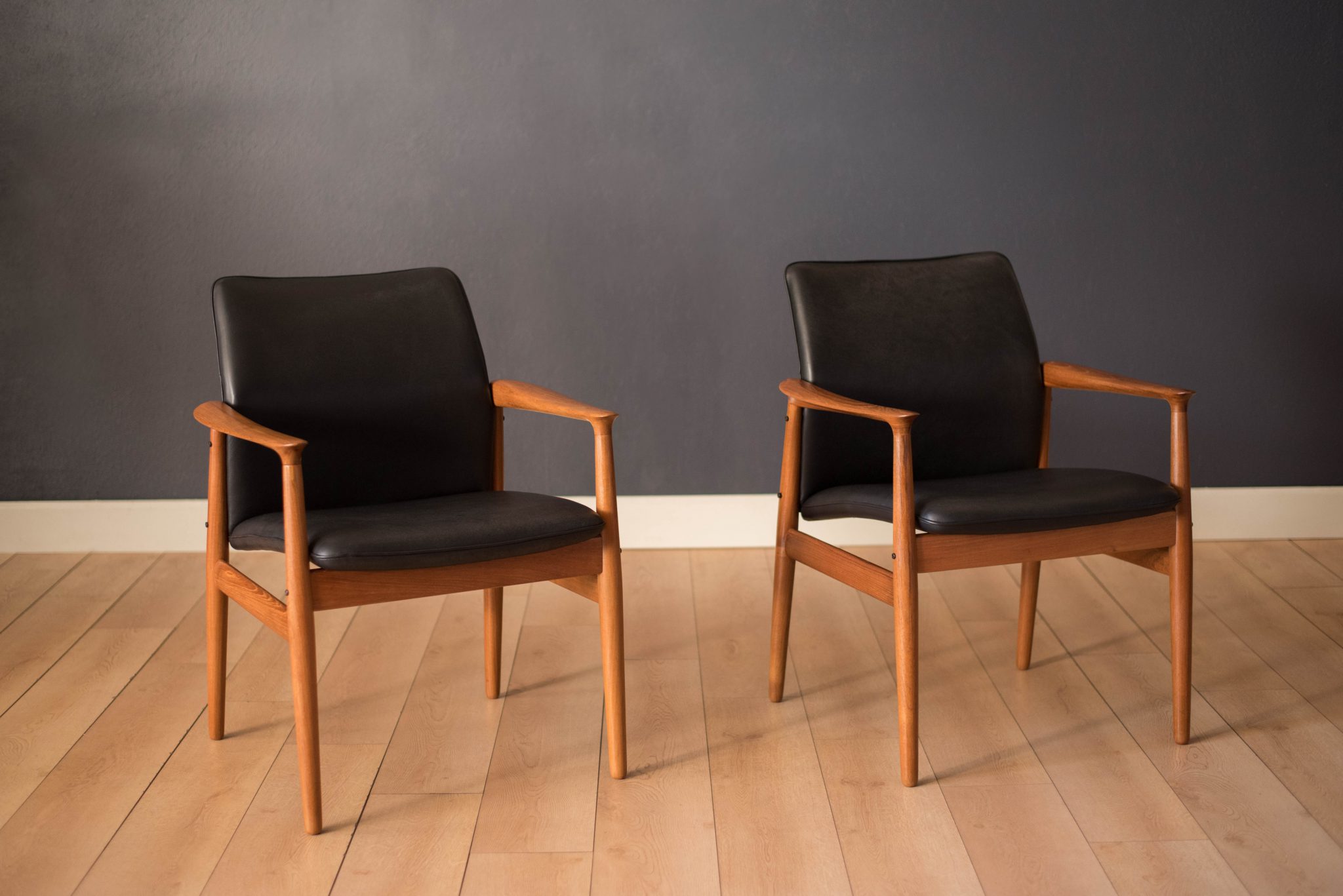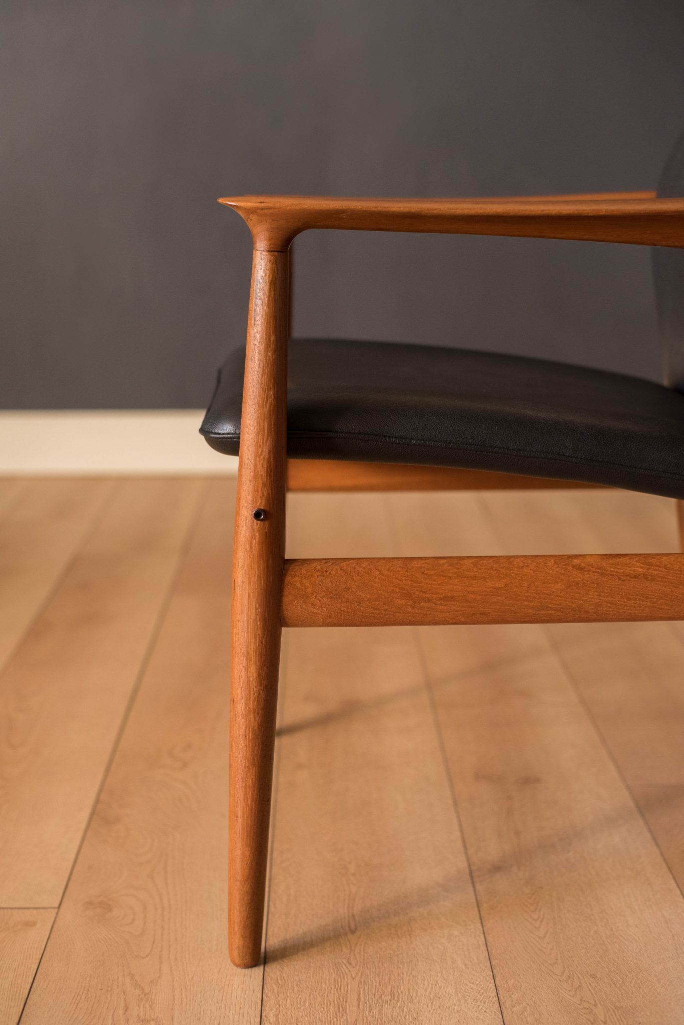 Mid-Century Modern pair of lounge armchairs designed by Grete Jalk for Glostrup Møbelfabrik. This set features sculpted teak arms and a comfortable curved backrest. They have been professionally reupholstered in black leather with brand new foam. Price is for the pair.