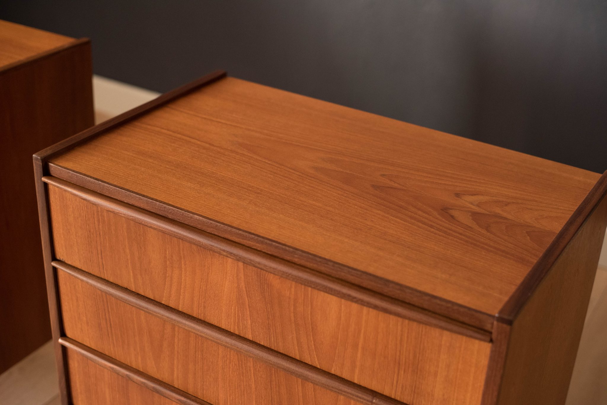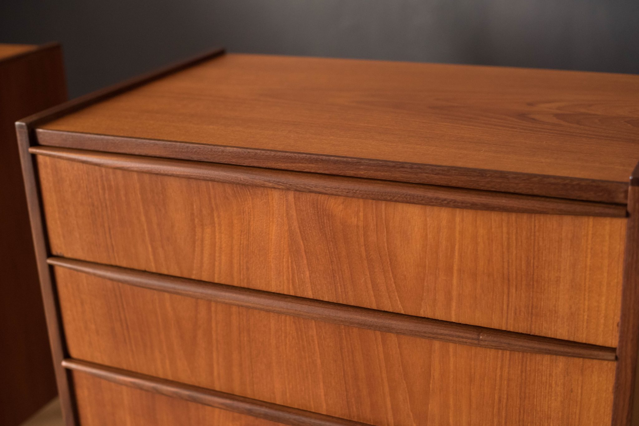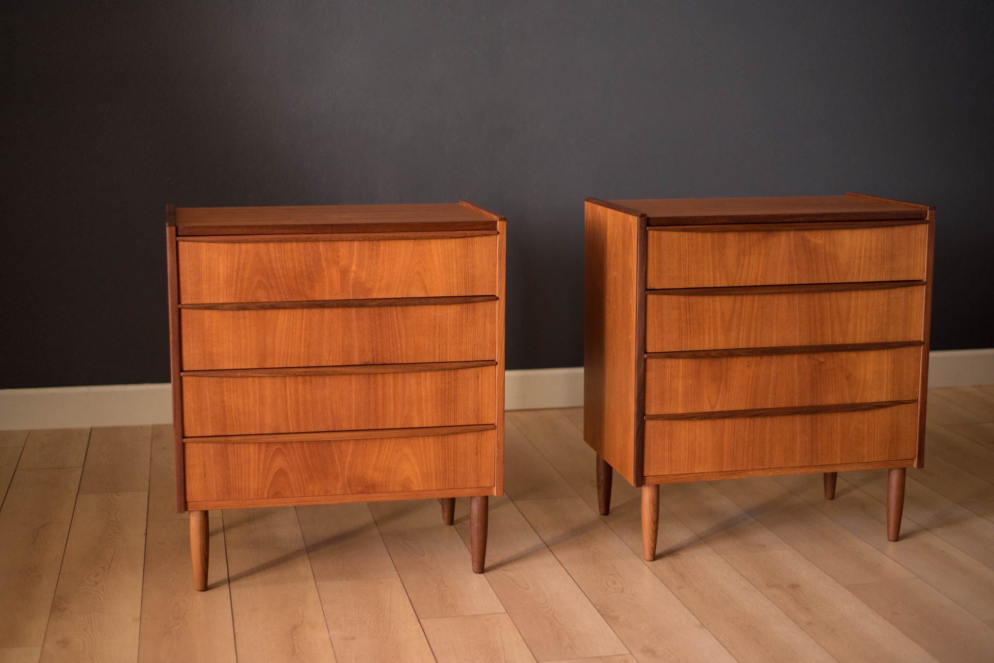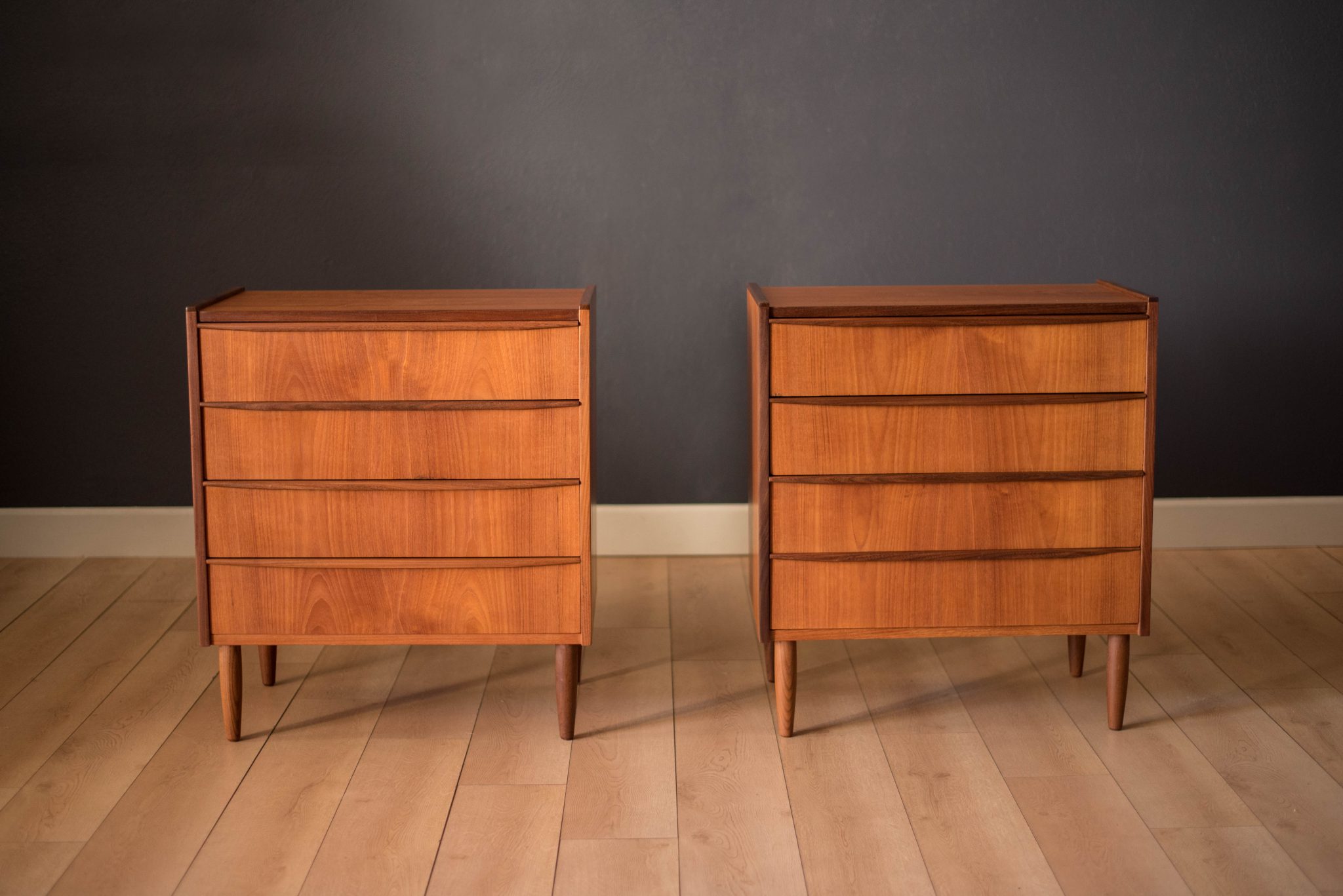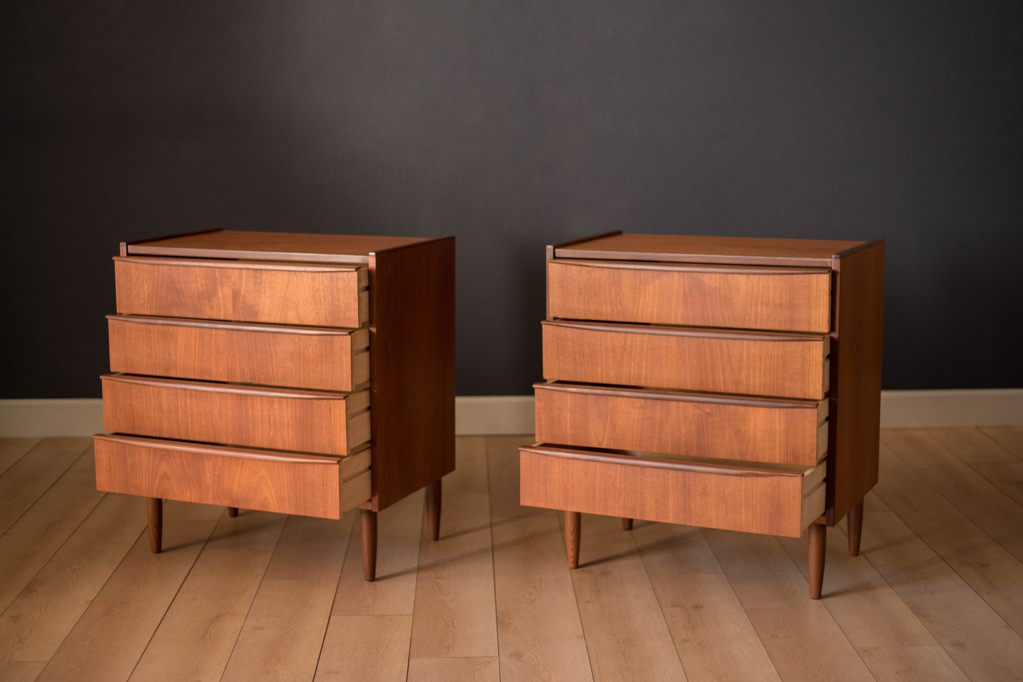 Mid century modern pair of dresser chests in teak marked made in Denmark. Each dresser includes four drawers with sculpted handles and dovetailed construction. Price is for the pair.