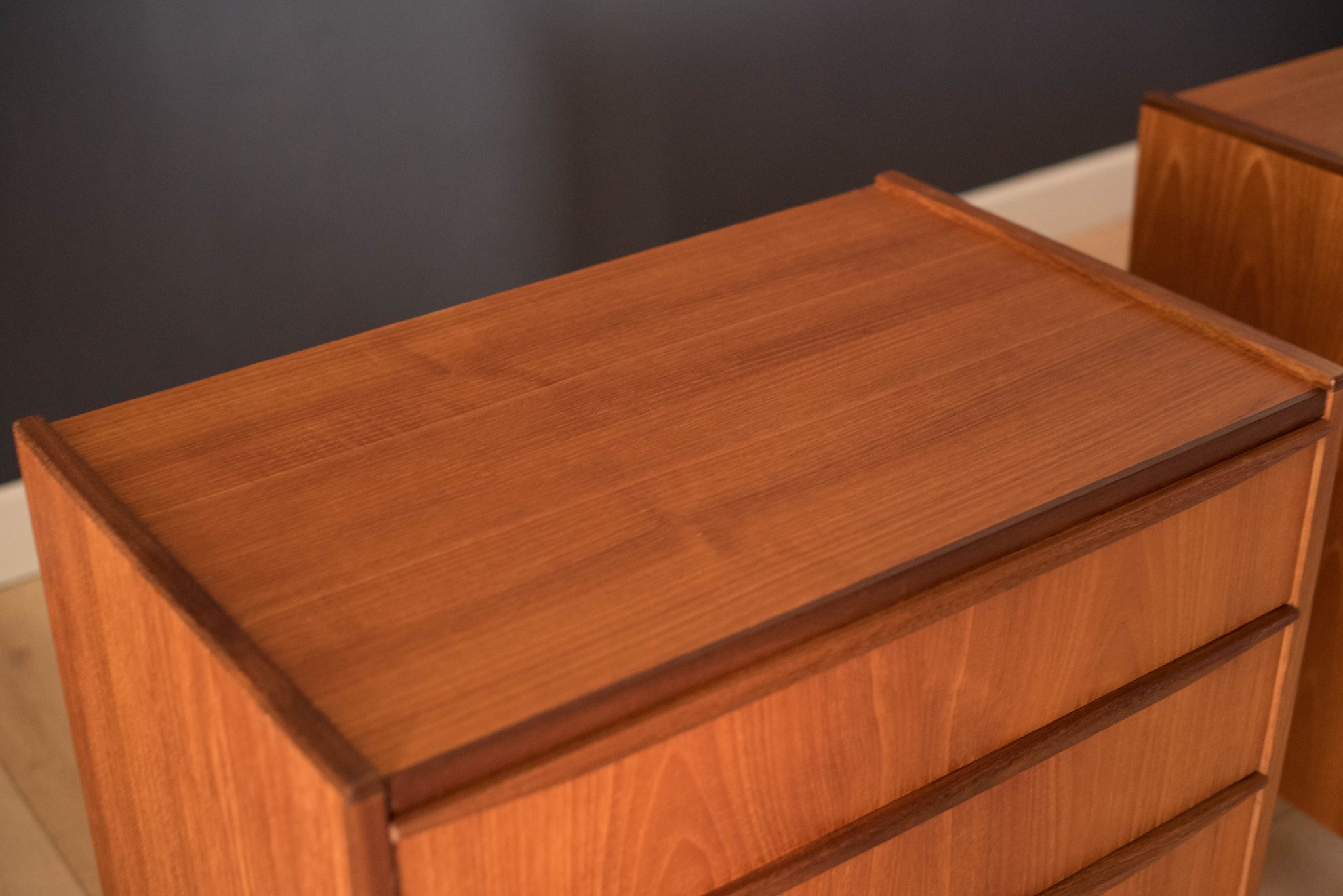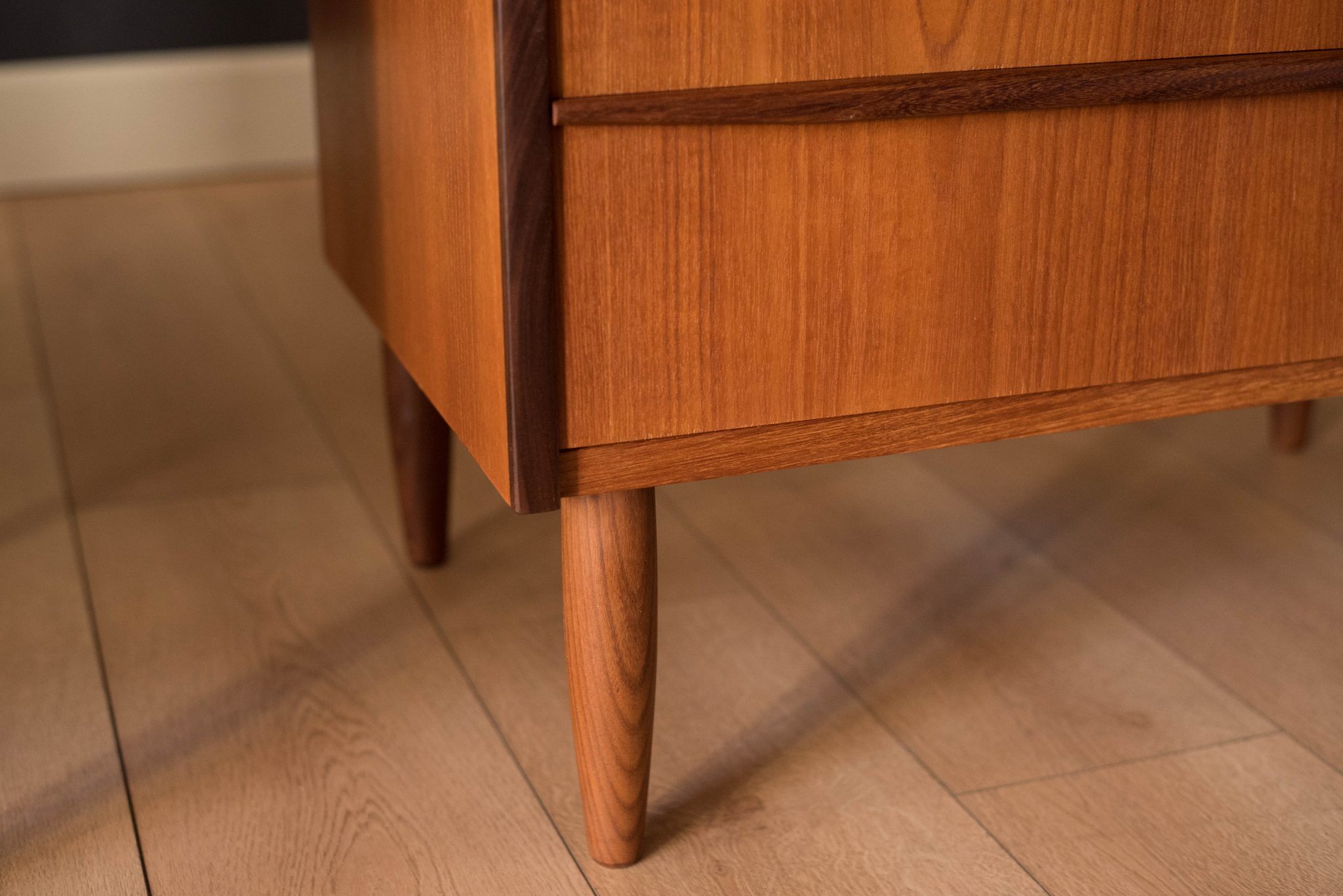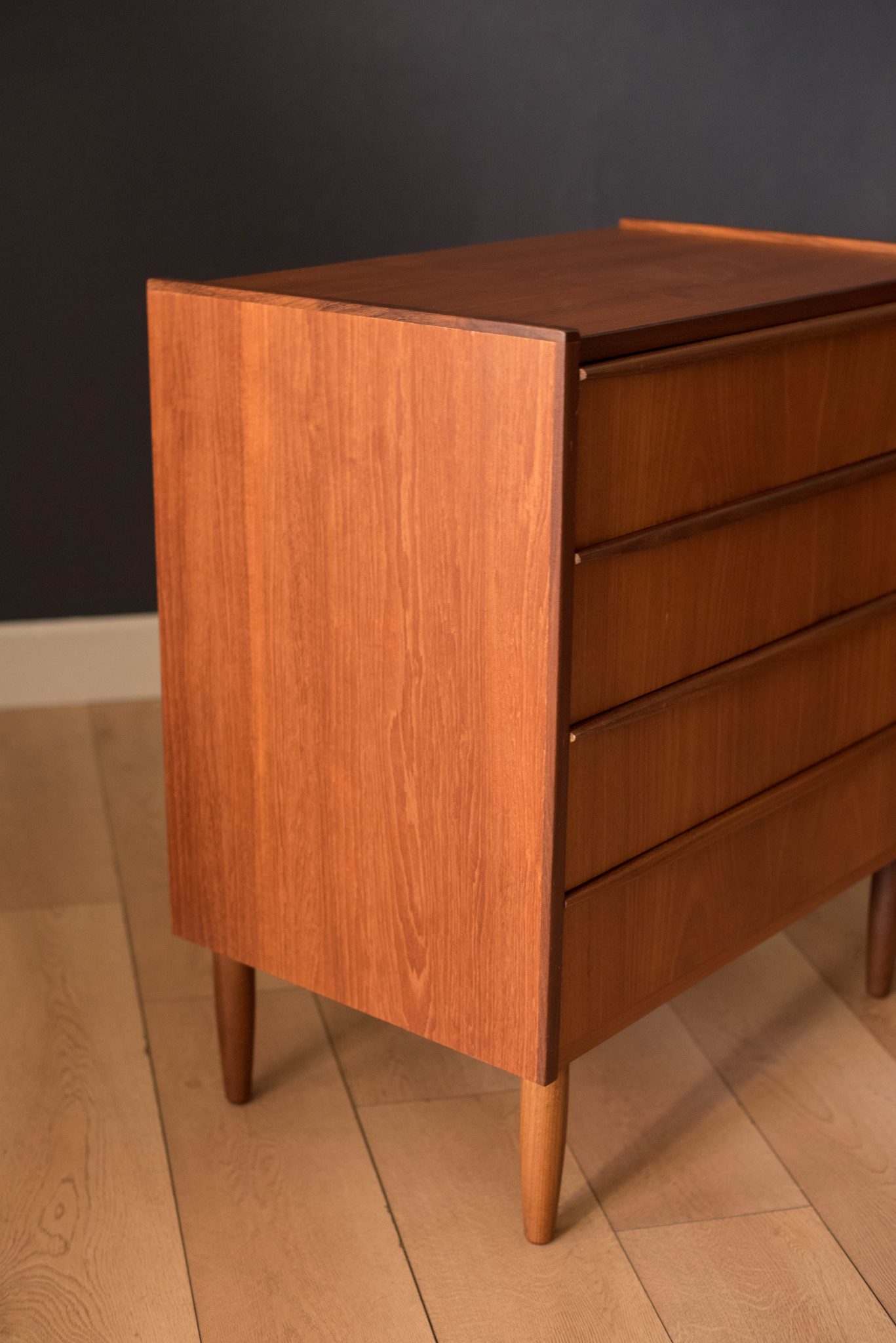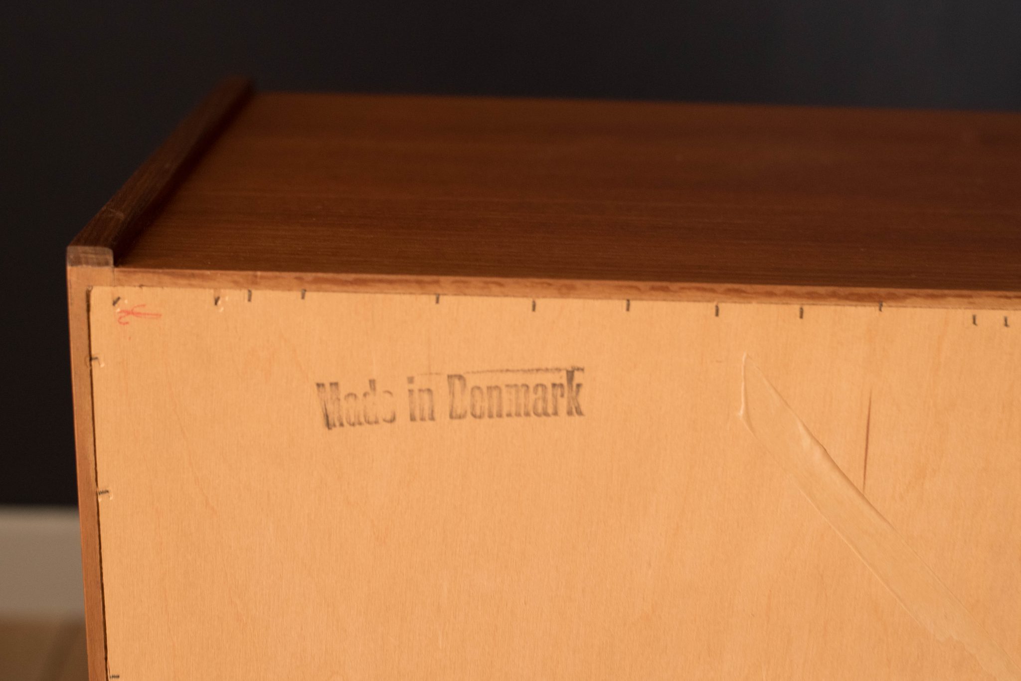 Mid century modern pair of dresser chests in teak marked made in Denmark. Each dresser includes four drawers with sculpted handles and dovetailed construction. Price is for the pair.