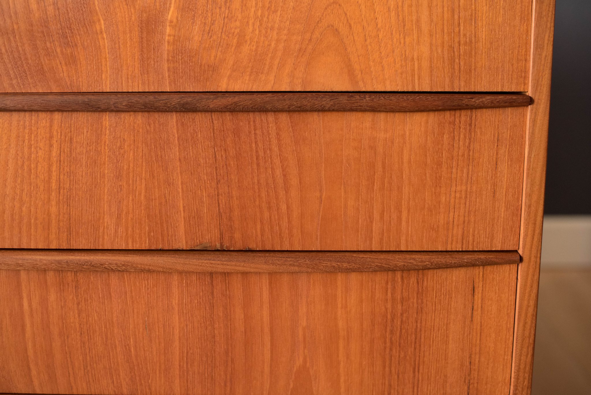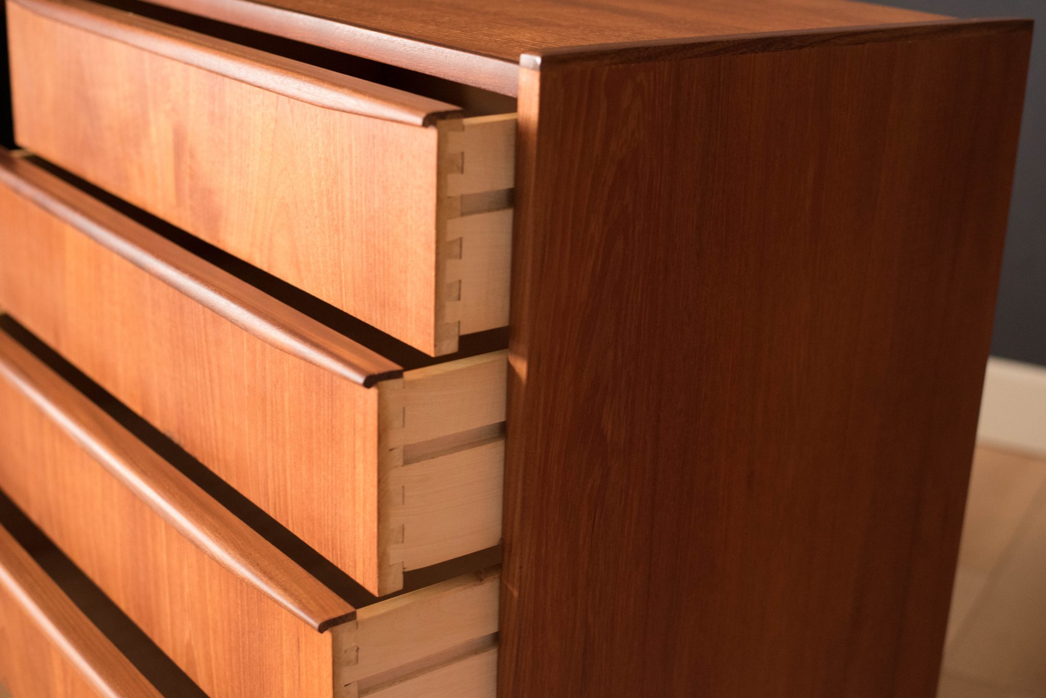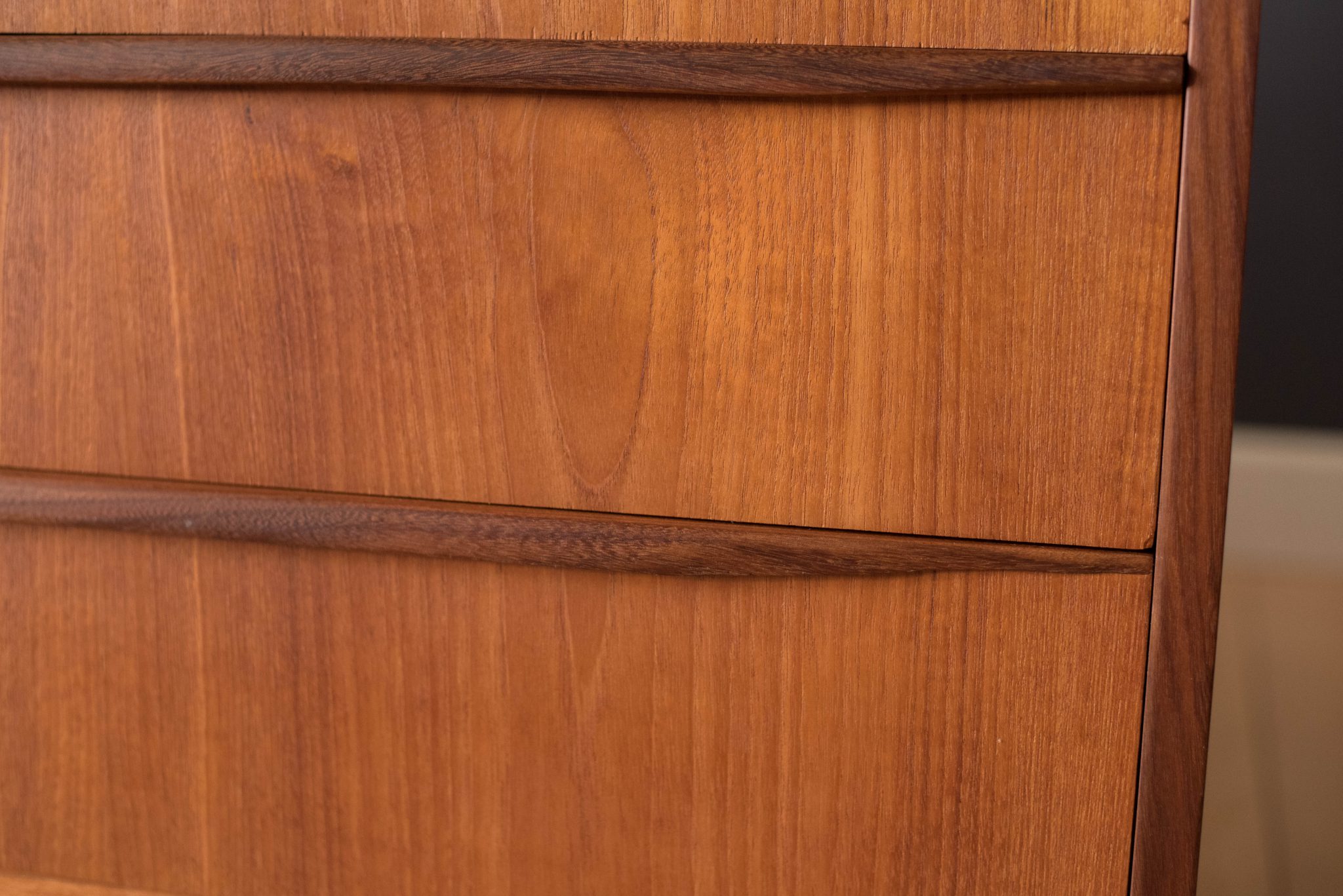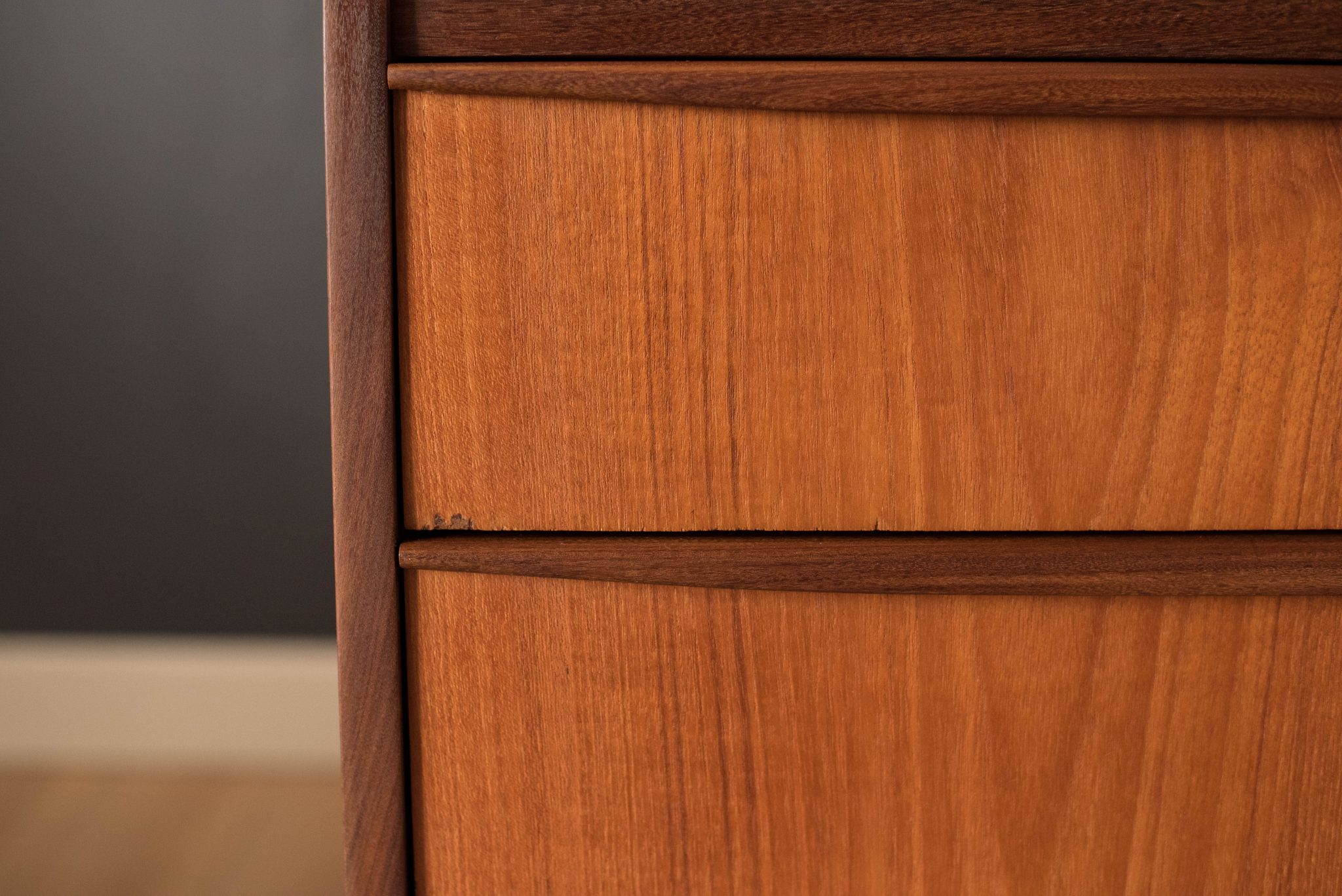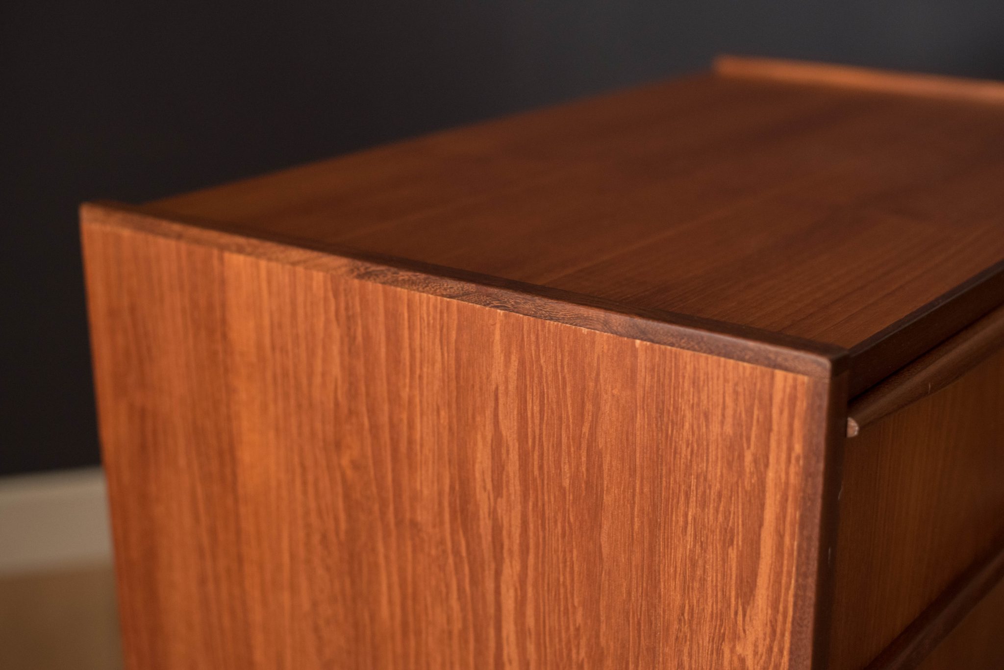 Mid century modern pair of dresser chests in teak marked made in Denmark. Each dresser includes four drawers with sculpted handles and dovetailed construction. Price is for the pair.