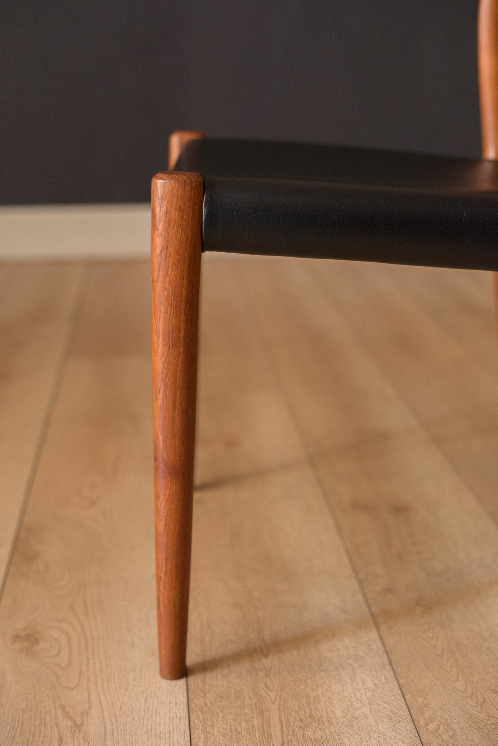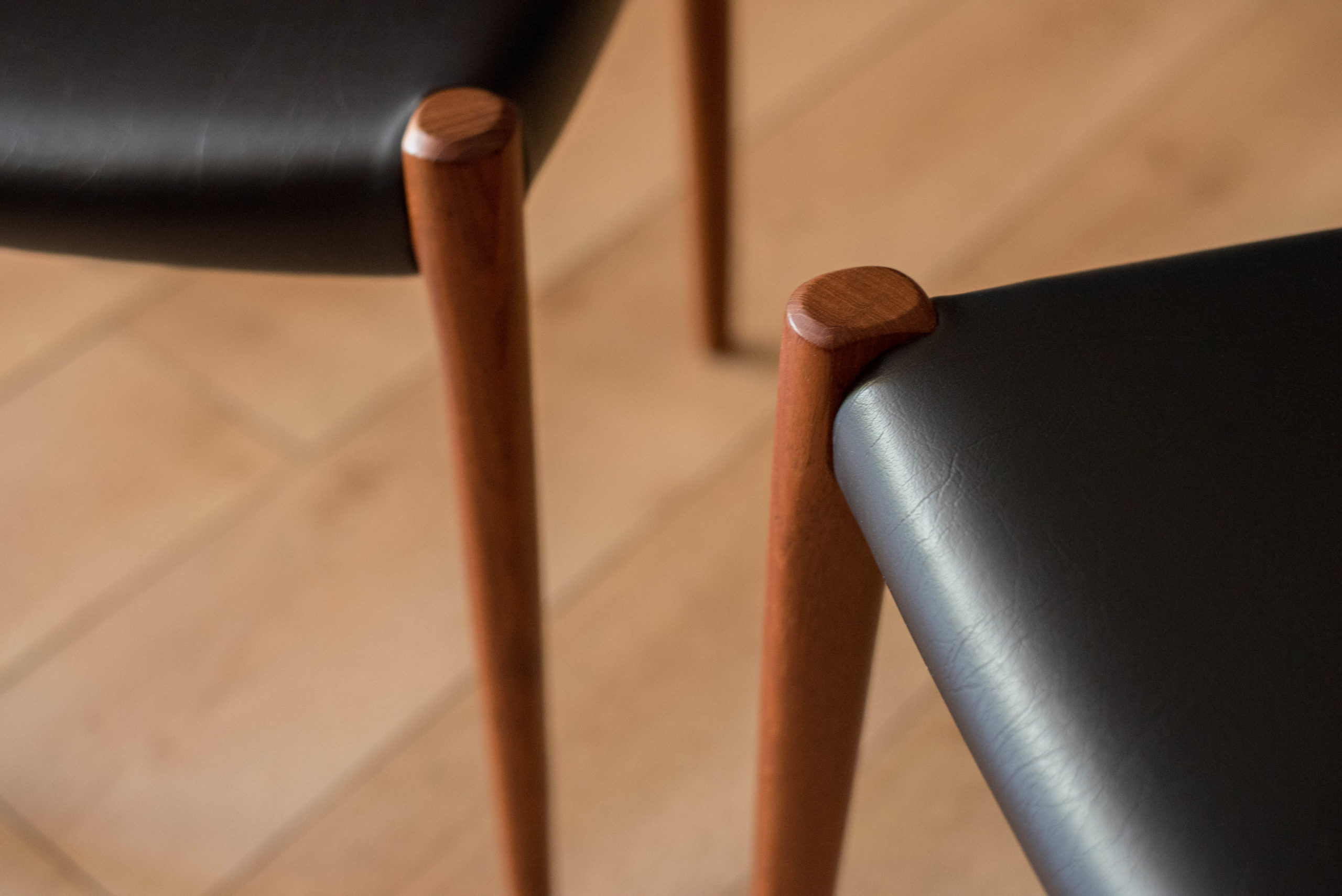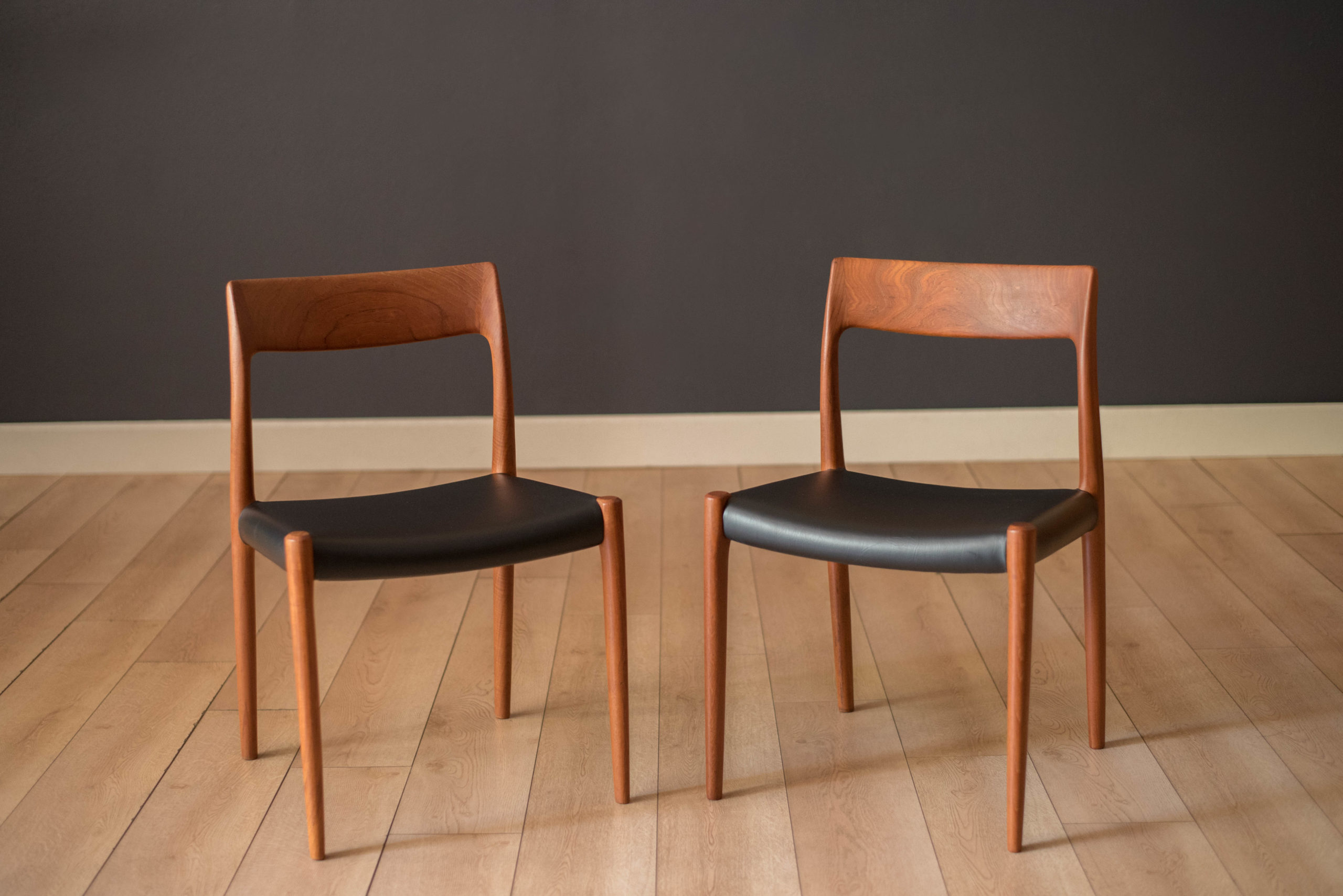 Pair of Mid-Century Modern dining chairs designed by Niels Otto Møller for J.L. Møller Møbelfabrik, Denmark. Features sculpted teak frames and seats have been professionally reupholstered in black vinyl. Price includes the set of two.