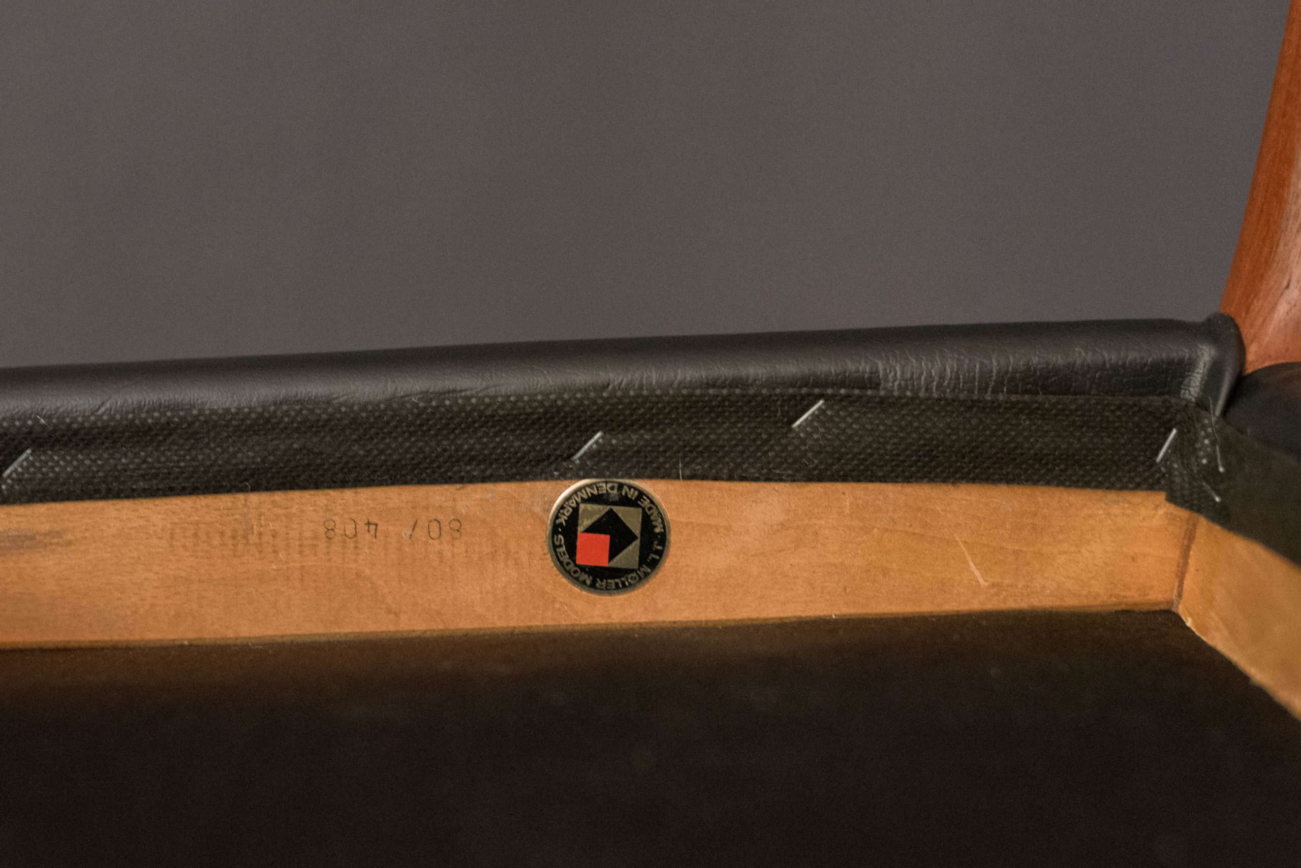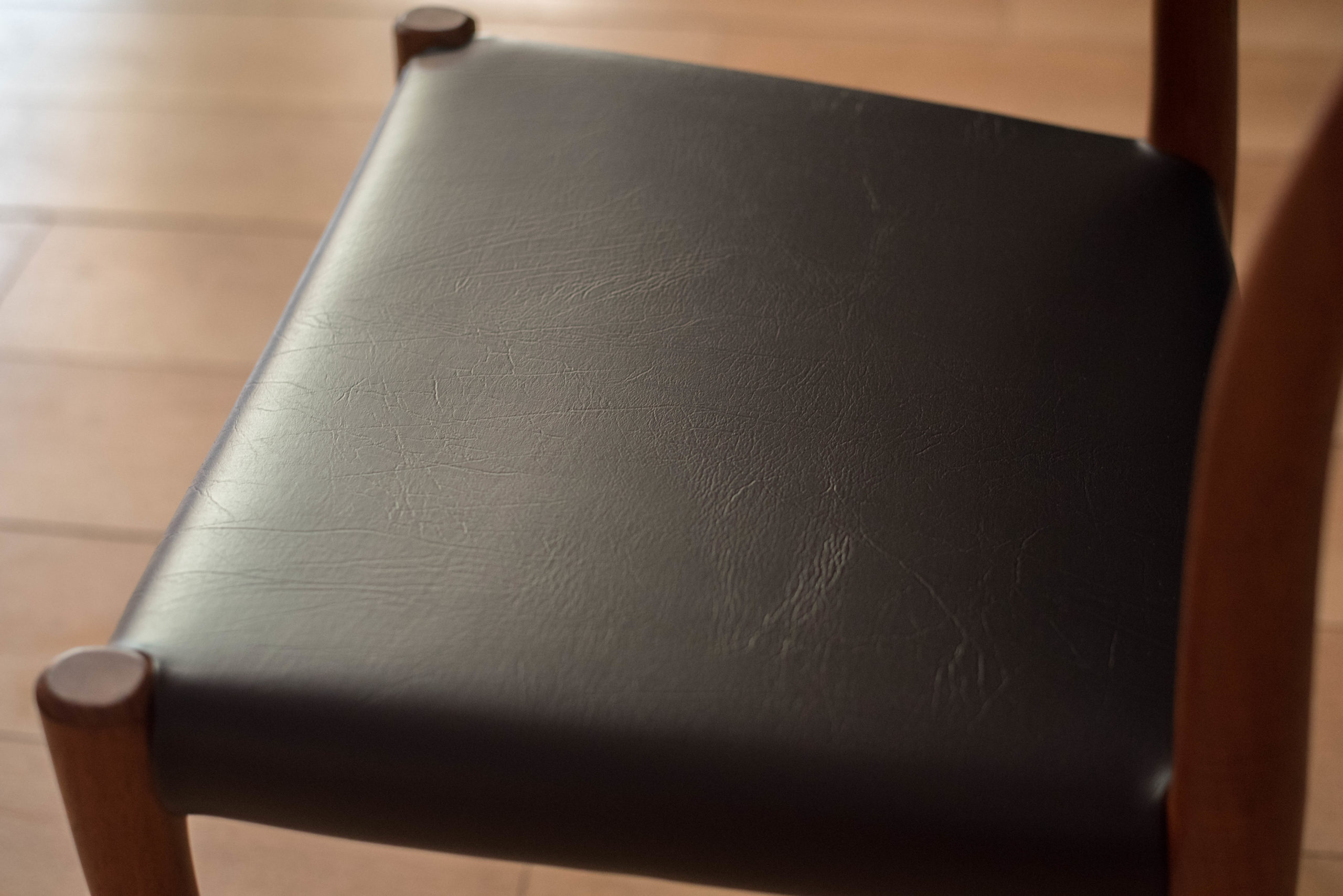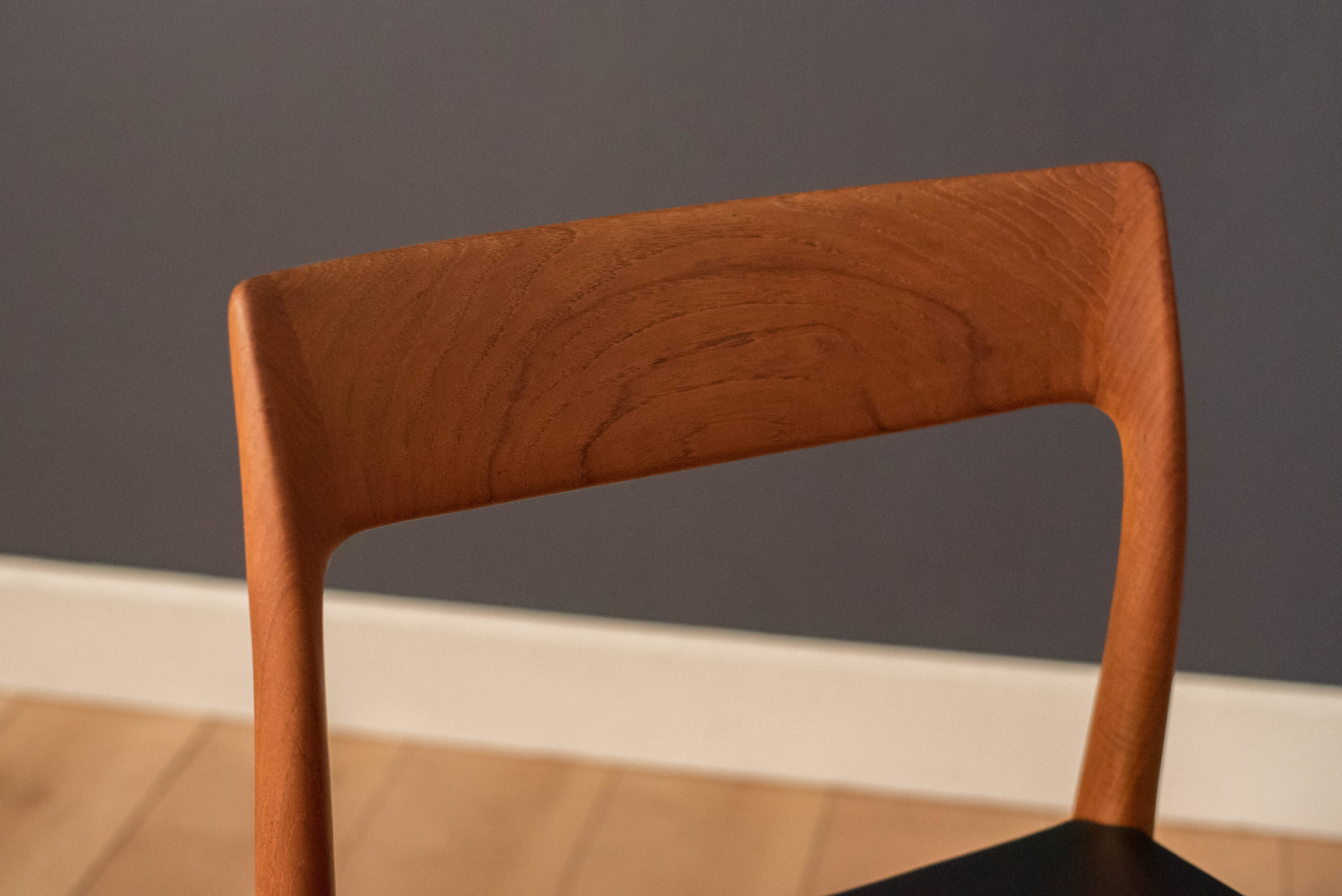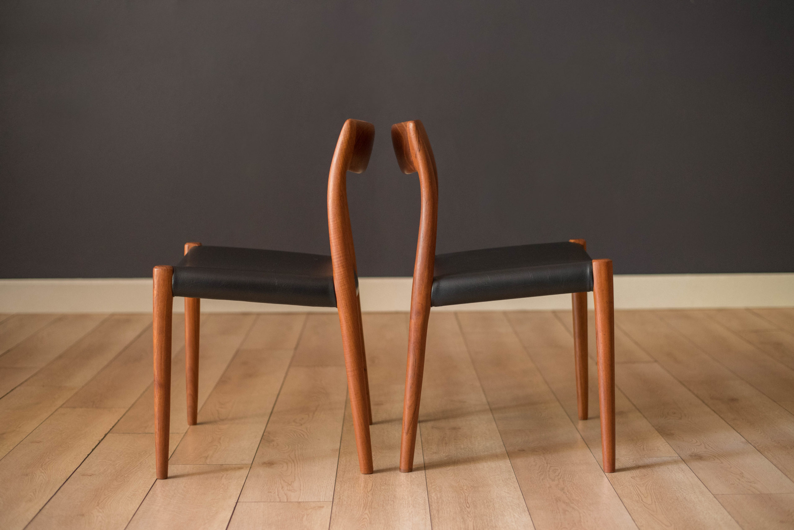 Pair of Mid-Century Modern dining chairs designed by Niels Otto Møller for J.L. Møller Møbelfabrik, Denmark. Features sculpted teak frames and seats have been professionally reupholstered in black vinyl. Price includes the set of two.