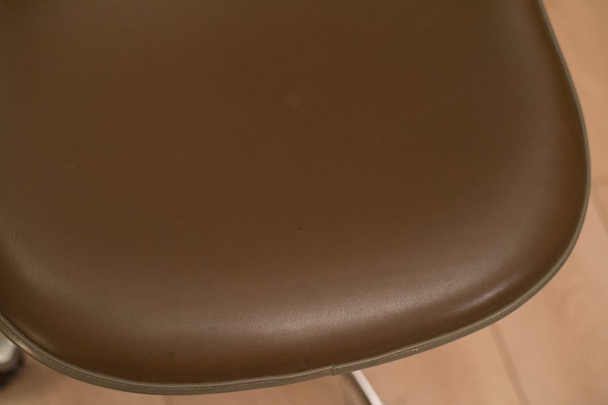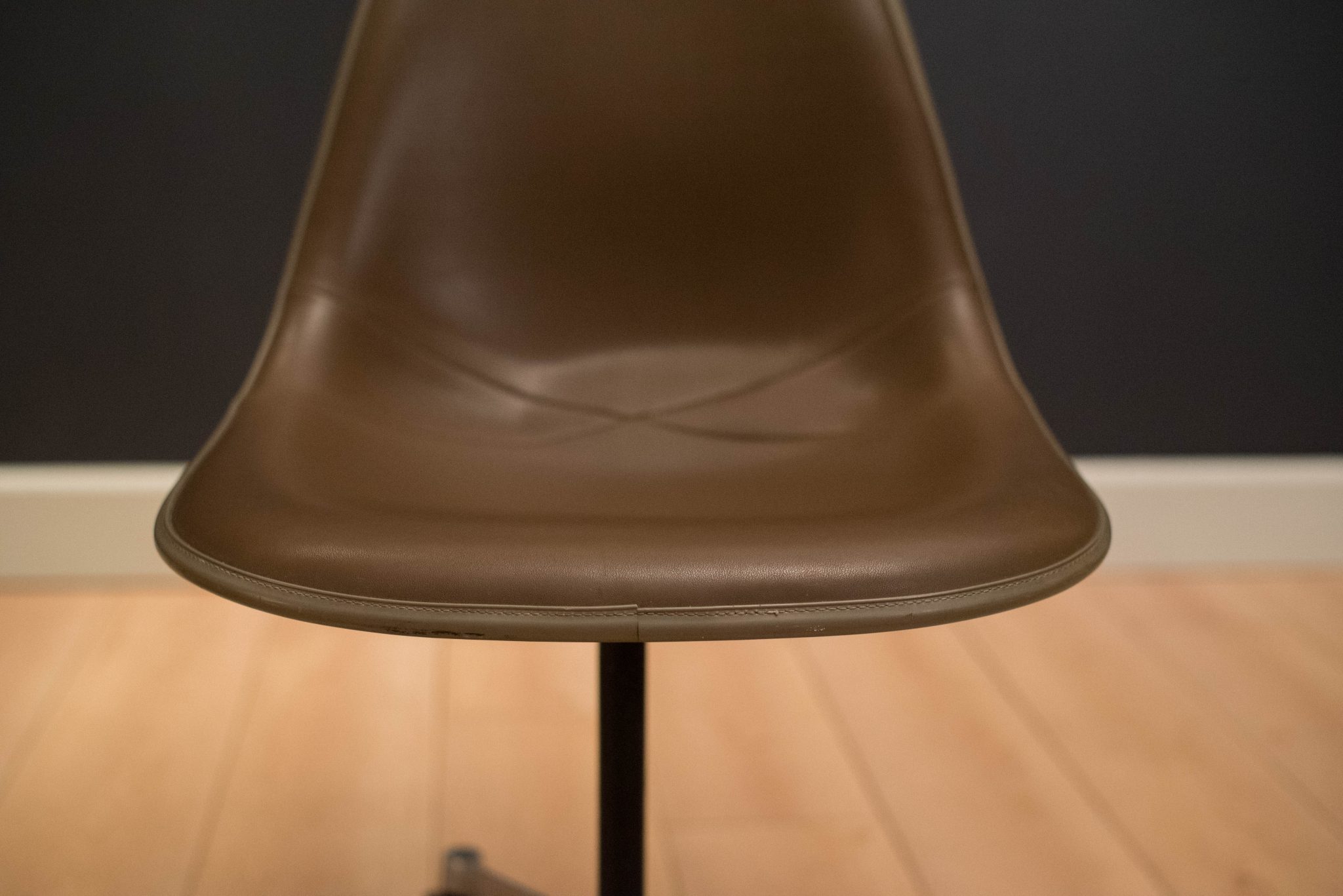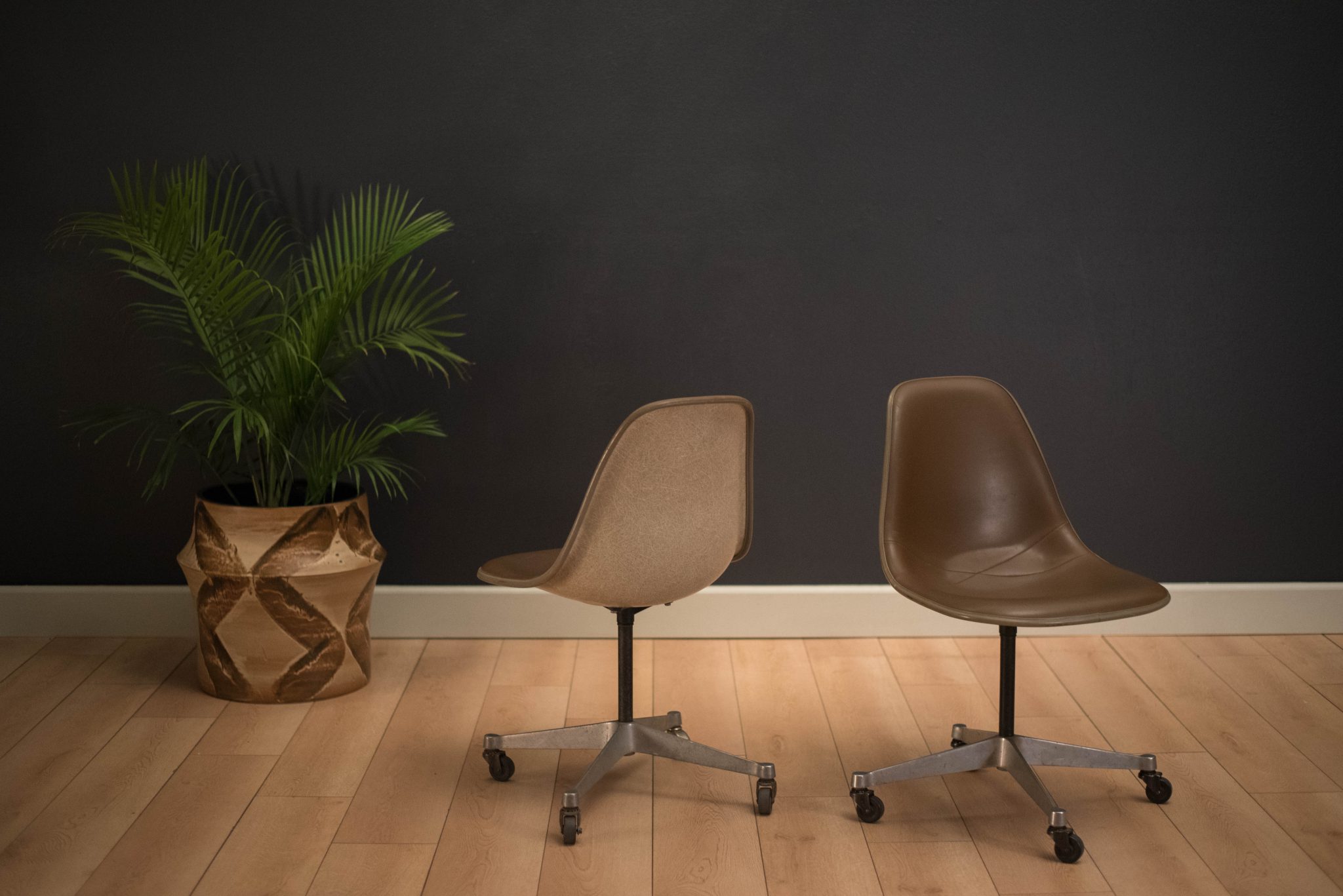 Mid-Century Modern office shell chairs designed by Ray and Charles Eames for Herman Miller. This set includes the original brown vinyl padded seat with aluminum swivel base on rolling casters. Price is per chair.