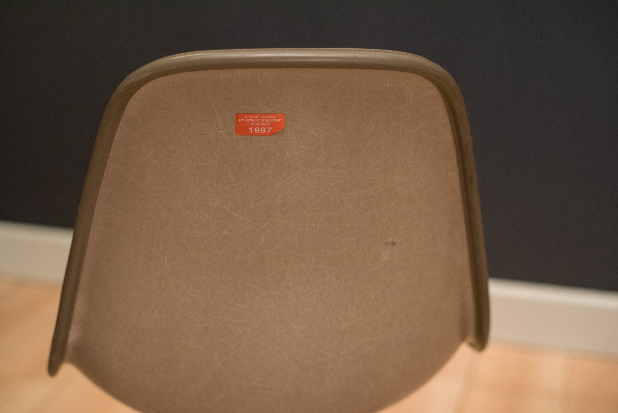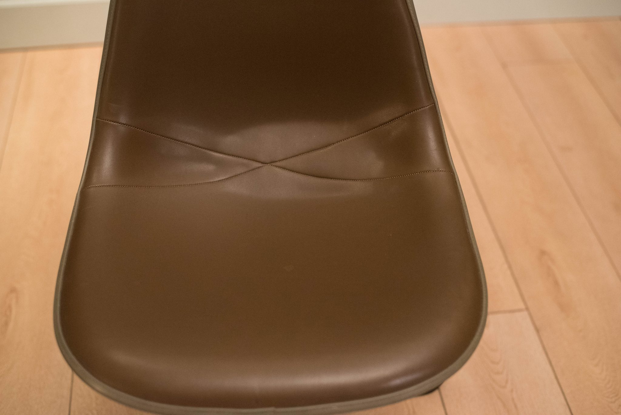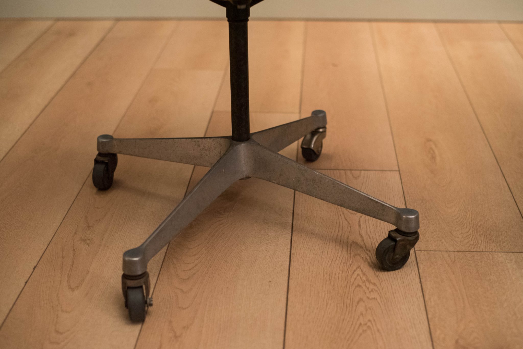 Mid-Century Modern office shell chairs designed by Ray and Charles Eames for Herman Miller. This set includes the original brown vinyl padded seat with aluminum swivel base on rolling casters. Price is per chair.