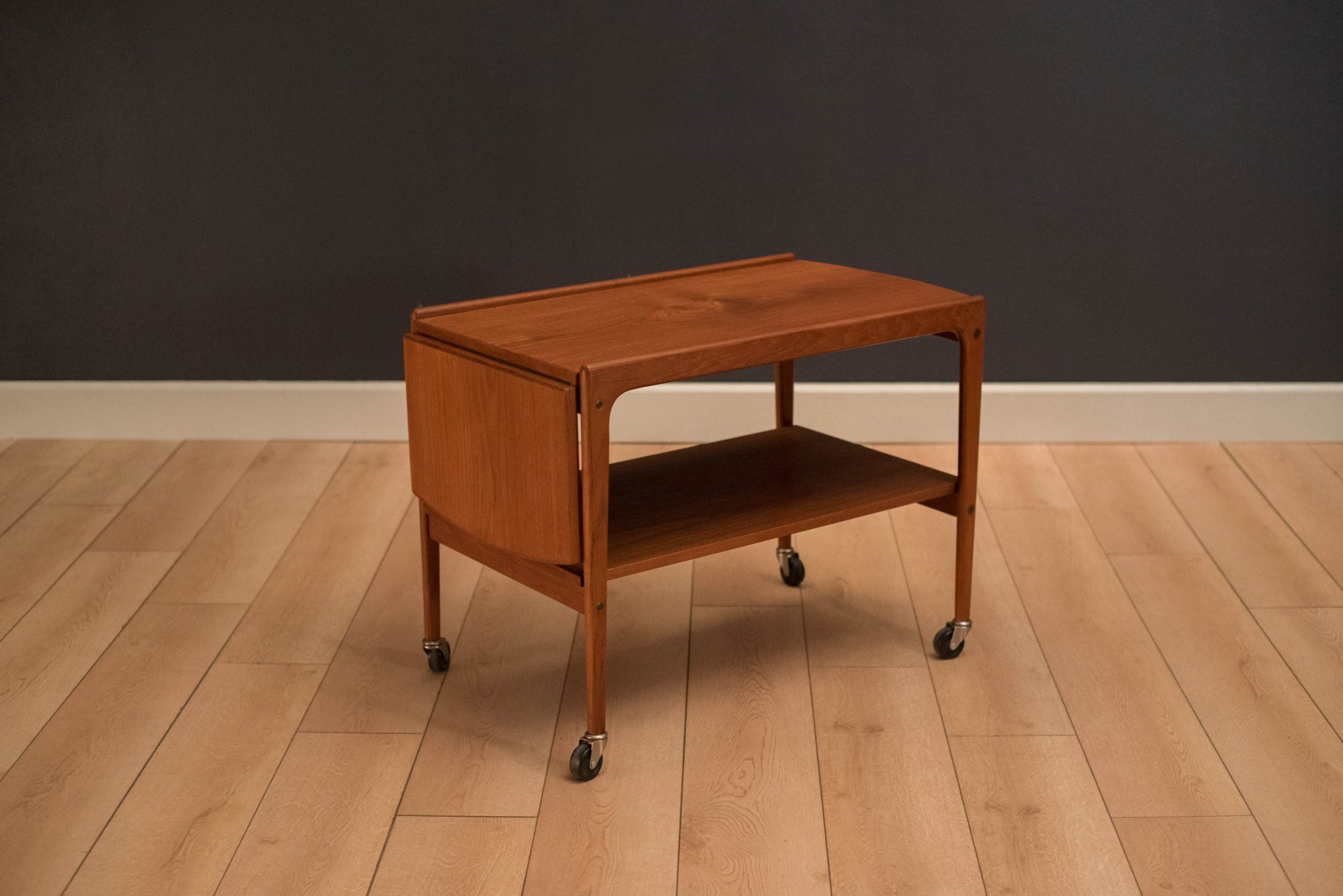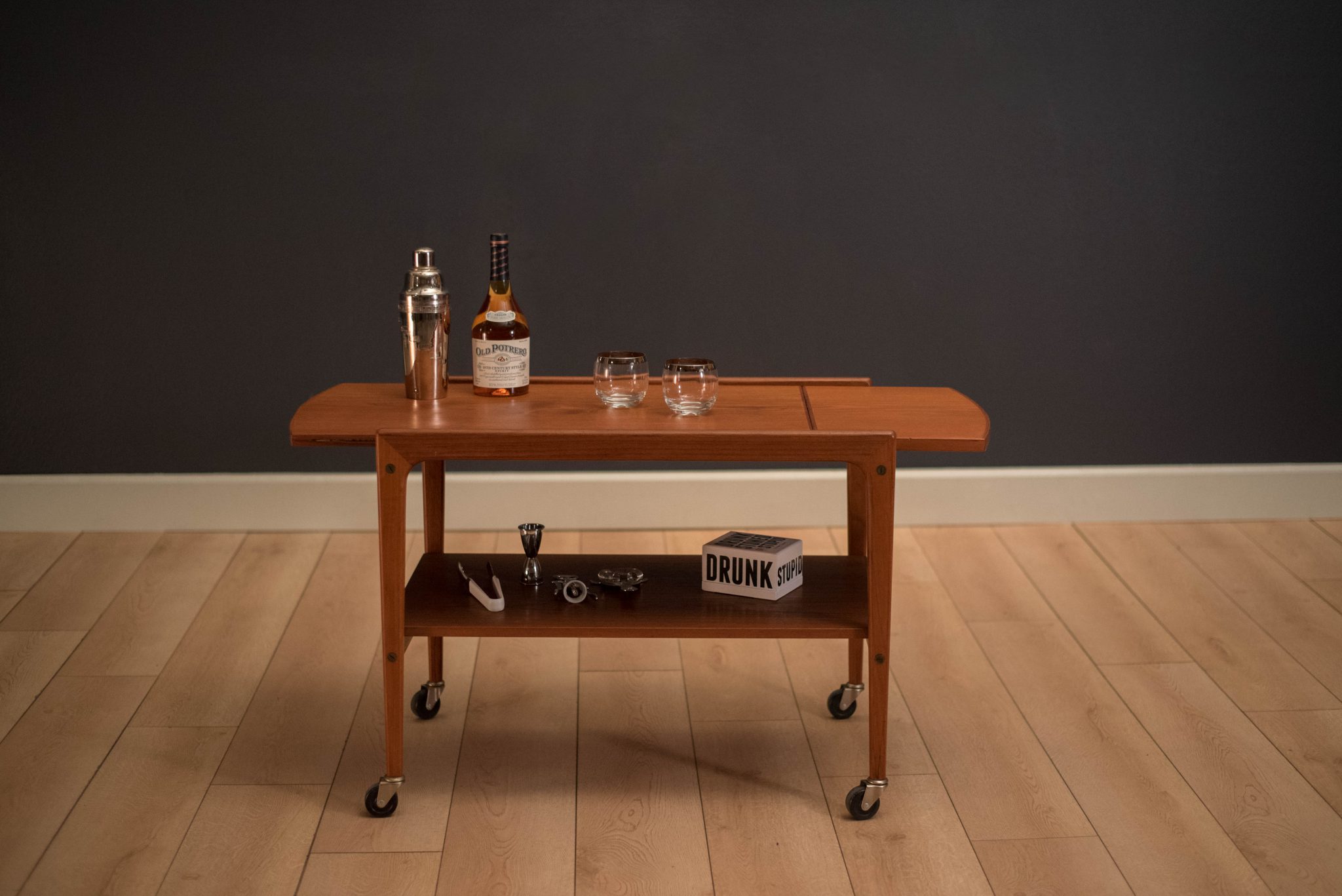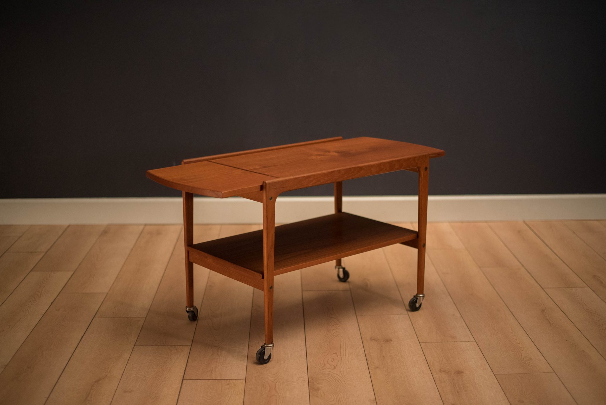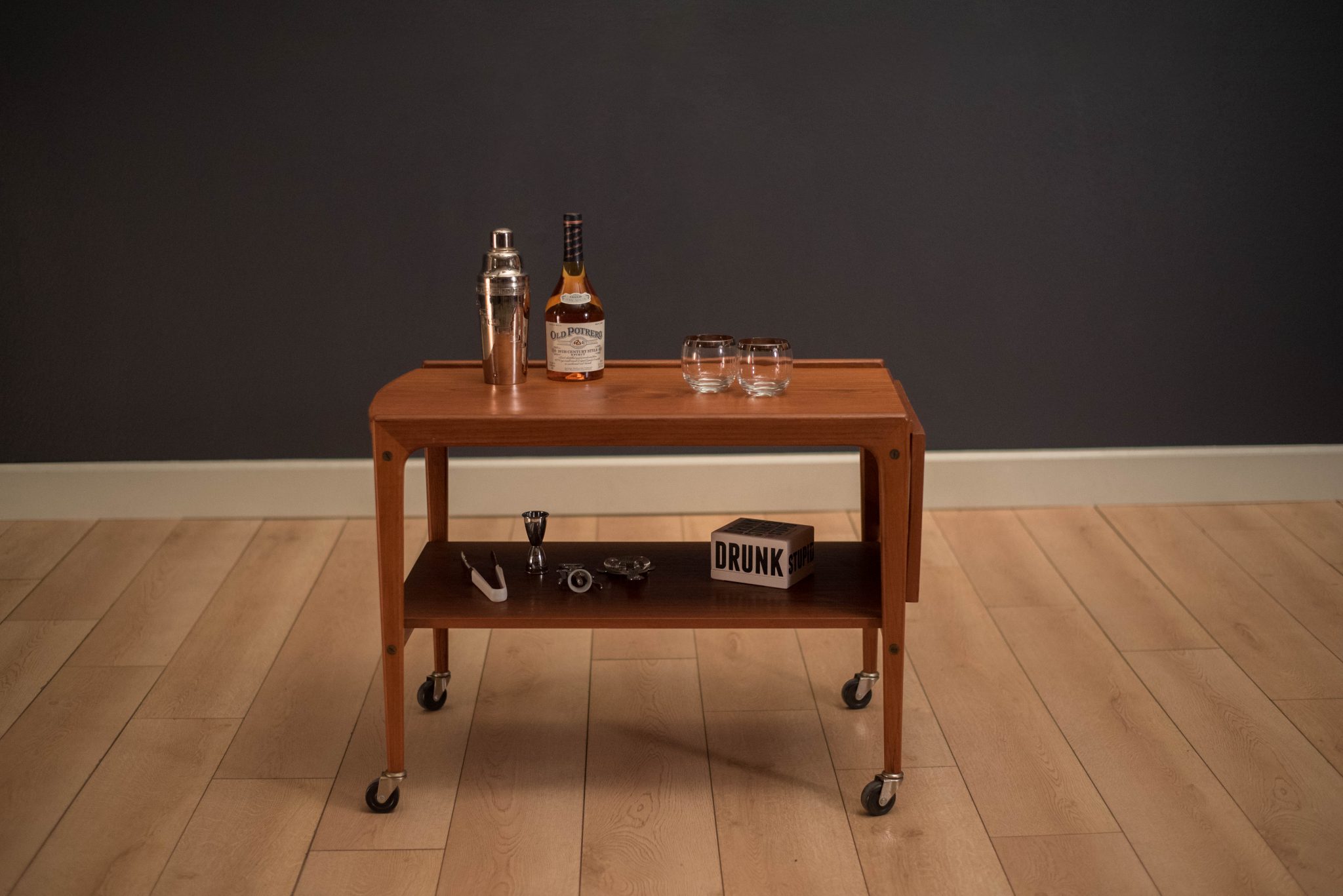 Mid century modern tea cart or trolley in teak c. 1960’s. This versatile piece is equipped with a drop leaf that slides to extend for a wider serving space. Features two tiers for extra storage display.