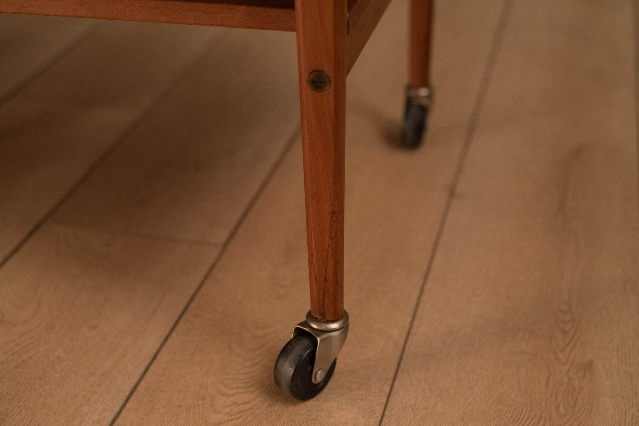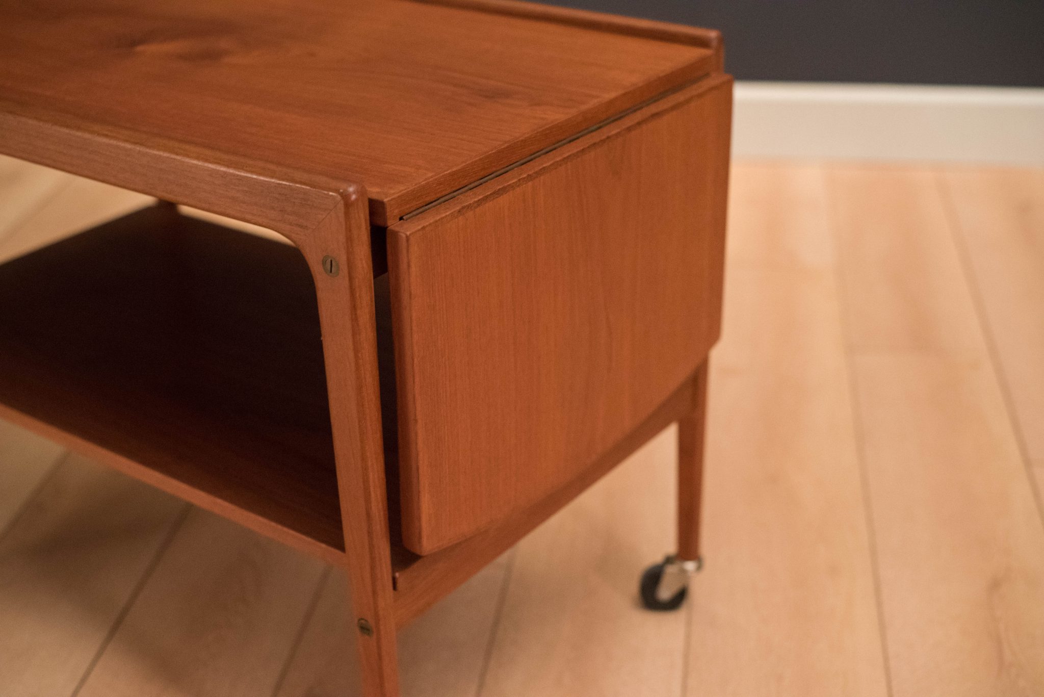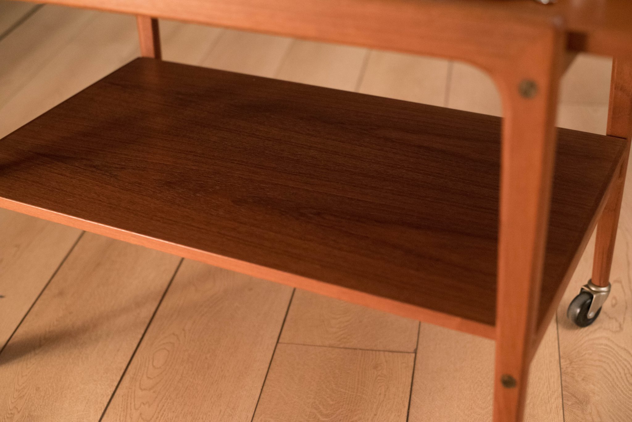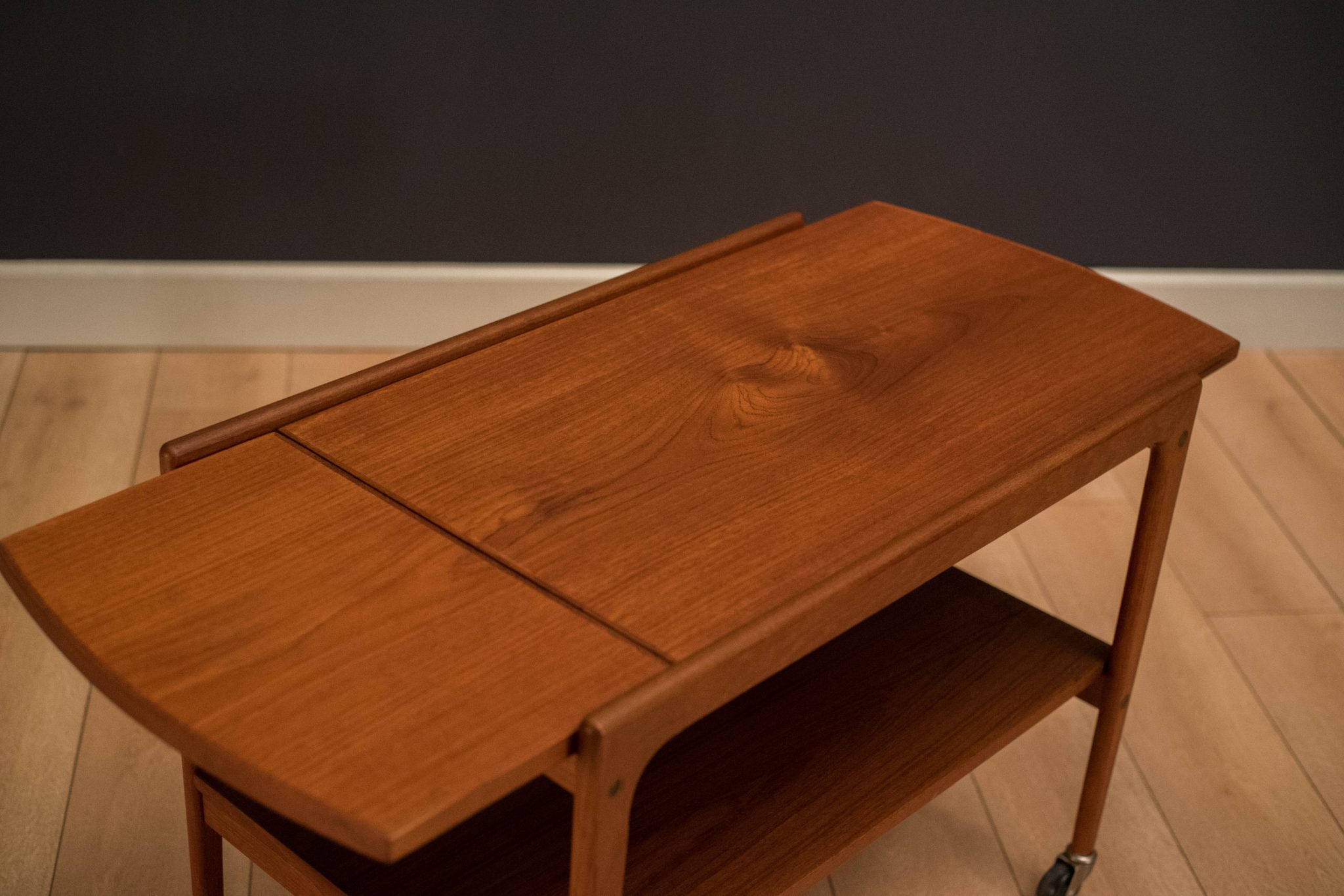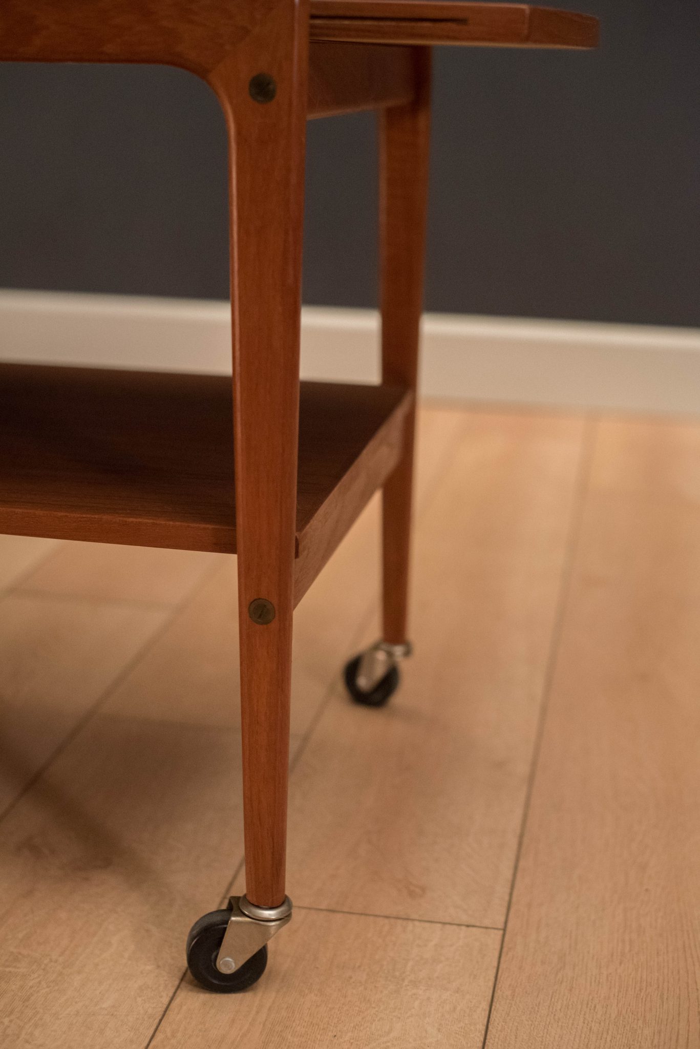 Mid century modern tea cart or trolley in teak c. 1960’s. This versatile piece is equipped with a drop leaf that slides to extend for a wider serving space. Features two tiers for extra storage display.