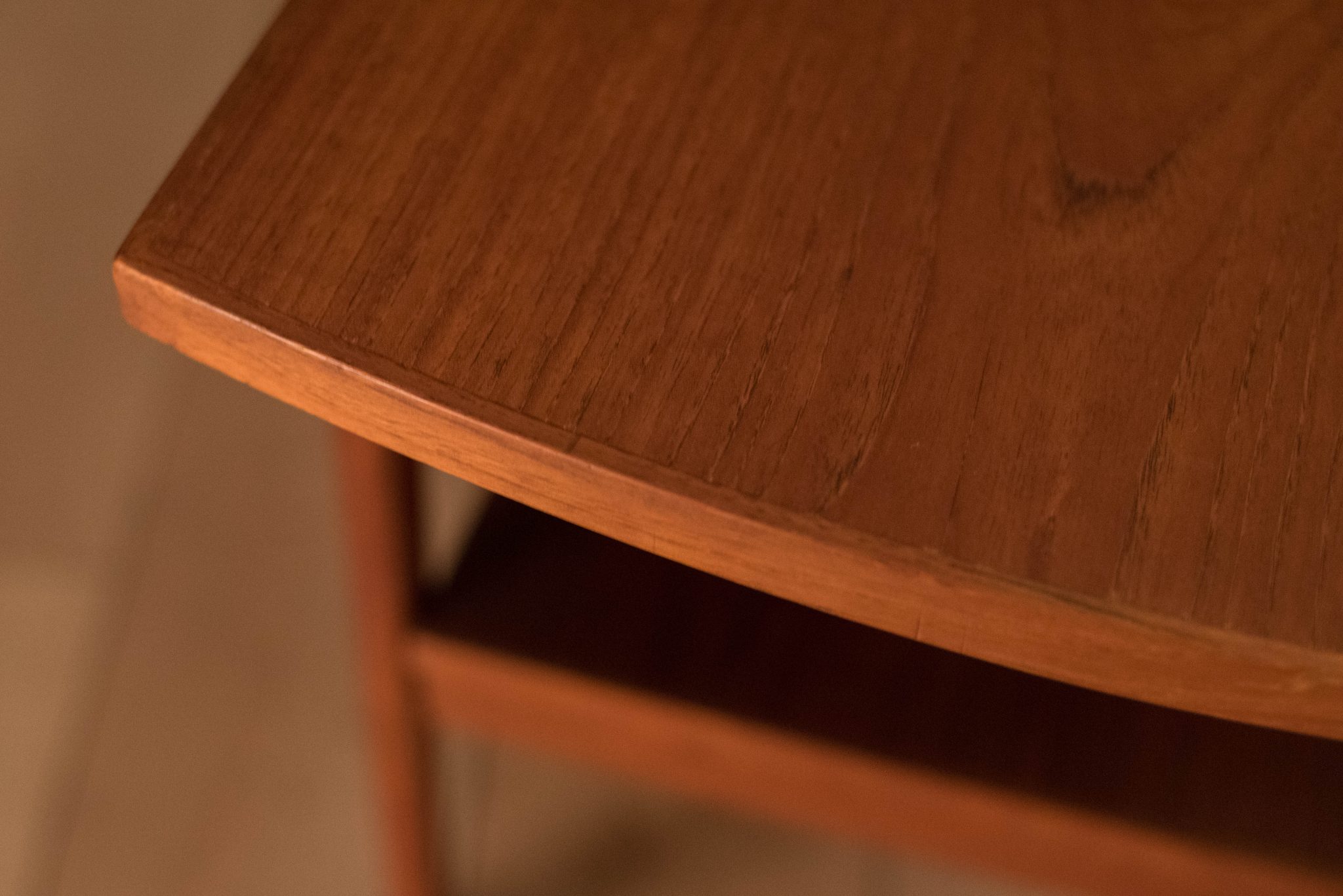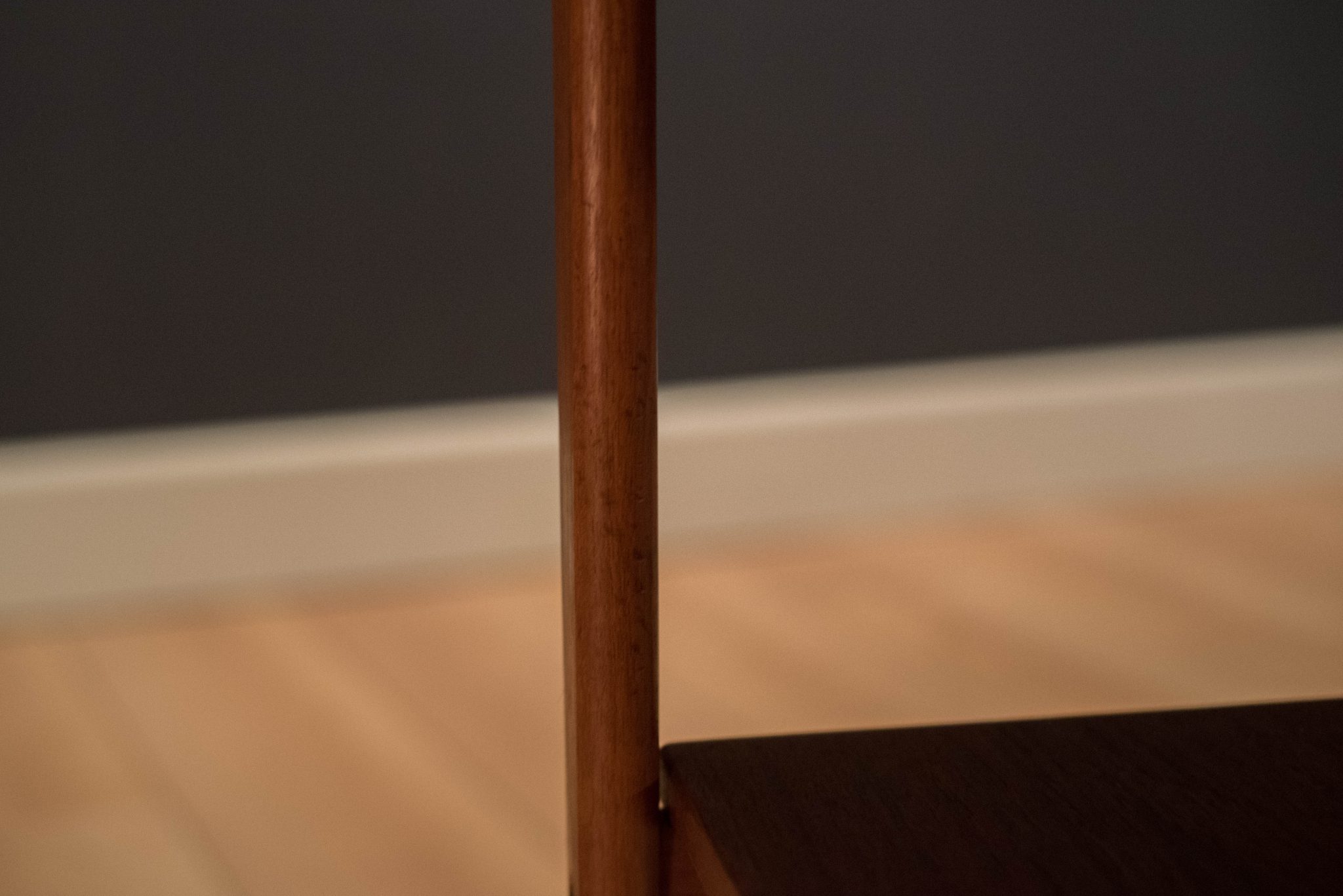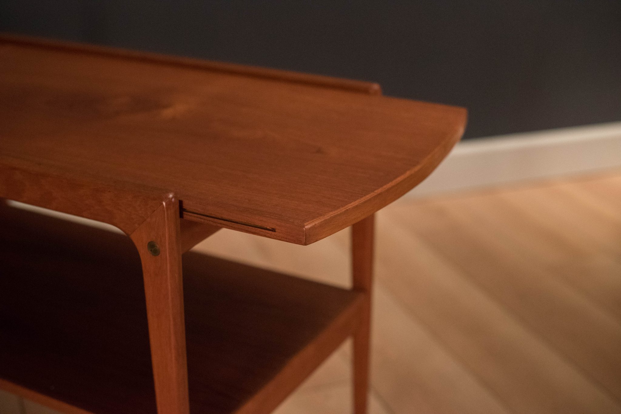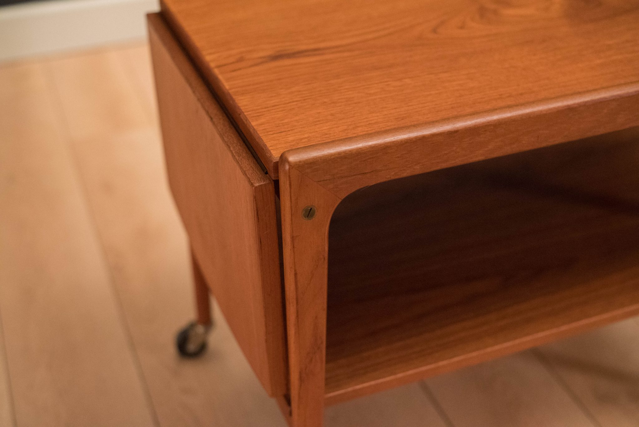 Mid century modern tea cart or trolley in teak c. 1960’s. This versatile piece is equipped with a drop leaf that slides to extend for a wider serving space. Features two tiers for extra storage display.